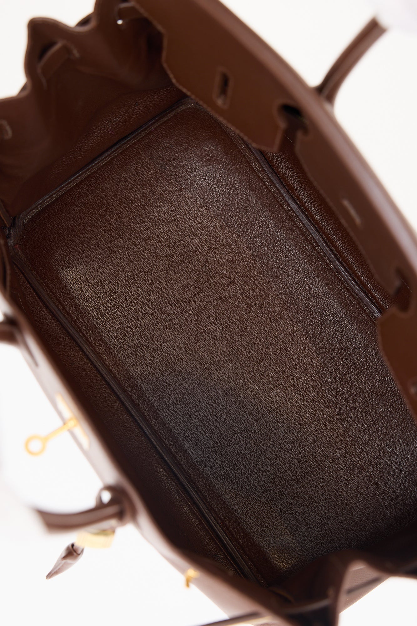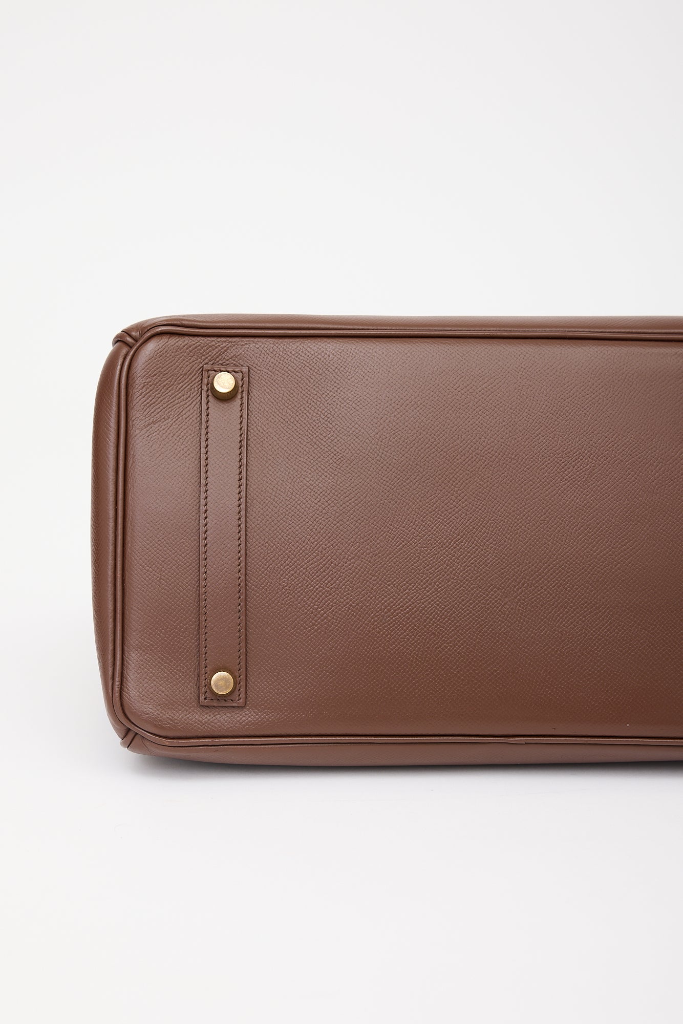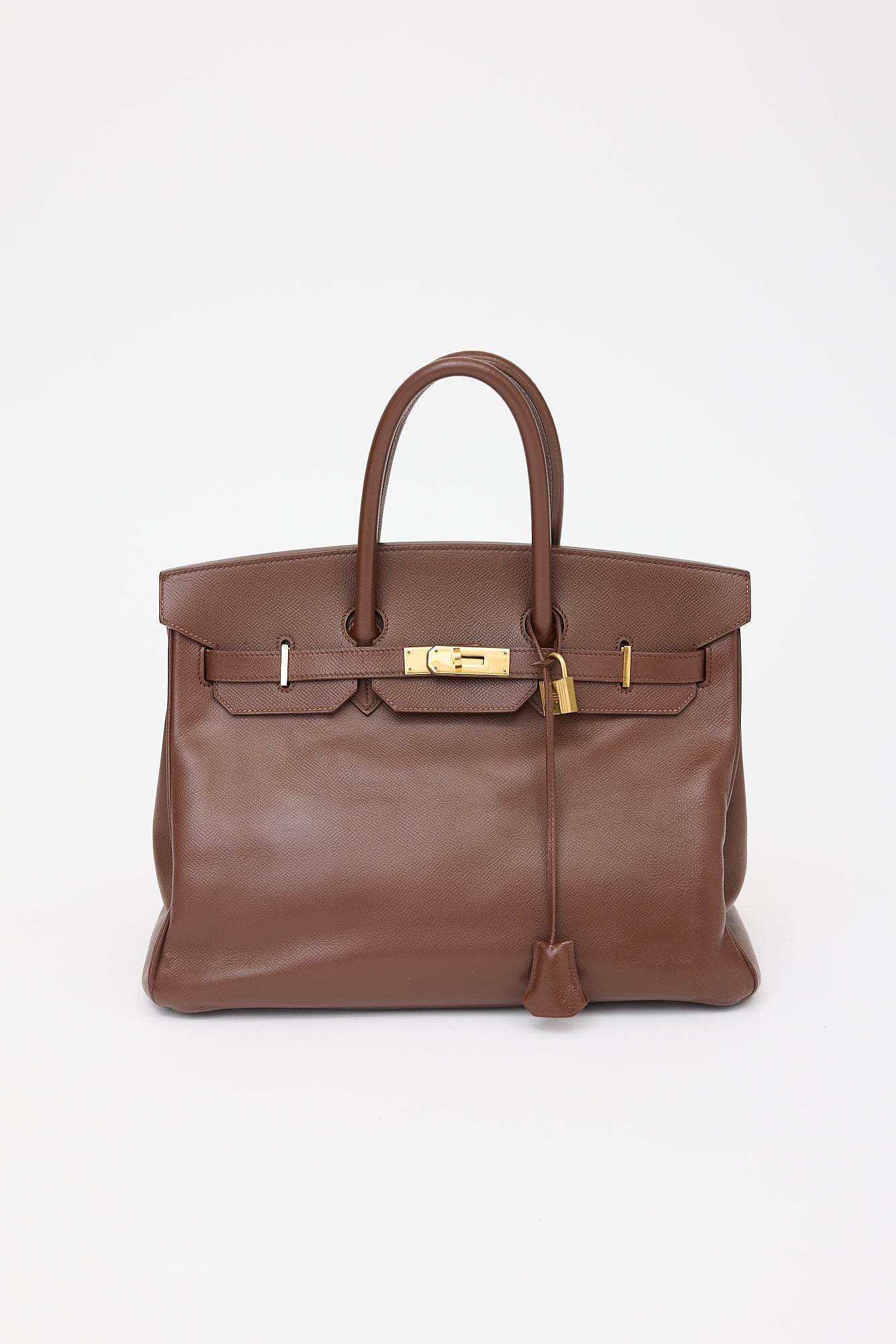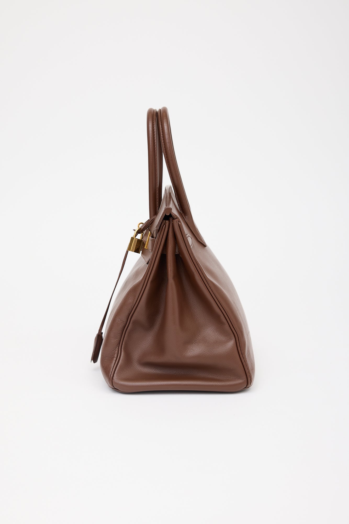 Pre-owned Hermès 2000 Birkin 35 bag in Marron Fonce Courchevel leather featuring dual rolled top handles, tonal stitching, gold plated hardware, sangles, logo engraved plaque, signature touret closure, gold stamped logo under top flap, four clou, detachable tiret with padlock and key clochette, and one main compartment with one zip pocket and one slip pocket.