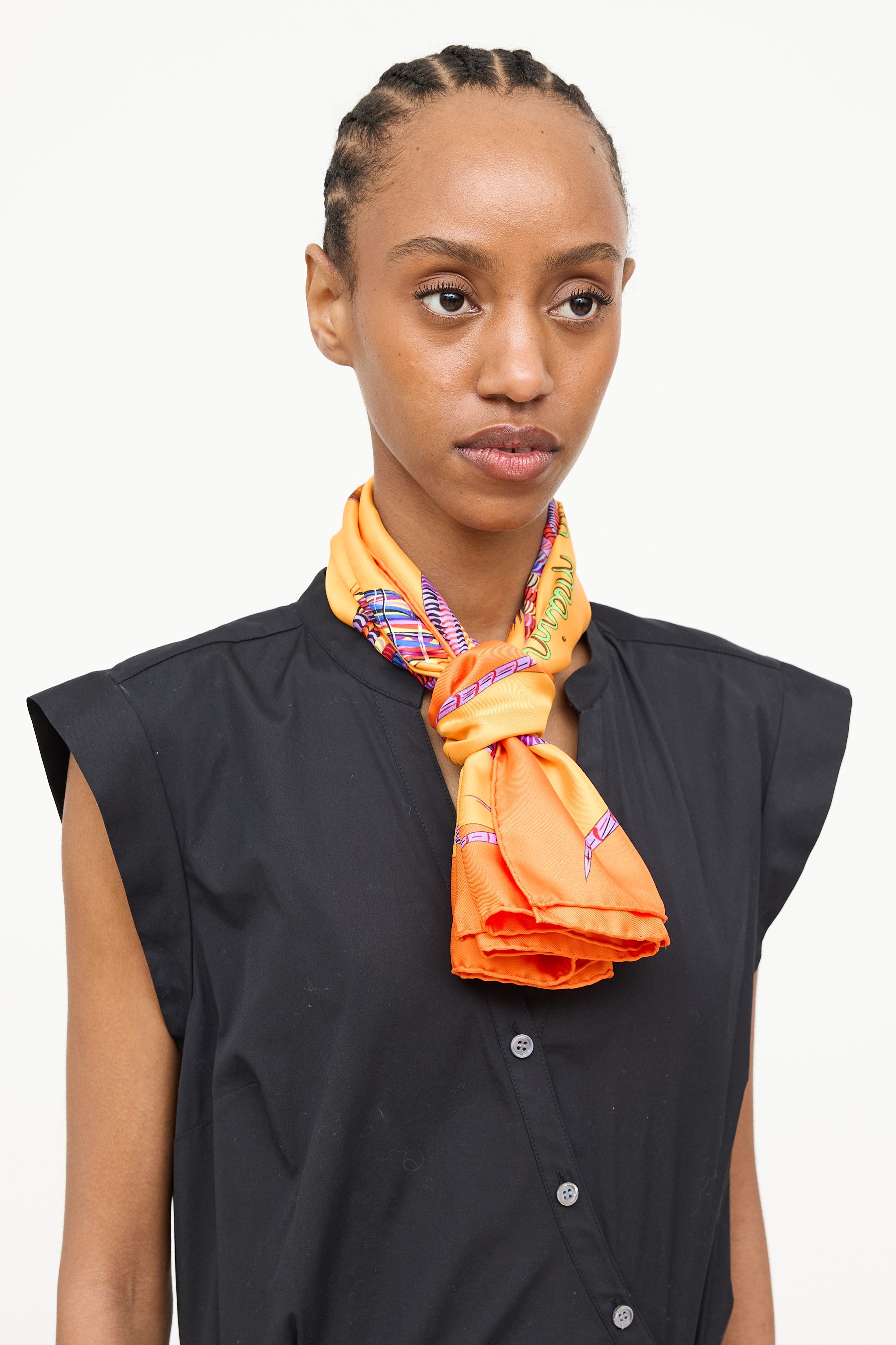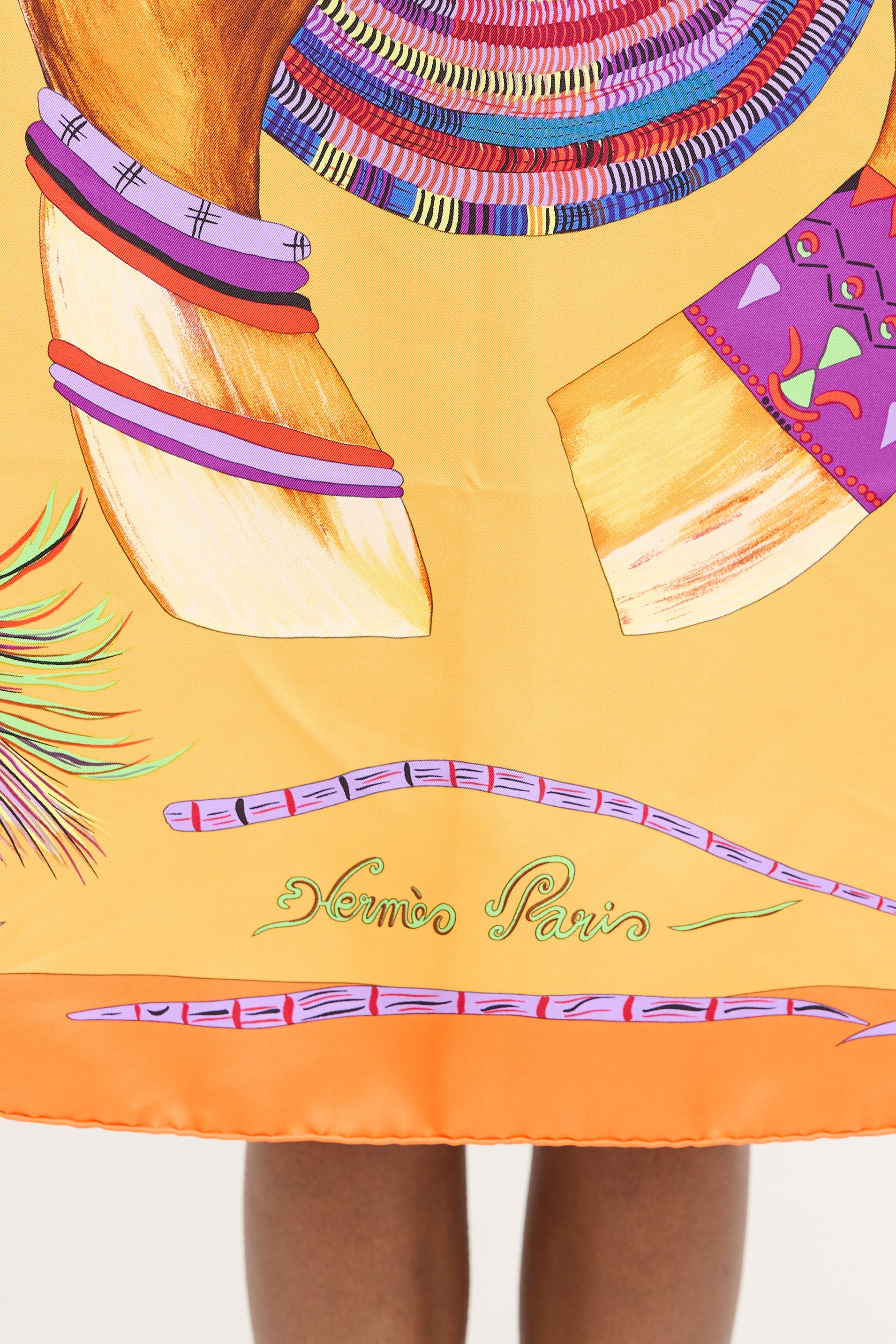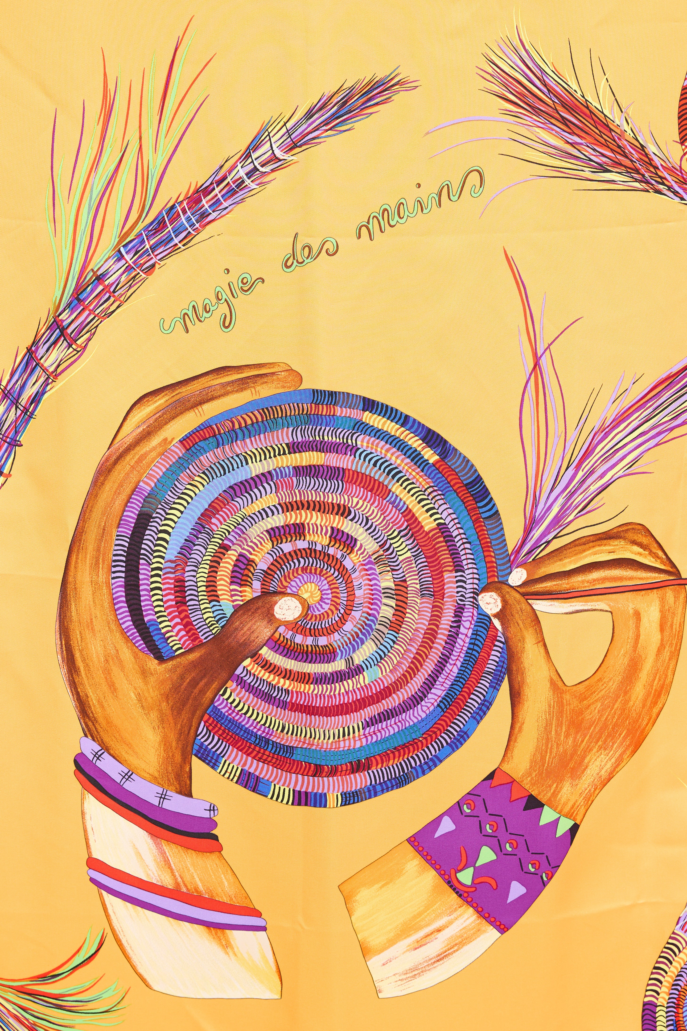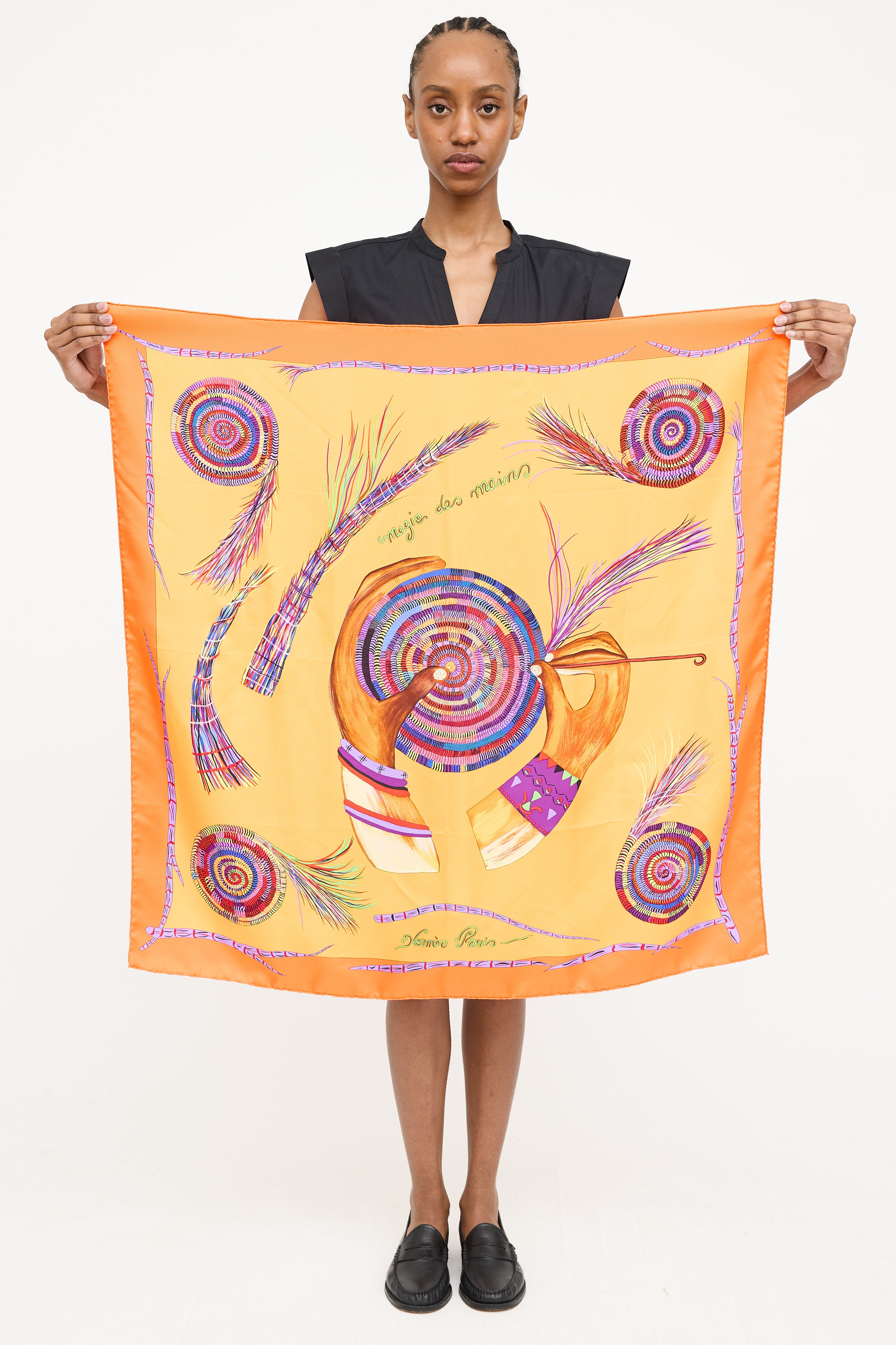 Pre-owned 2002 Hermès orange and multicolour scarf featuring Magie Des Mains design by Kuany Jeremiah Jacob, floral hand motif, logo print at bottom, and hand rolled edges.