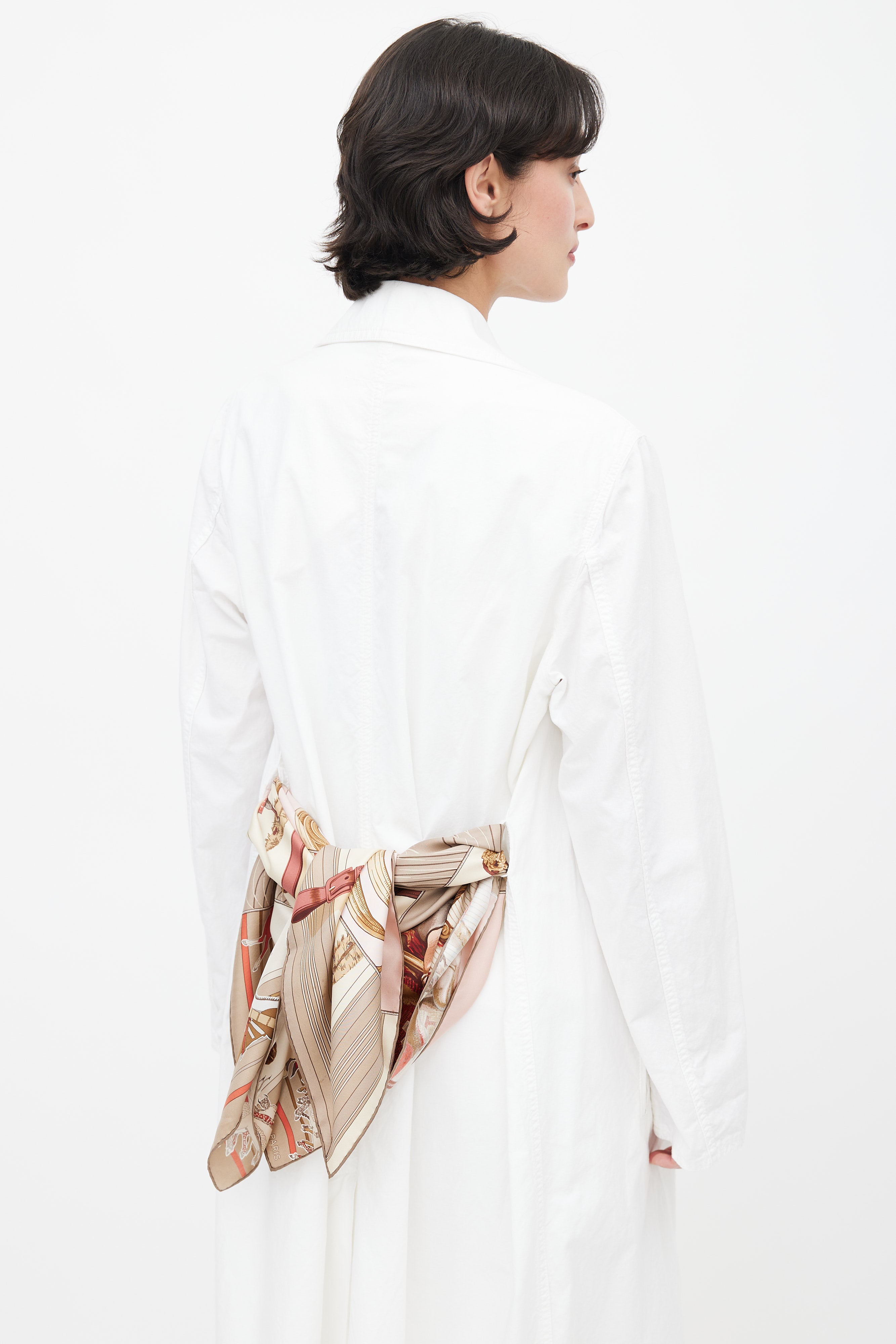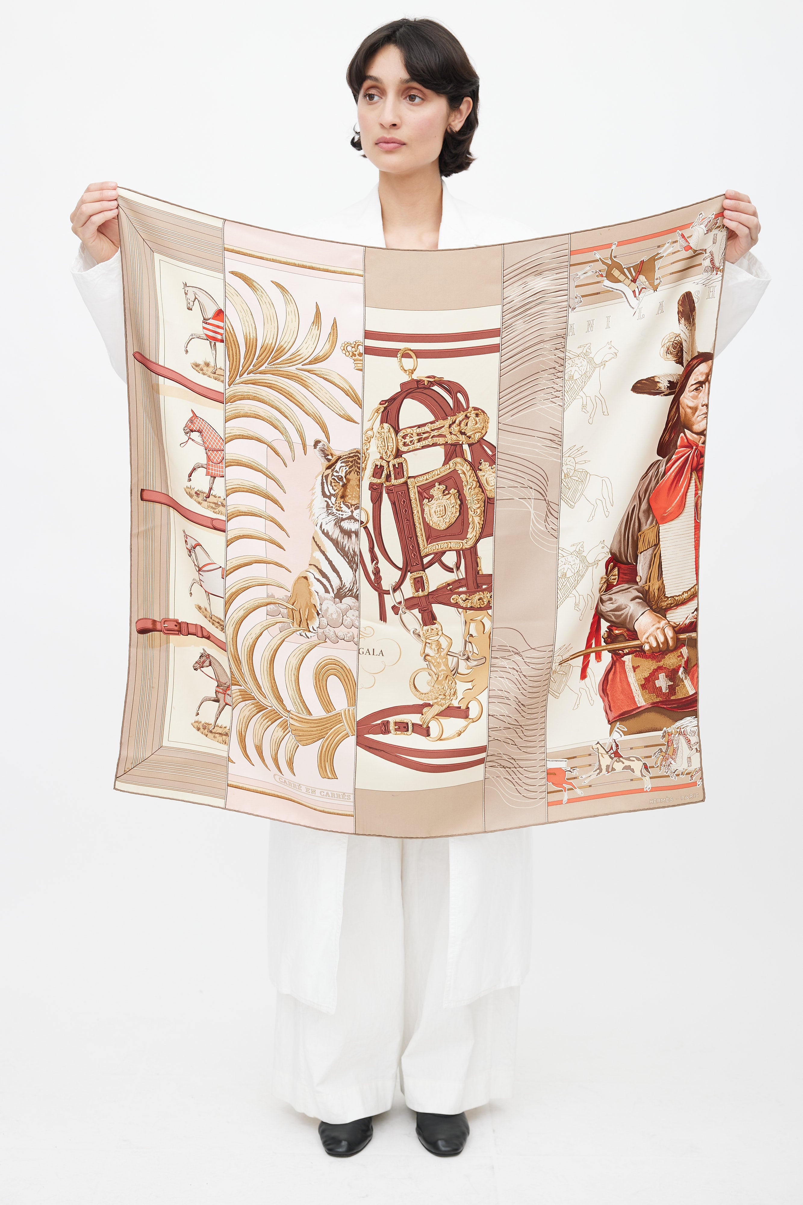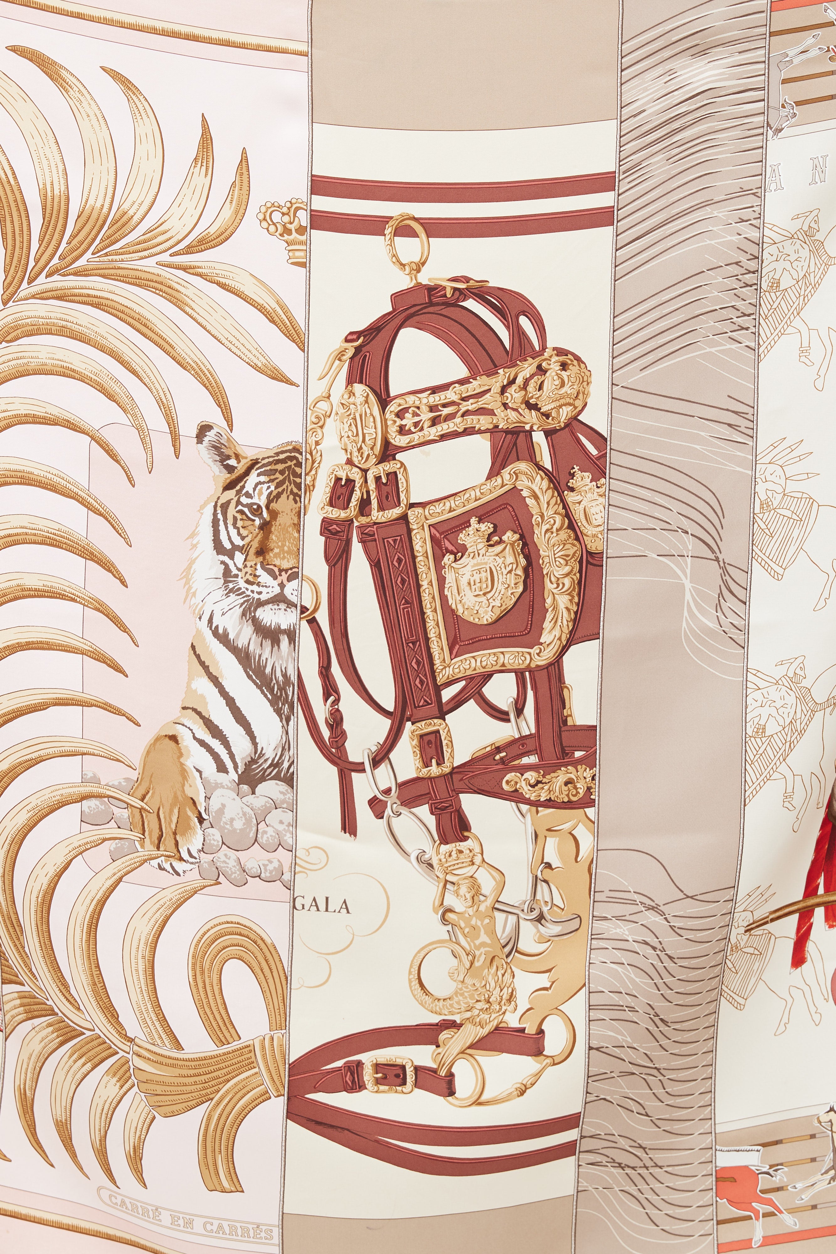 Pre-owned 2005 Hermés pink and taupe scarf featuring multicolour Carre en Carres print by Bali Barret, multiple print motifs, and brown hand-rolled edges. Comes with original box.