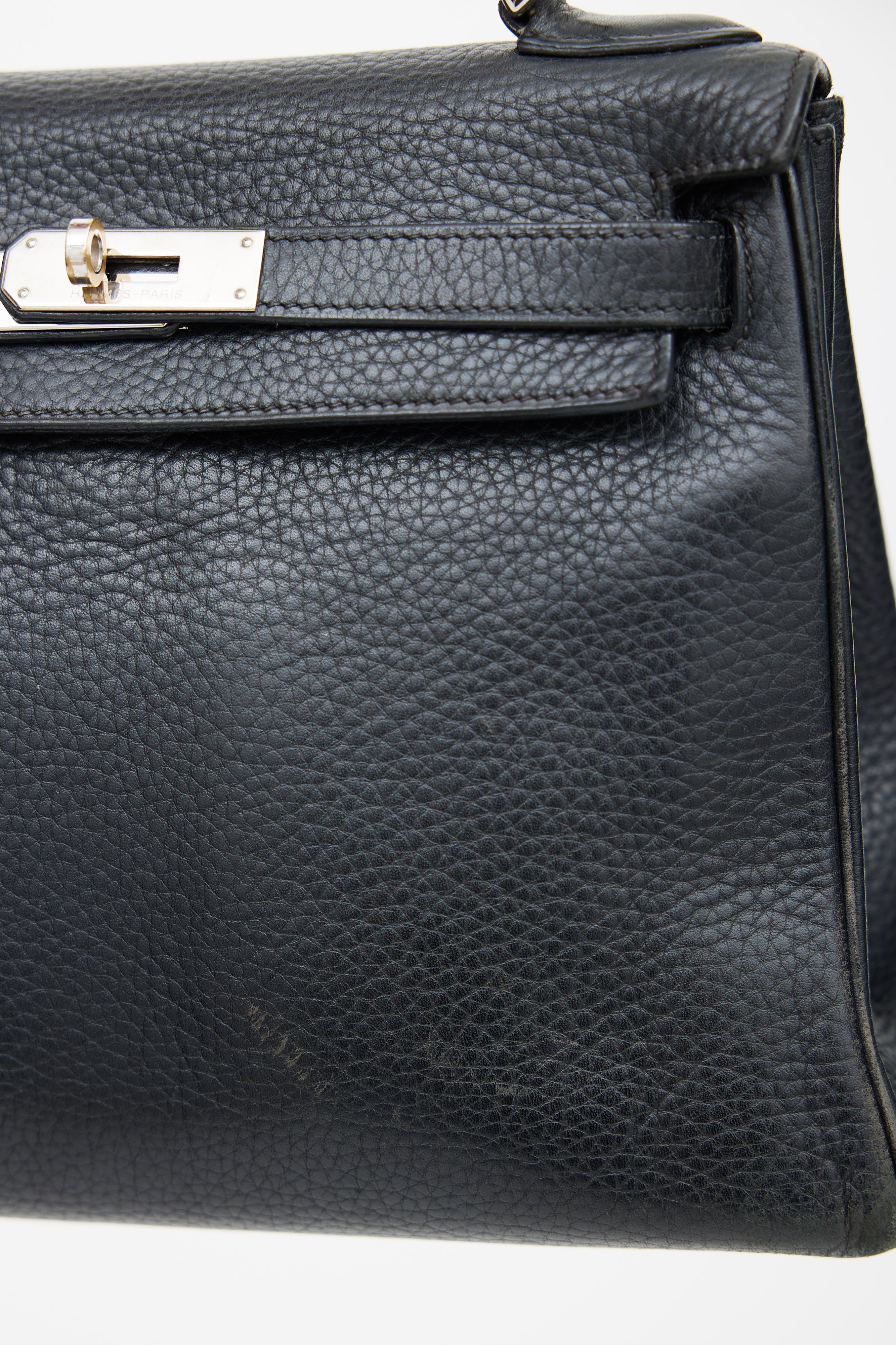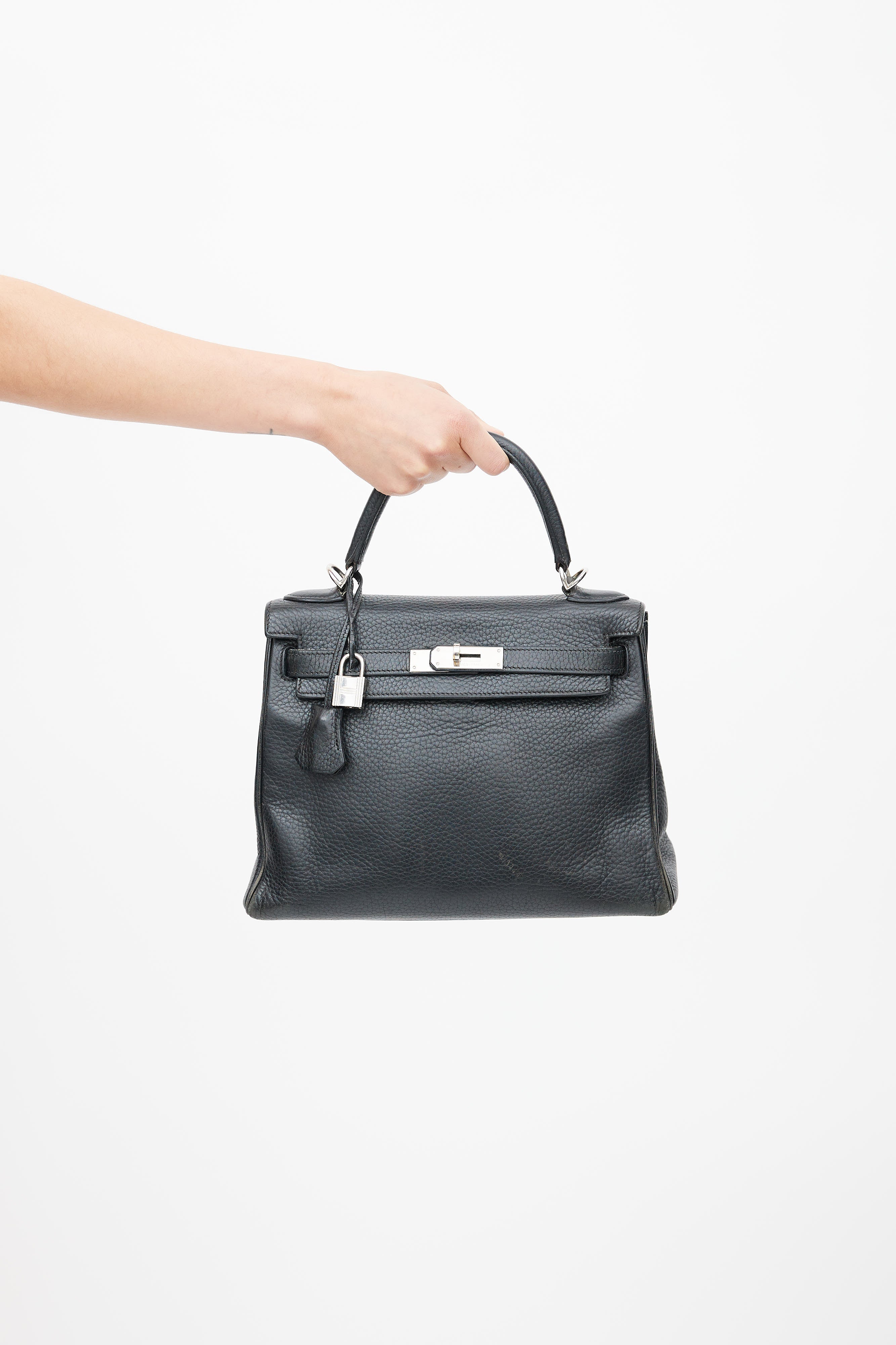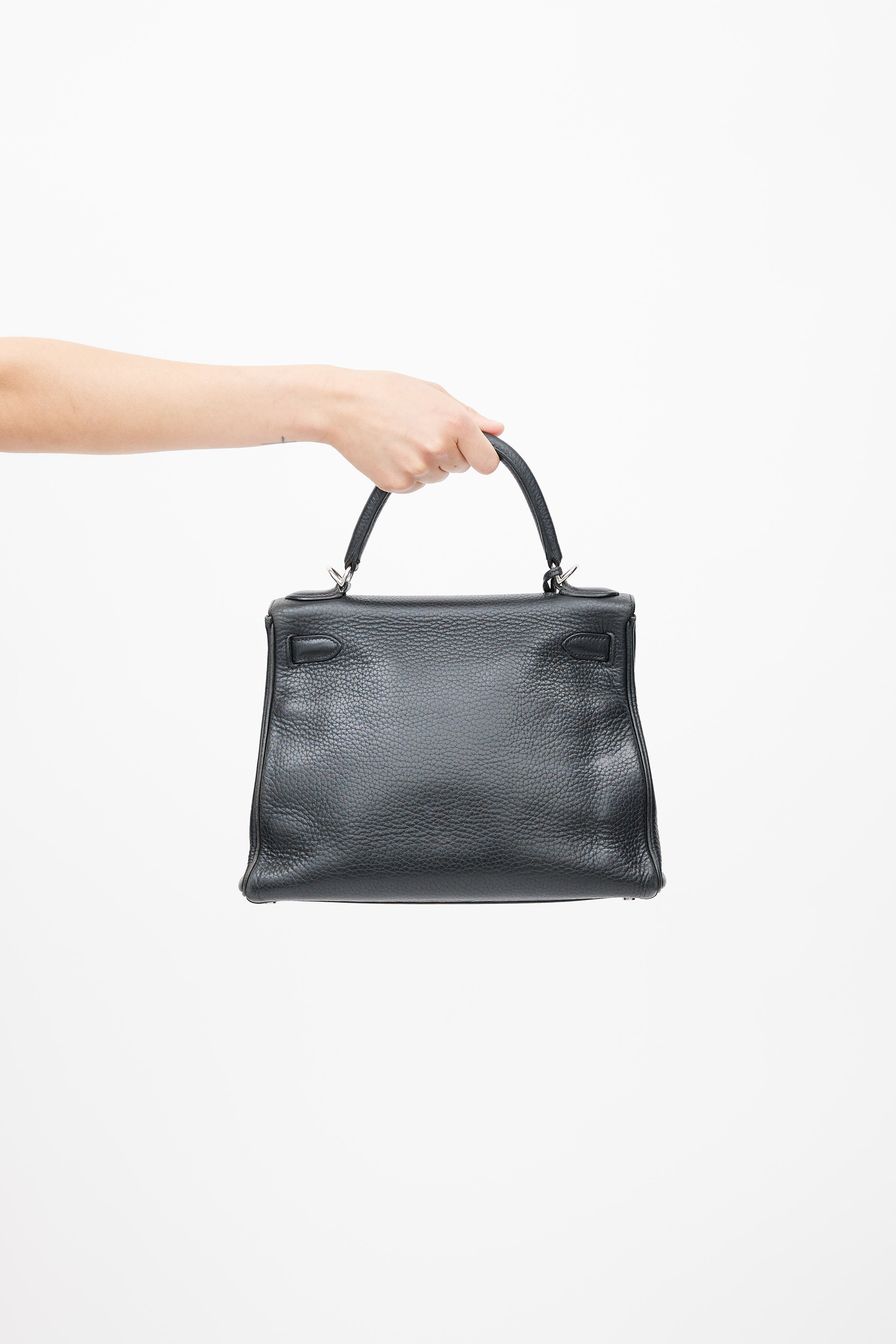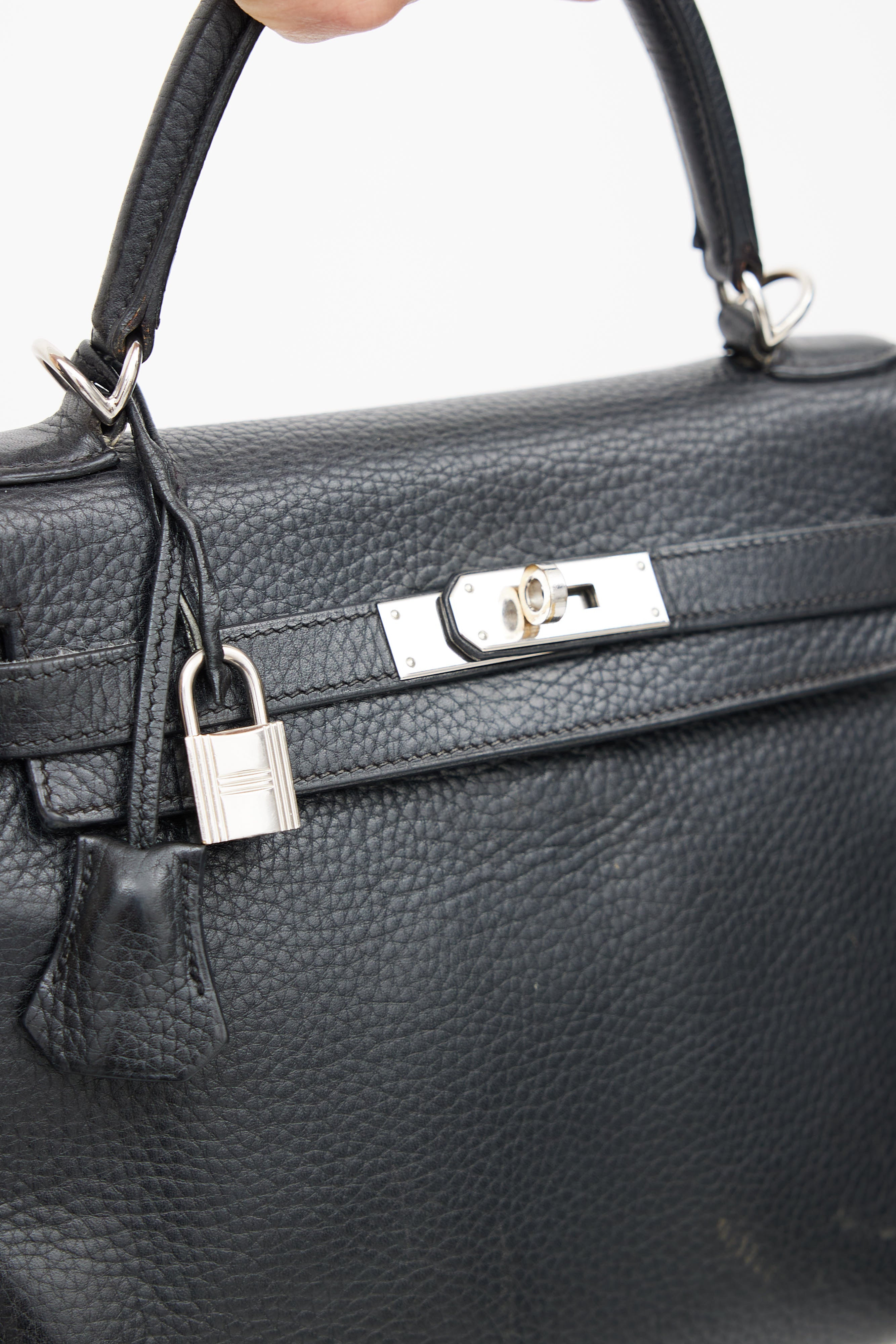Pre-owned 2006 Hermès Kelly Retourne 28 bag in Noir Clémence leather featuring top handle, Palladium hardware, brand stamp under flap, side belt detail, signature twist lock closure, logo engraved plaque, four clou, leather key and padlock clochette attachment, detachable shoulder strap, single main compartment, and interior zipped and slip pockets. Comes with original dust bag.
