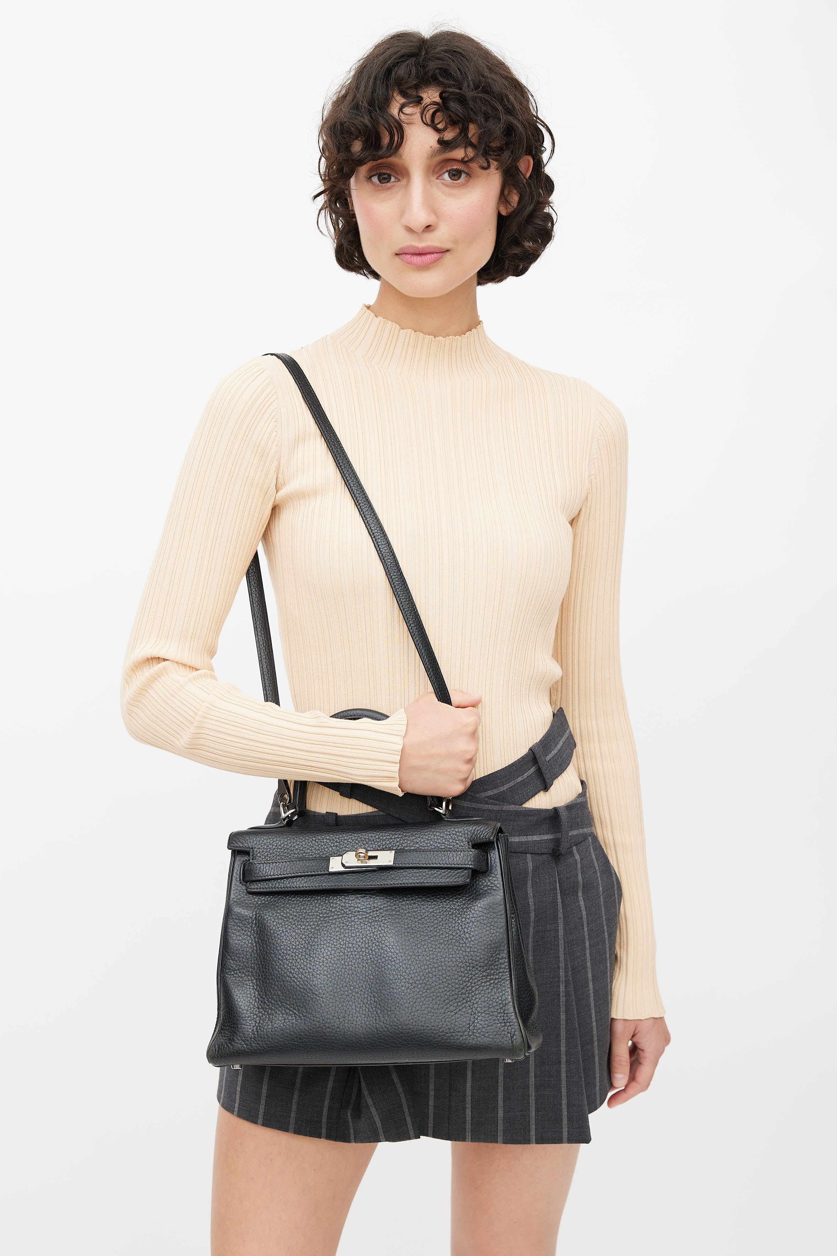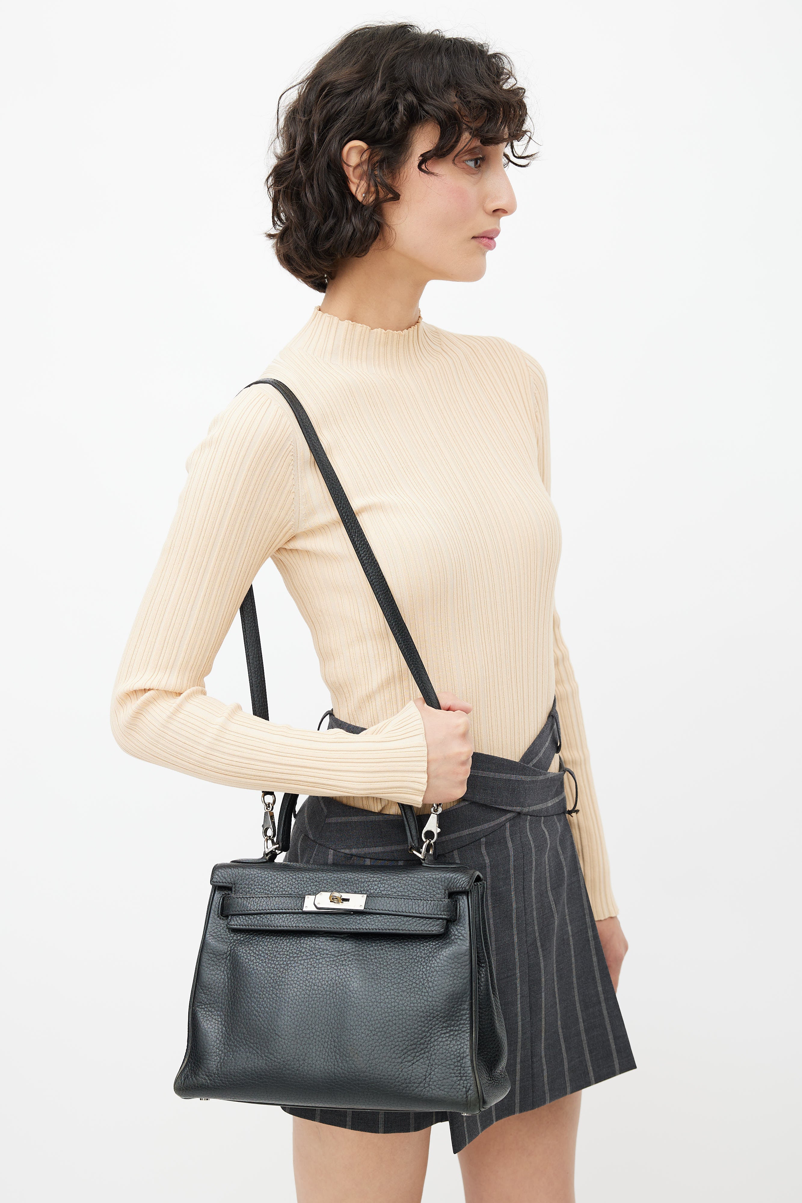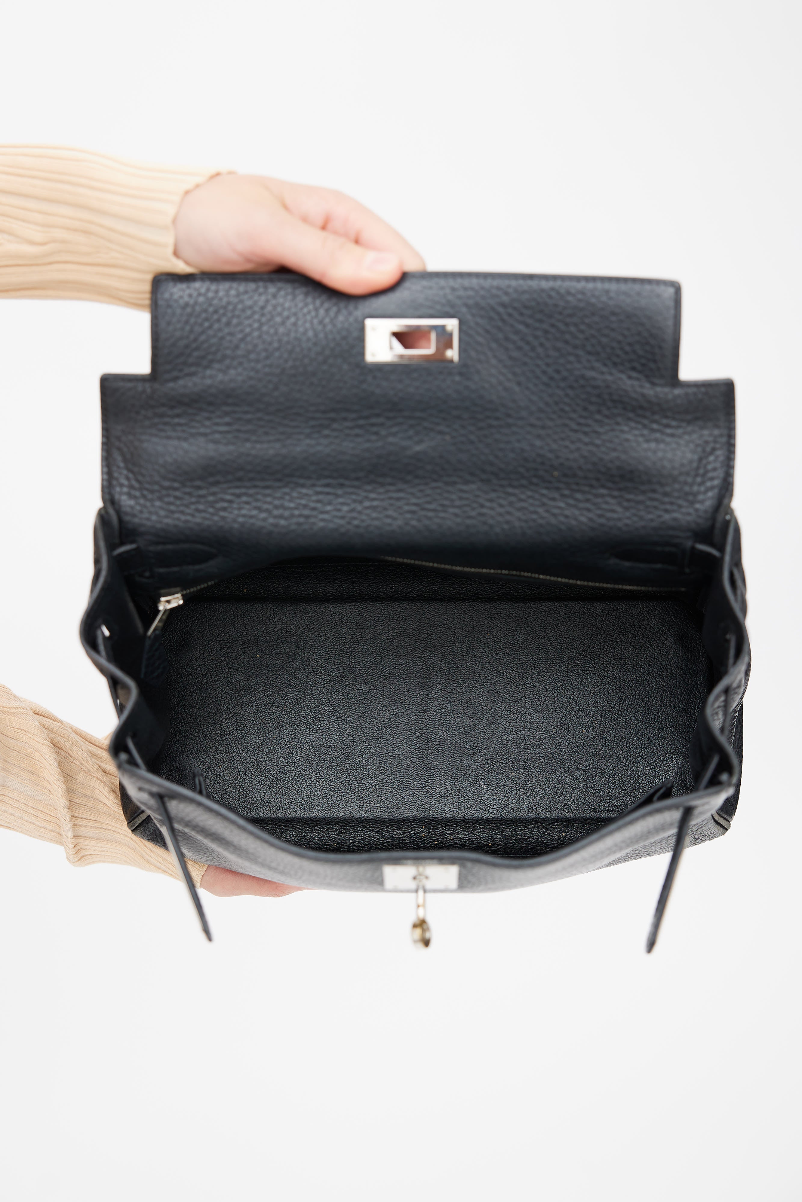Pre-owned 2006 Hermès Kelly Retourne 28 bag in Noir Clémence leather featuring top handle, Palladium hardware, brand stamp under flap, side belt detail, signature twist lock closure, logo engraved plaque, four clou, leather key and padlock clochette attachment, detachable shoulder strap, single main compartment, and interior zipped and slip pockets. Comes with original dust bag.