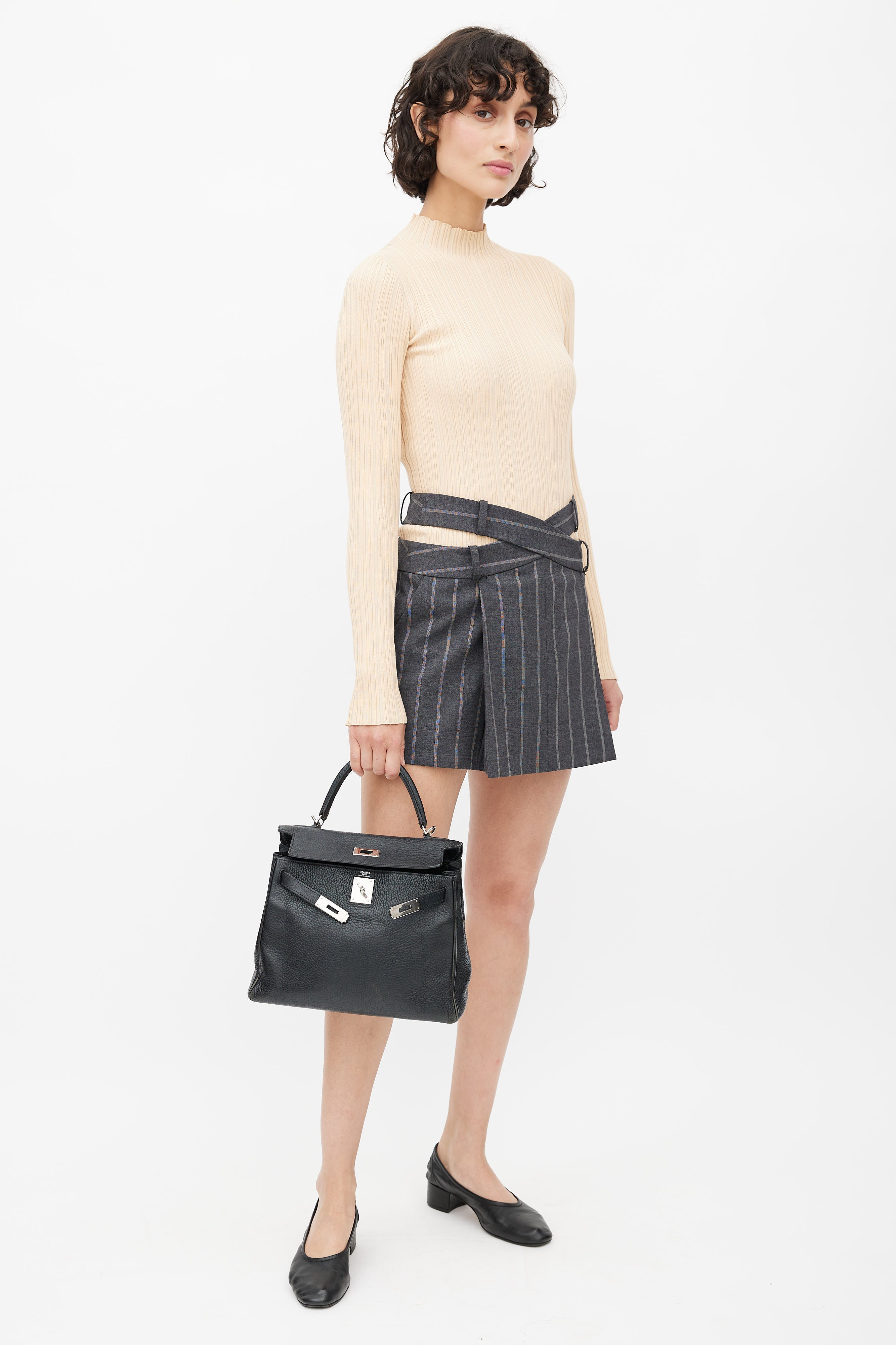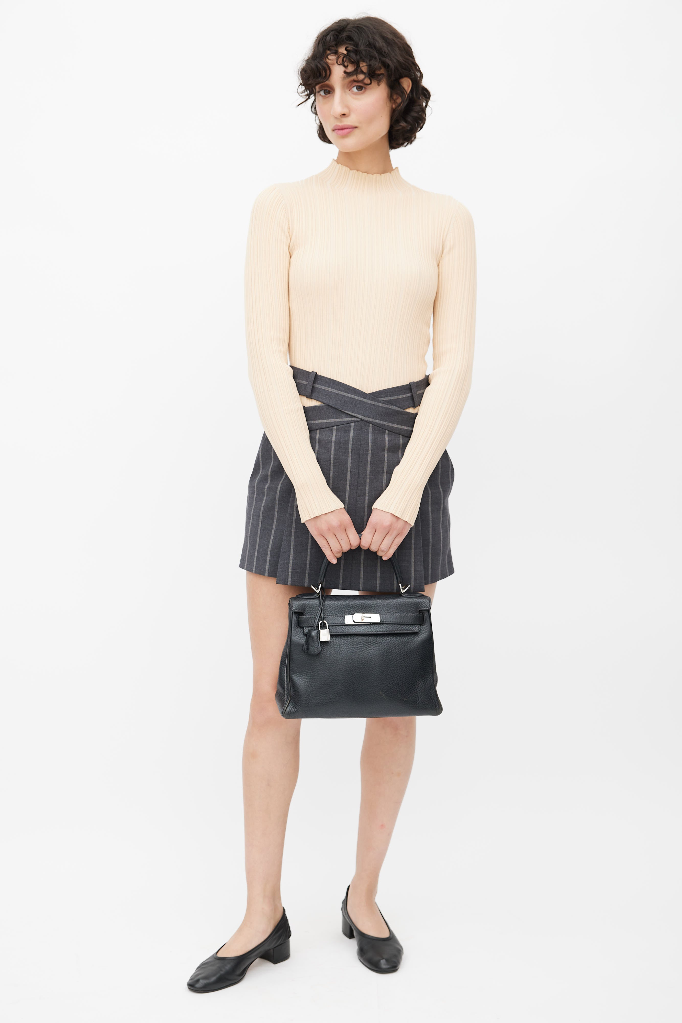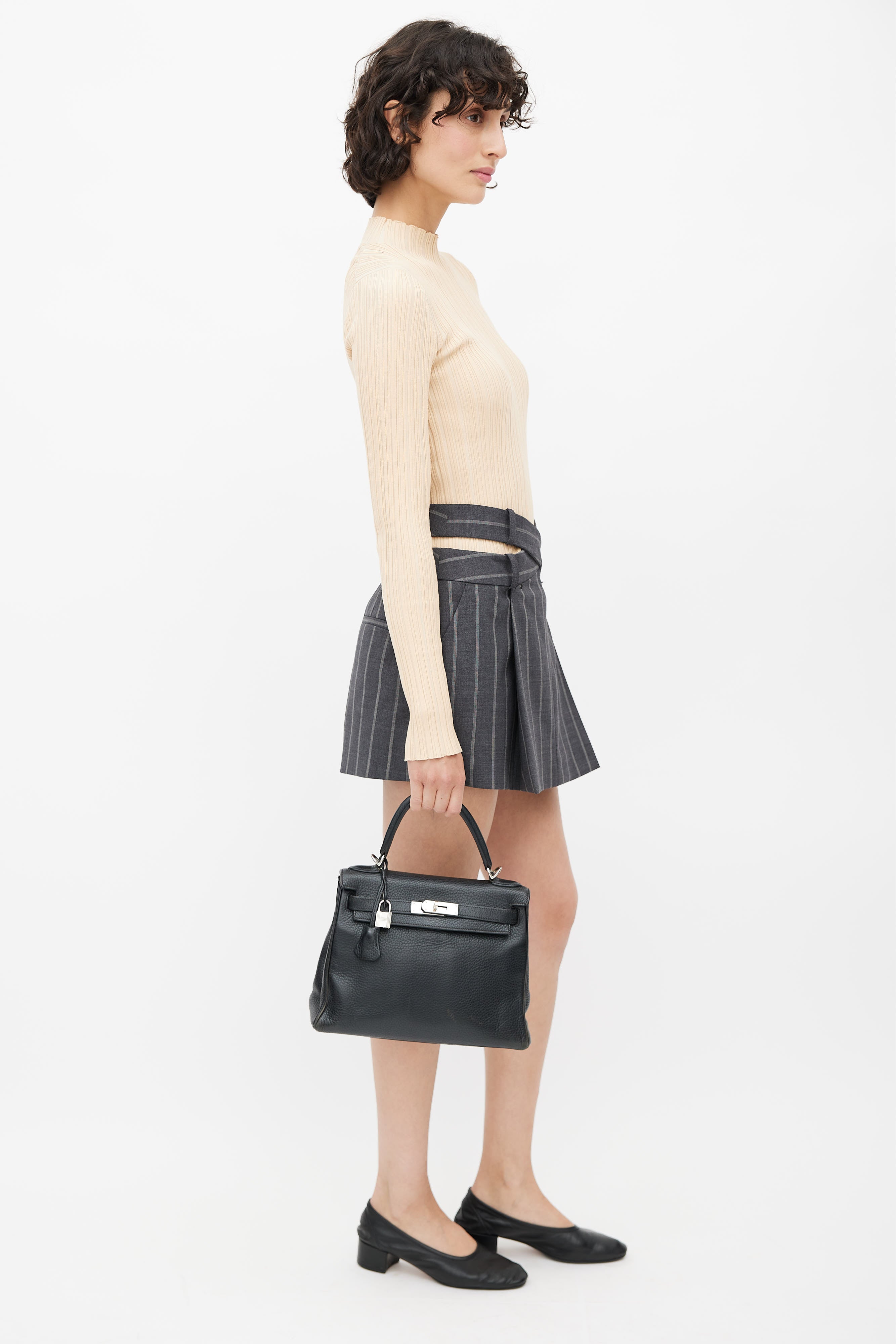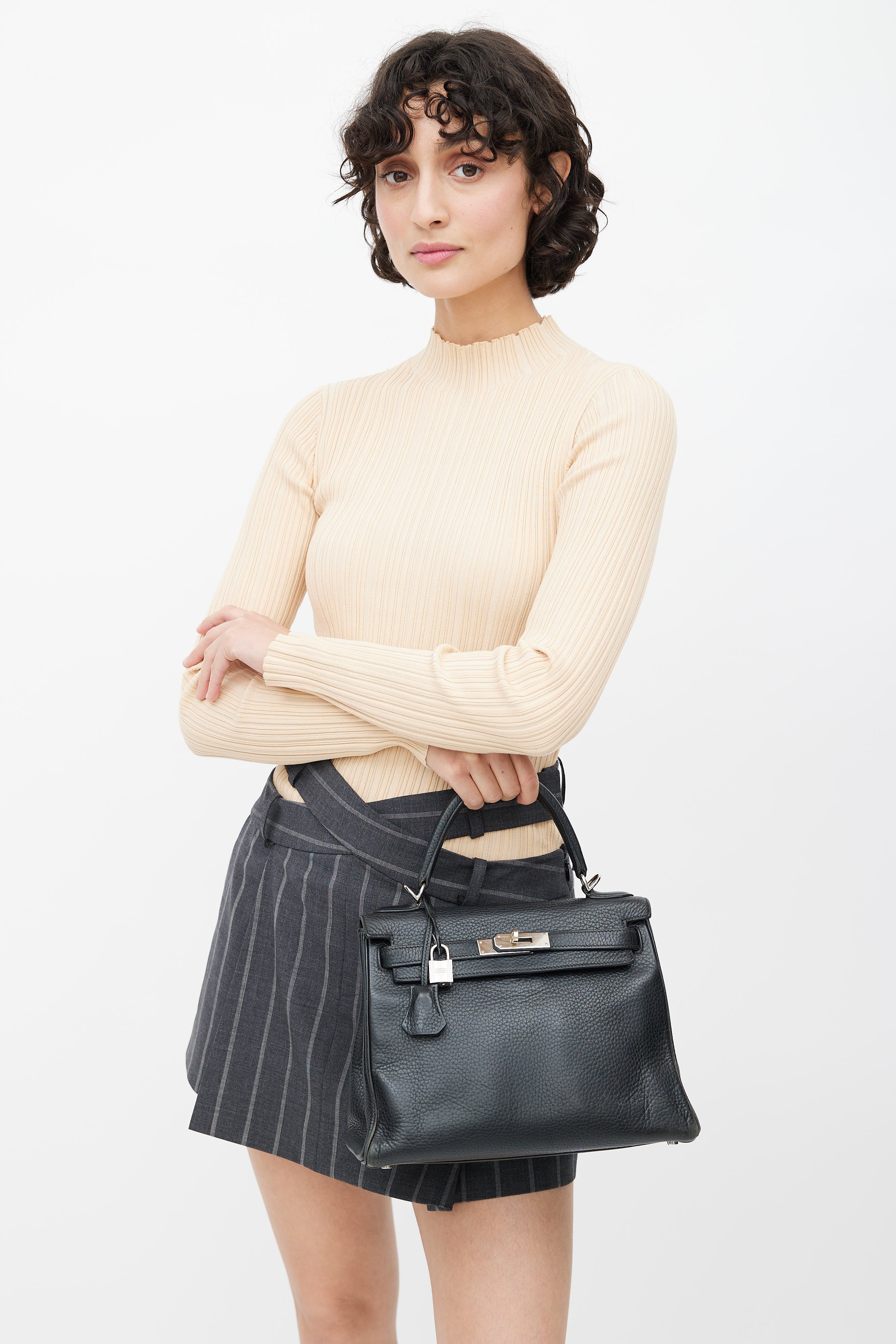 Pre-owned 2006 Hermès Kelly Retourne 28 bag in Noir Clémence leather featuring top handle, Palladium hardware, brand stamp under flap, side belt detail, signature twist lock closure, logo engraved plaque, four clou, leather key and padlock clochette attachment, detachable shoulder strap, single main compartment, and interior zipped and slip pockets. Comes with original dust bag.