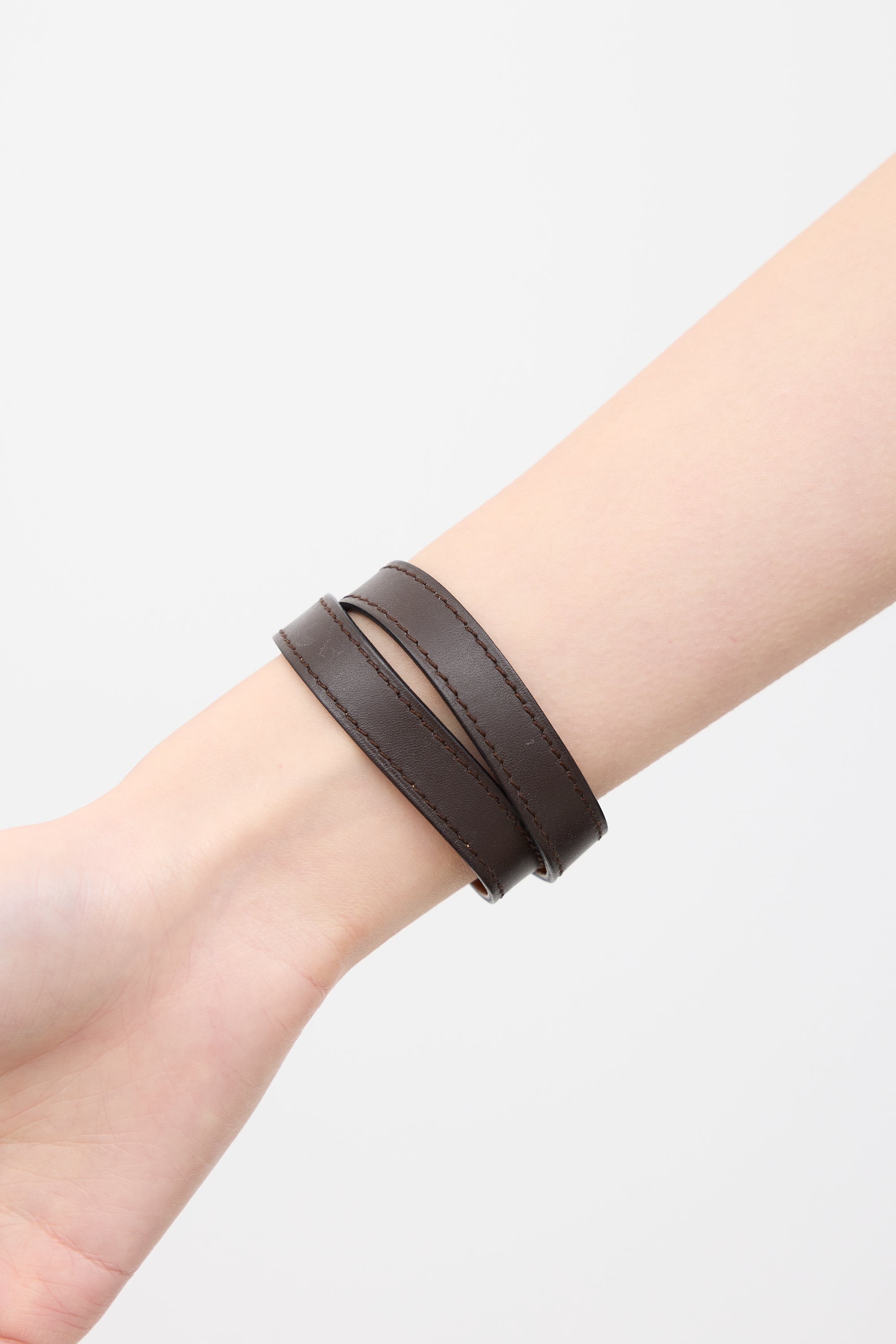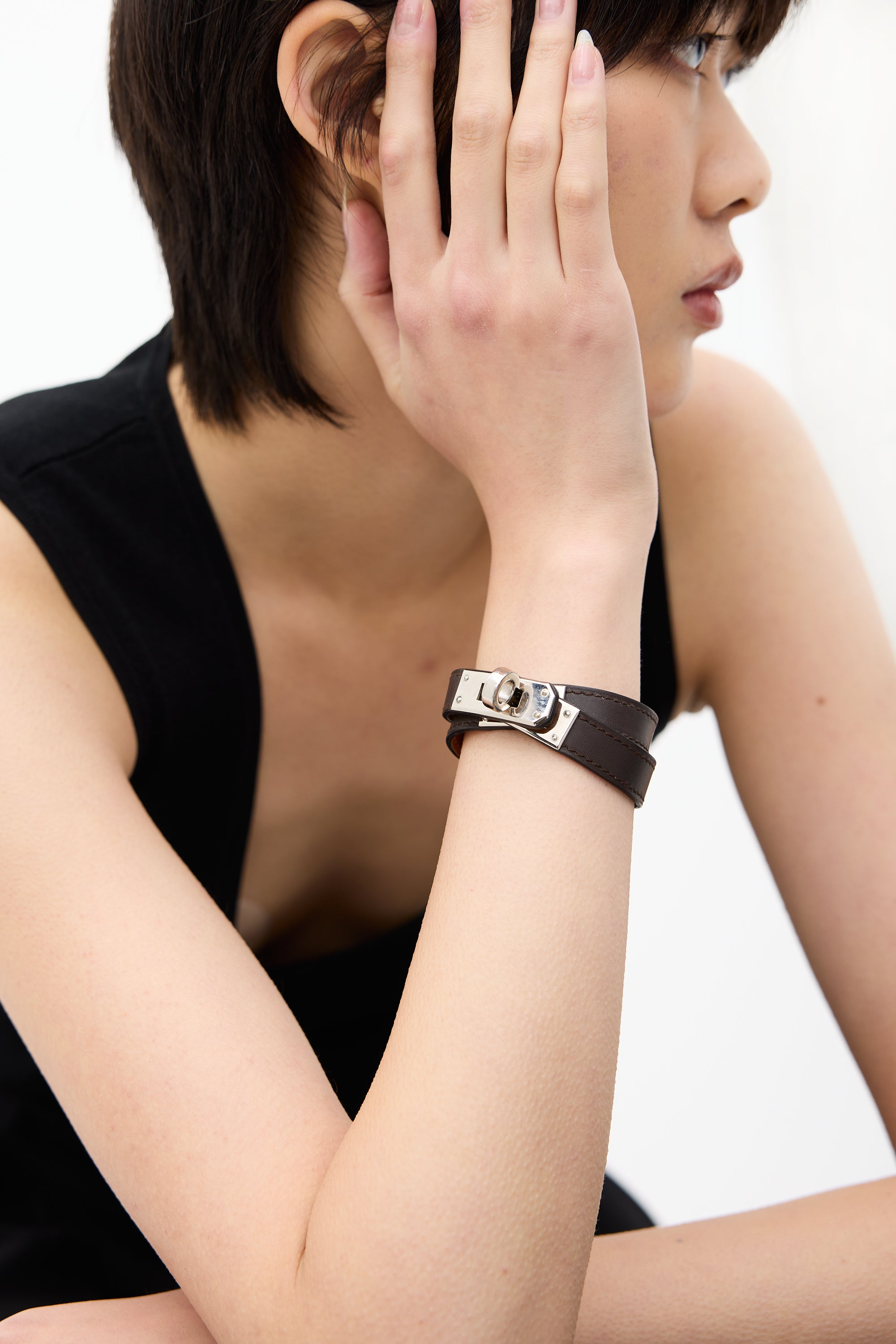 Pre-owned Hermès 2007 dark brown Kelly Double Tour bracelet featuring embossed logo at interior, palladium hardware, and twist lock closure.