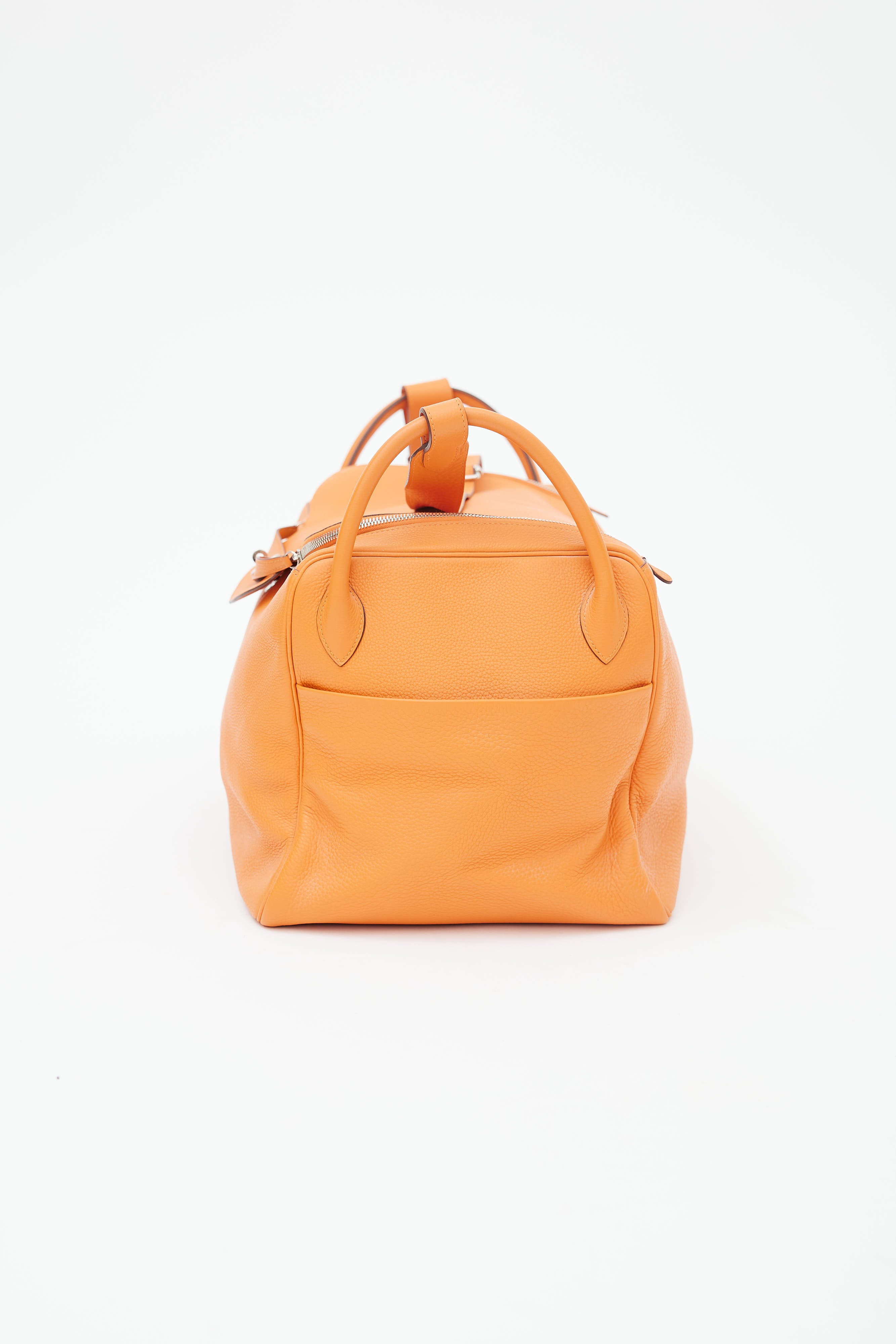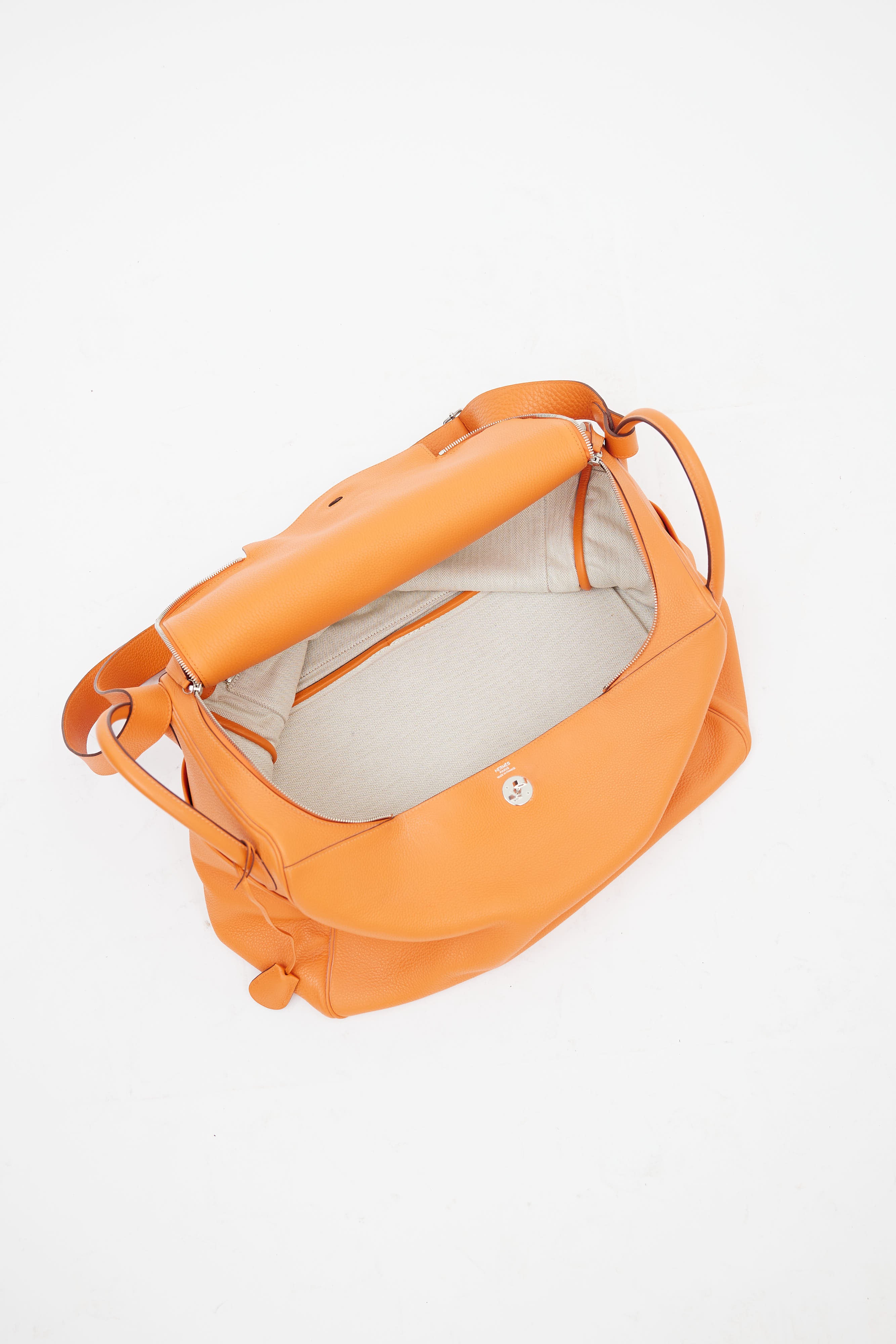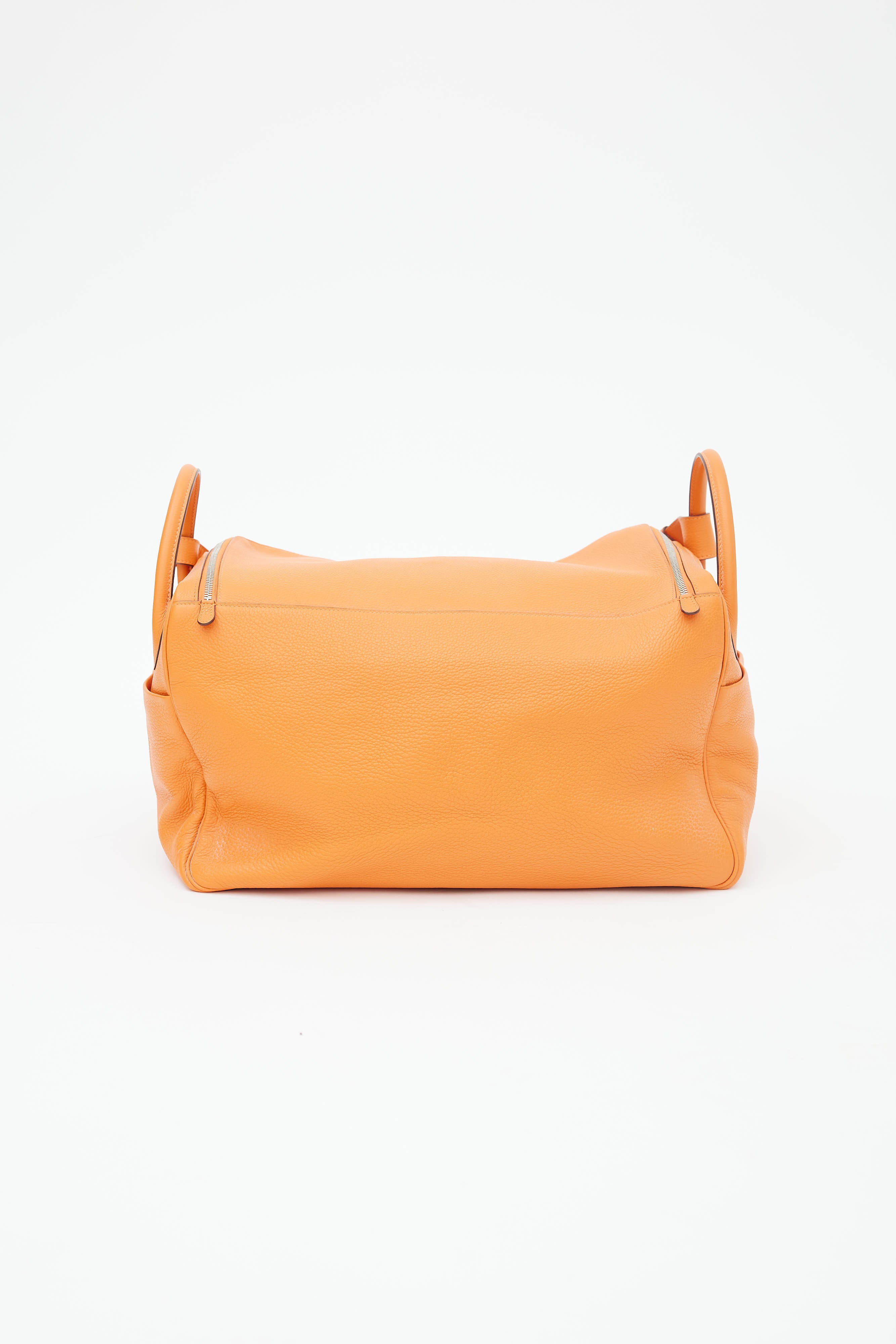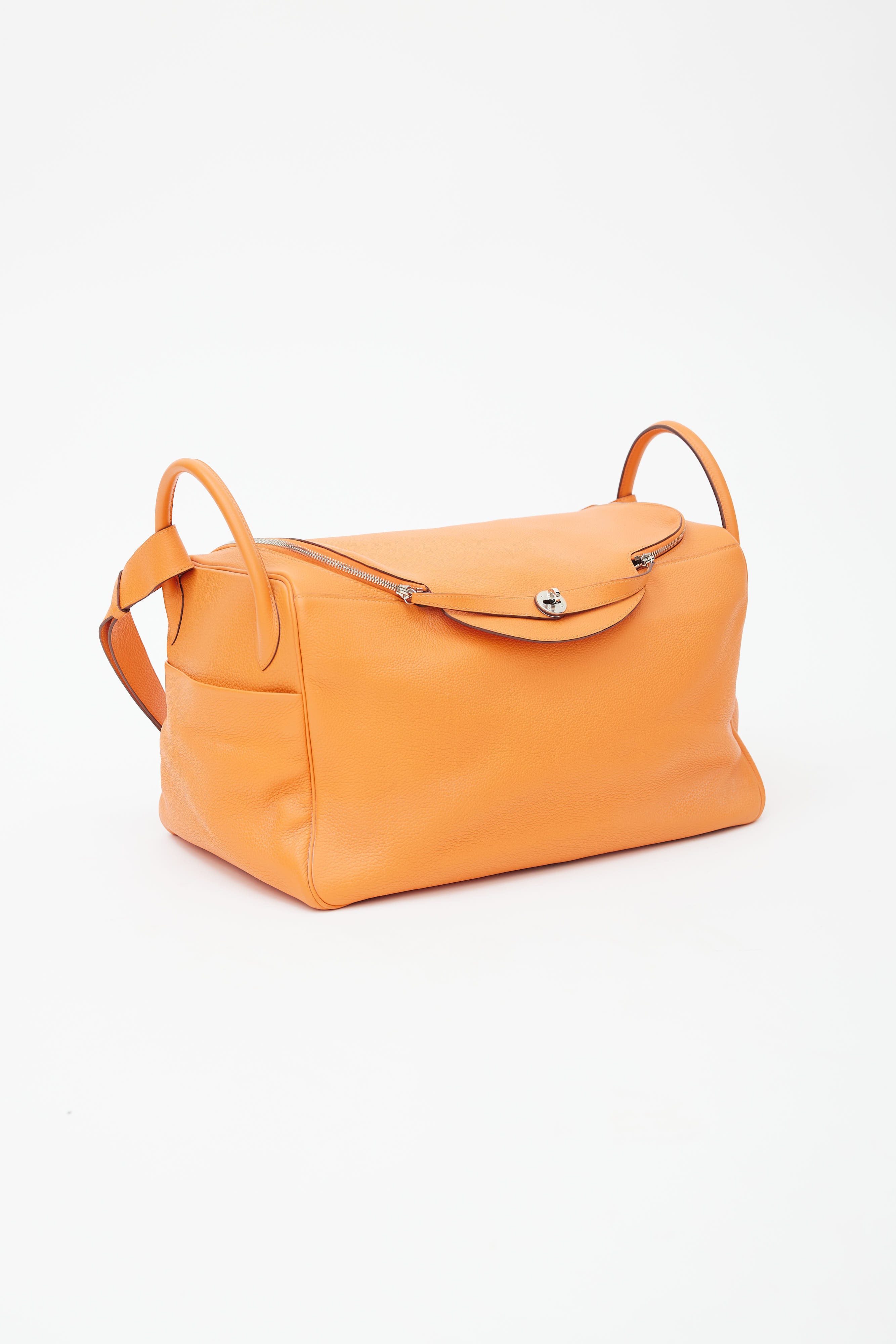 Pre-owned Hermès Lindy Voyage 45 bag in orange Clemence leather featuring dual top zip closure with turn lock, palladium hardware, silver-tone logo stamp at face, two exterior slip pockets at side, dual rolled side handles, clochette with small lock, adjustable shoulder strap, interior slip and zip pockets, and metal feet. Original dust bag included.