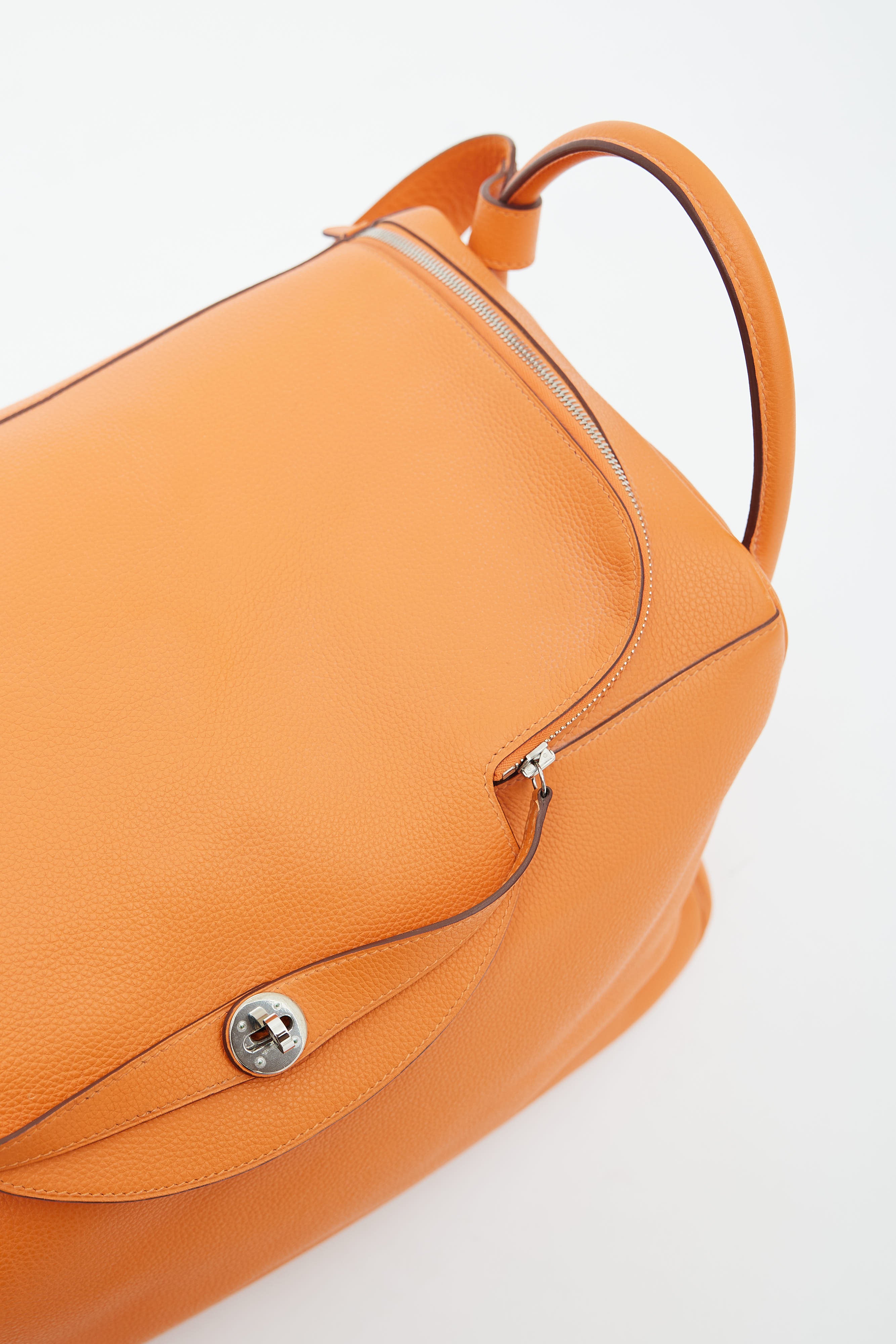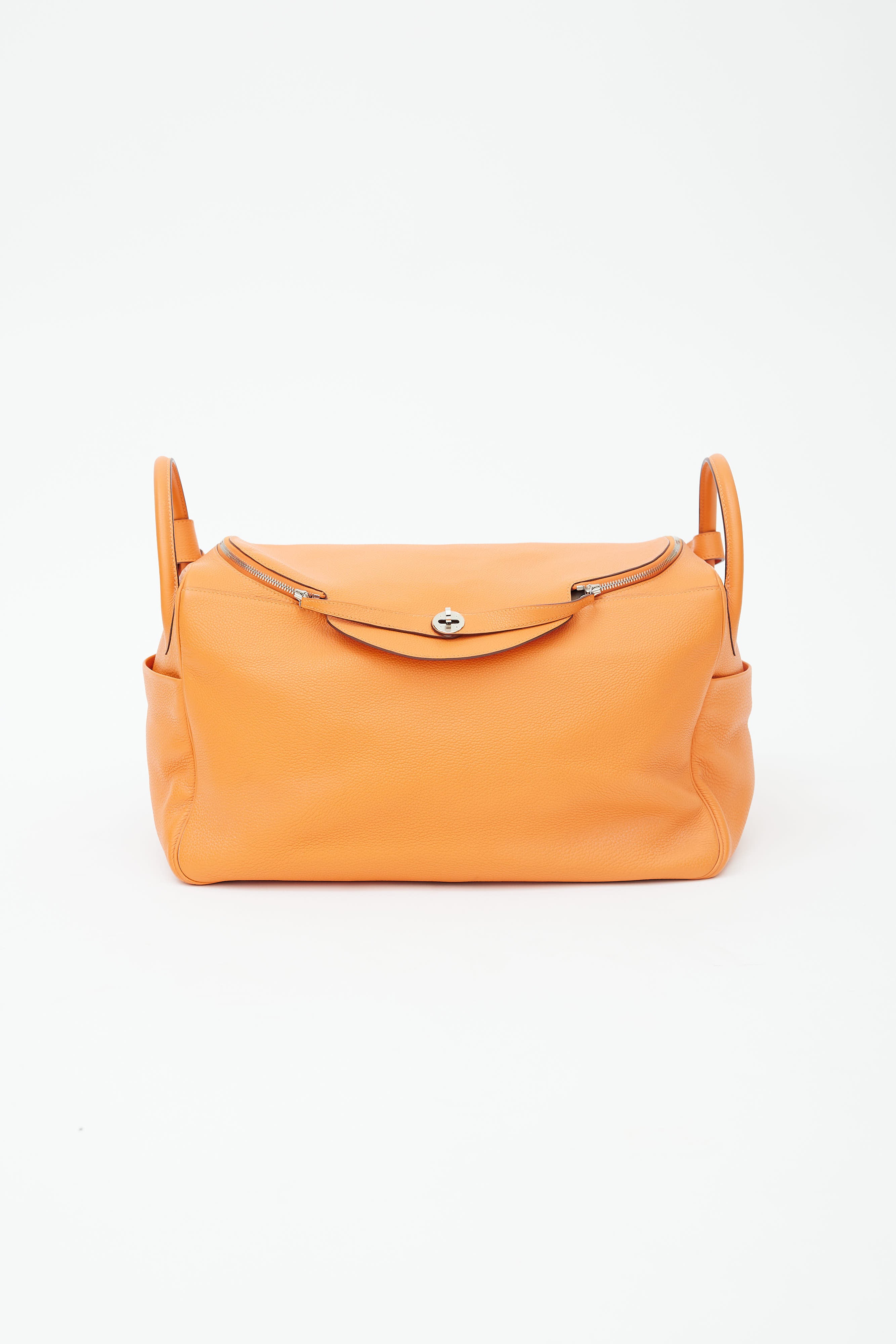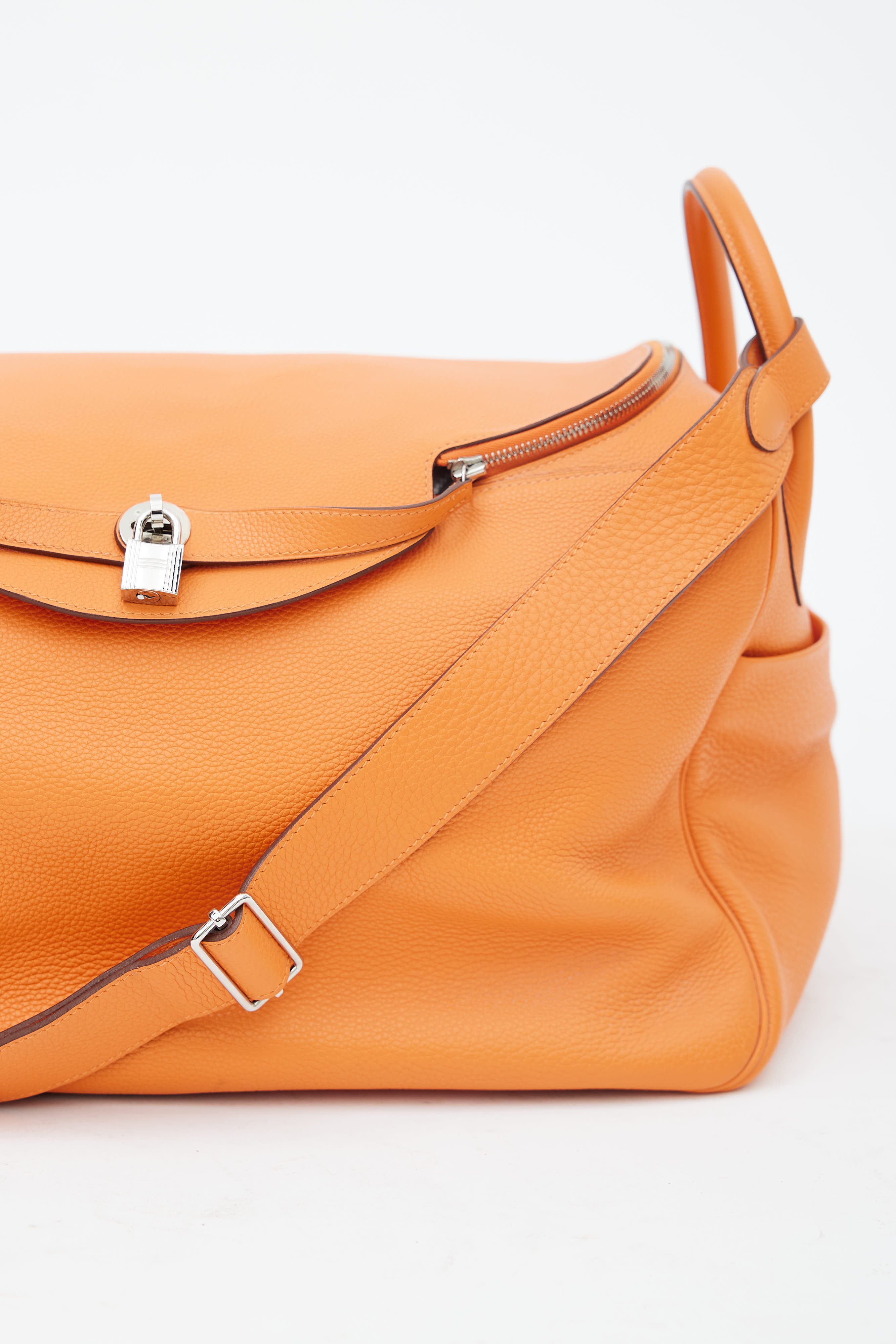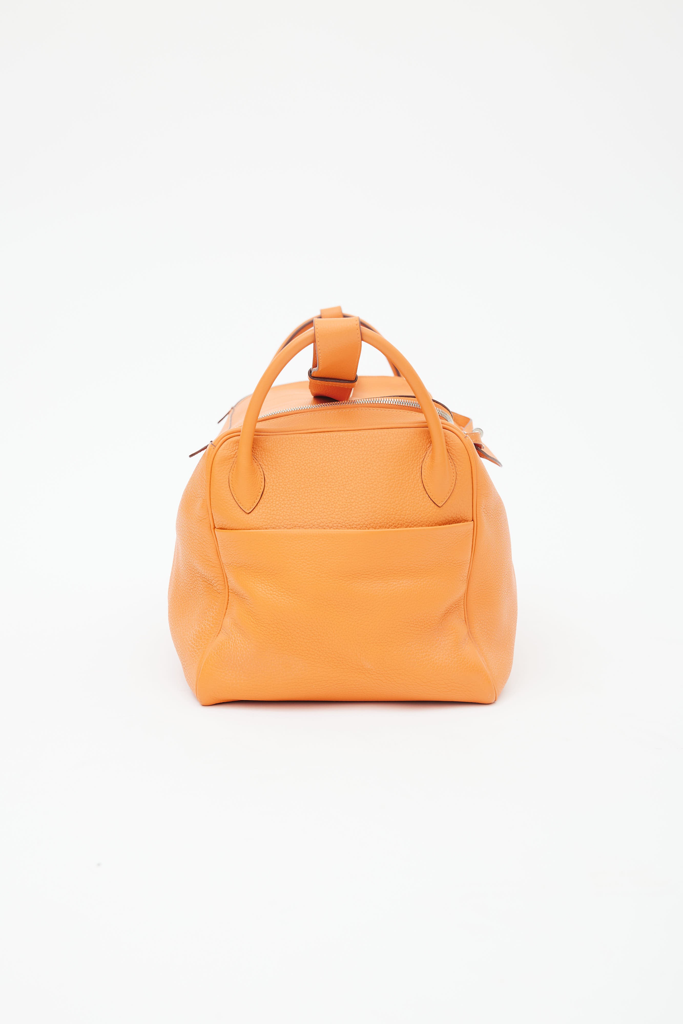 Pre-owned Hermès Lindy Voyage 45 bag in orange Clemence leather featuring dual top zip closure with turn lock, palladium hardware, silver-tone logo stamp at face, two exterior slip pockets at side, dual rolled side handles, clochette with small lock, adjustable shoulder strap, interior slip and zip pockets, and metal feet. Original dust bag included.
