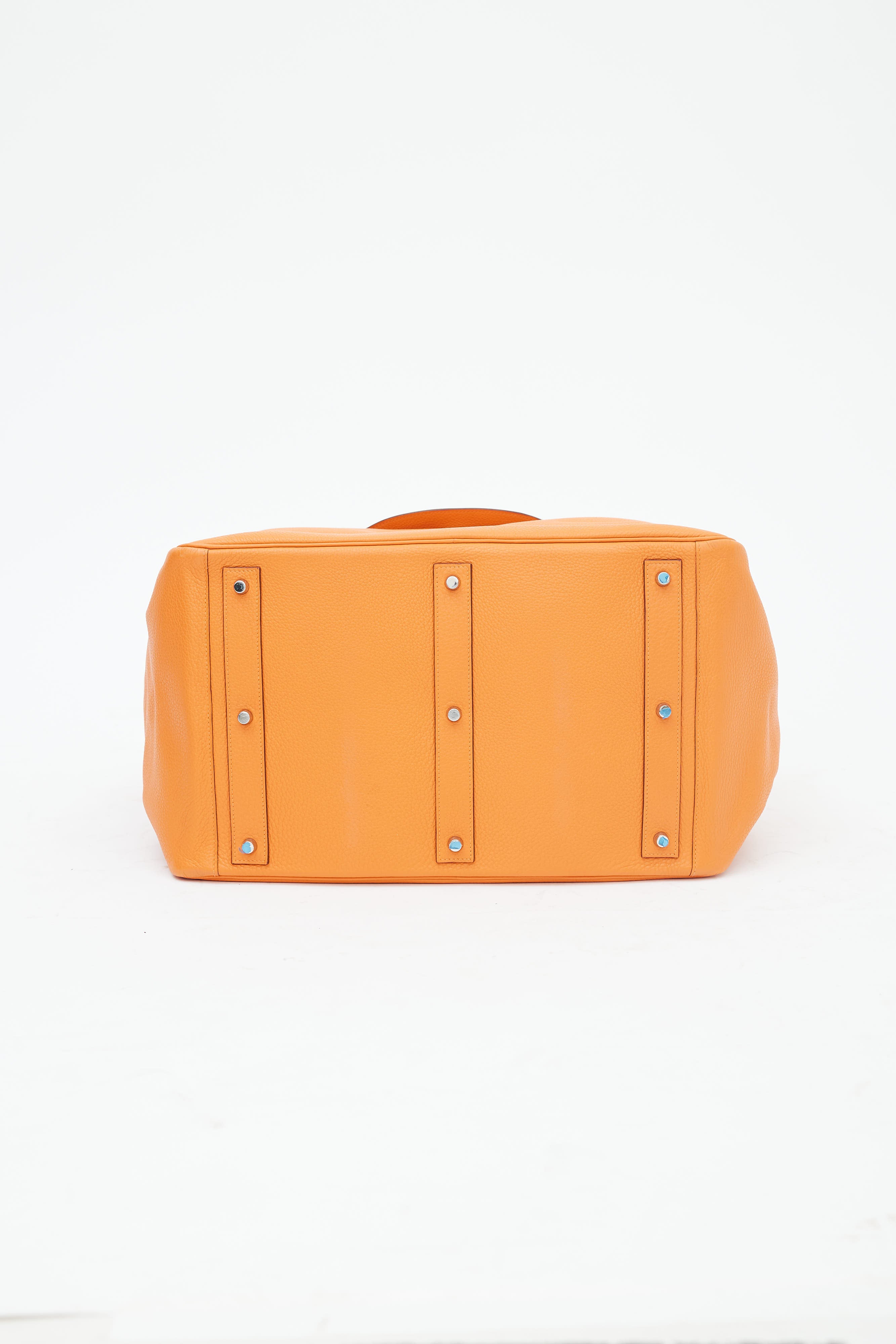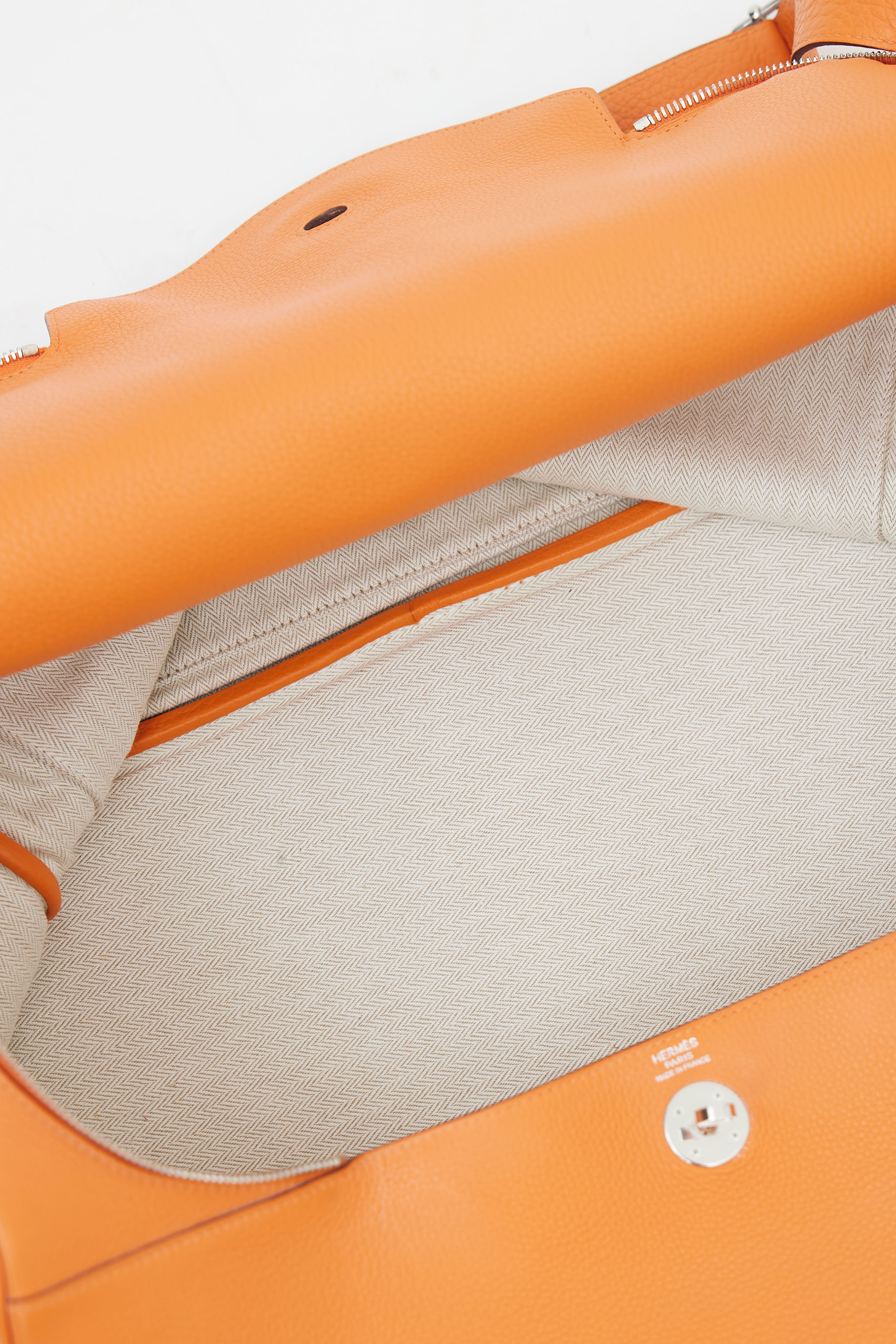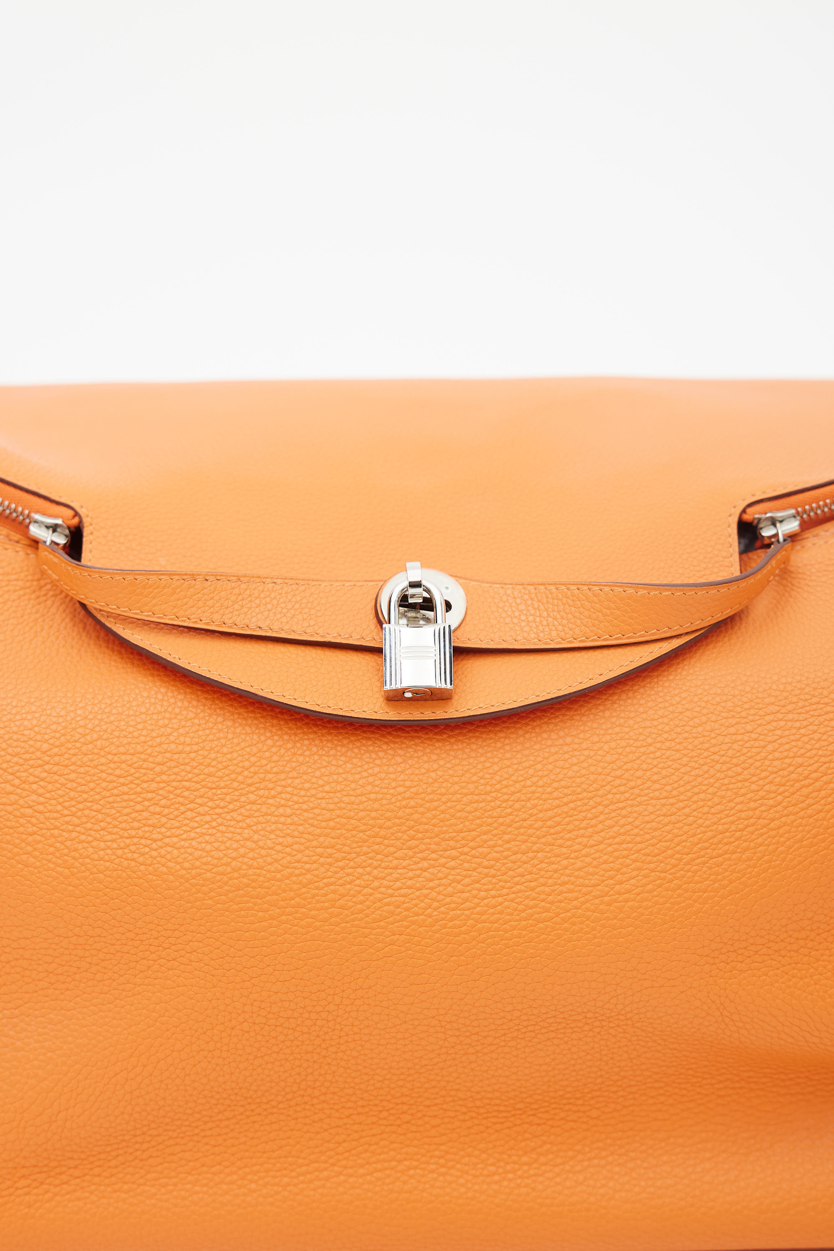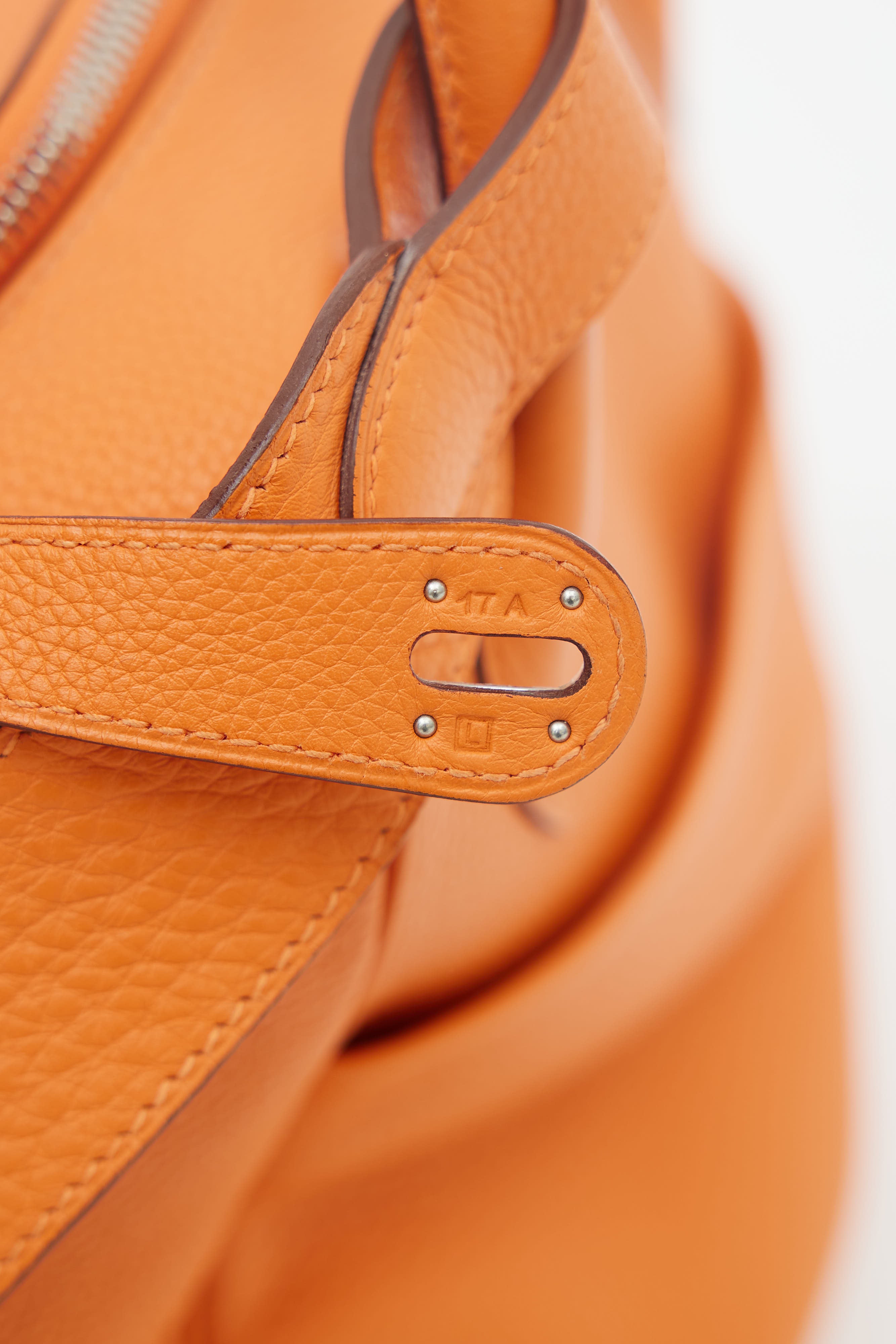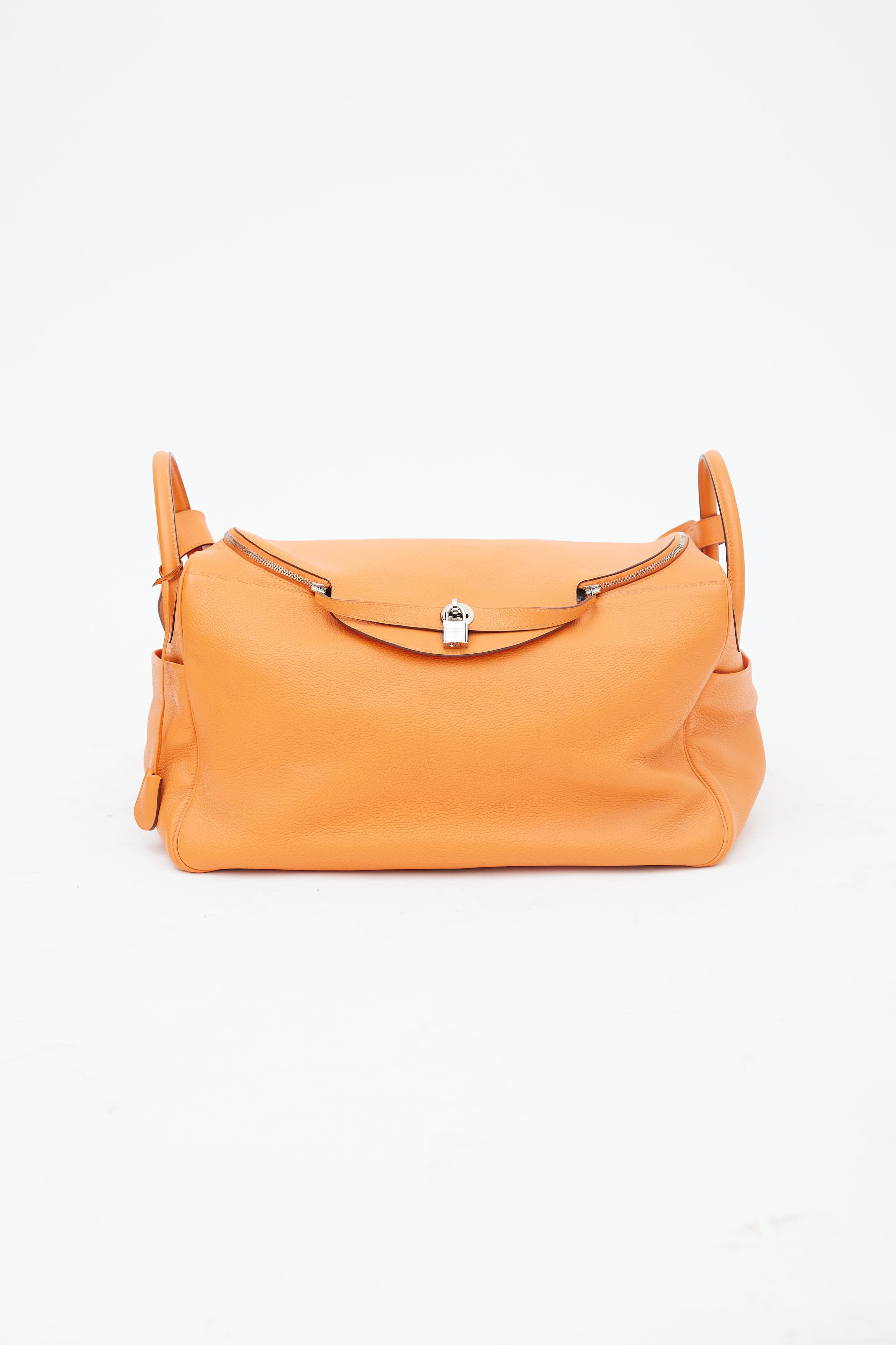 Pre-owned Hermès Lindy Voyage 45 bag in orange Clemence leather featuring dual top zip closure with turn lock, palladium hardware, silver-tone logo stamp at face, two exterior slip pockets at side, dual rolled side handles, clochette with small lock, adjustable shoulder strap, interior slip and zip pockets, and metal feet. Original dust bag included.