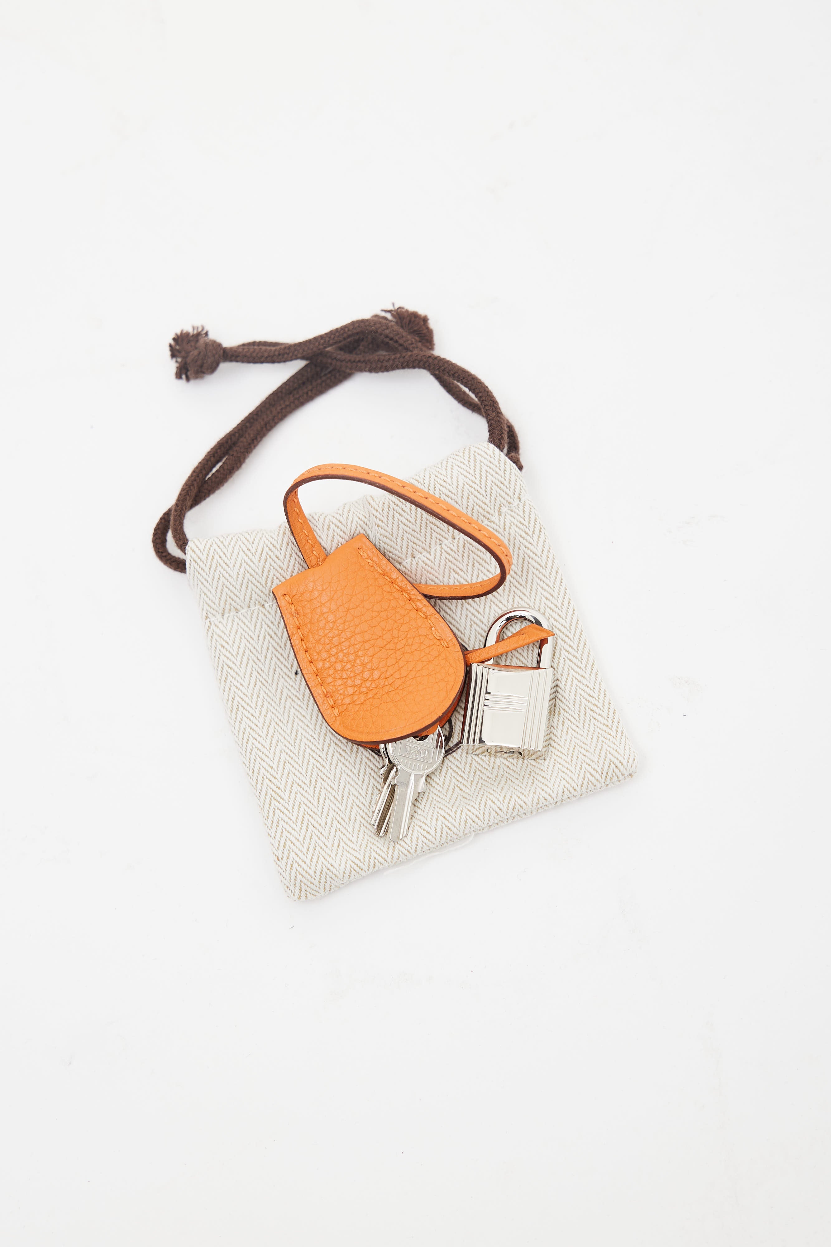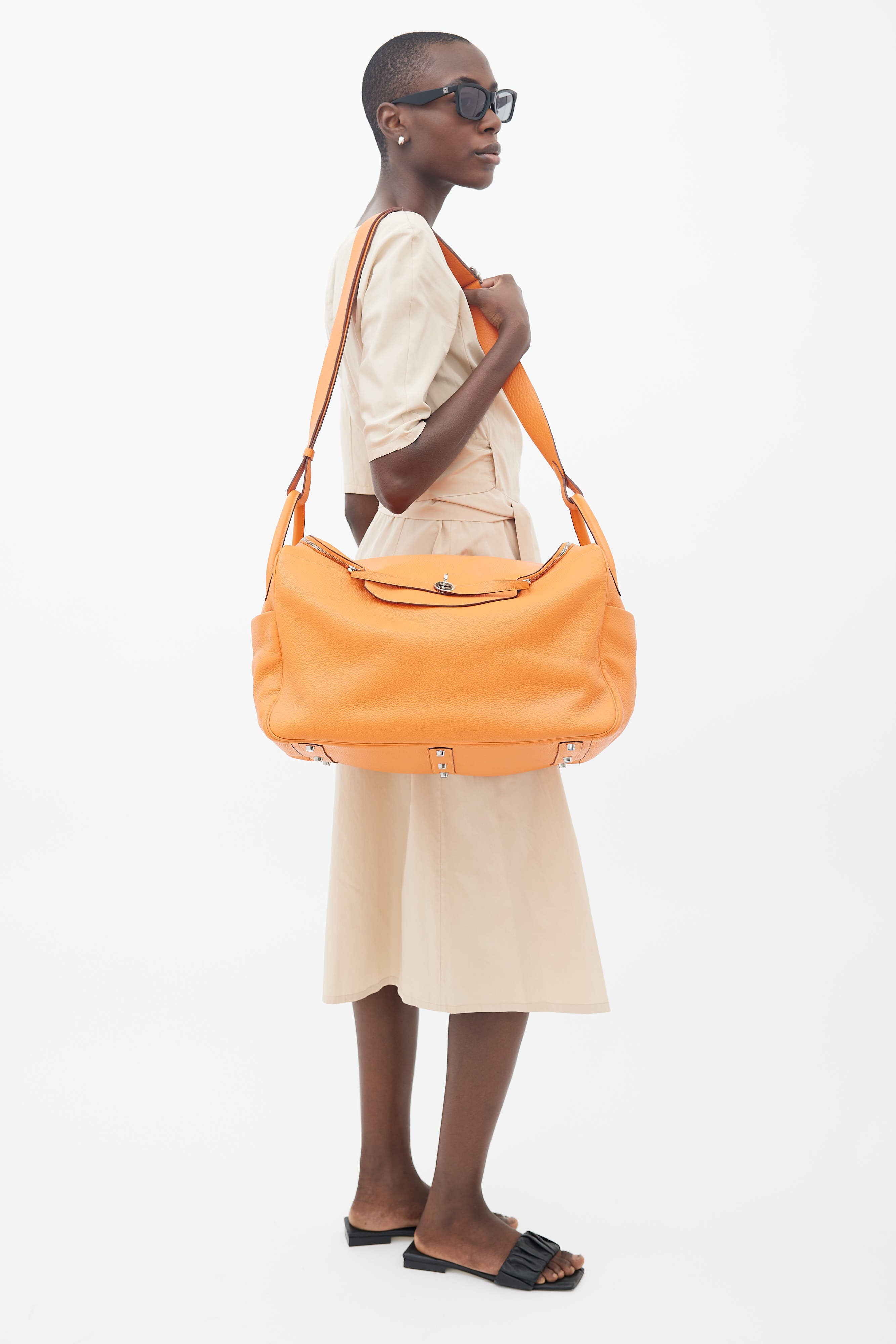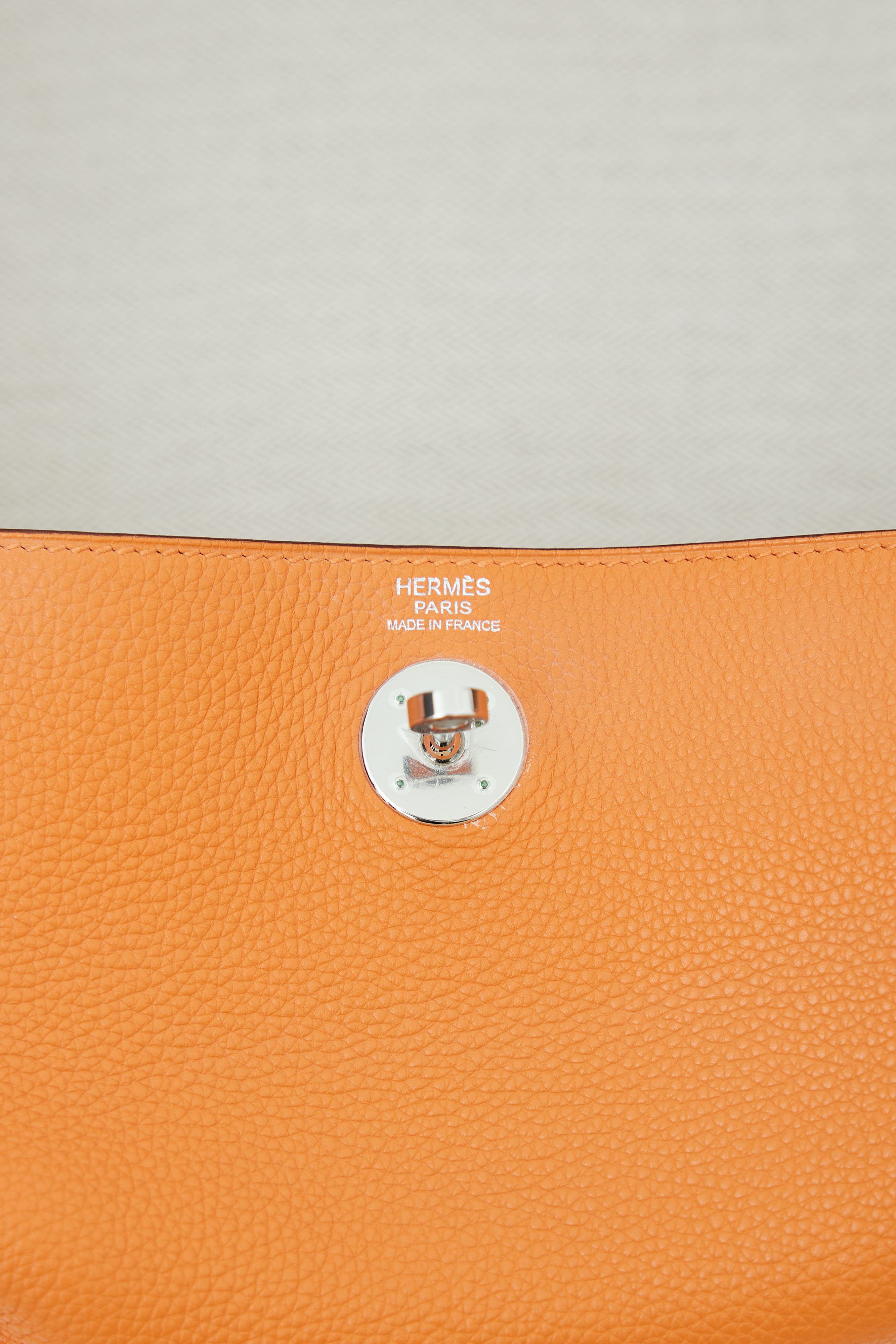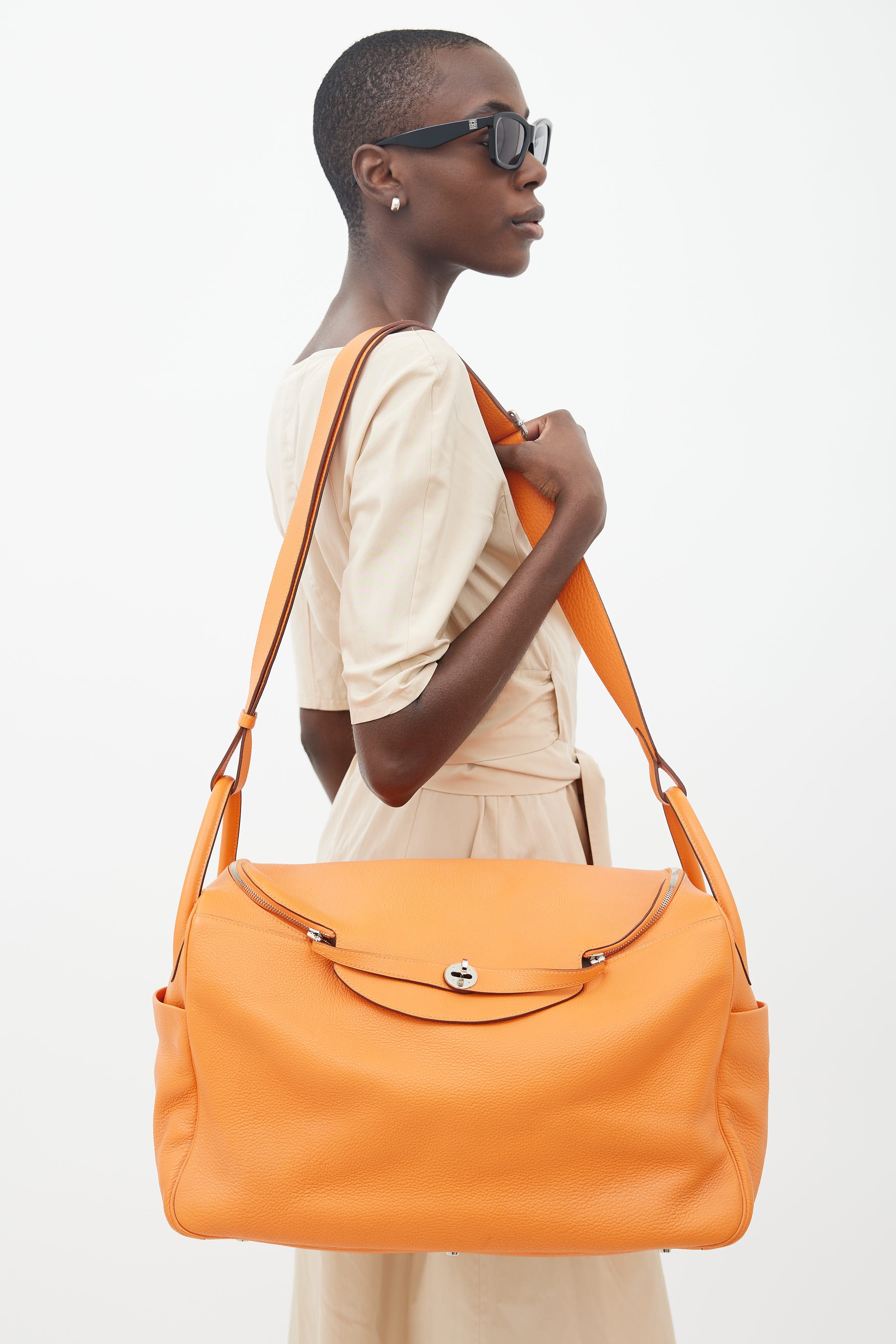 Pre-owned Hermès Lindy Voyage 45 bag in orange Clemence leather featuring dual top zip closure with turn lock, palladium hardware, silver-tone logo stamp at face, two exterior slip pockets at side, dual rolled side handles, clochette with small lock, adjustable shoulder strap, interior slip and zip pockets, and metal feet. Original dust bag included.