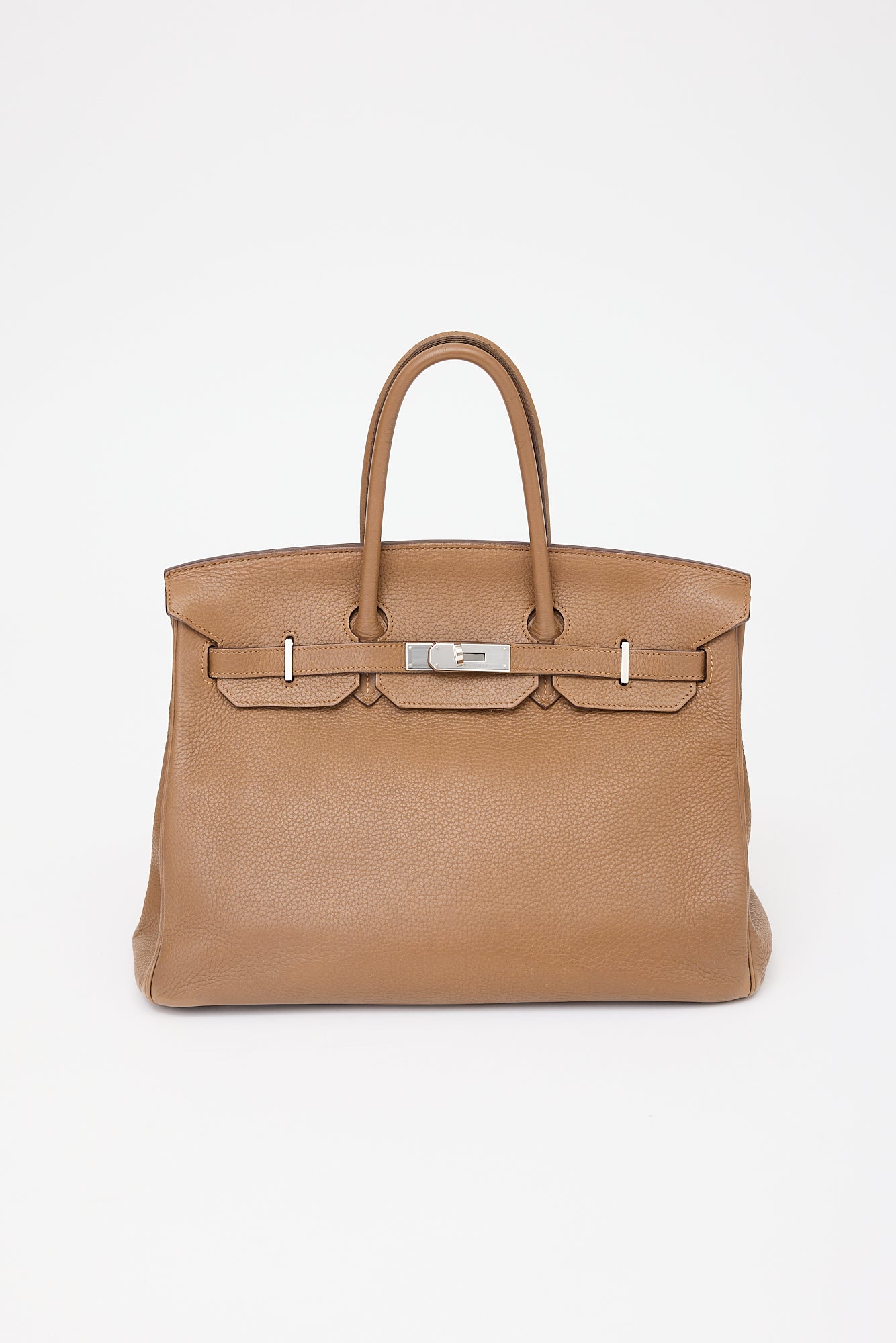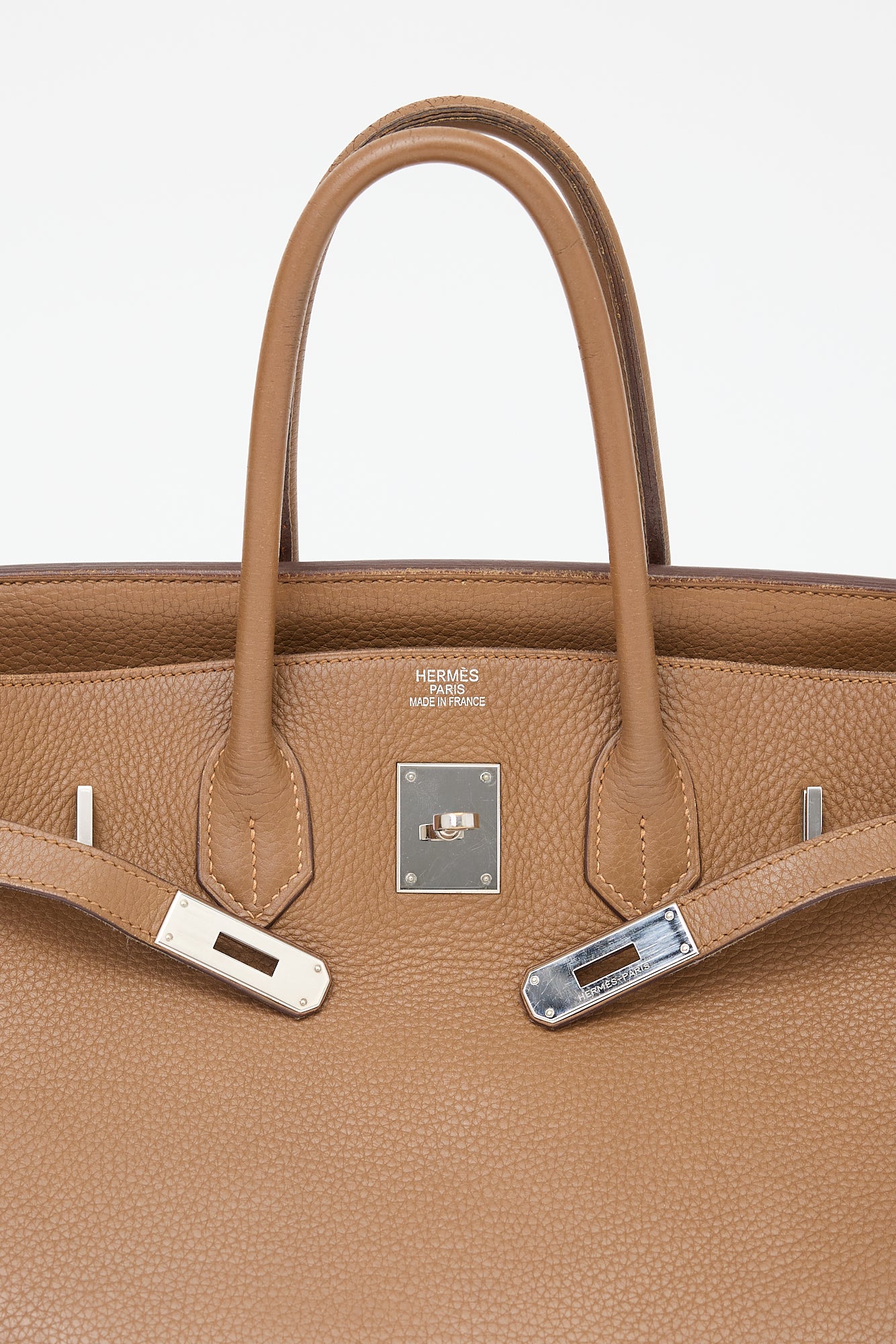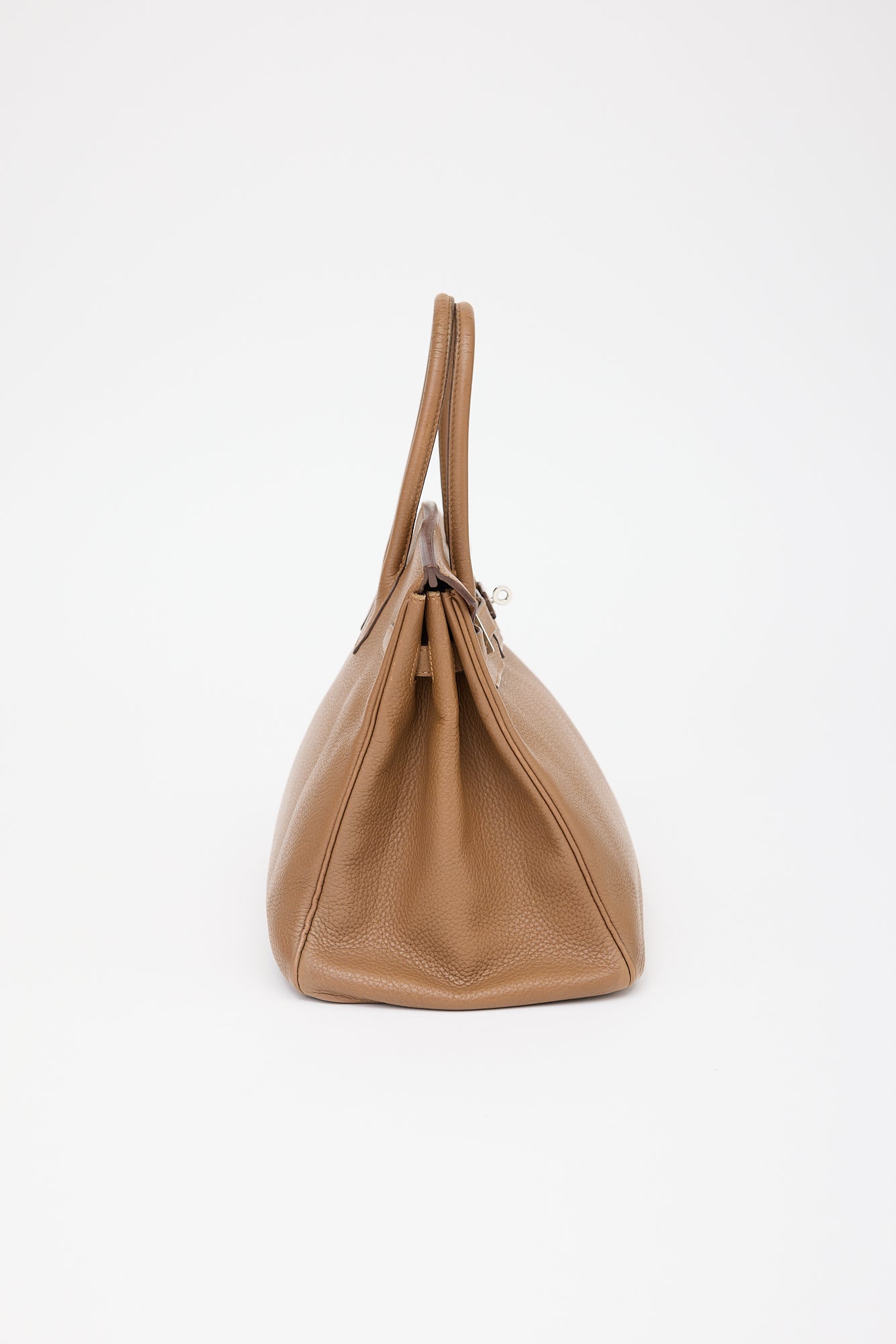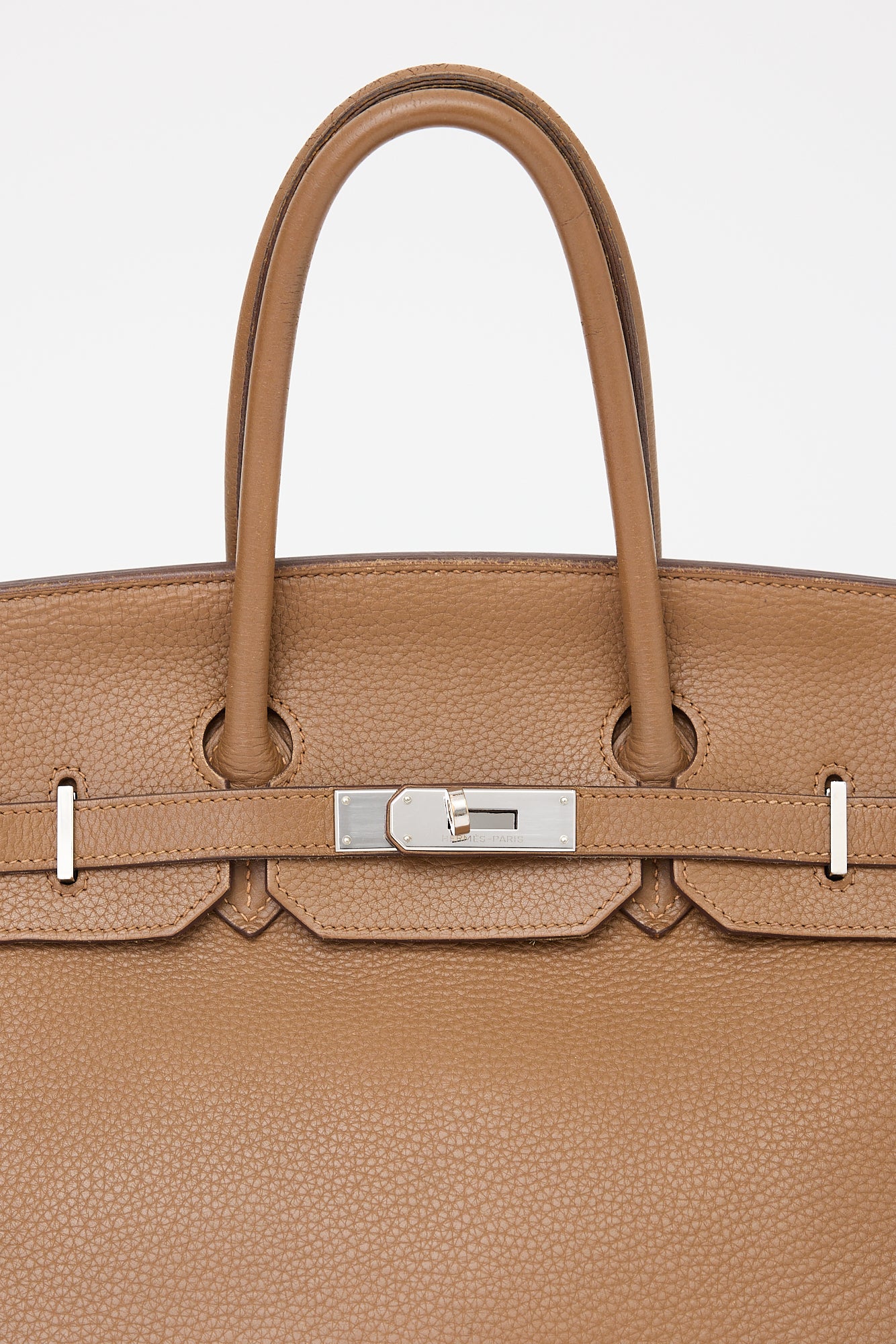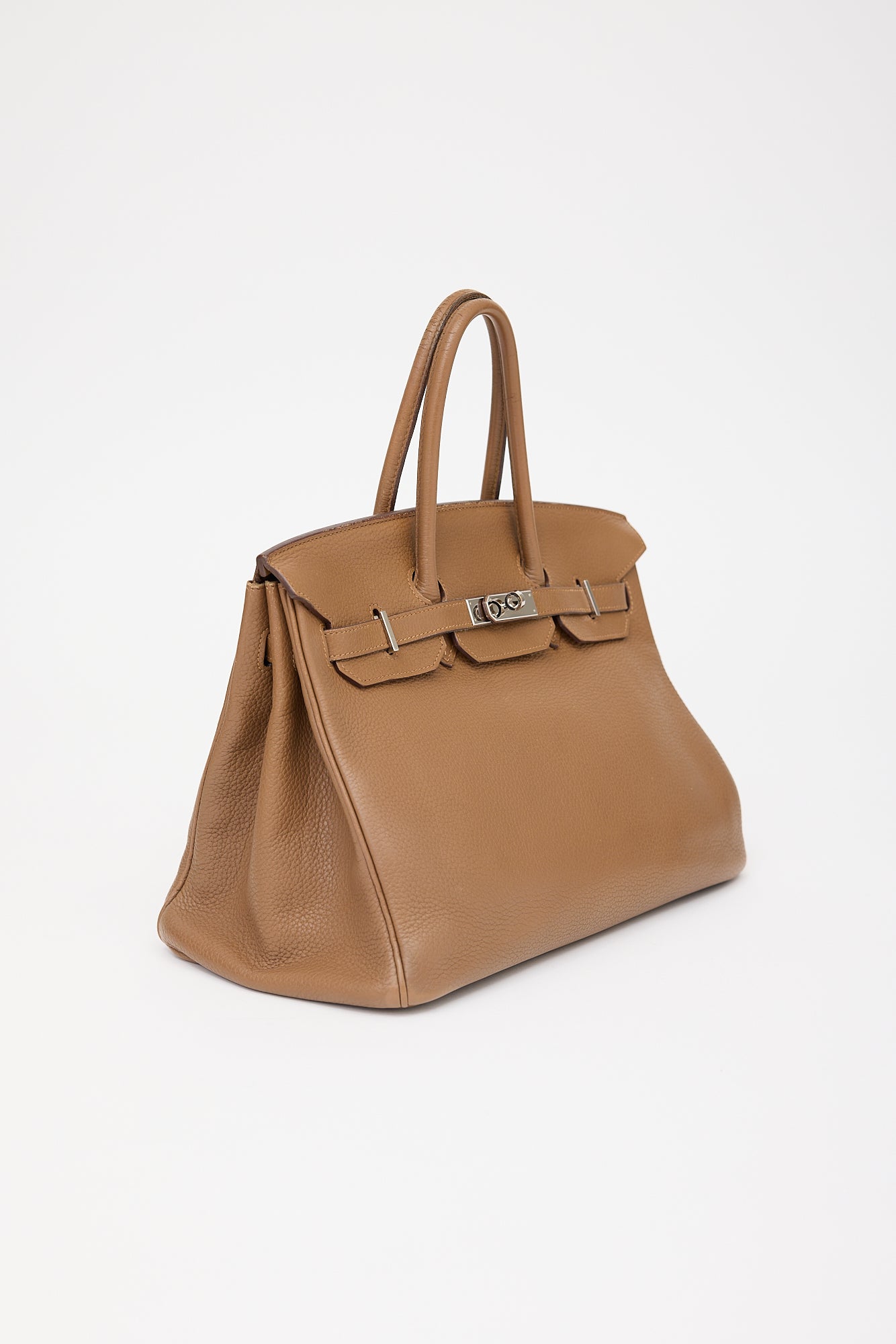 Pre-owned Hermès 2009 Birkin 35 bag in Alezan Clemence leather featuring dual rolled top handles, palladium hardware, tonal stitching, sangles, logo engraved plaque, signature touret closure, silver stamped logo under top flap, four clou, and one main compartment with one zip pocket and one slip pocket.