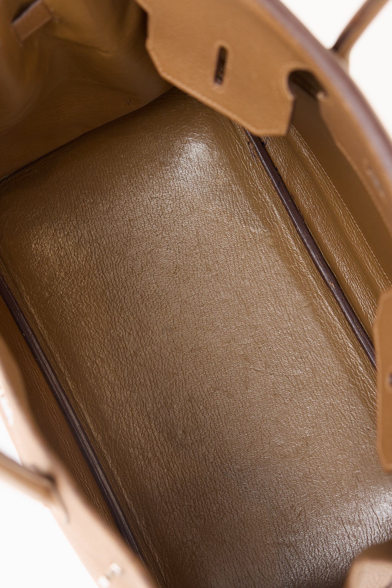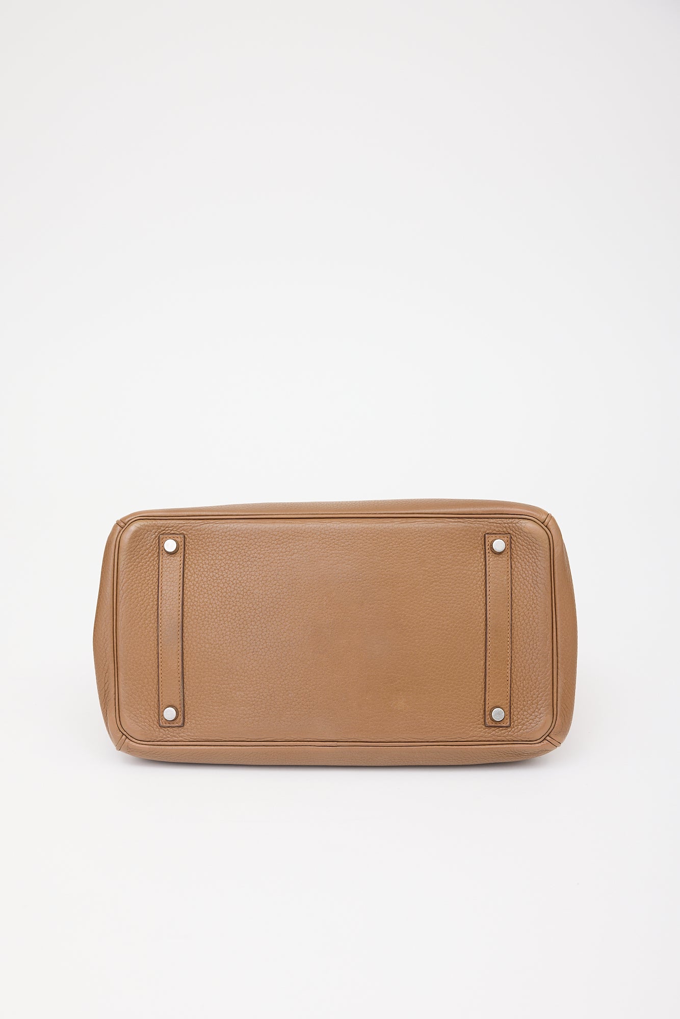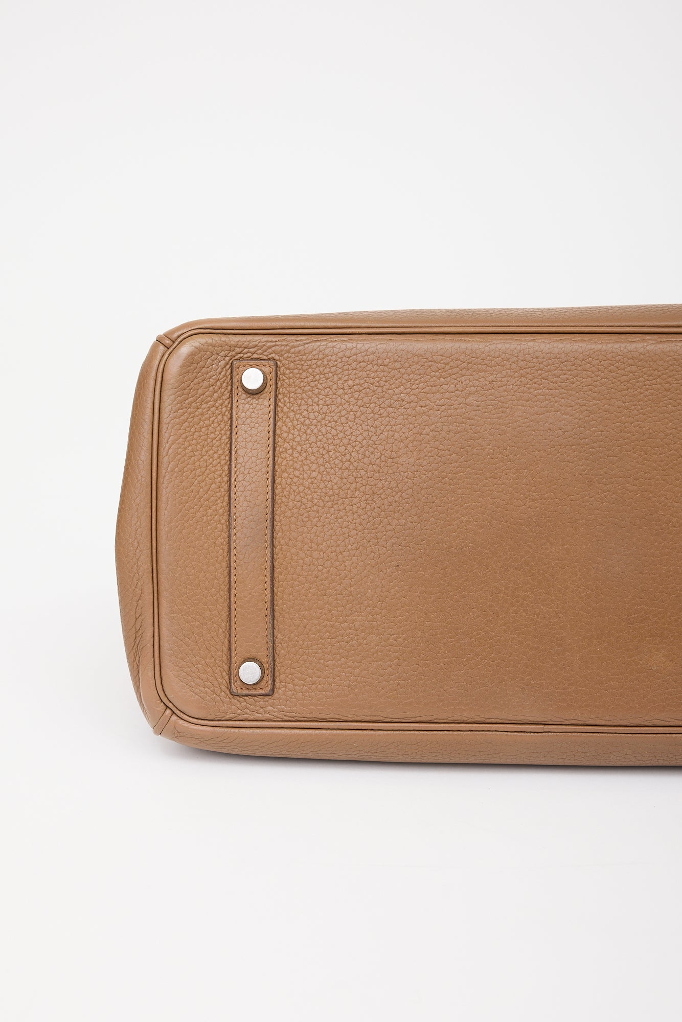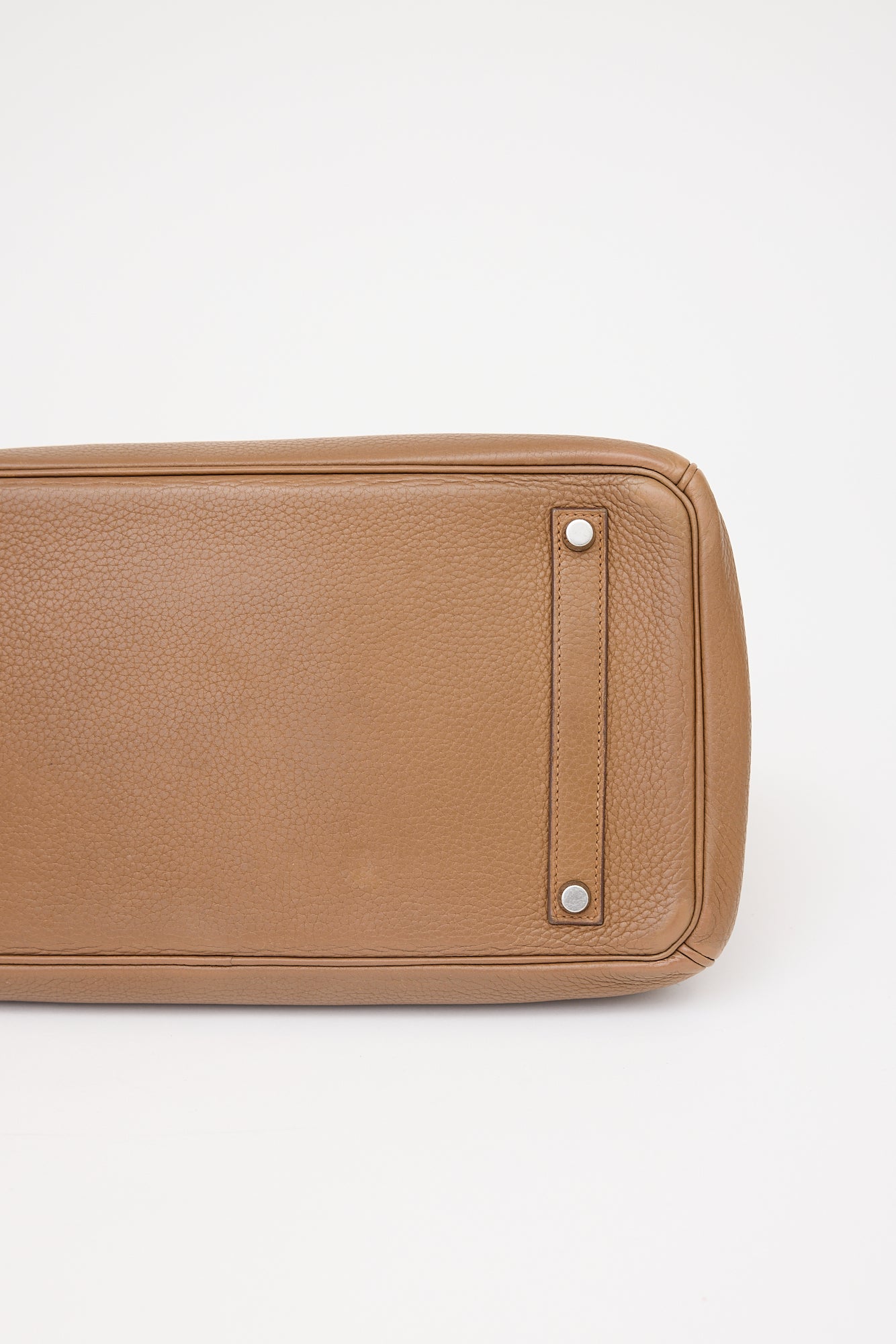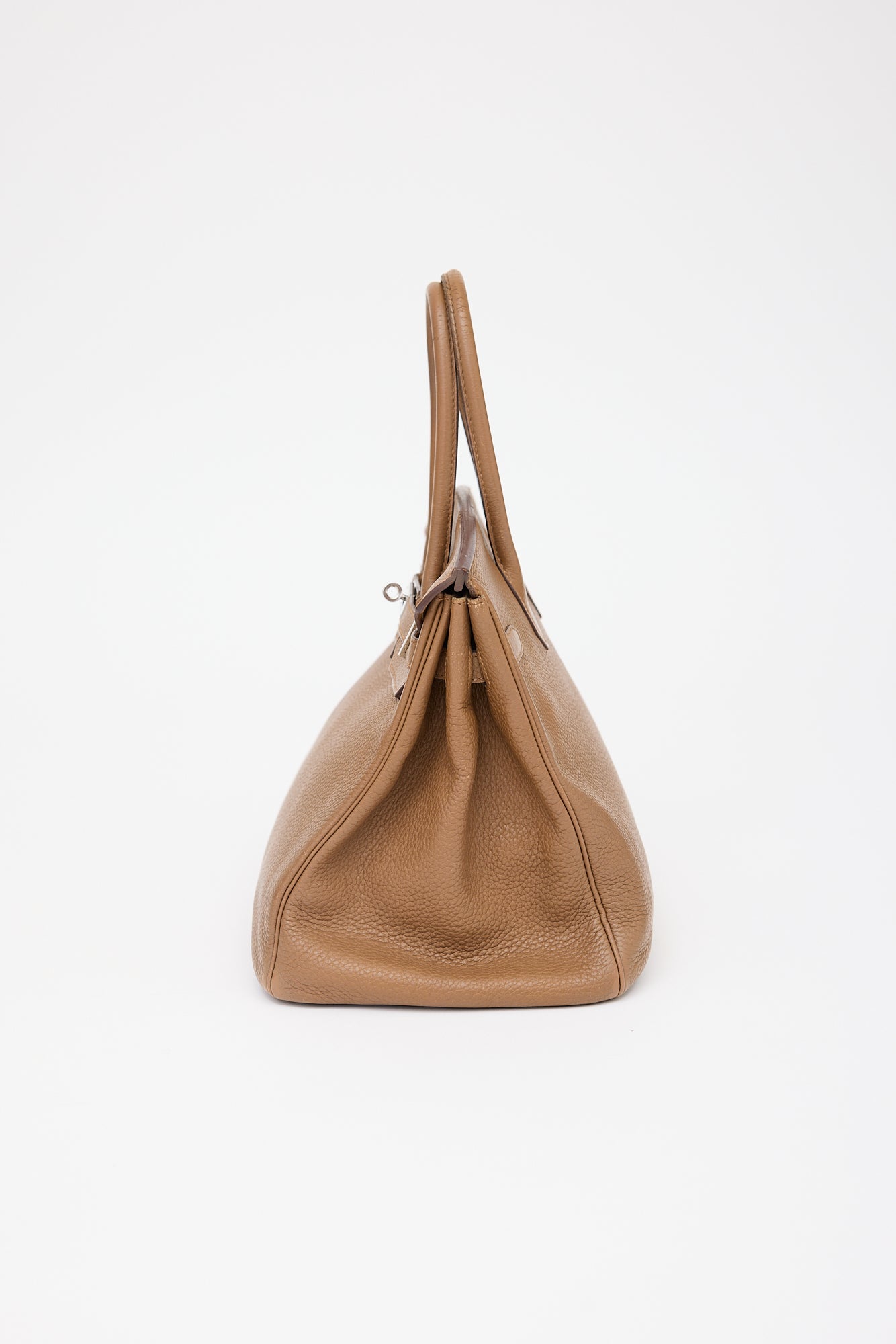 Pre-owned Hermès 2009 Birkin 35 bag in Alezan Clemence leather featuring dual rolled top handles, palladium hardware, tonal stitching, sangles, logo engraved plaque, signature touret closure, silver stamped logo under top flap, four clou, and one main compartment with one zip pocket and one slip pocket.