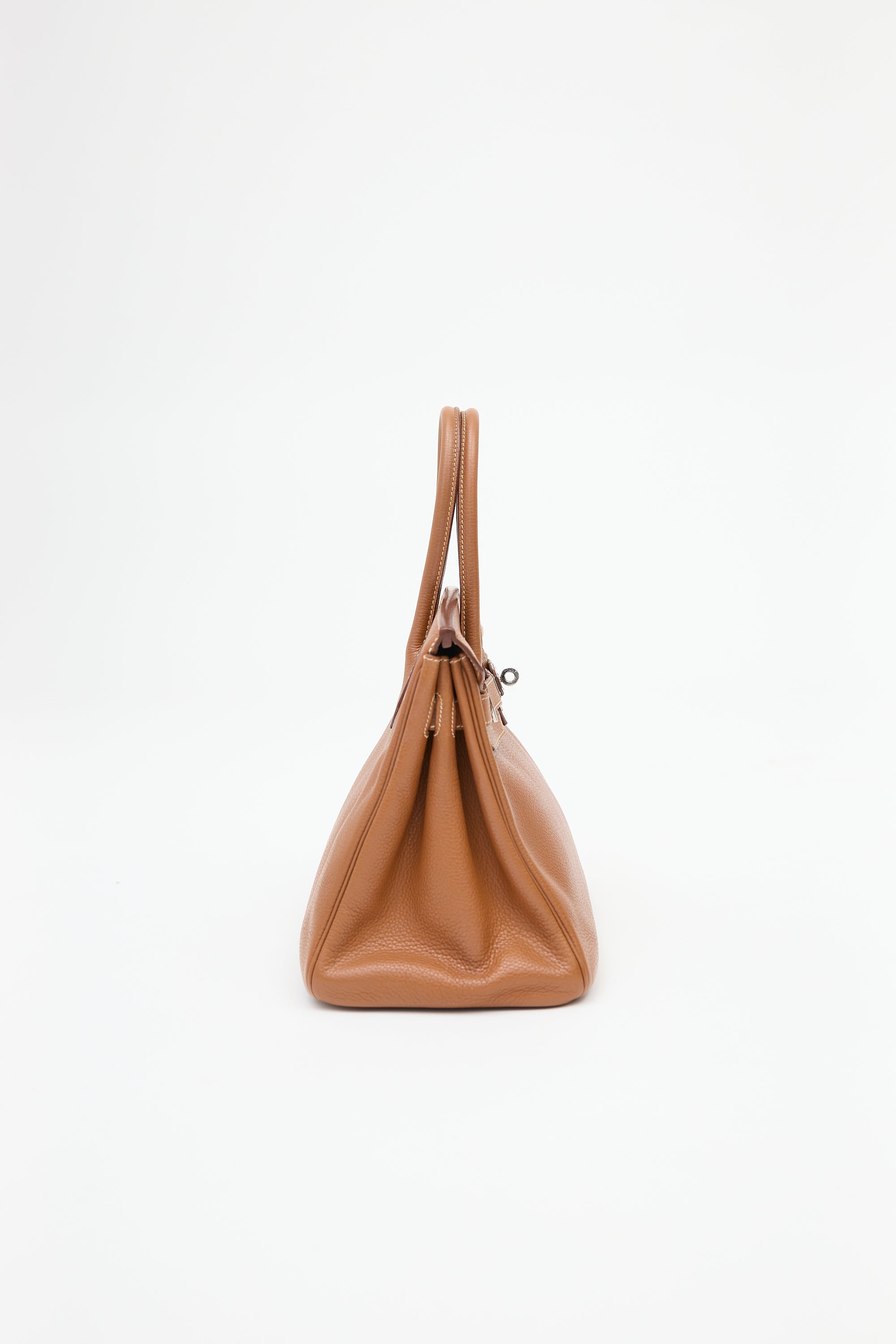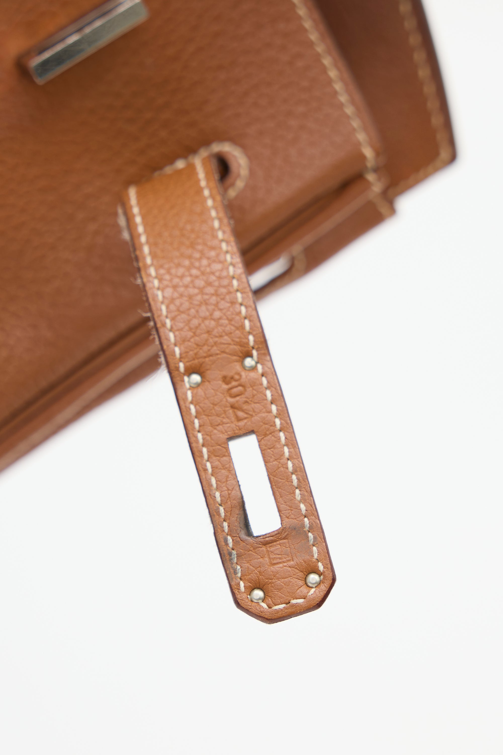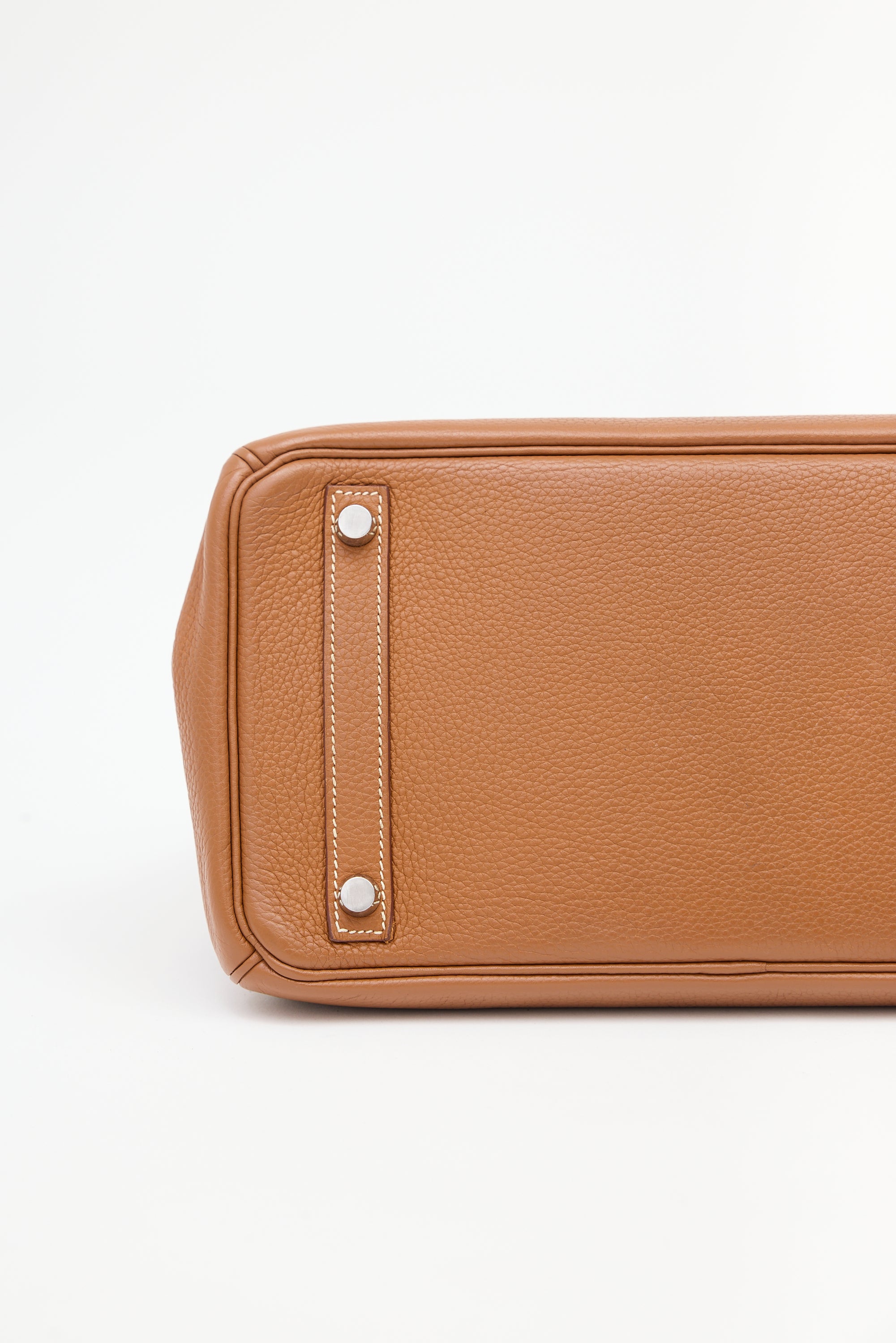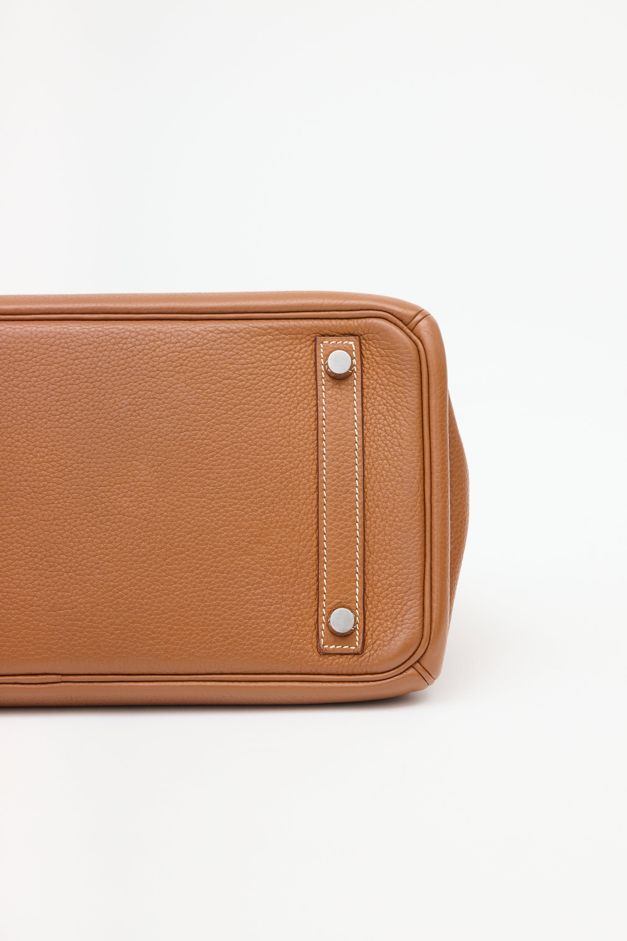 Pre-owned Hermès 2009 Birkin 30 bag in Gold Togo leather featuring dual rolled top handles, Palladium hardware, four clou, sangles, logo engraved plaque, signature touret closure, silver stamped logo under top flap, four clou, detachable padlock and clochette, and one main compartment with one zip pocket and one slip pocket.