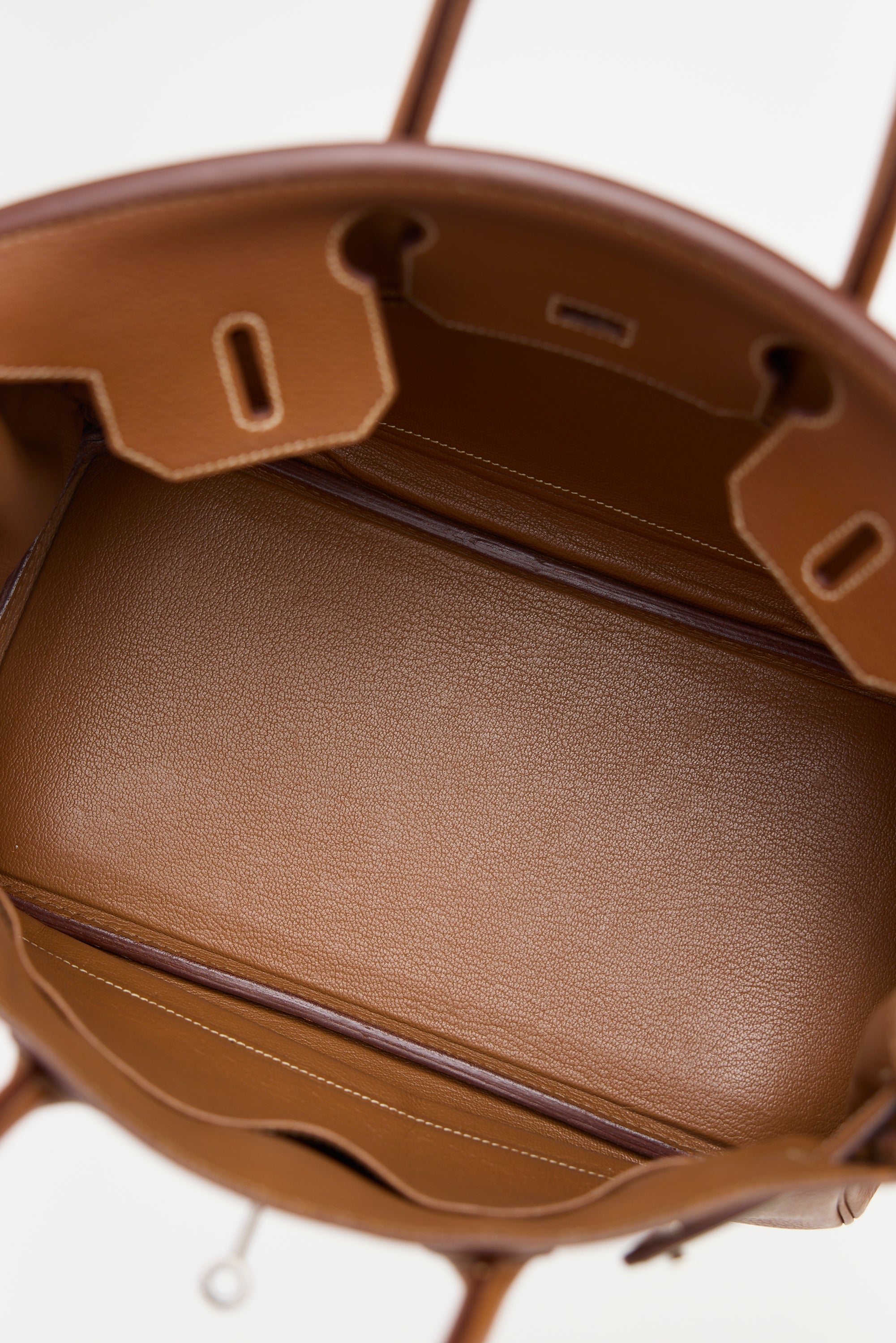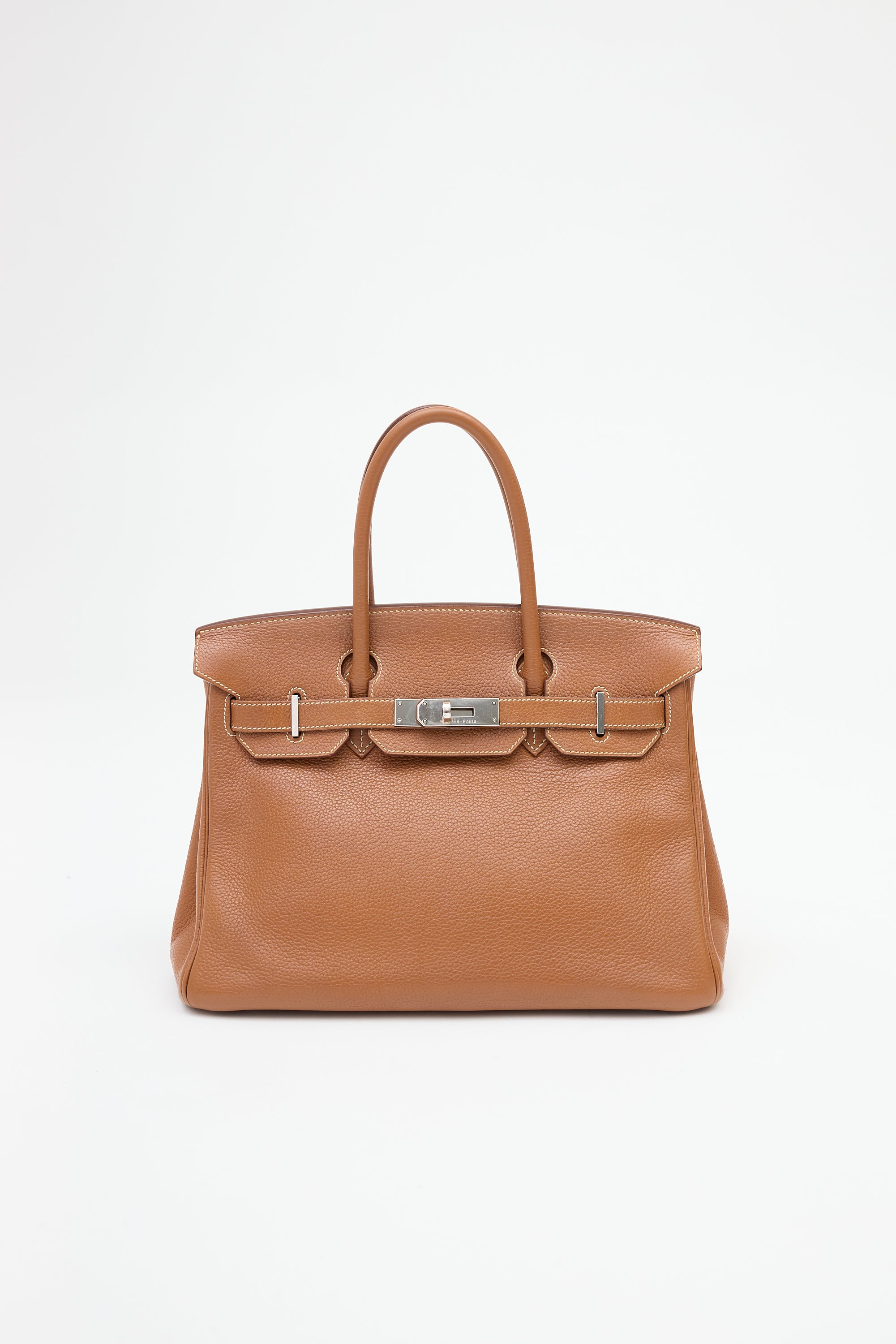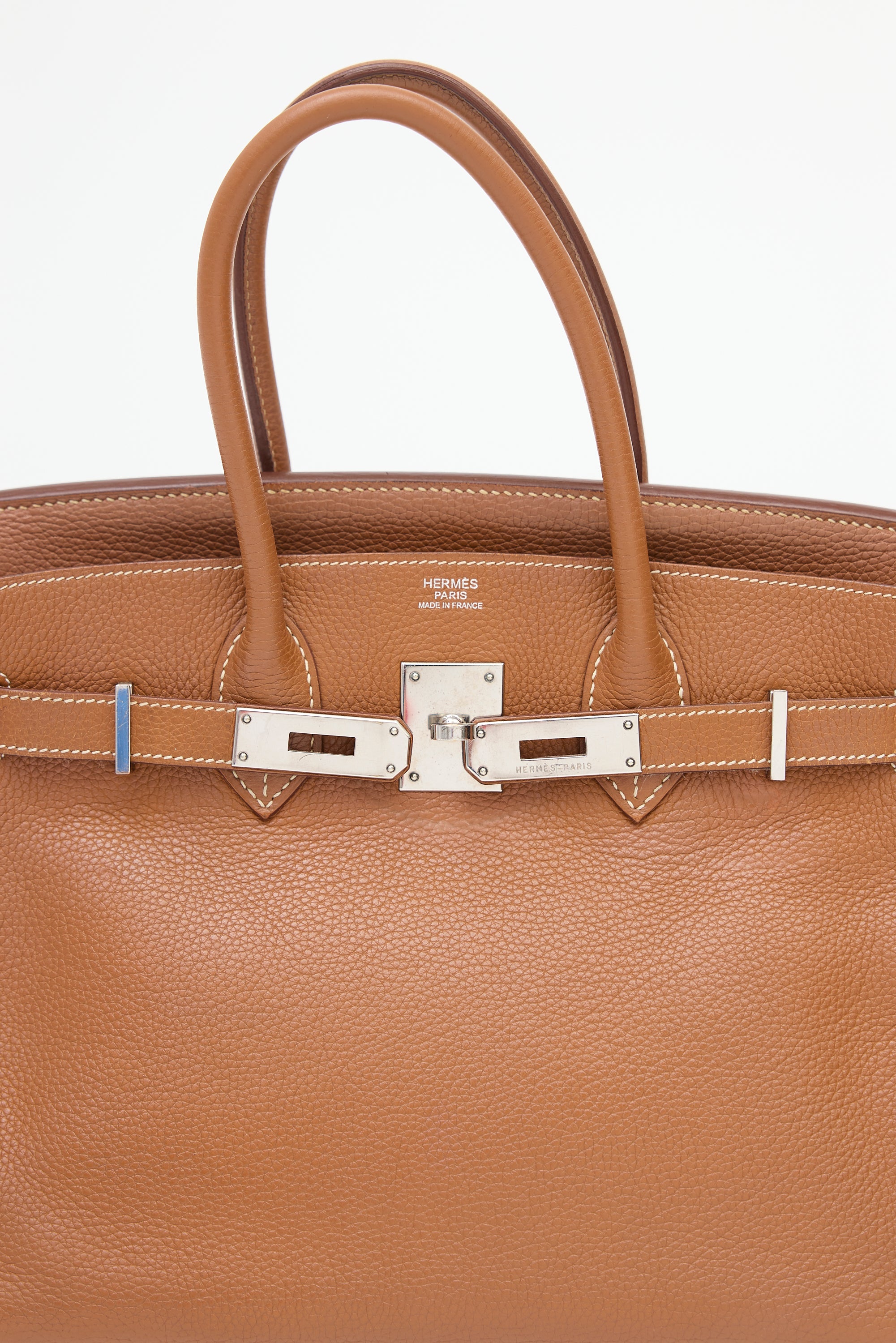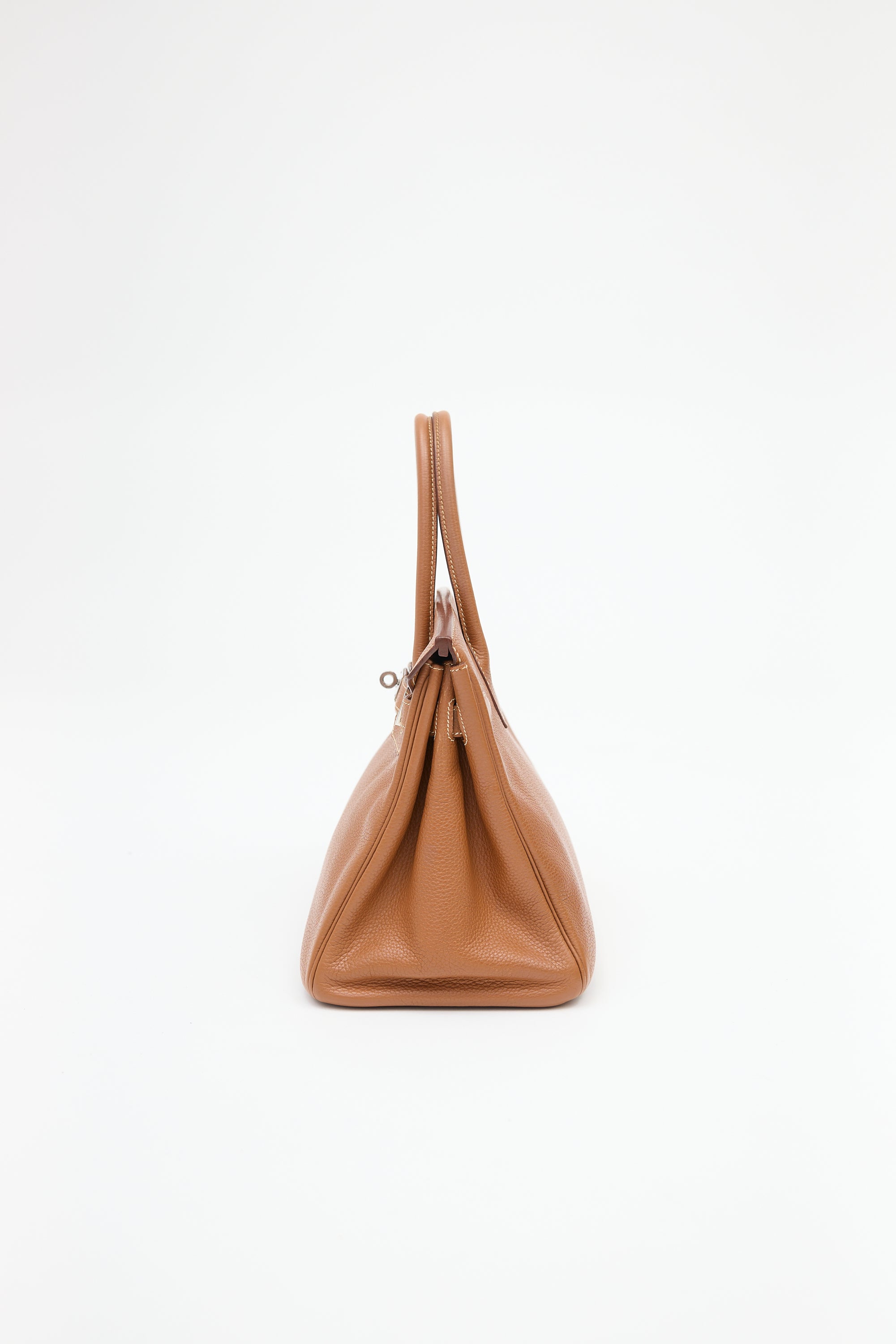 Pre-owned Hermès 2009 Birkin 30 bag in Gold Togo leather featuring dual rolled top handles, Palladium hardware, four clou, sangles, logo engraved plaque, signature touret closure, silver stamped logo under top flap, four clou, detachable padlock and clochette, and one main compartment with one zip pocket and one slip pocket.