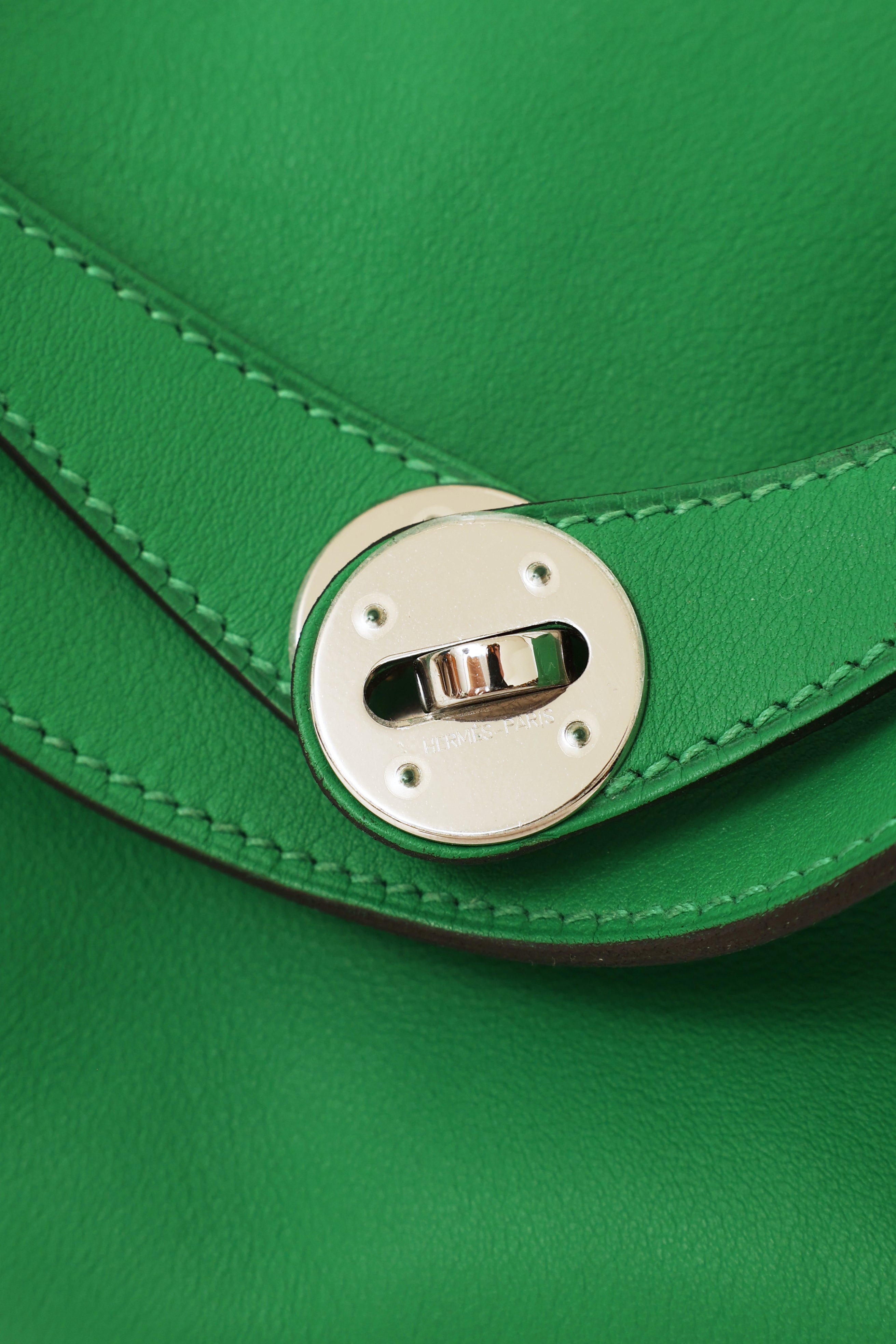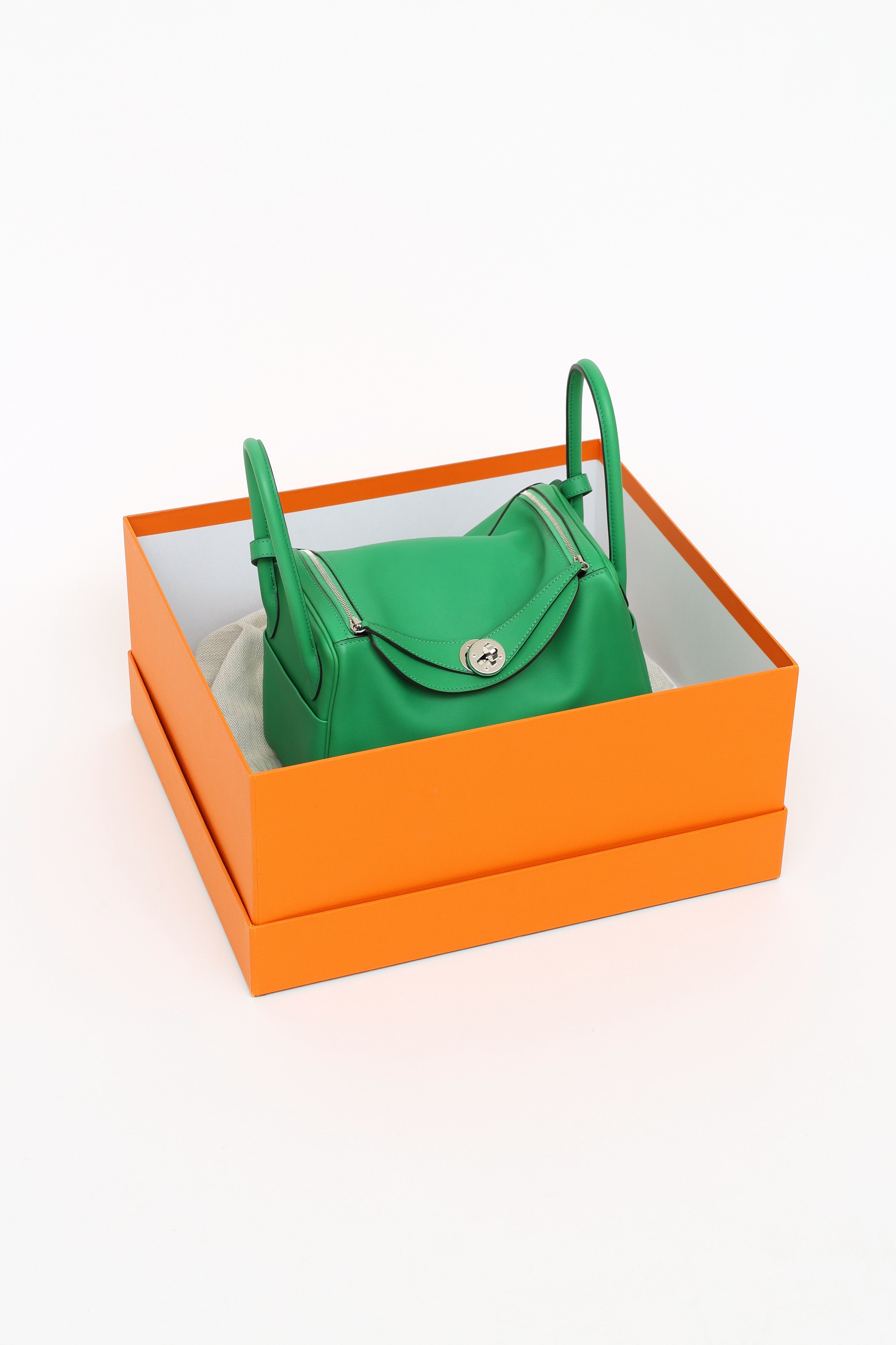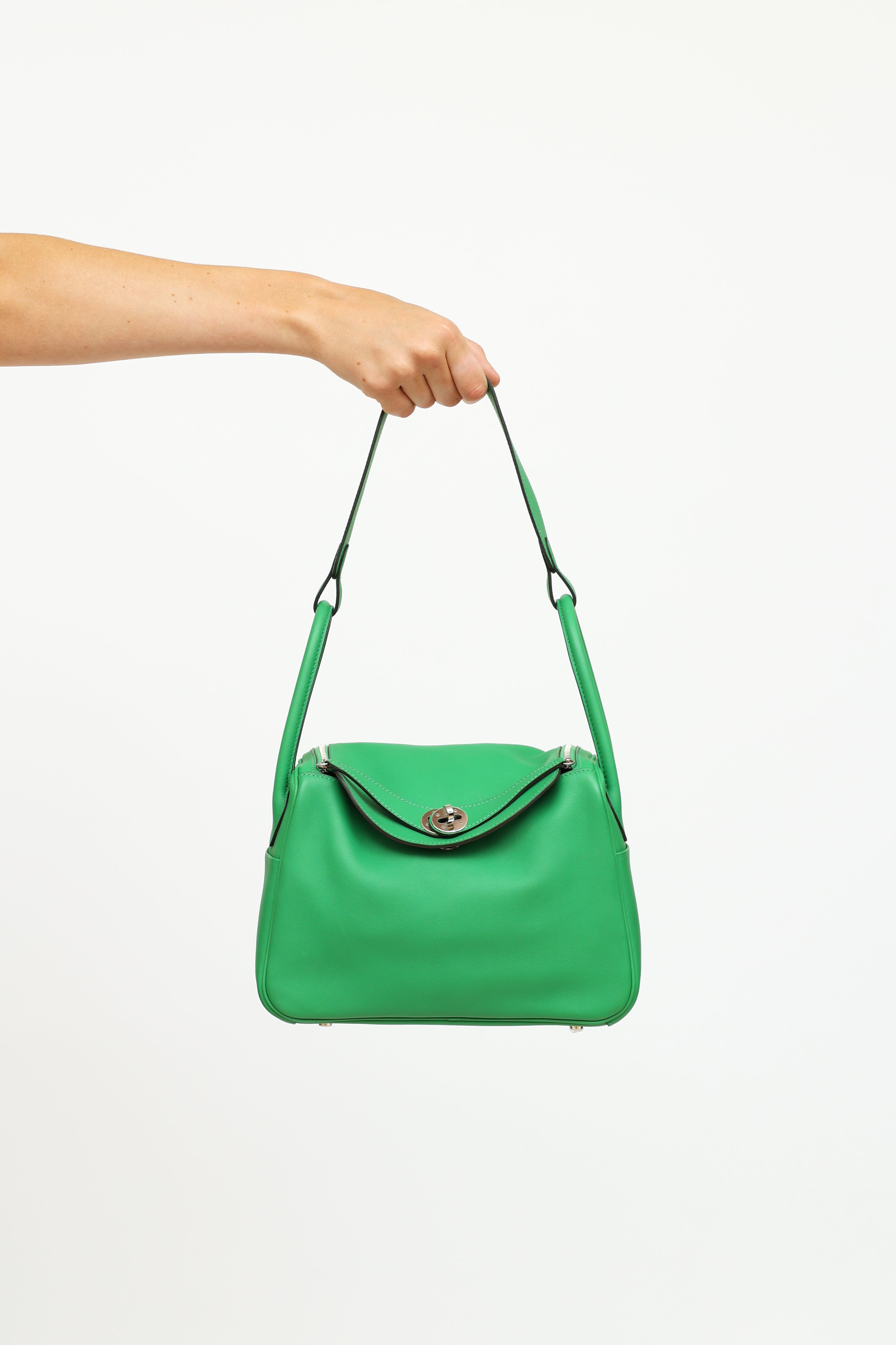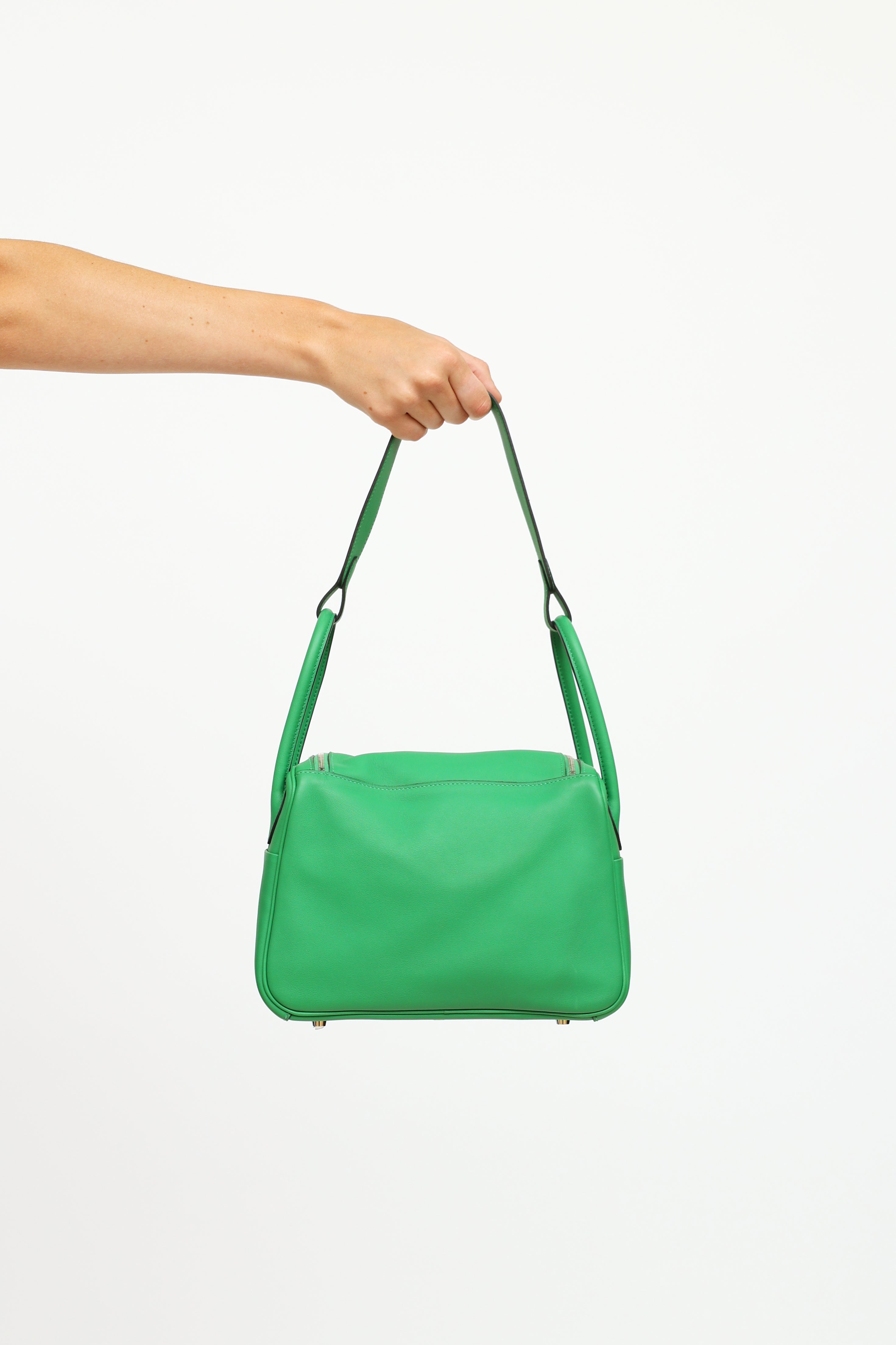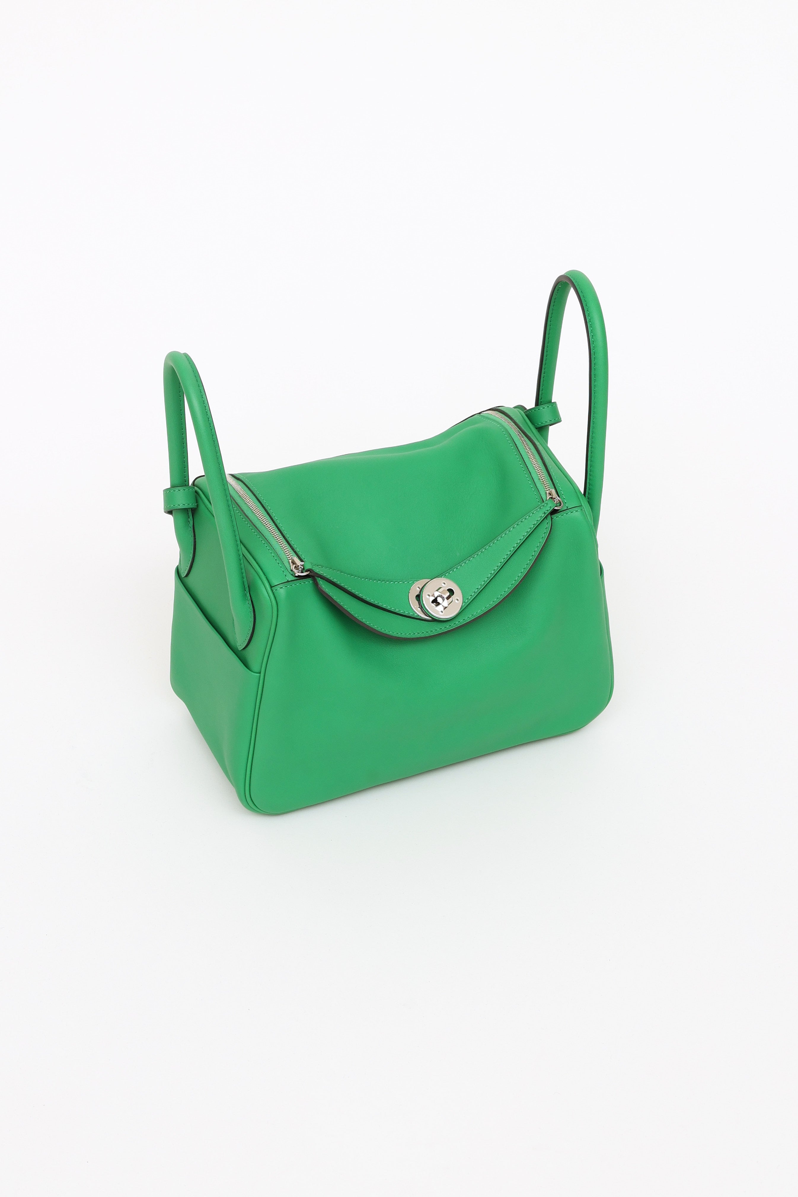 Pre-owned Hermès green Bamboo Swift Lindy 26 bag featuring Swift fine grain leather, Palladium hardware, dual rolled side handles, flat shoulder strap, tonal stitching, piping, signature toggle closure, turn key lock at front, 2 side pockets, dual zipper closure, large interior compartment with two slip pockets and metal feet on exterior bottom. From 2014 with Omega and R Square stamp.