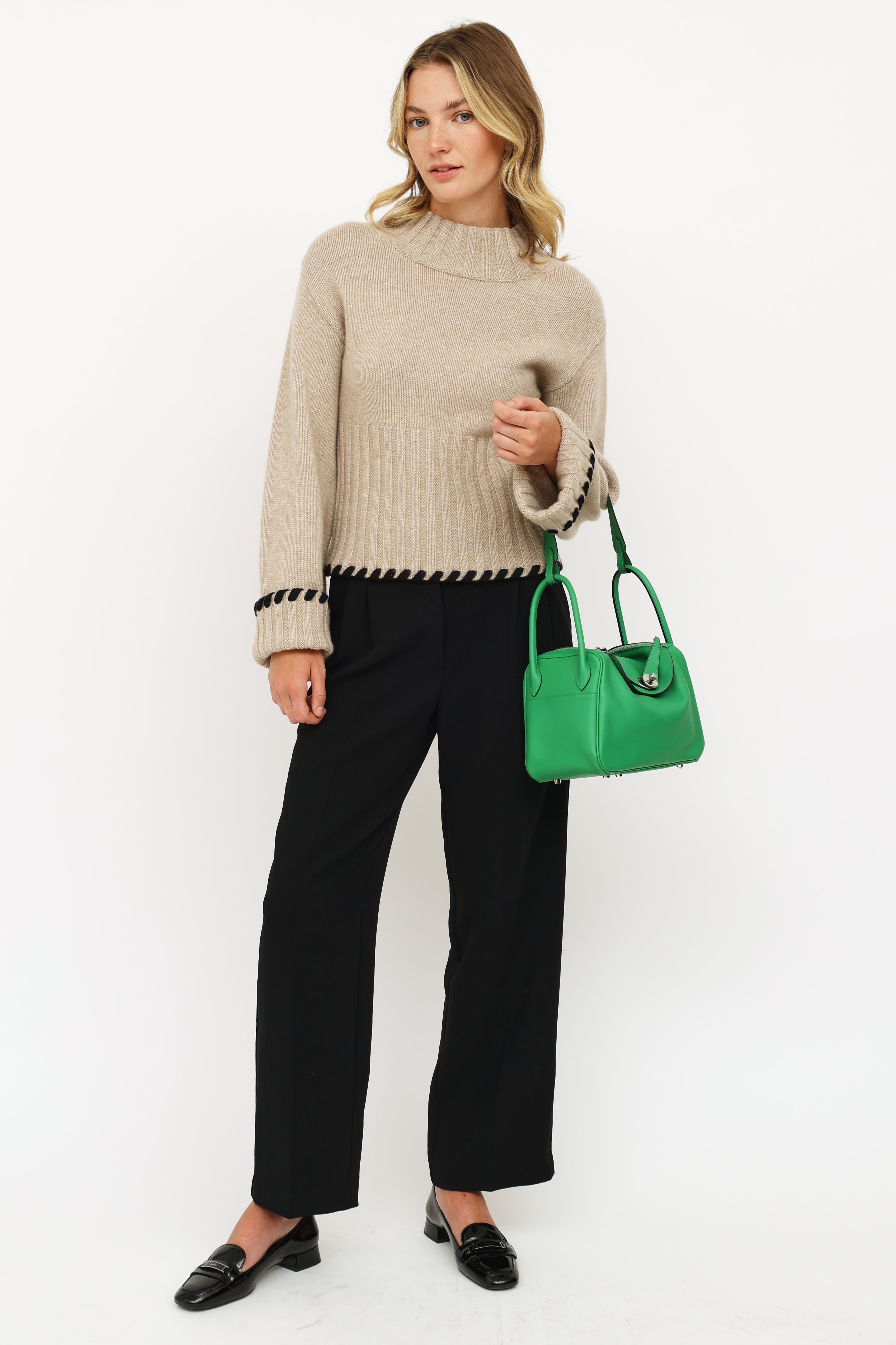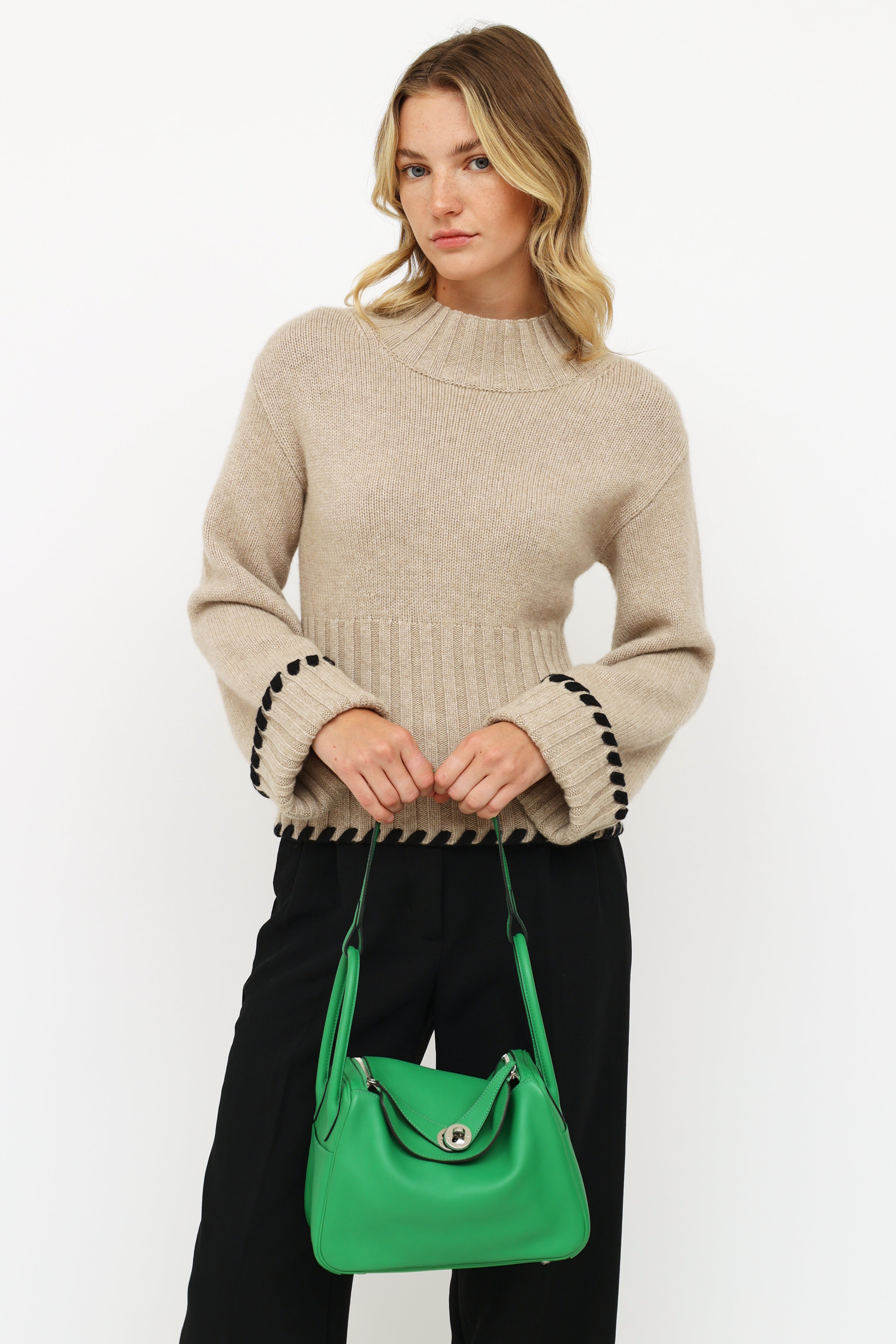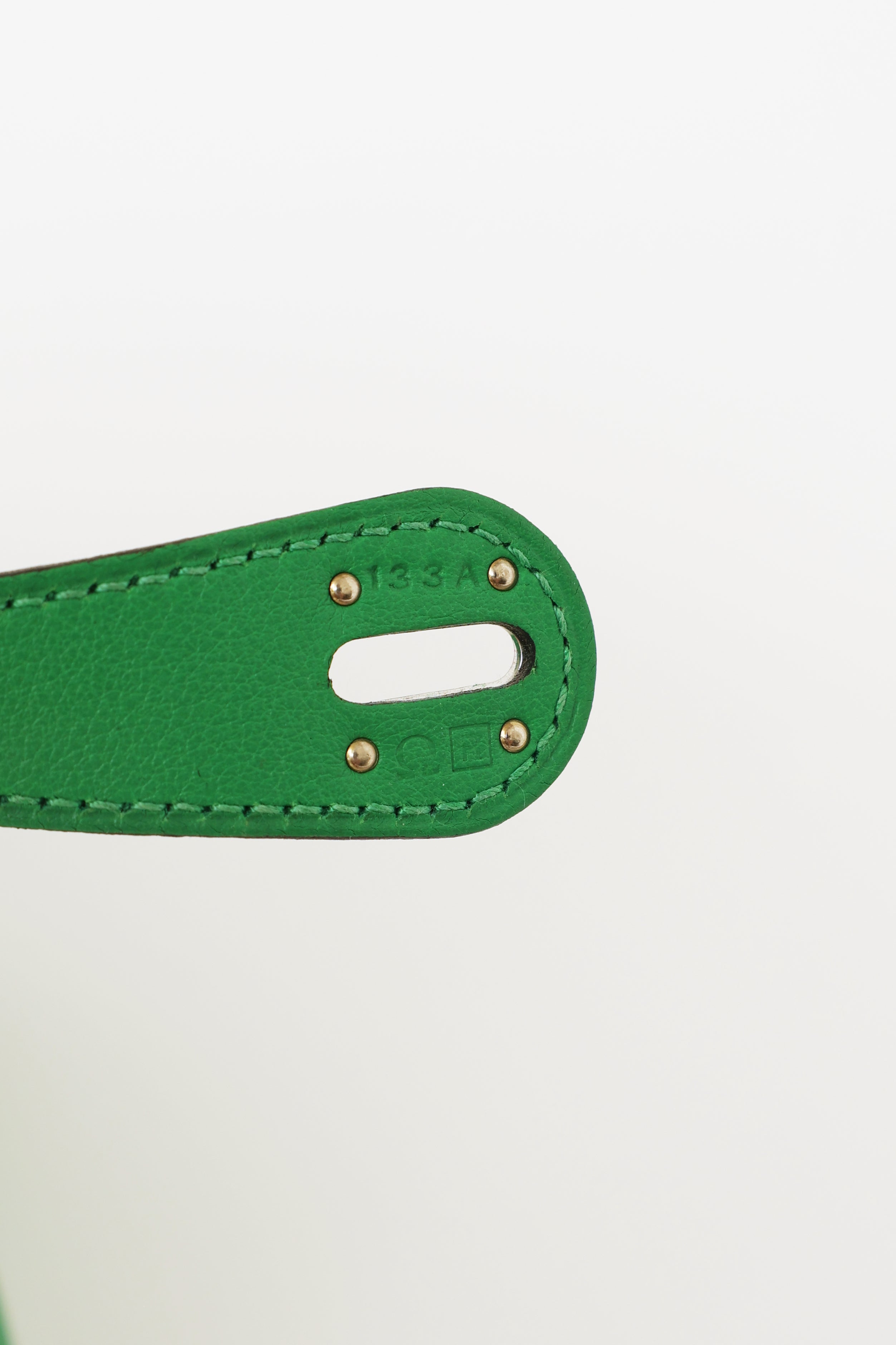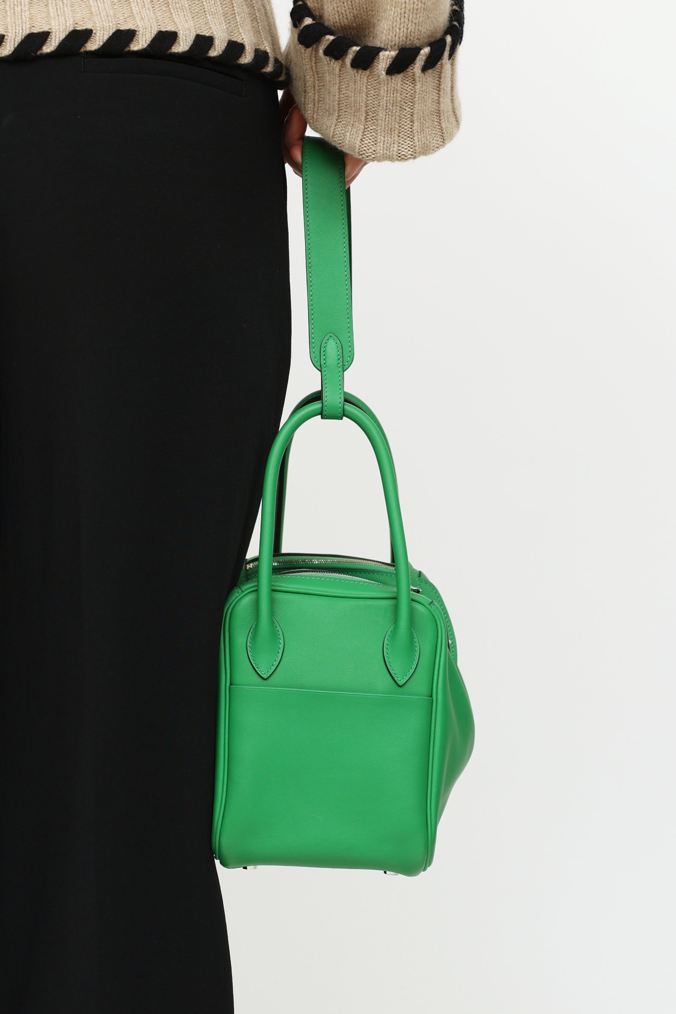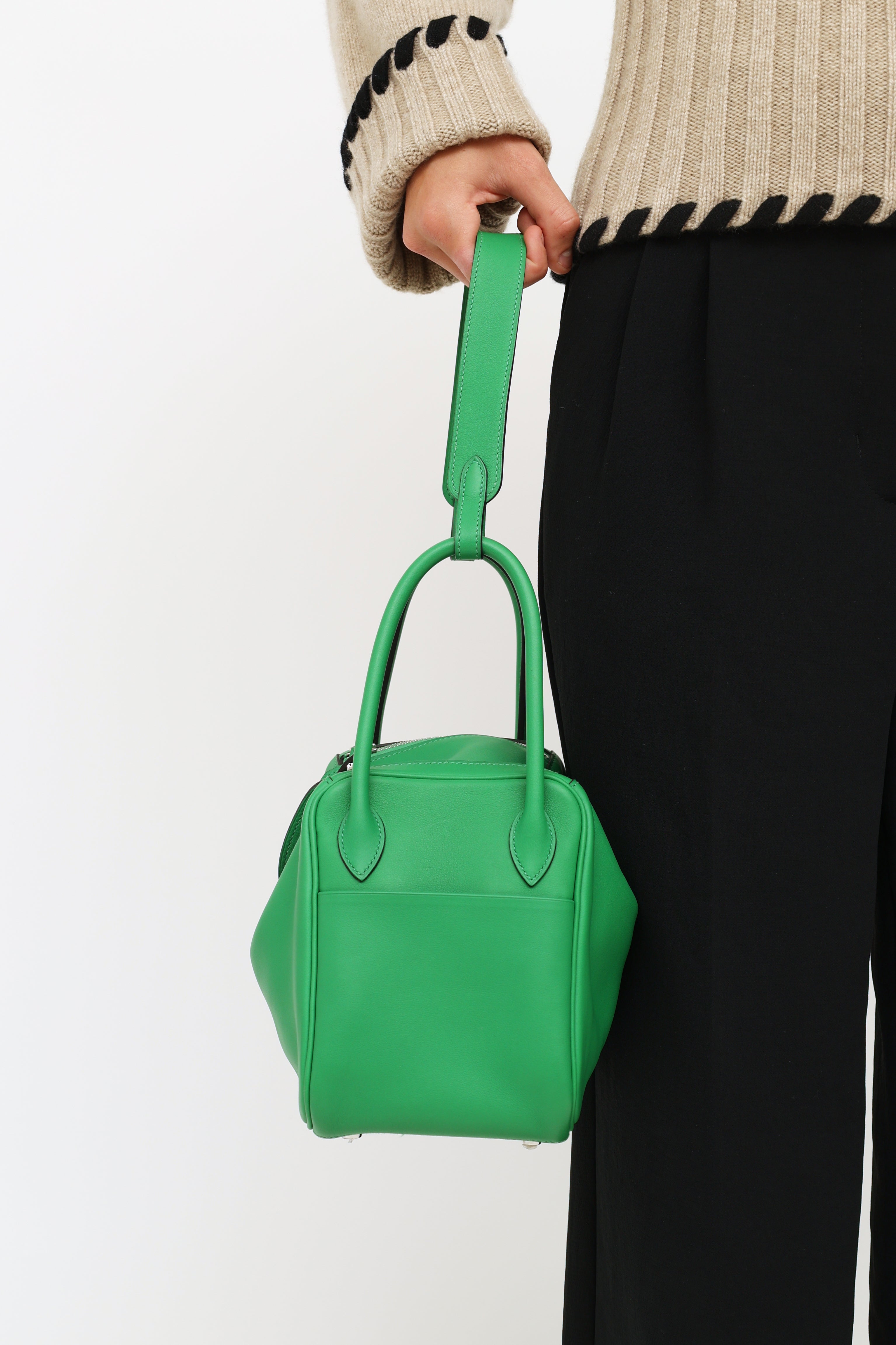Pre-owned Hermès green Bamboo Swift Lindy 26 bag featuring Swift fine grain leather, Palladium hardware, dual rolled side handles, flat shoulder strap, tonal stitching, piping, signature toggle closure, turn key lock at front, 2 side pockets, dual zipper closure, large interior compartment with two slip pockets and metal feet on exterior bottom. From 2014 with Omega and R Square stamp.