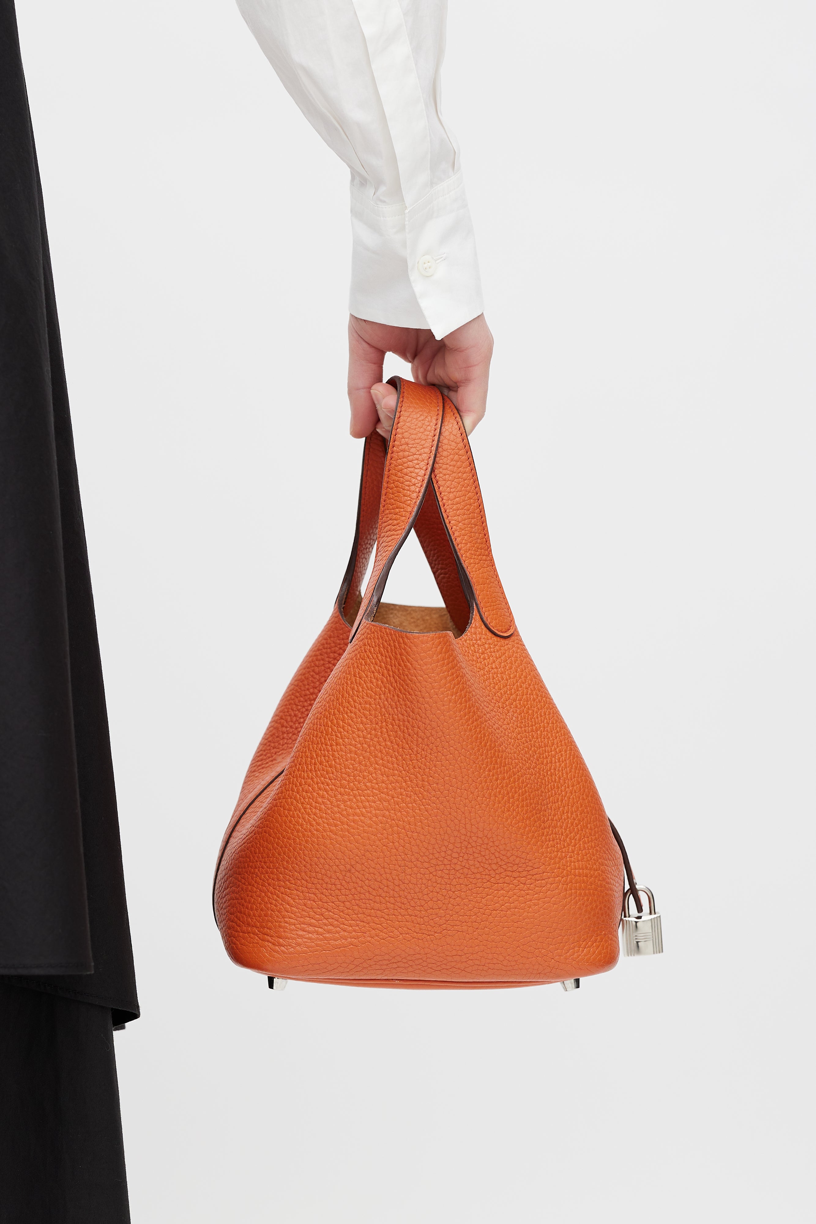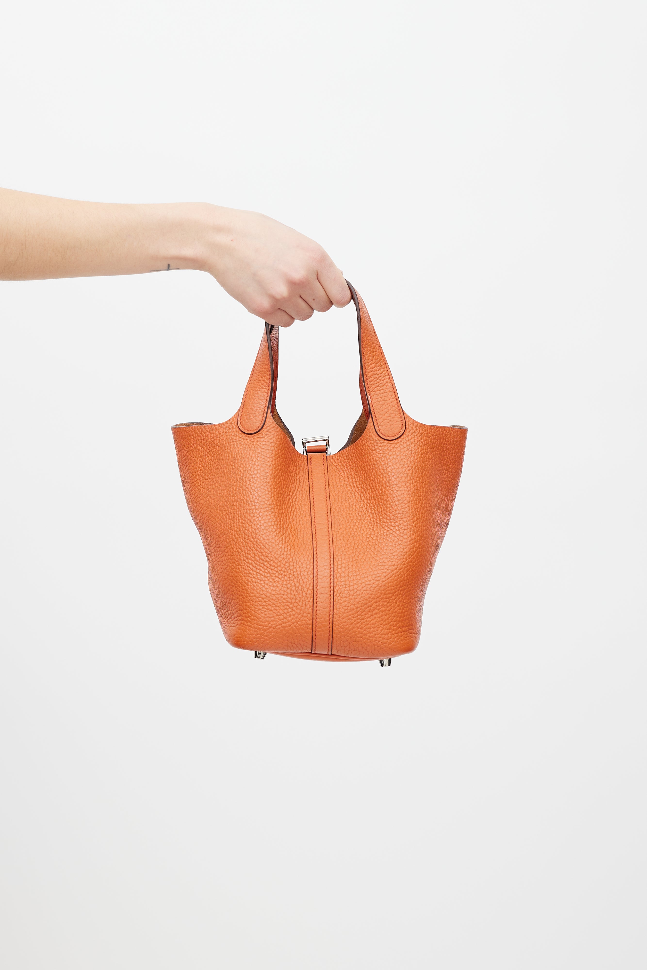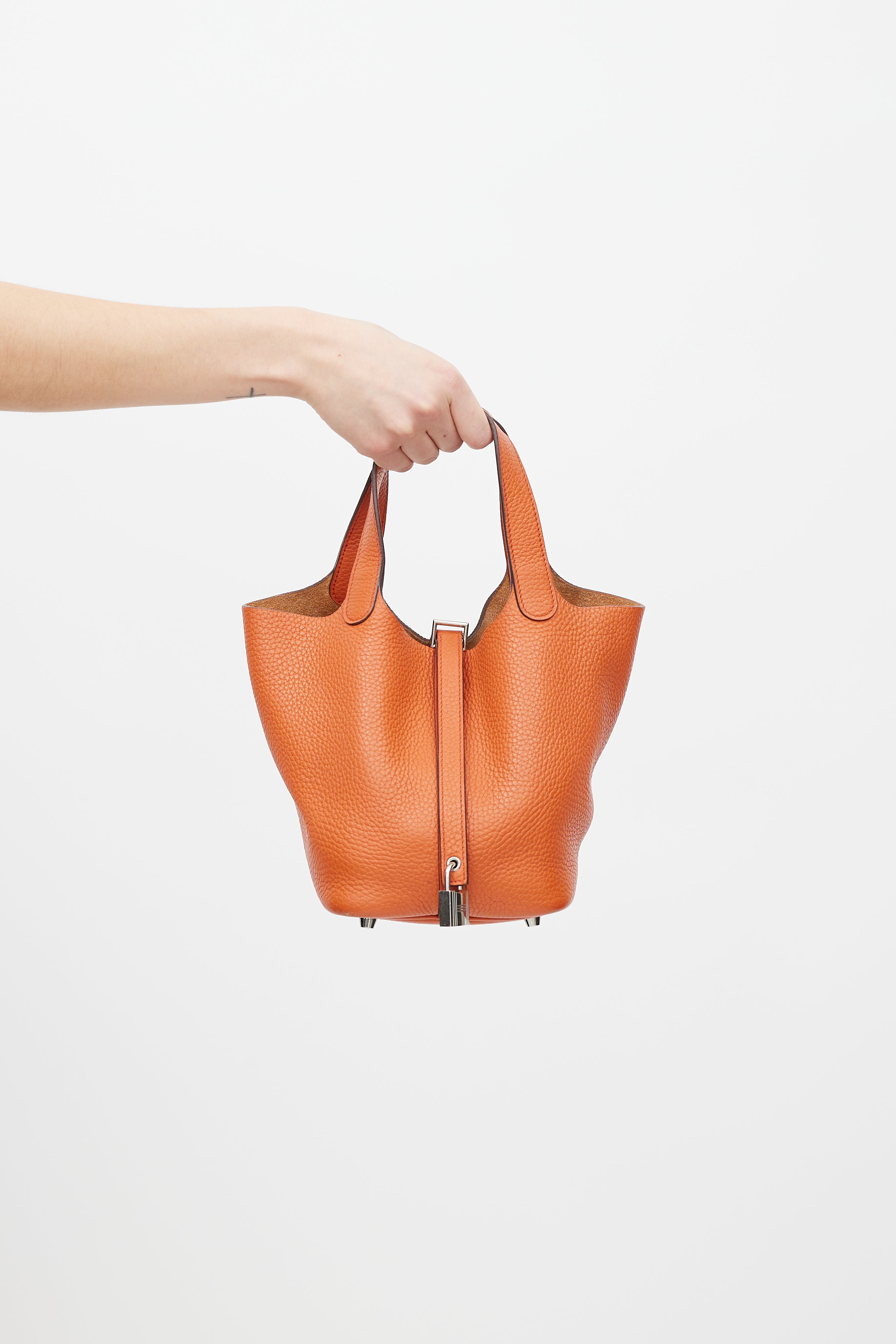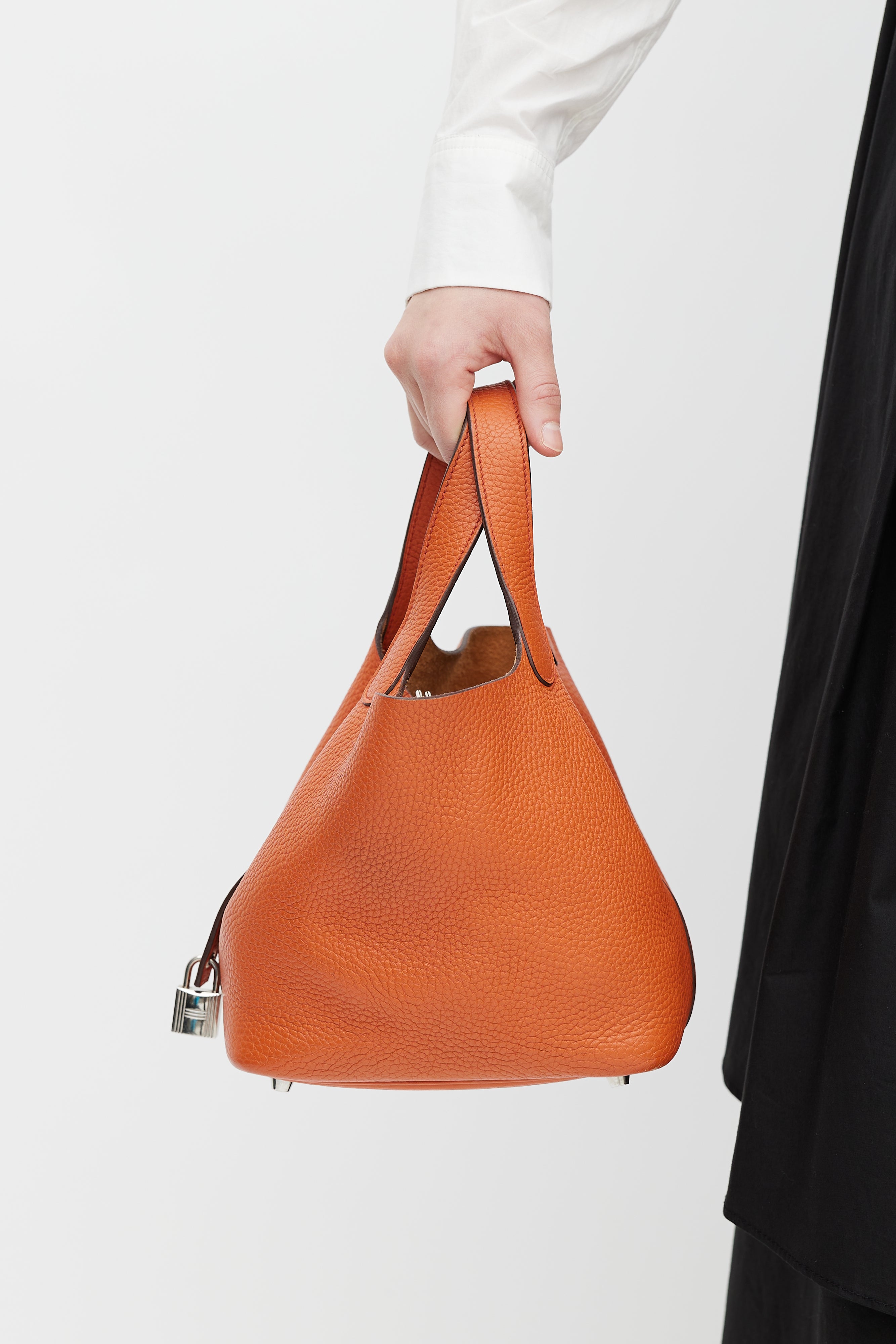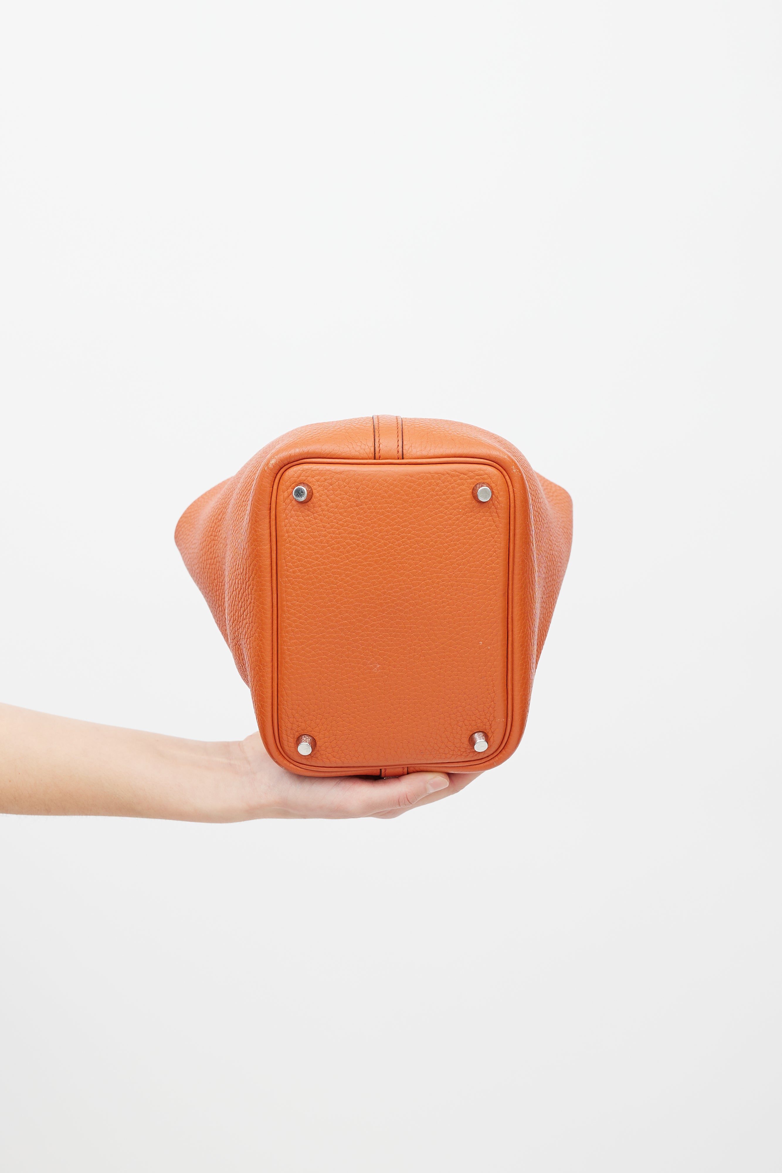 Pre-owned 2015 Hermès Picotin 18 Lock bag in Cuivre Clémence leather featuring two flat top handles, silver Palladium hardware, four clou, strap closure with buckle fastening and lock, open compartment, and gold stamped logo at bottom of lining. Comes with original box.