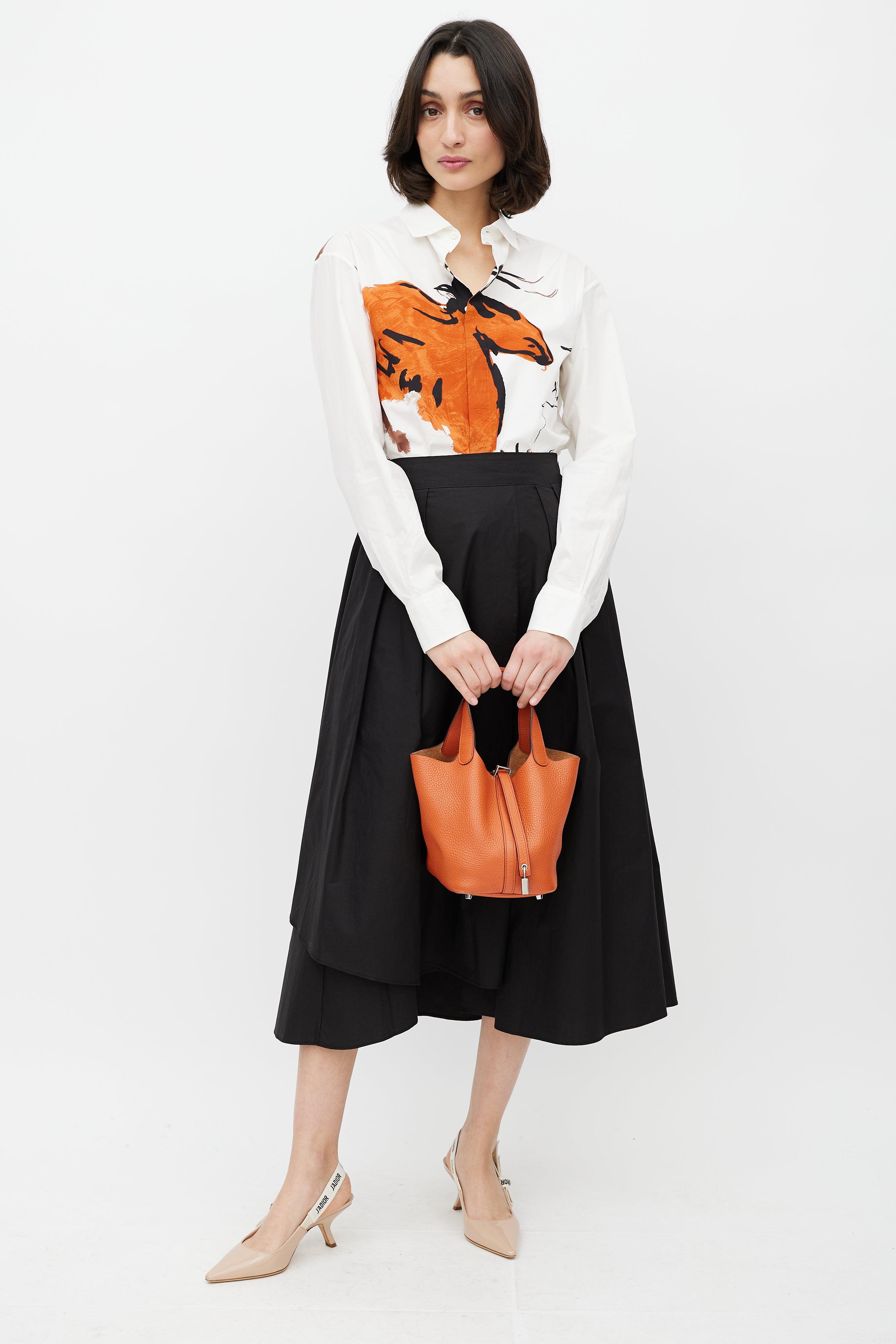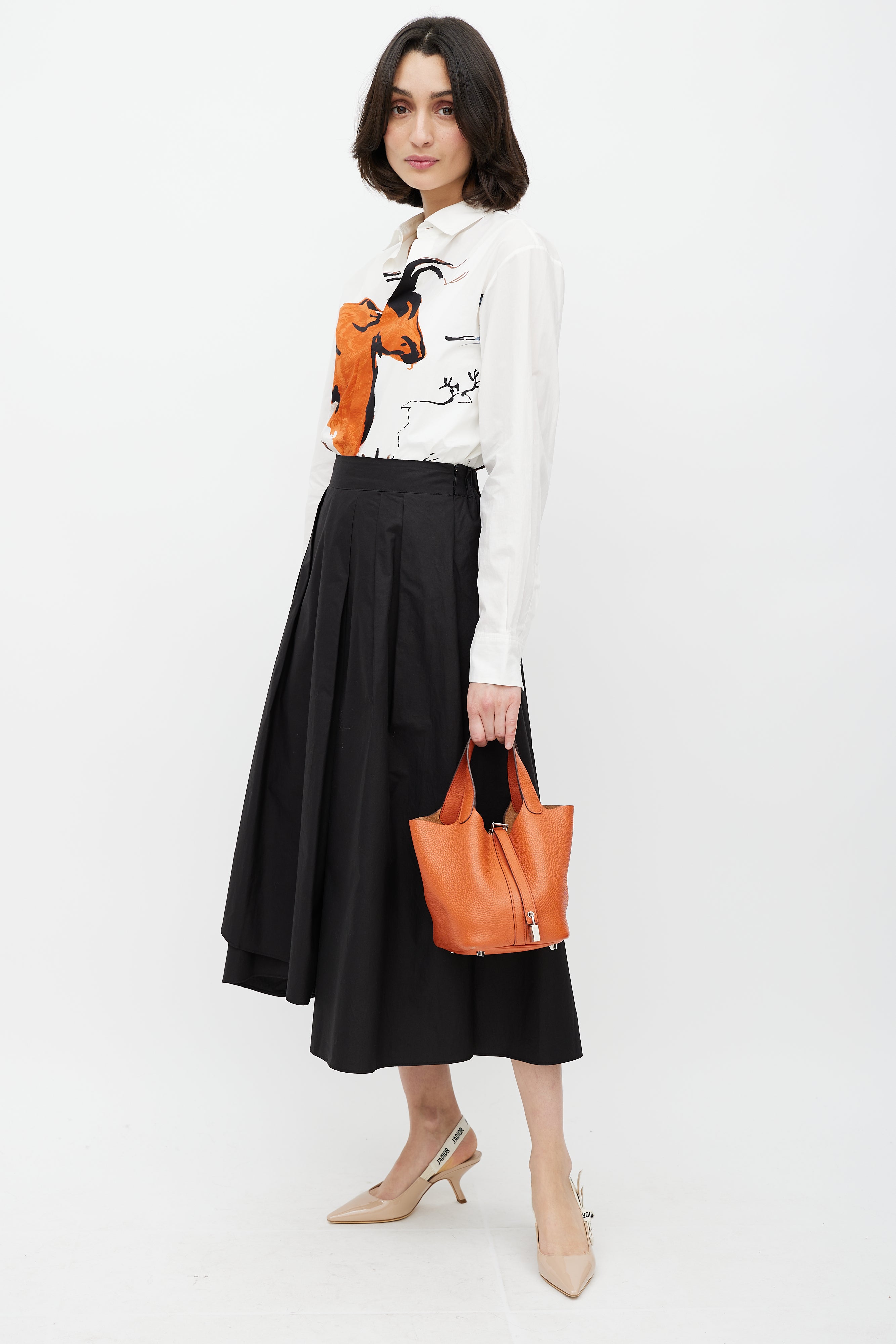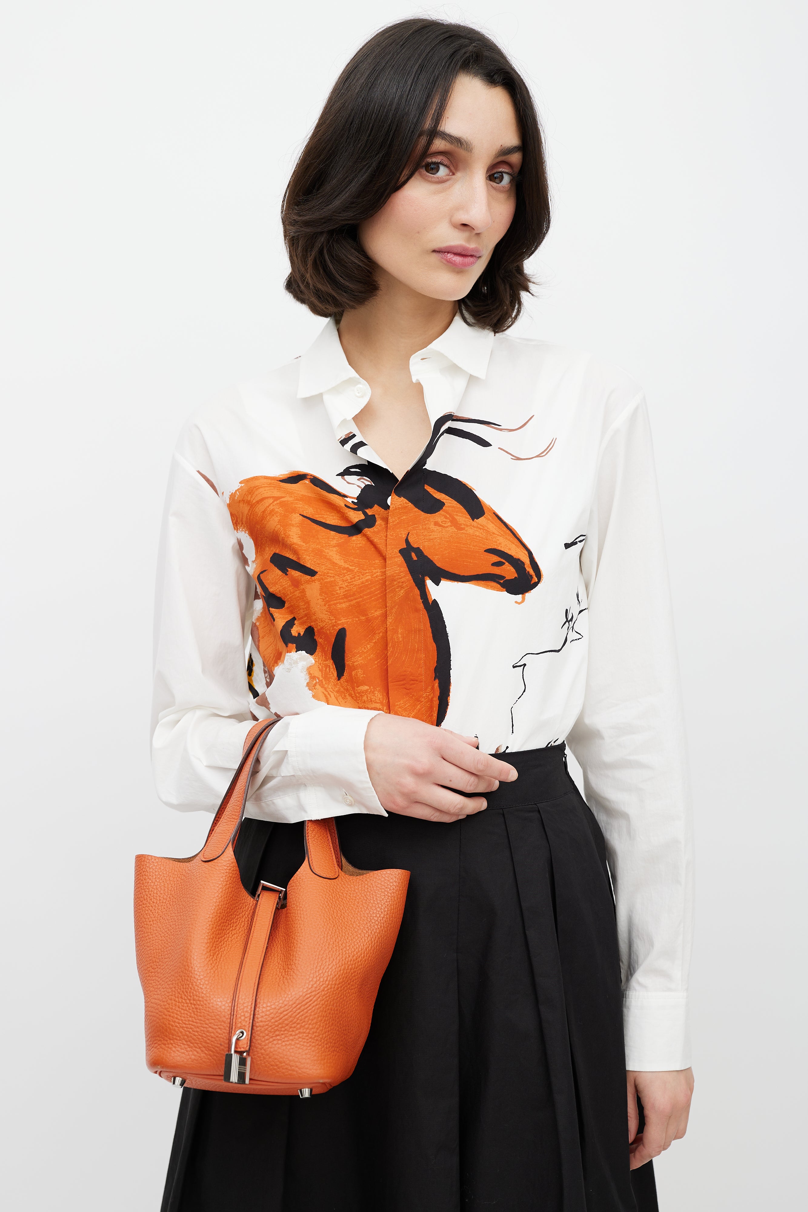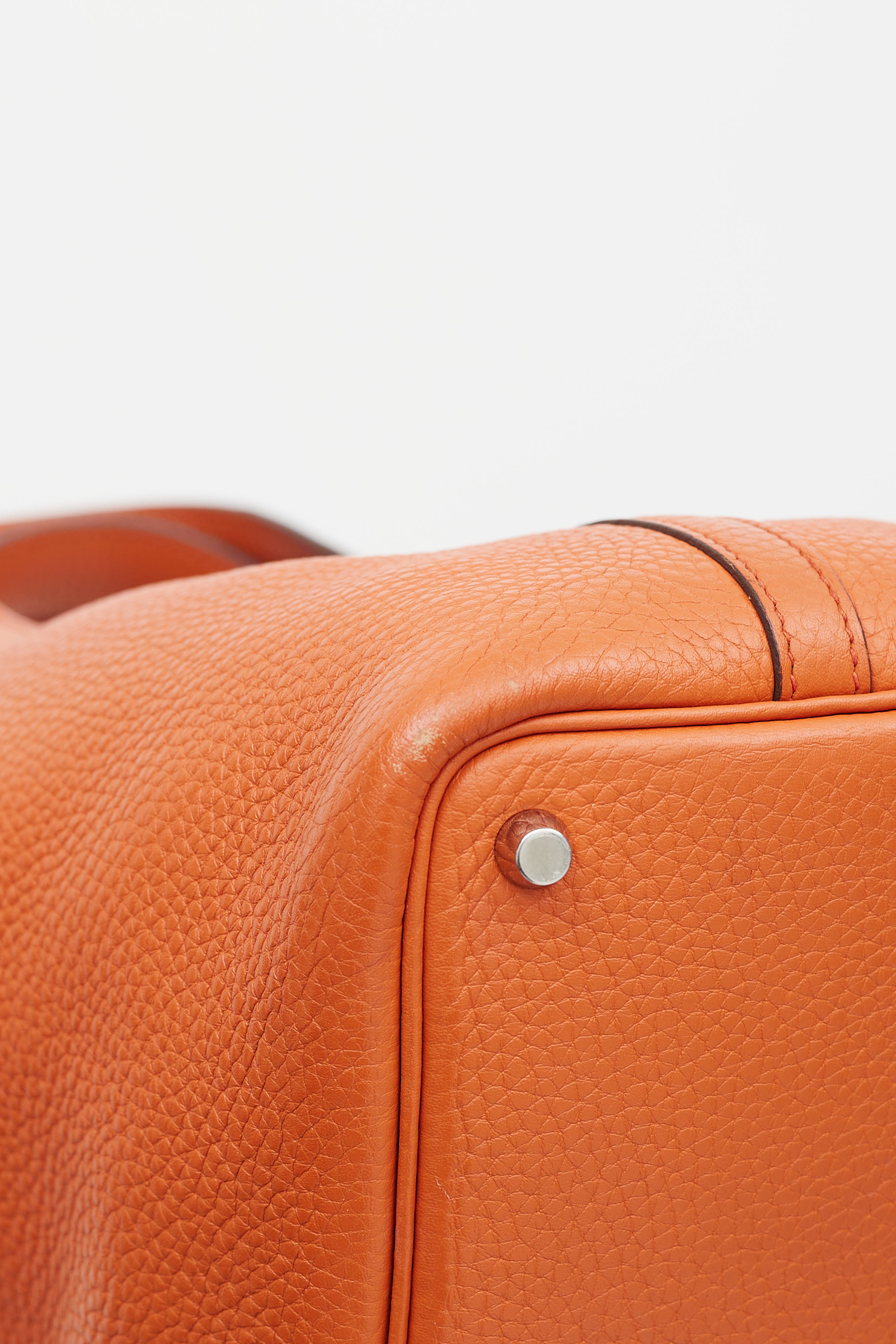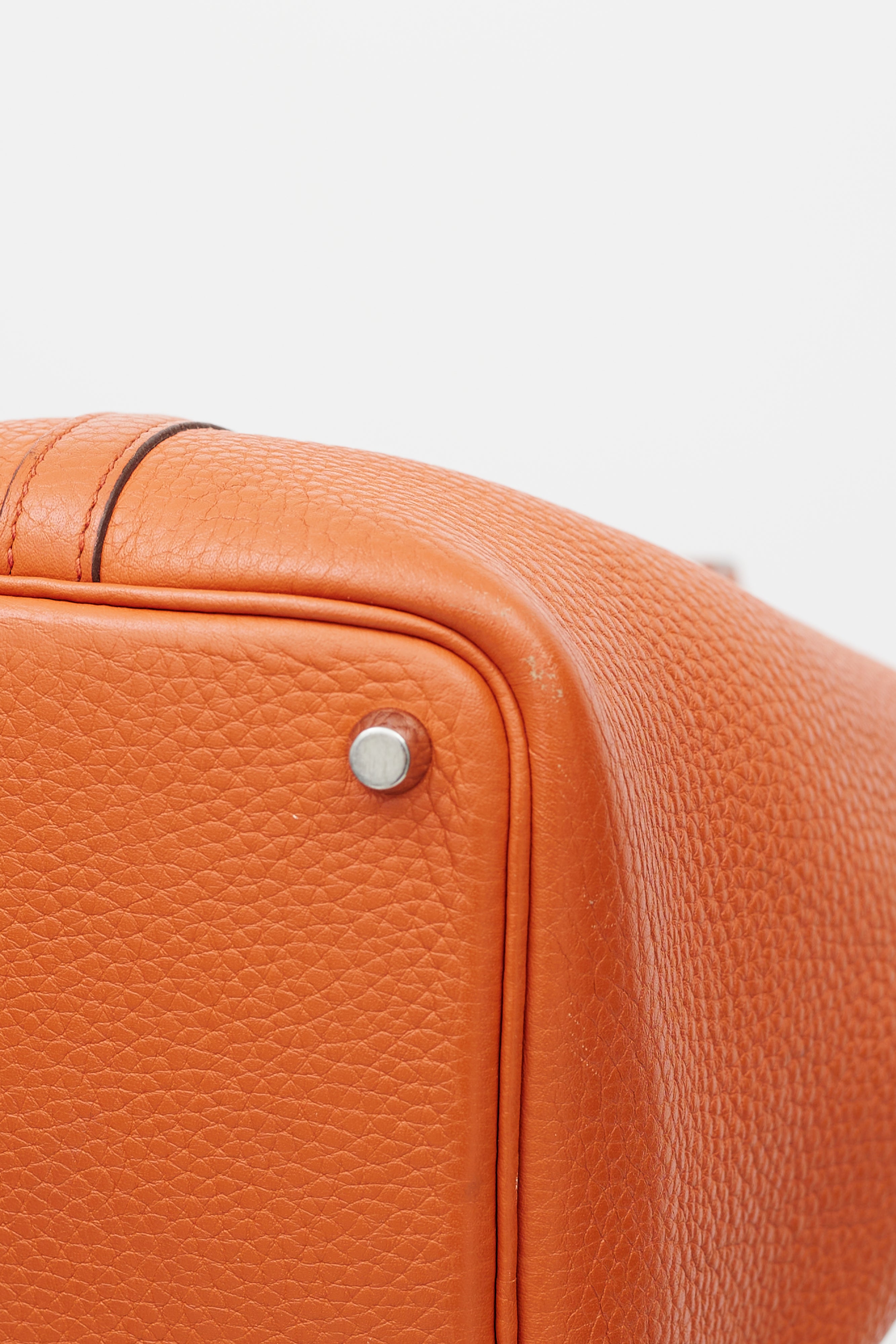 Pre-owned 2015 Hermès Picotin 18 Lock bag in Cuivre Clémence leather featuring two flat top handles, silver Palladium hardware, four clou, strap closure with buckle fastening and lock, open compartment, and gold stamped logo at bottom of lining. Comes with original box.
