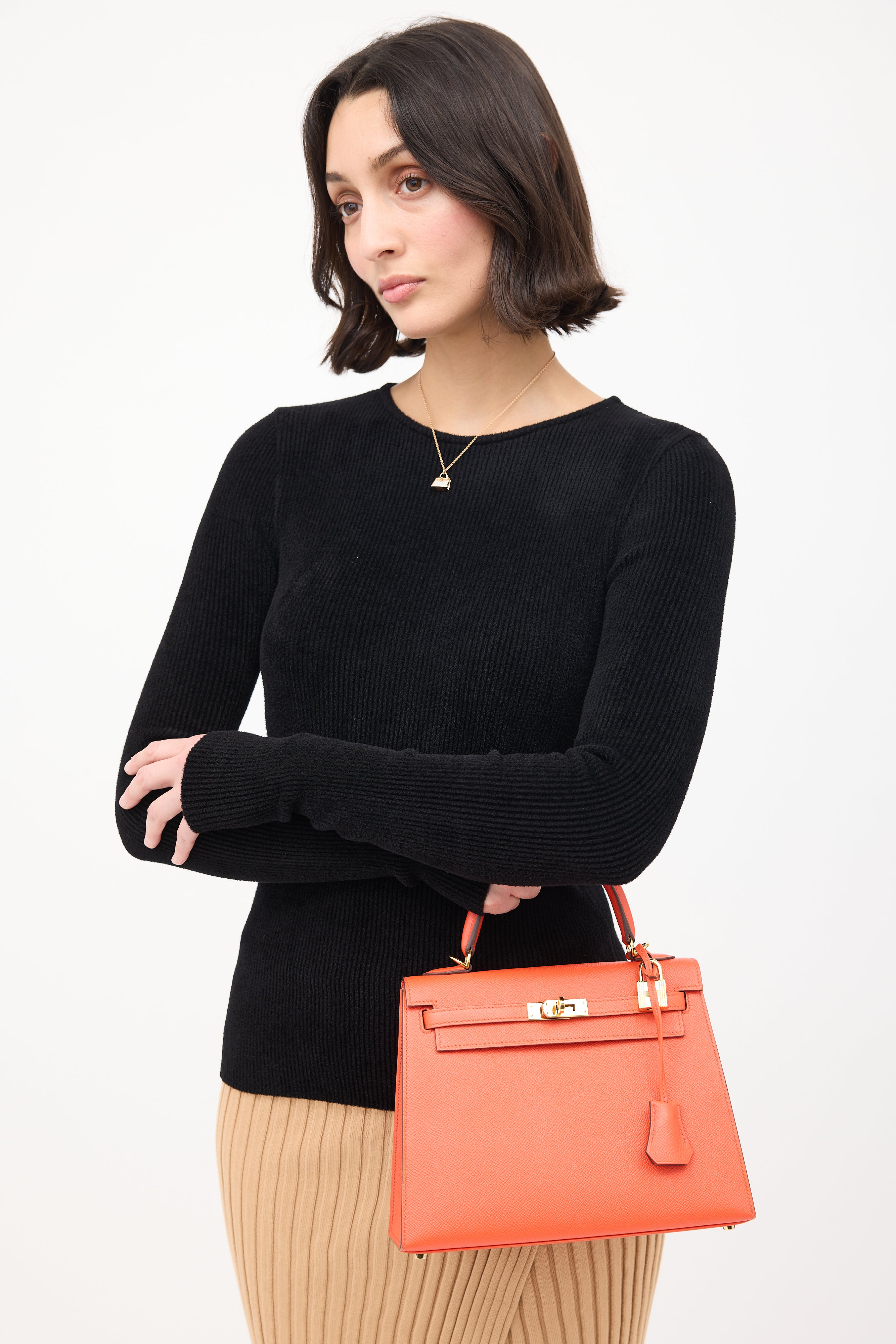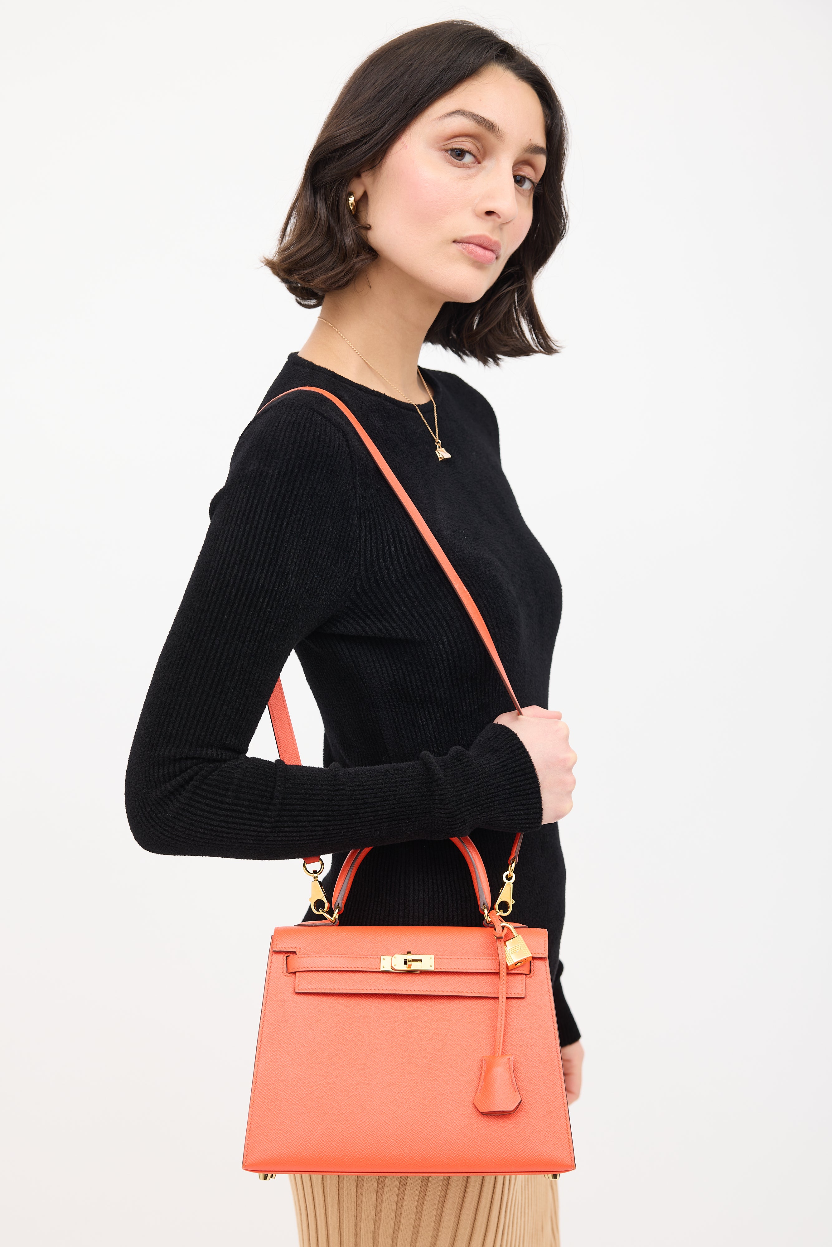 Pre-owned Hermès 2015 Kelly Sellier 25 bag in Poppy featuring Epsom leather, gold plated Palladium hardware, four clou, single rolled top handle, sangles, logo engraved plaque, signature touret closure, brand stamp under flap, removable padlock and clochette, detachable shoulder strap, and one main compartment with one zip pocket and one slip pocket. Comes with original dust bag.