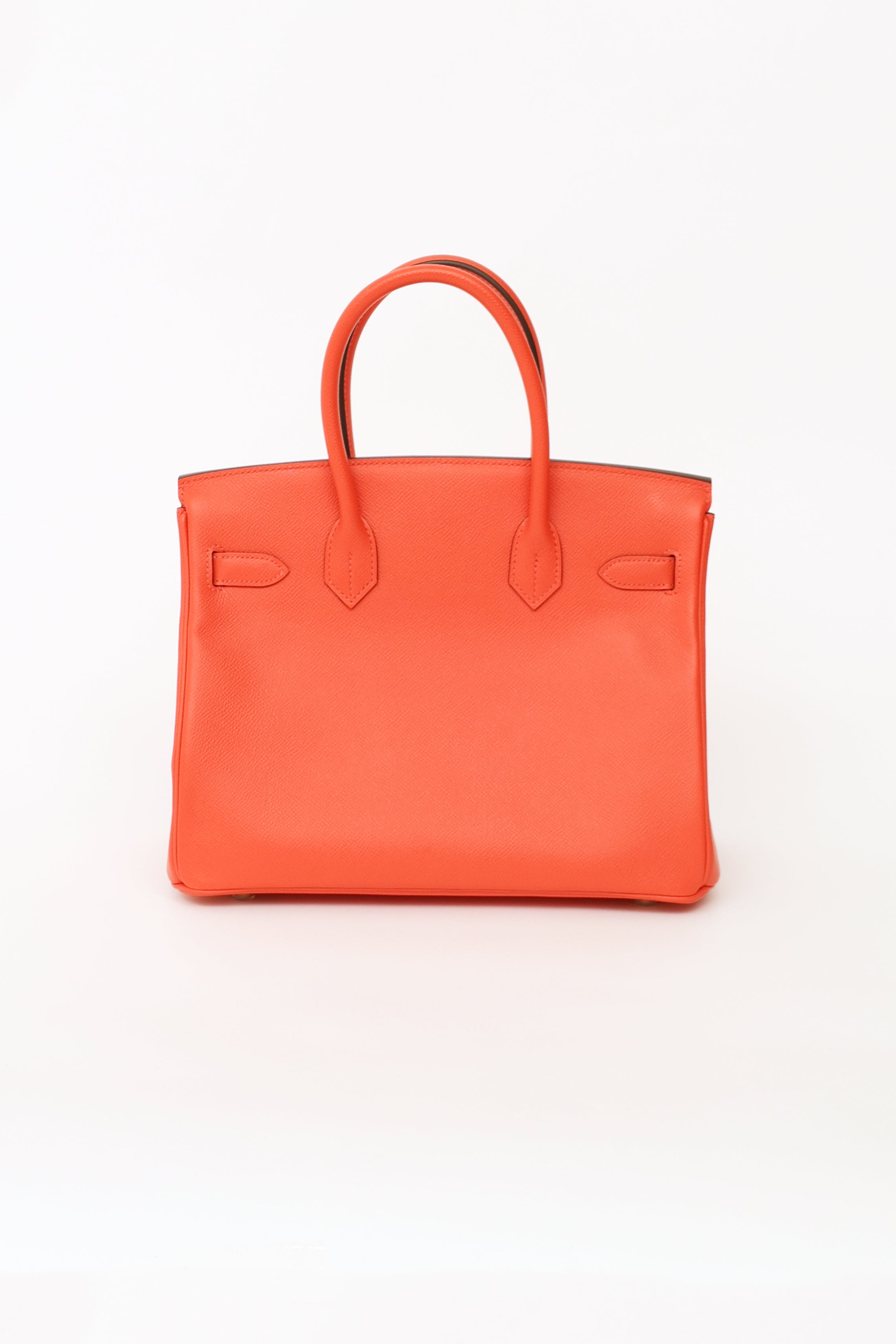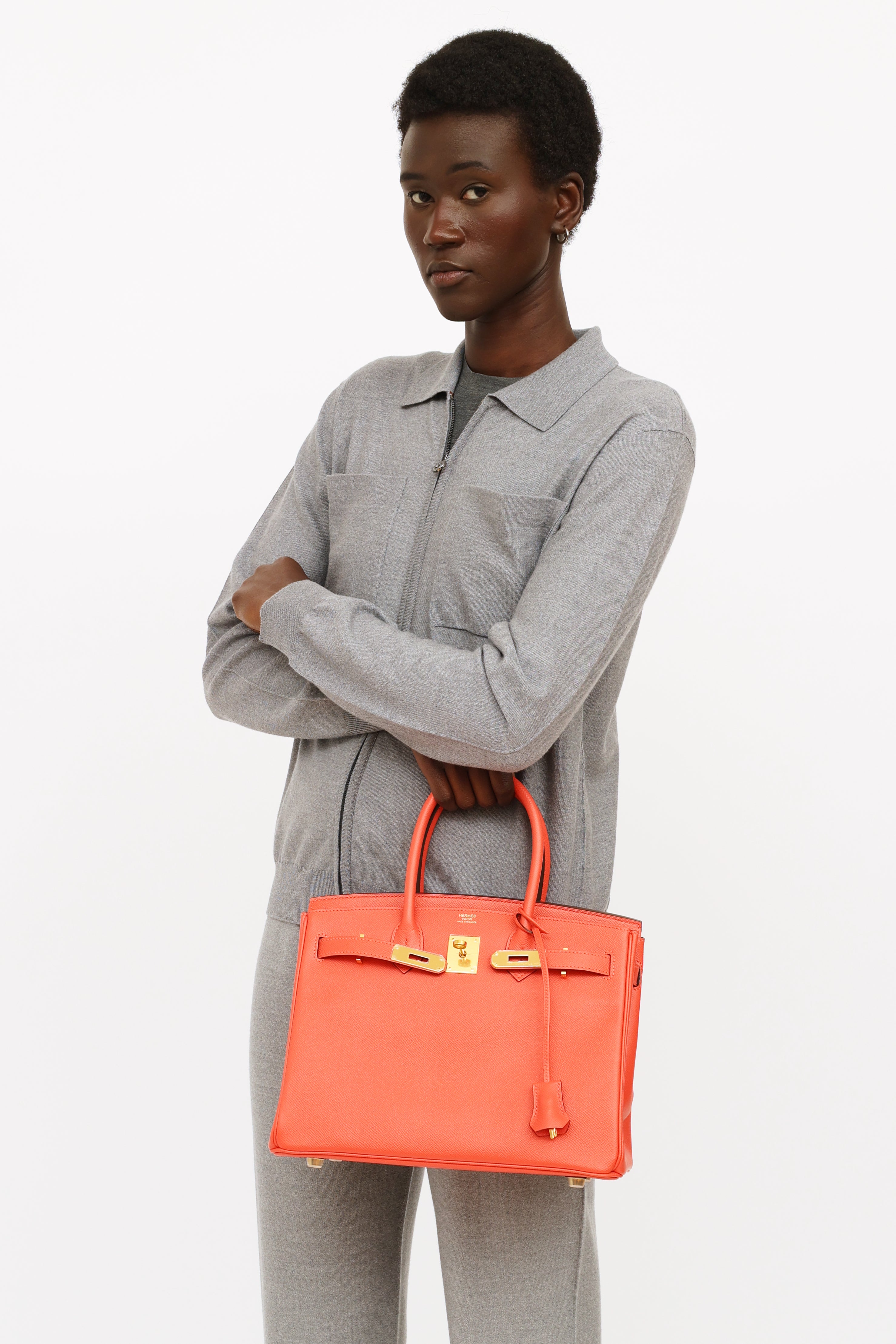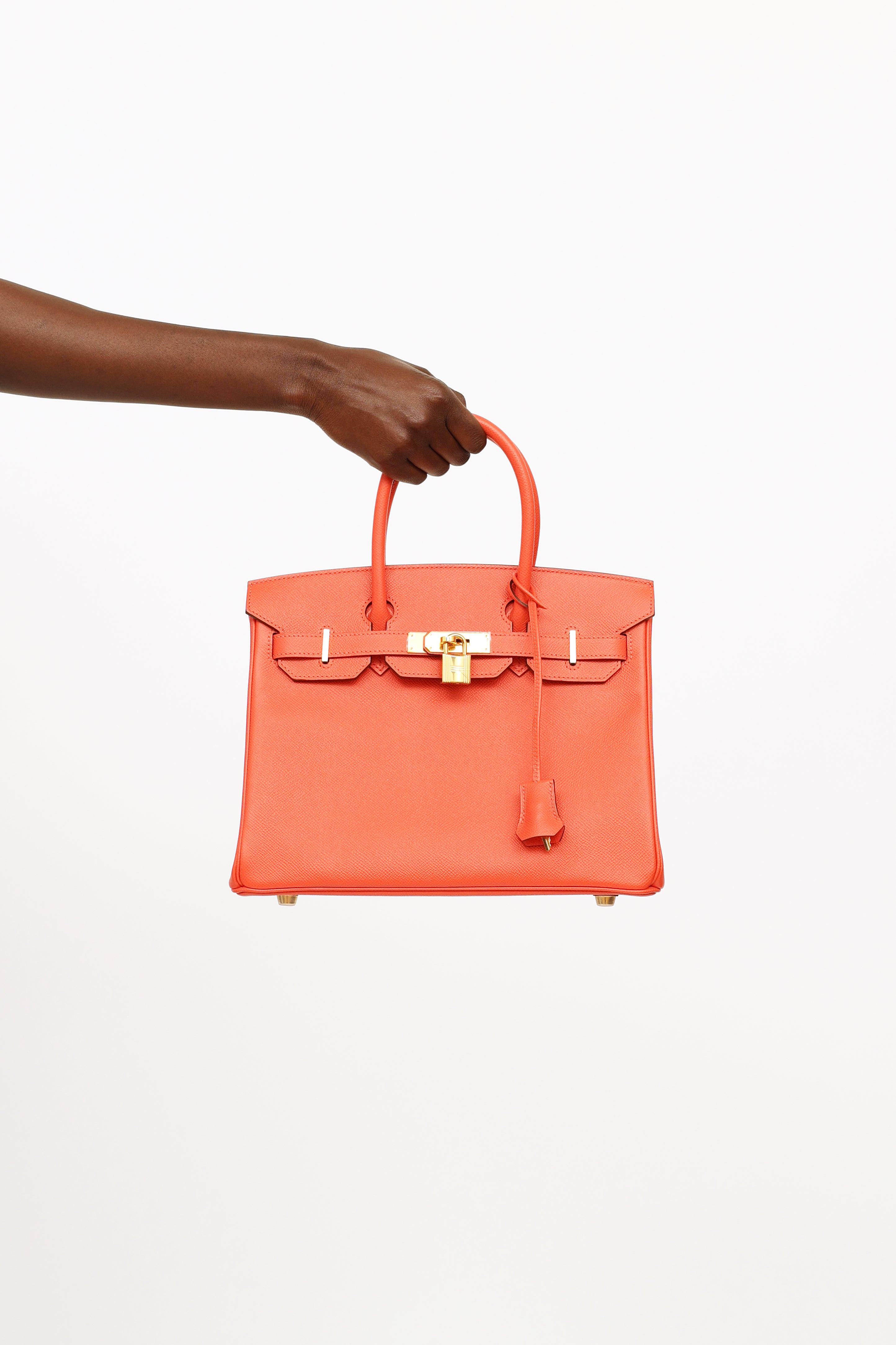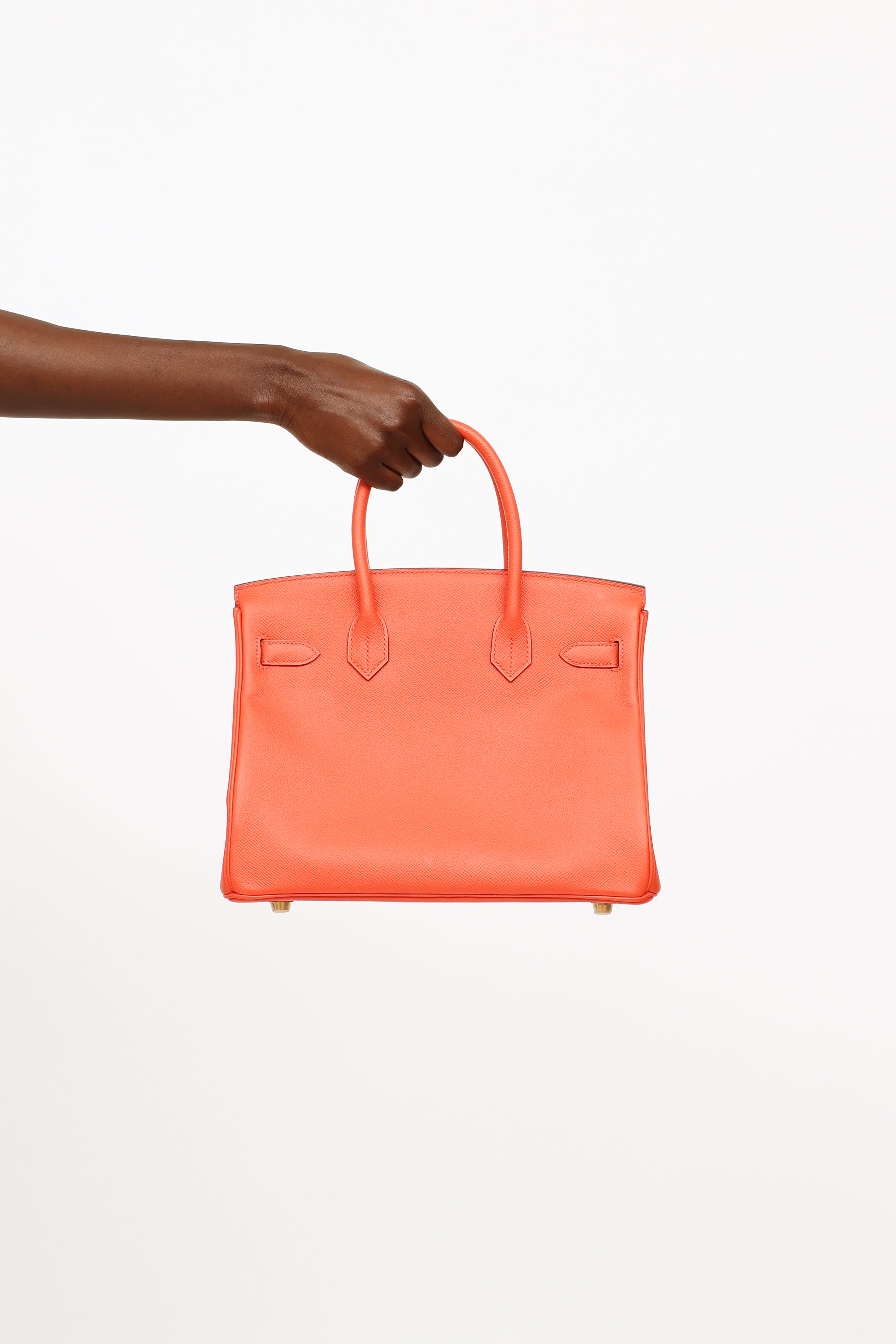 Pre-owned Hermès Birkin 30 bag featuring Epsom leather in Rose Jaipur with tonal stitching, dual rolled leather top handles, front flap with dual sangles, touret turn lock closure in gold hardware with seal, detachable clochette with keys and matching lock, four clou at bottom with protective tips, stamped Hermès logo on front under flap. X stamp from 2016. Interior features main compartment with one zipped pocket and one slip pocket.