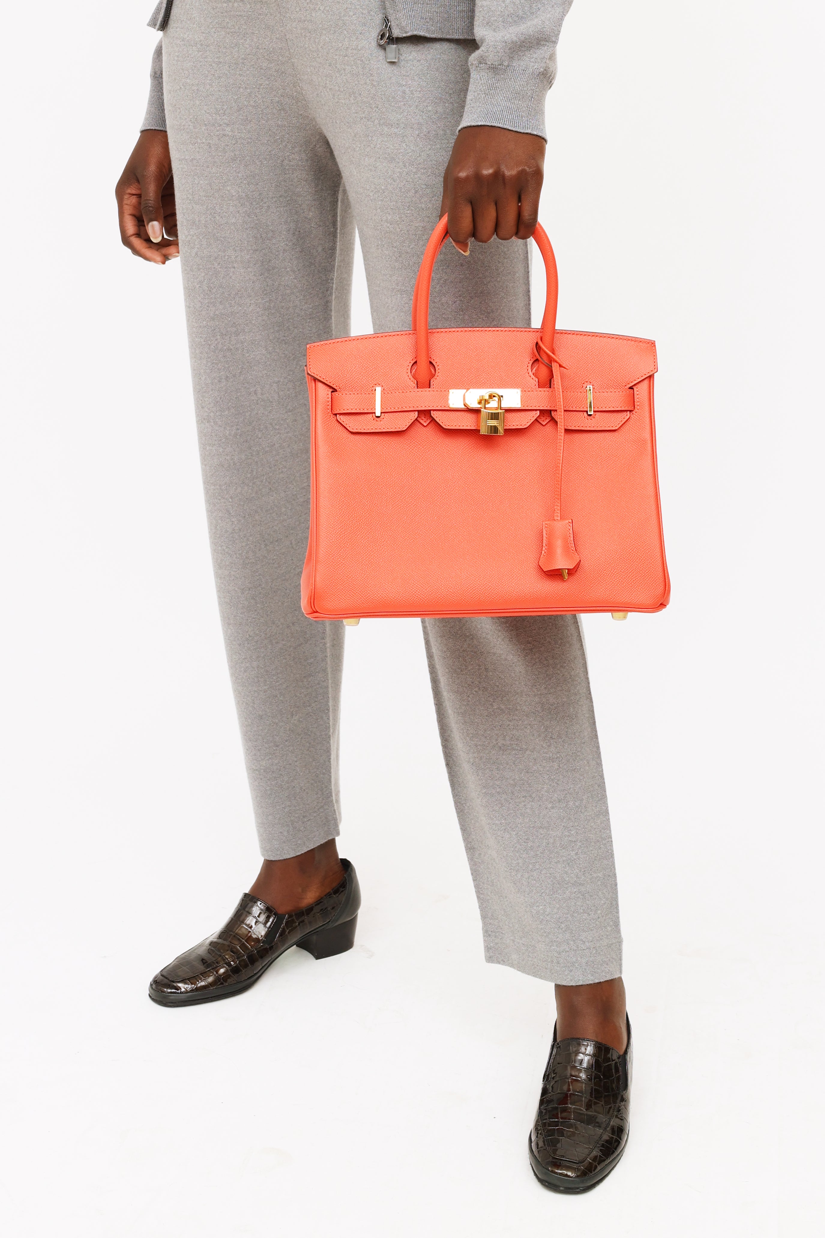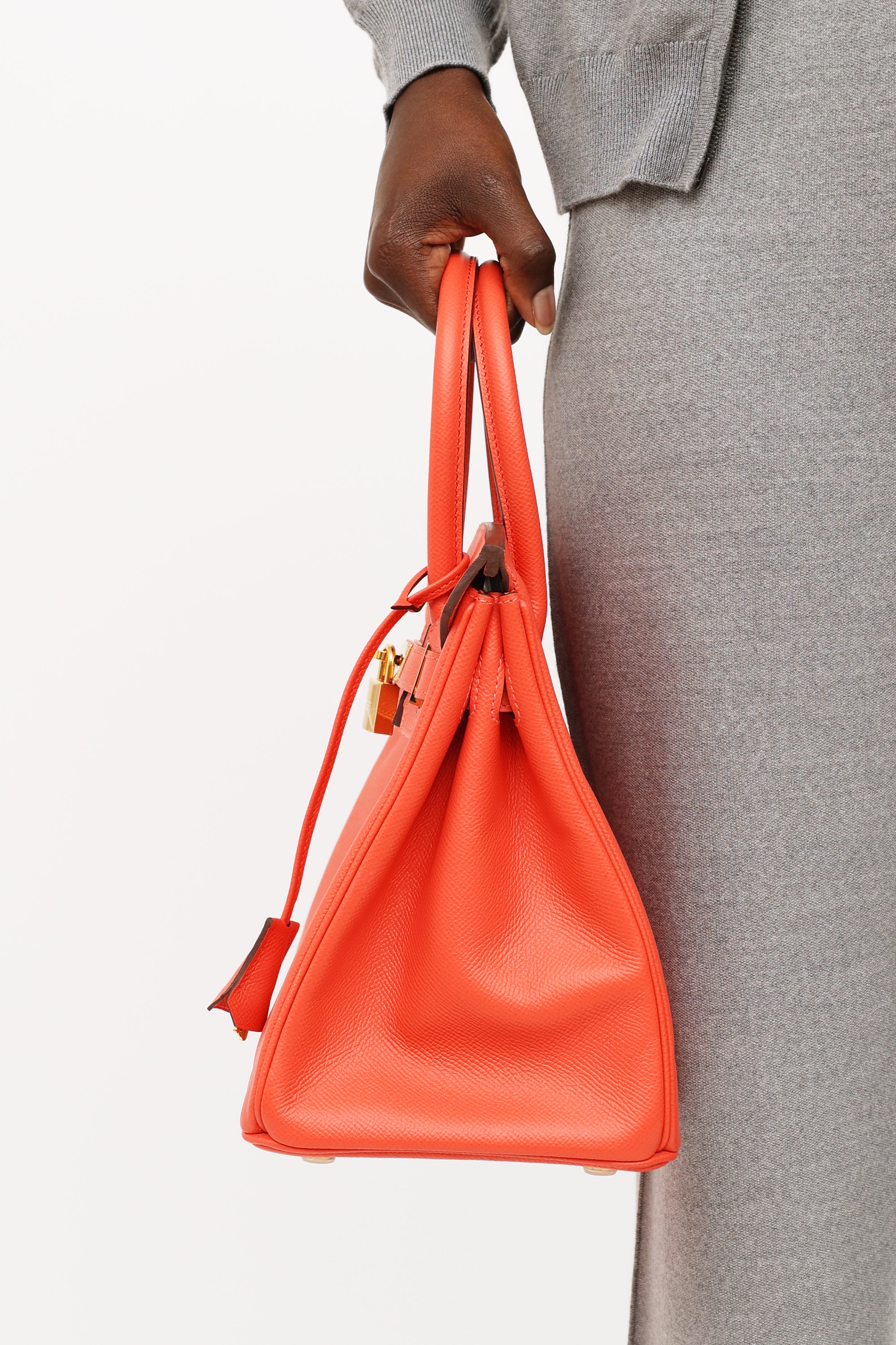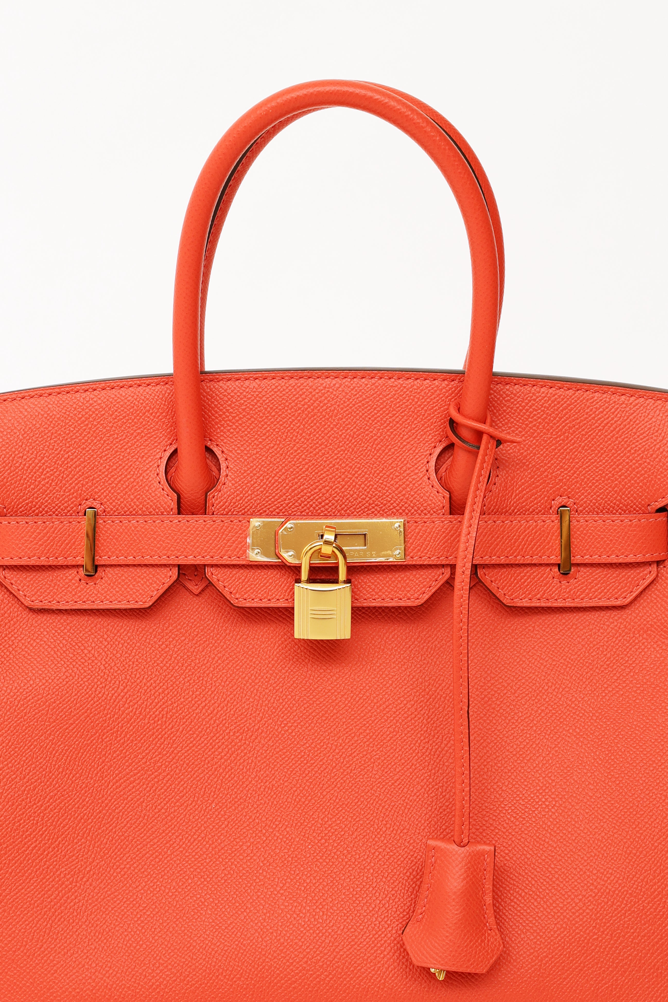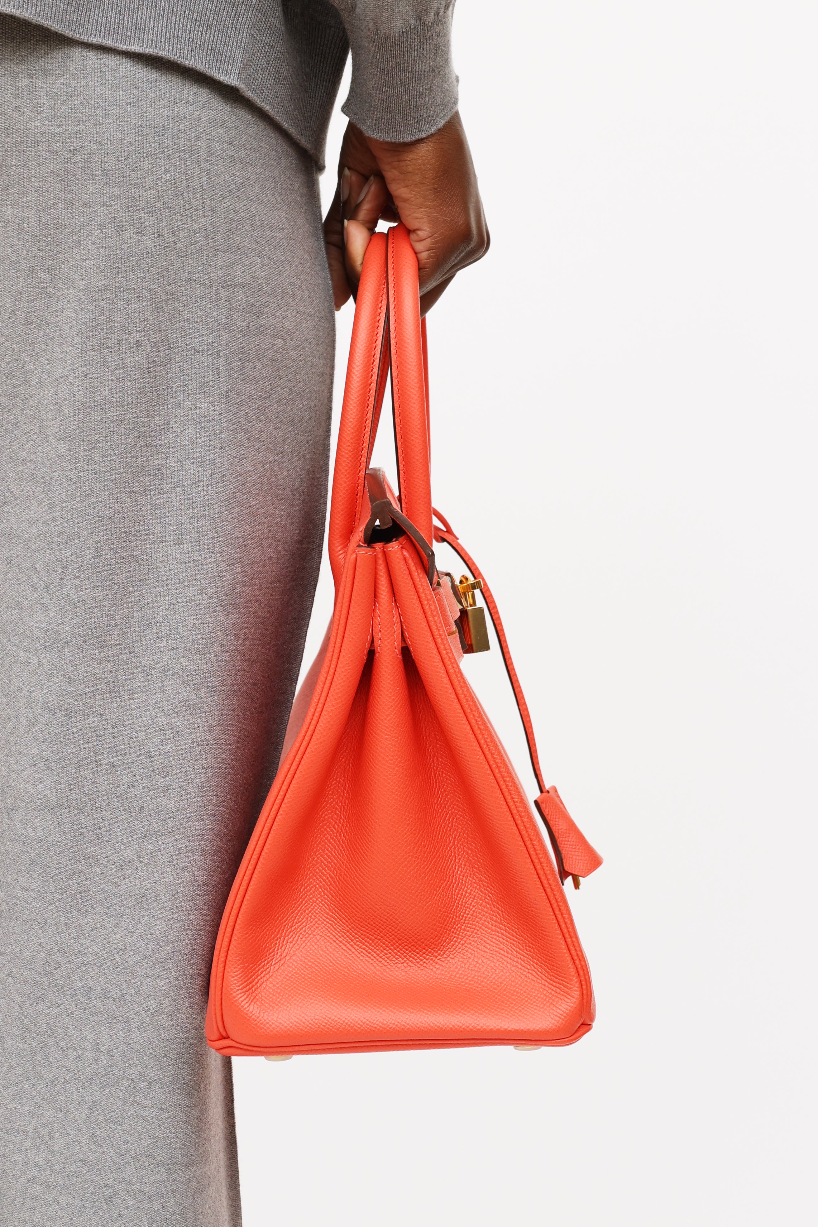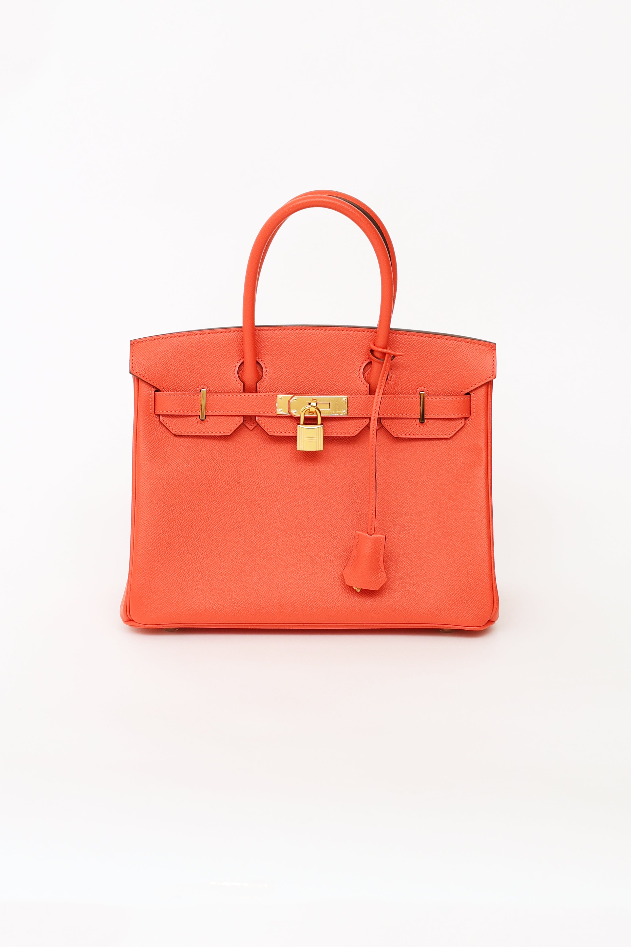 Pre-owned Hermès Birkin 30 bag featuring Epsom leather in Rose Jaipur with tonal stitching, dual rolled leather top handles, front flap with dual sangles, touret turn lock closure in gold hardware with seal, detachable clochette with keys and matching lock, four clou at bottom with protective tips, stamped Hermès logo on front under flap. X stamp from 2016. Interior features main compartment with one zipped pocket and one slip pocket.