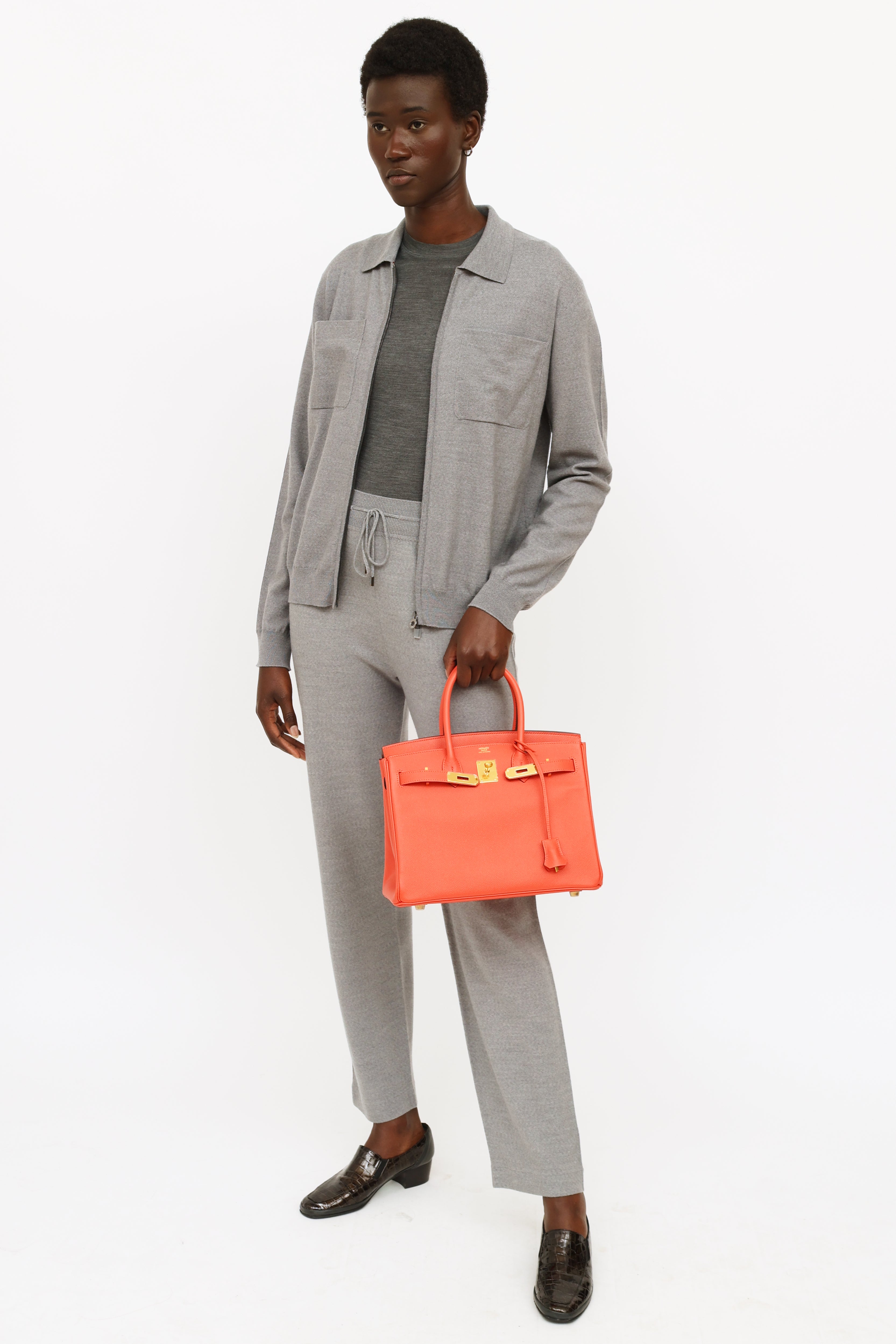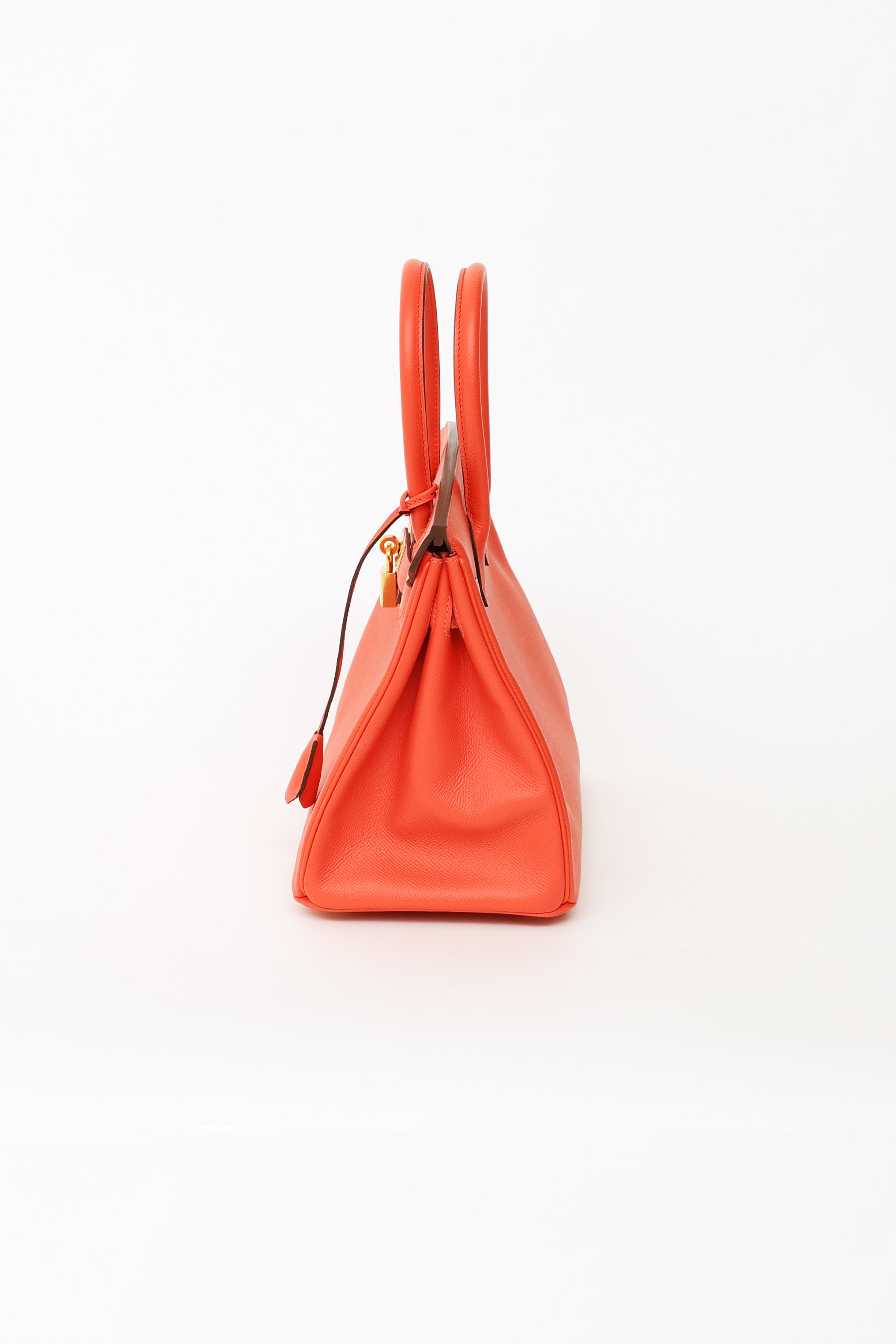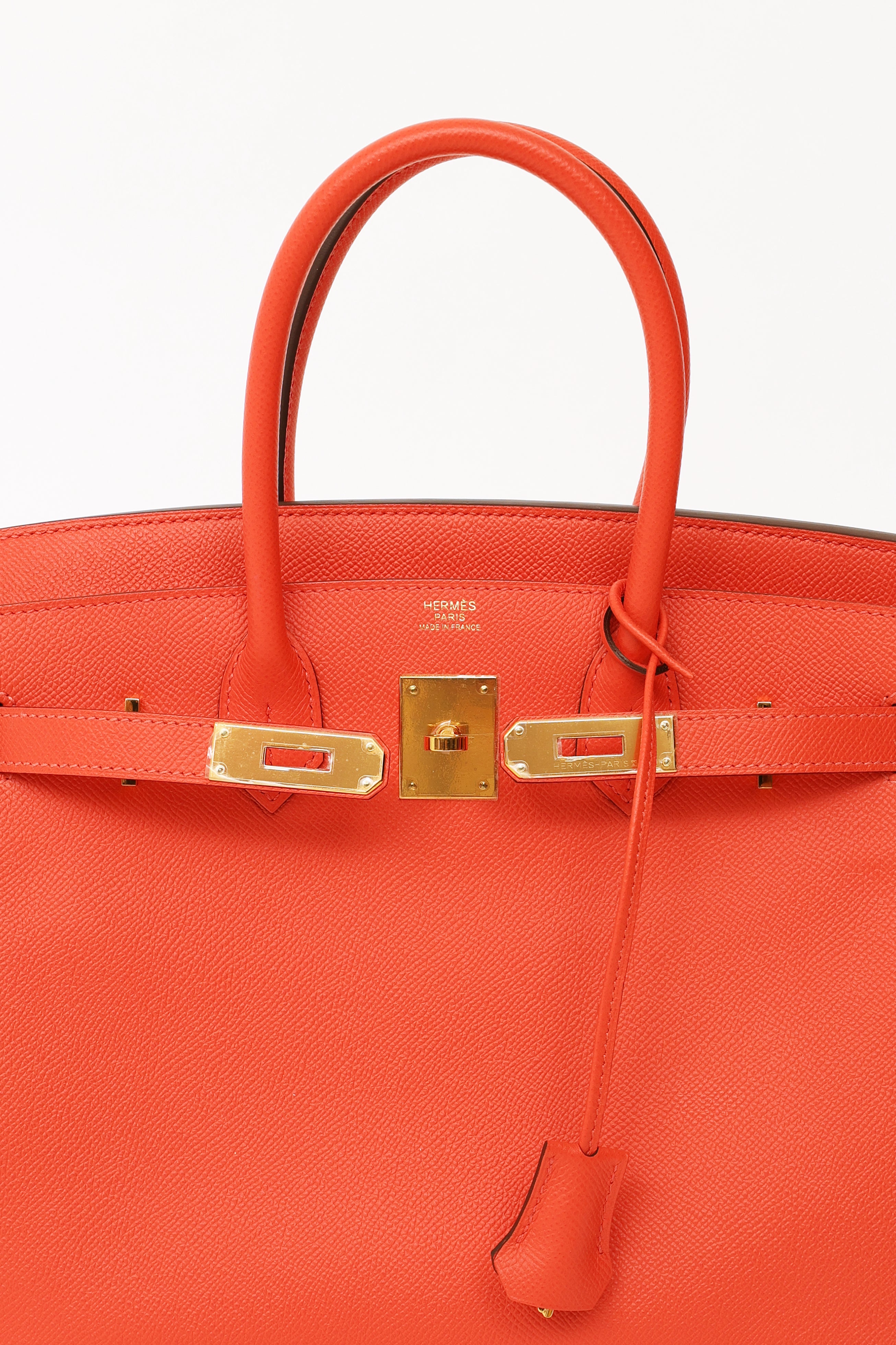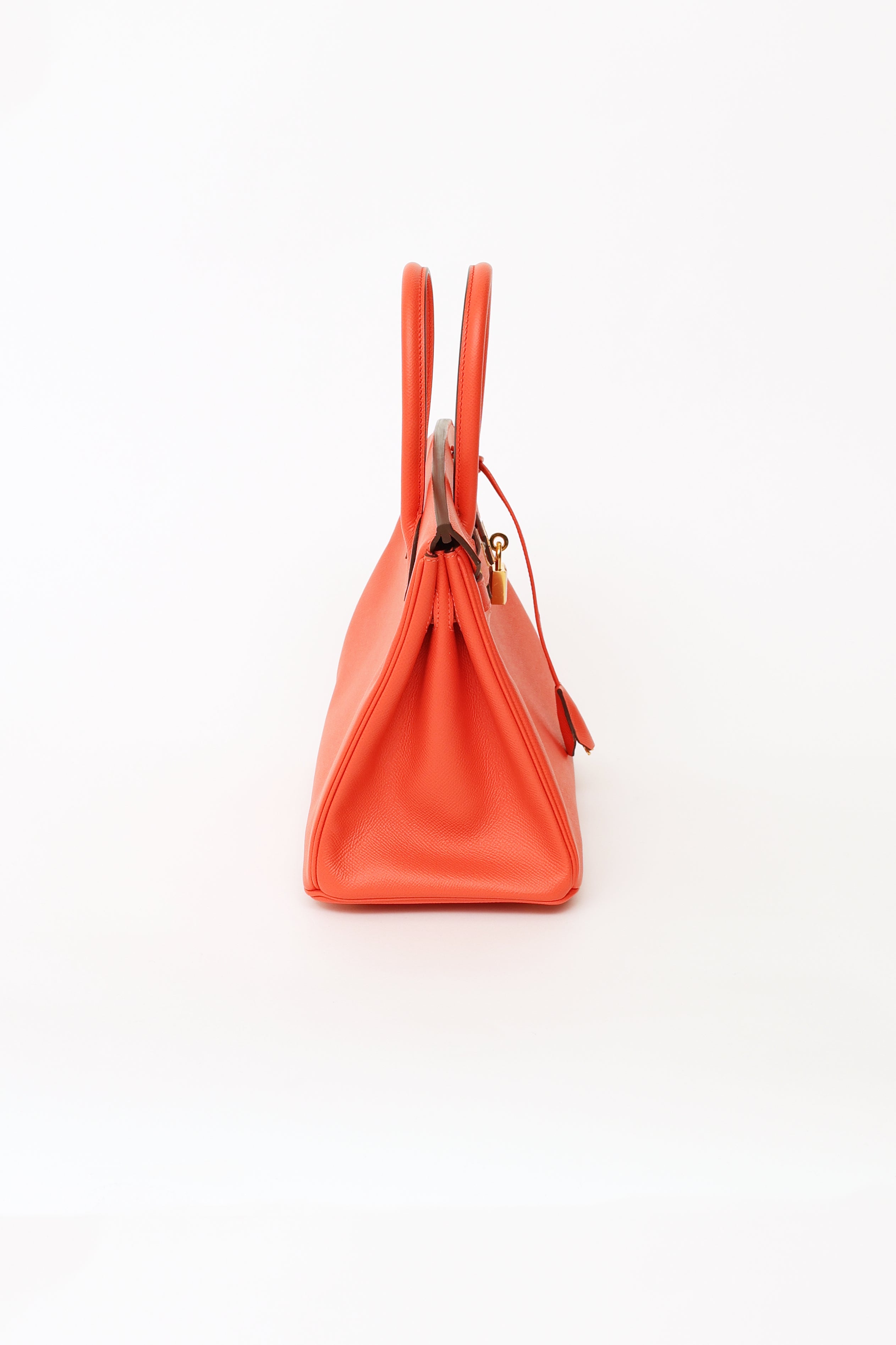 Pre-owned Hermès Birkin 30 bag featuring Epsom leather in Rose Jaipur with tonal stitching, dual rolled leather top handles, front flap with dual sangles, touret turn lock closure in gold hardware with seal, detachable clochette with keys and matching lock, four clou at bottom with protective tips, stamped Hermès logo on front under flap. X stamp from 2016. Interior features main compartment with one zipped pocket and one slip pocket.