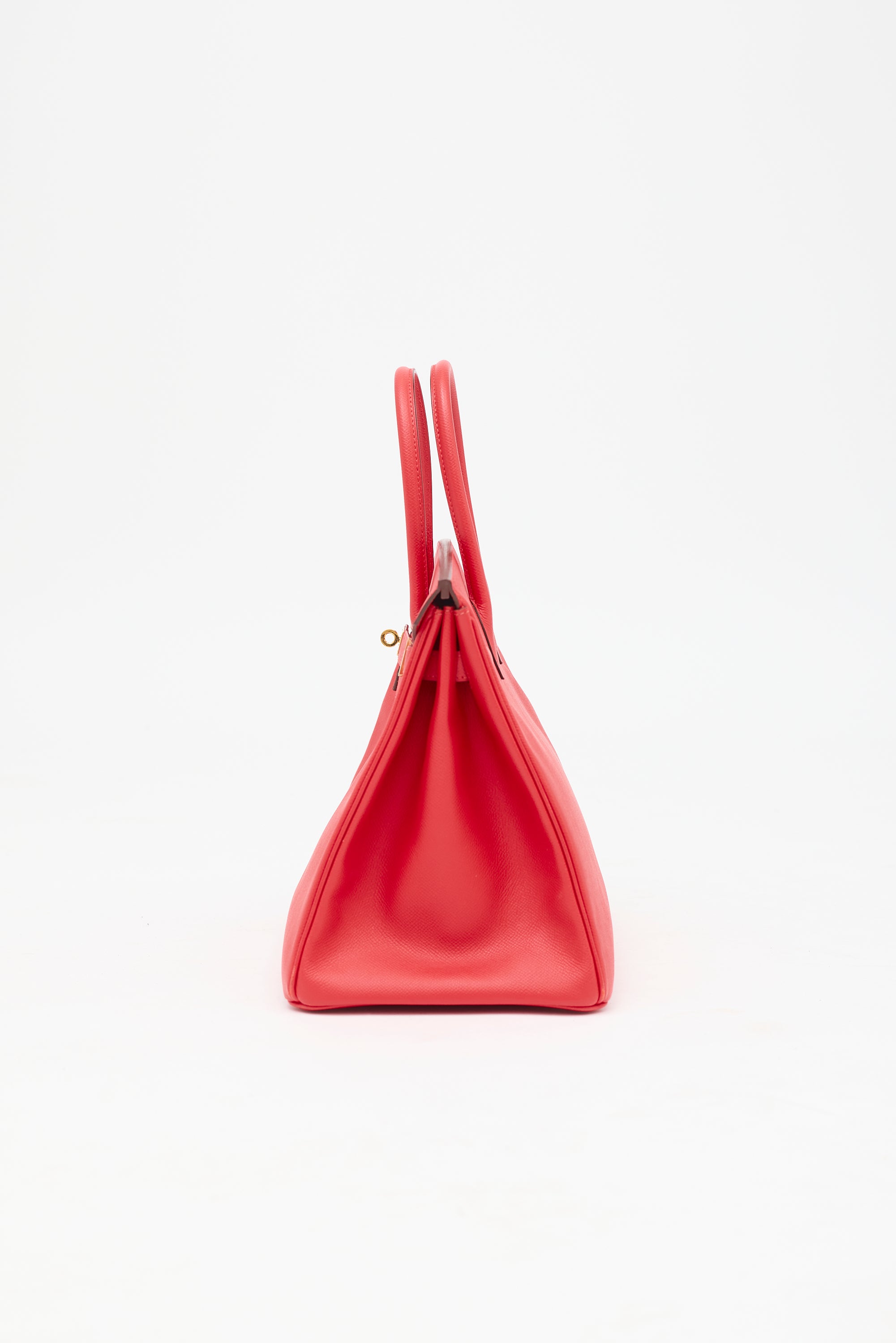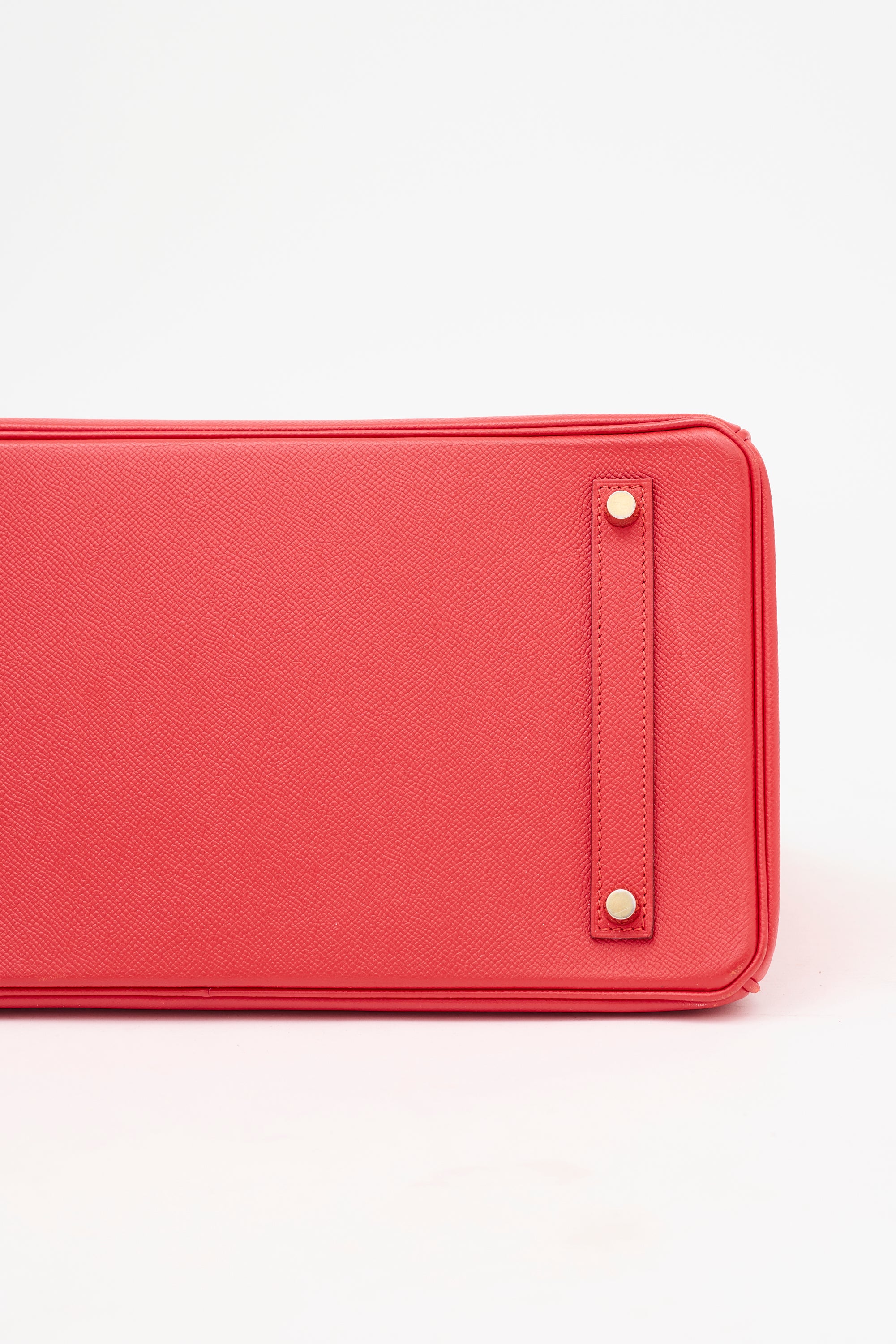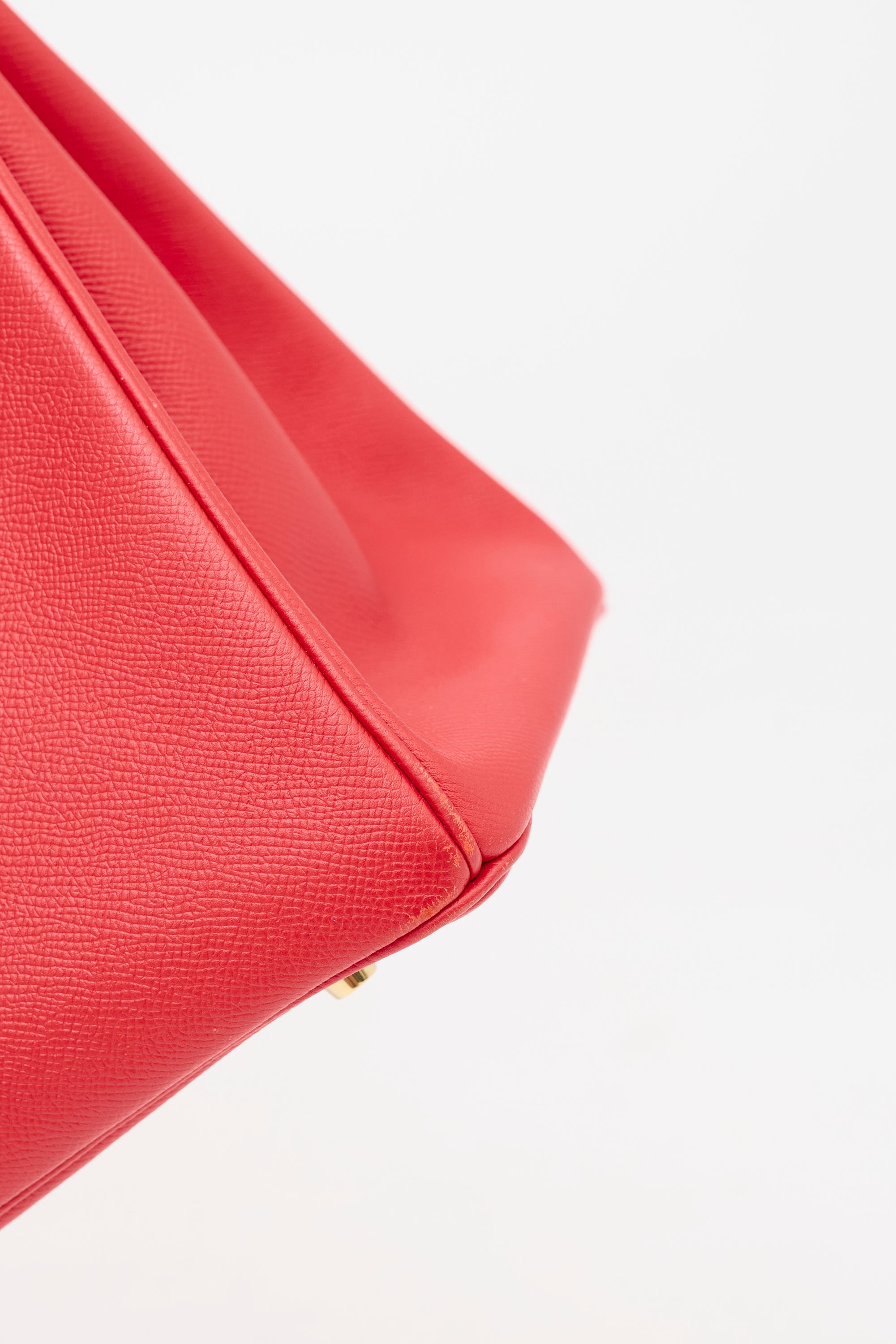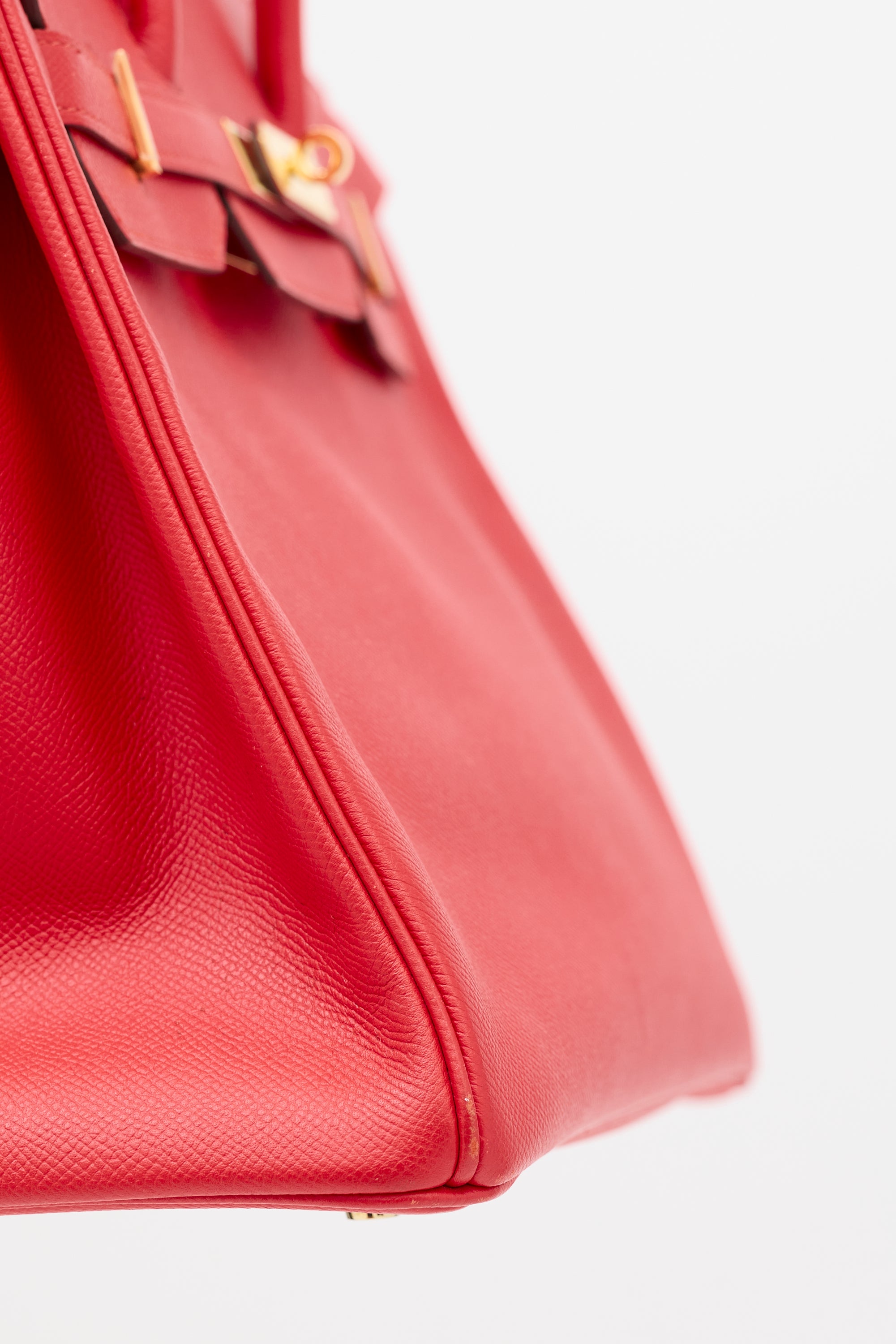 Pre-owned Hermès 2017 Clemence Birkin 35 bag in Rouge Casaque featuring dual rolled top handles, gold plated Palladium hardware, sangles and pontet, detachable lock and clochette, signature twist lock touret closure, gold stamped logo under top flap, four clou, one main compartment, and one zip and slip pockets inside. Comes with original dust bag.