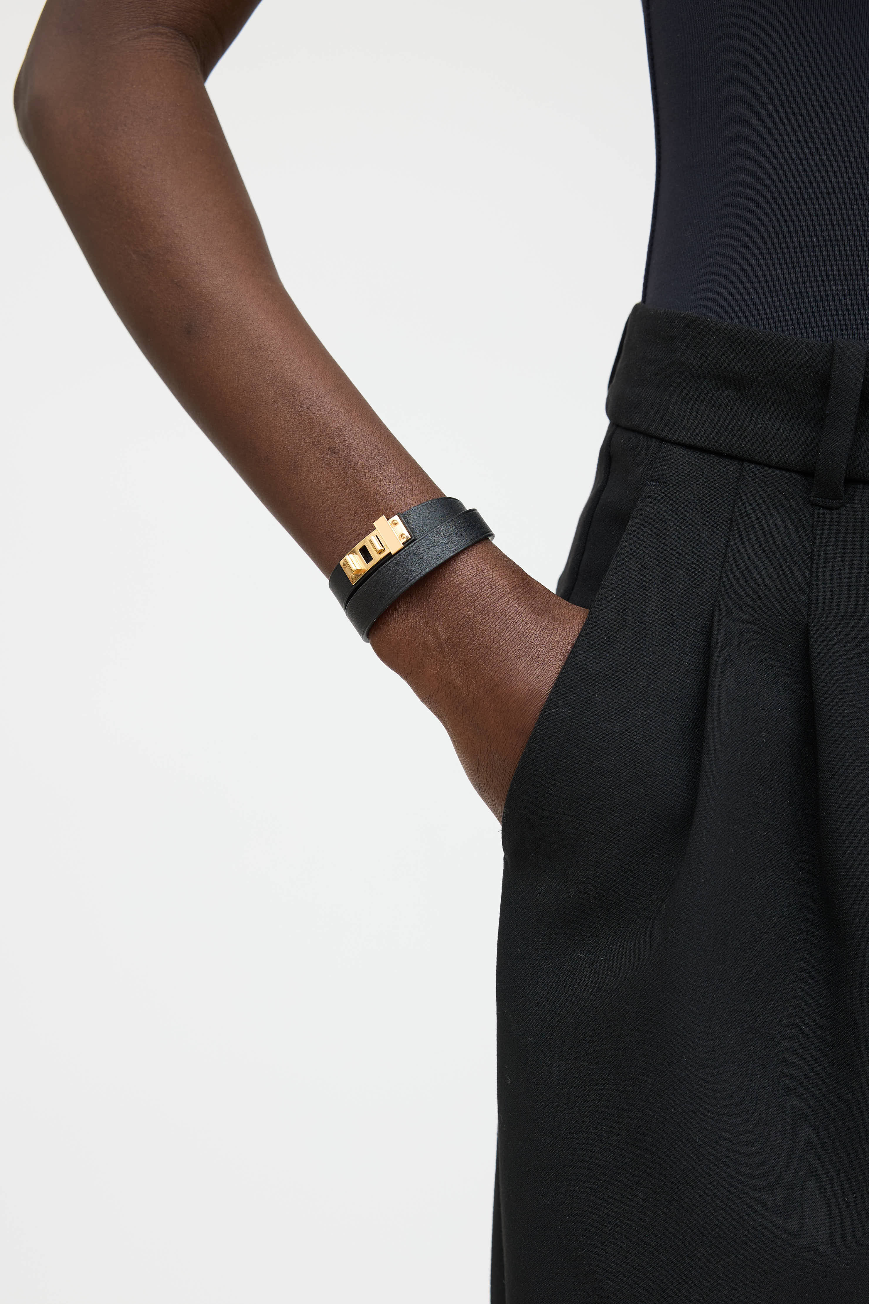 Pre-owned Hermès 2017 black Mini Dog Double Tour bracelet in swift leather featuring stamped logo at interior, gold plated hardware, and stud closure.