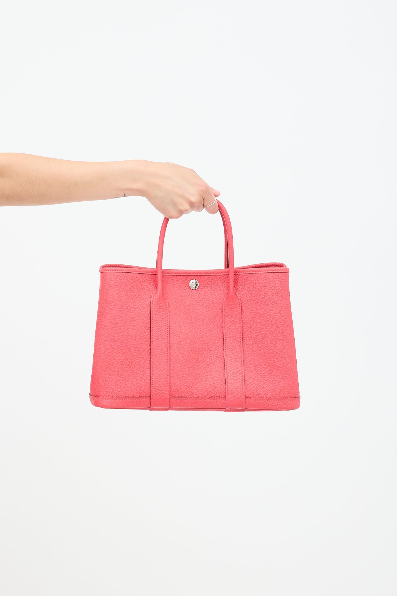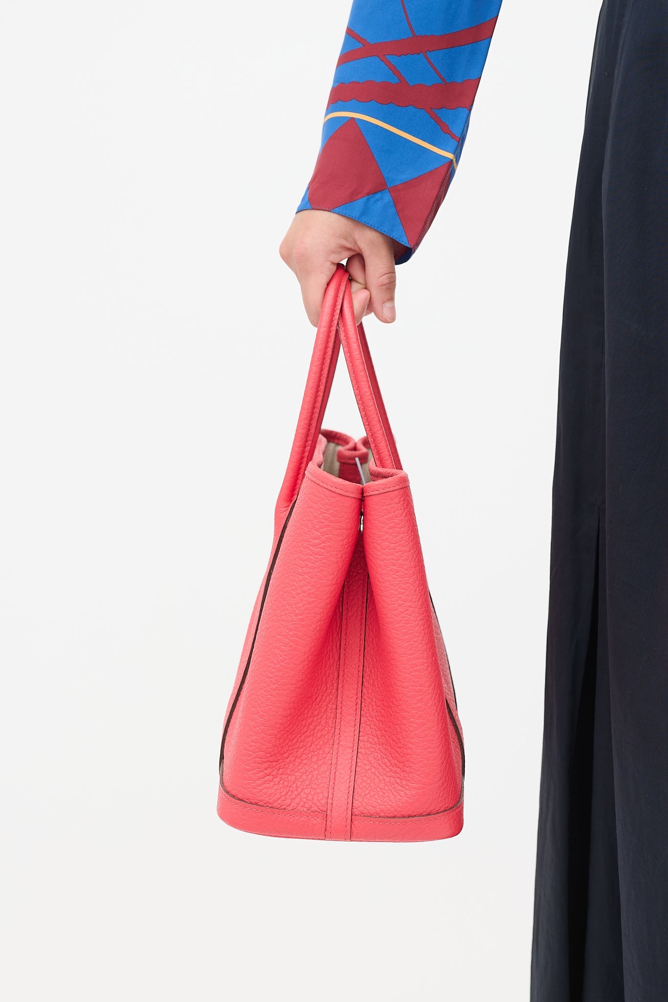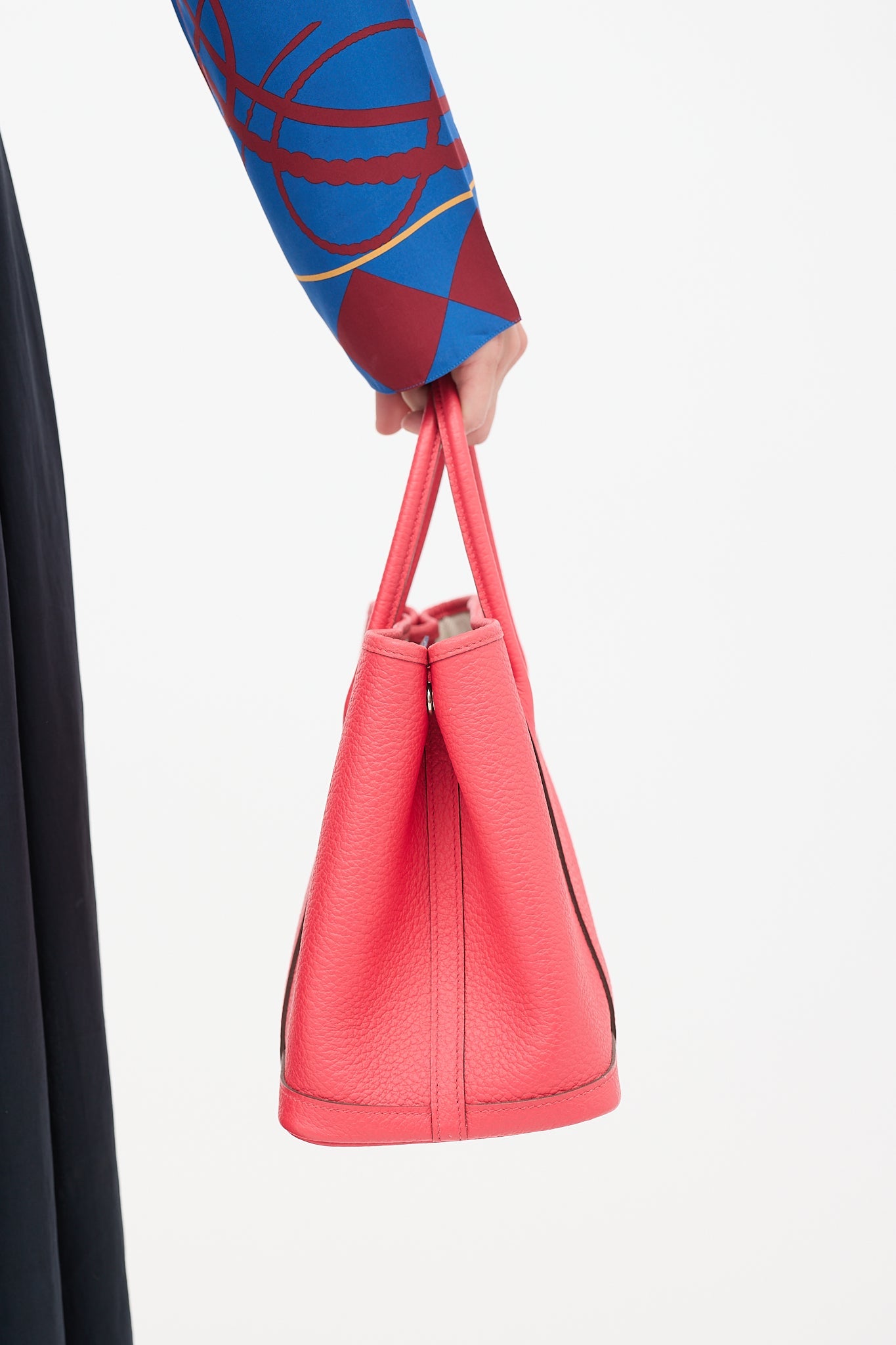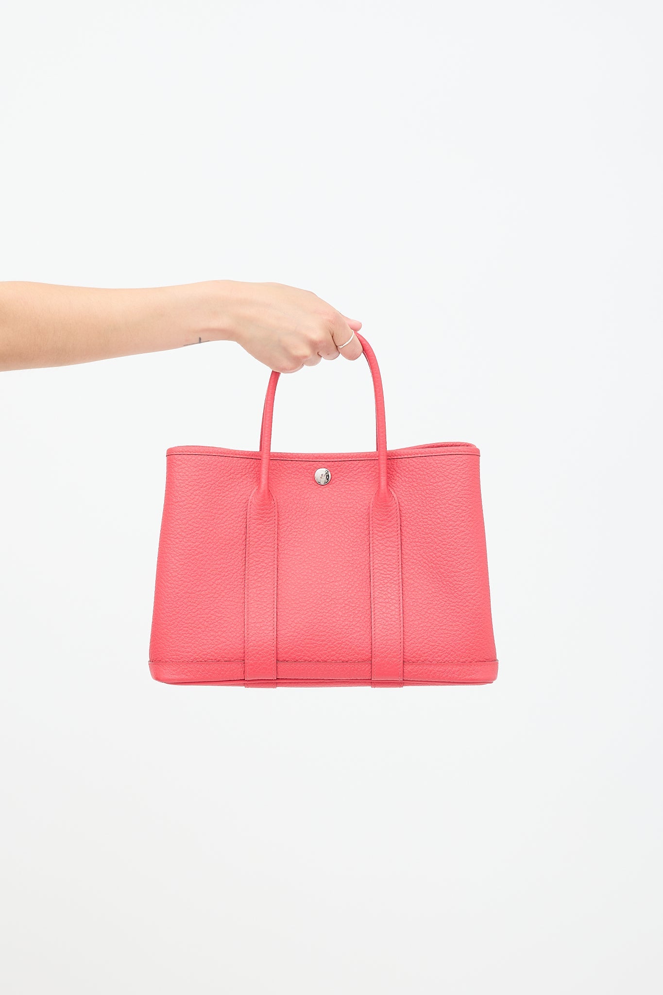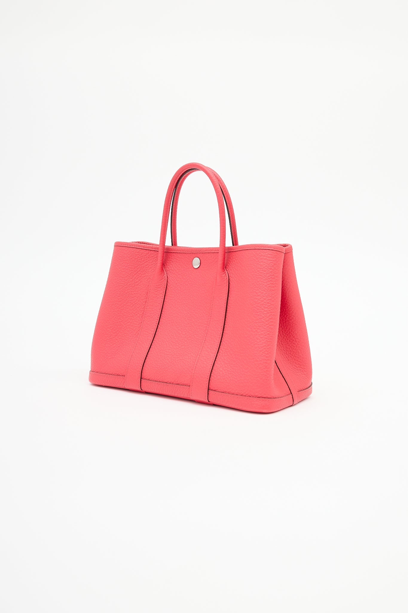 Pre-owned Hermès 2020 Garden Party 30 tote bag in Bougainvillea featuring Negonda leather, silver tone Palladium hardware, dual rolled top handles, Clou de Selle snap buttons at front and sides, chevron toile lining, one main compartment, and one zip pocket inside. Comes with original dust bag.