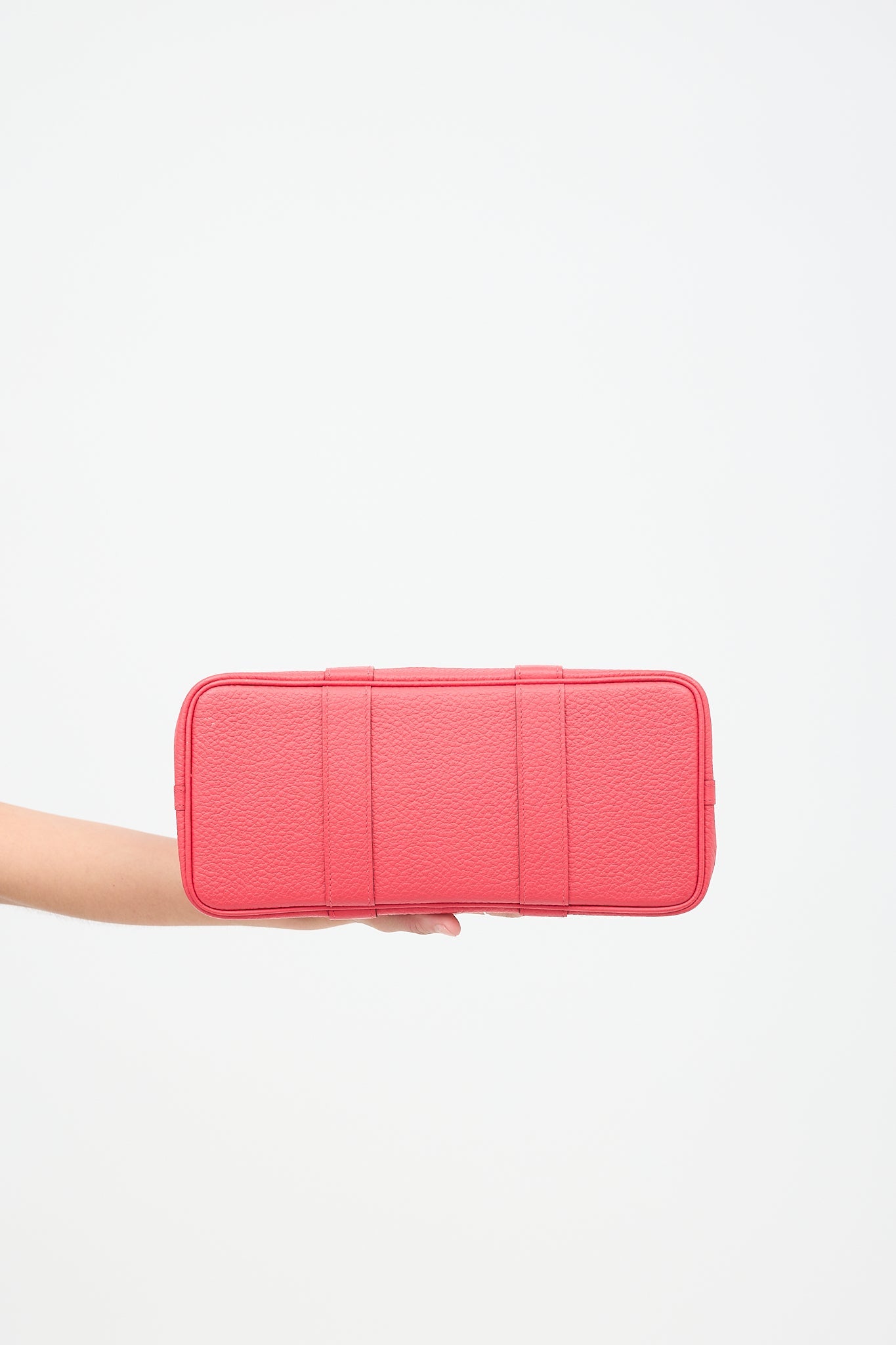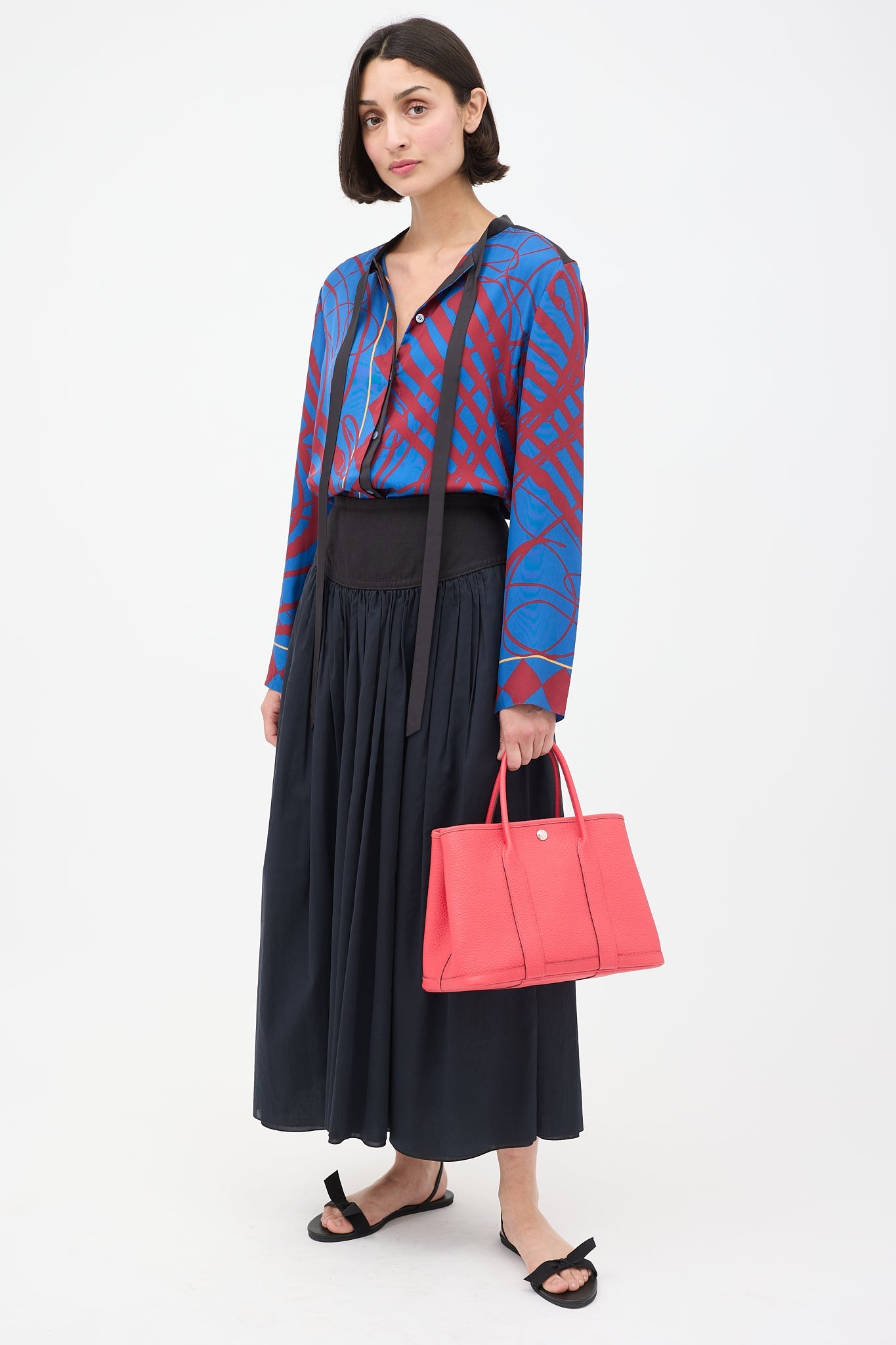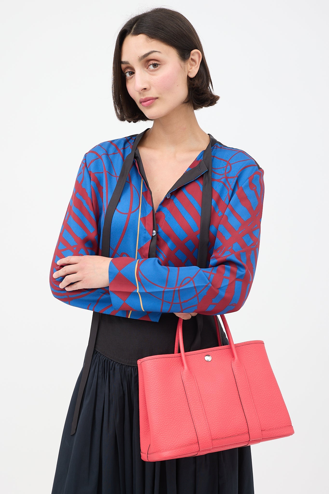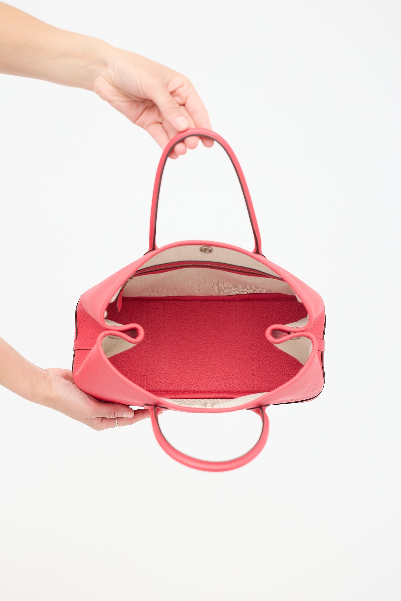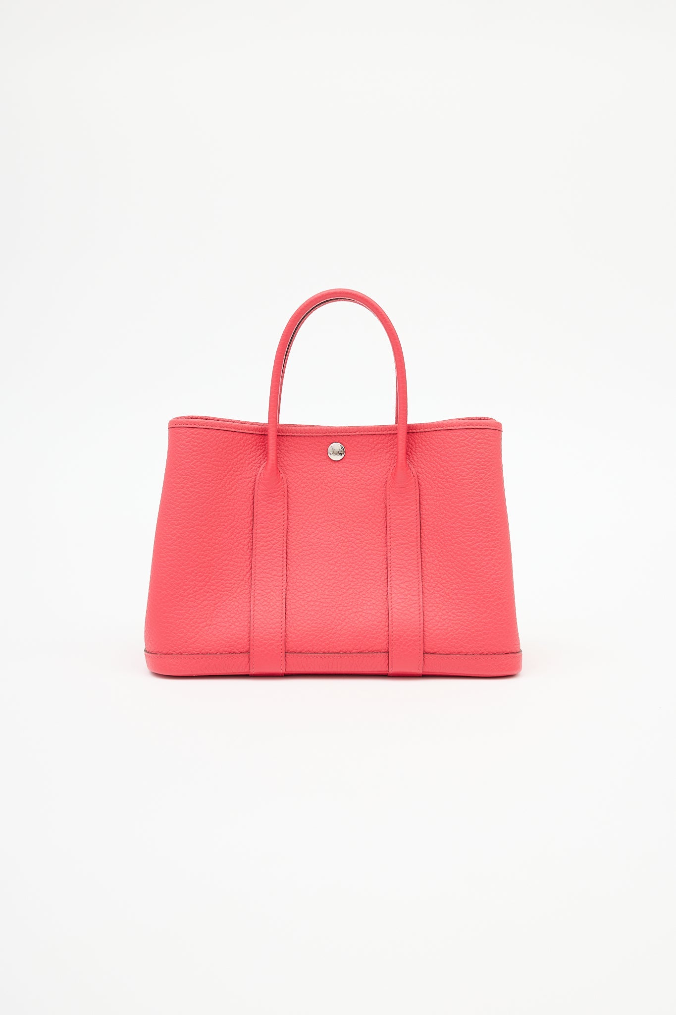 Pre-owned Hermès 2020 Garden Party 30 tote bag in Bougainvillea featuring Negonda leather, silver tone Palladium hardware, dual rolled top handles, Clou de Selle snap buttons at front and sides, chevron toile lining, one main compartment, and one zip pocket inside. Comes with original dust bag.