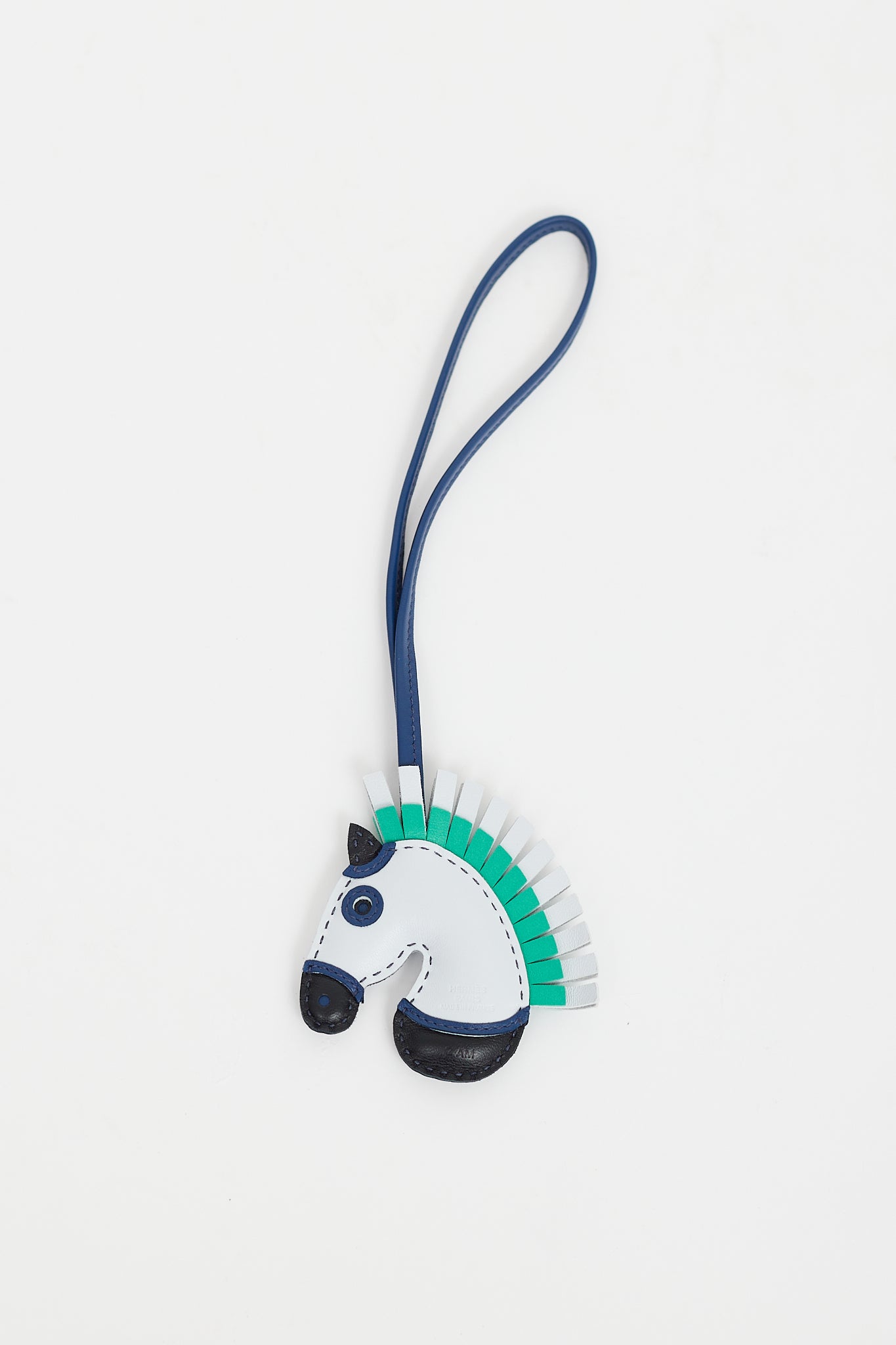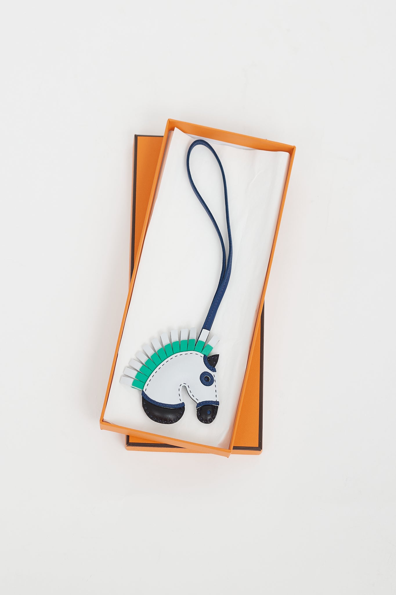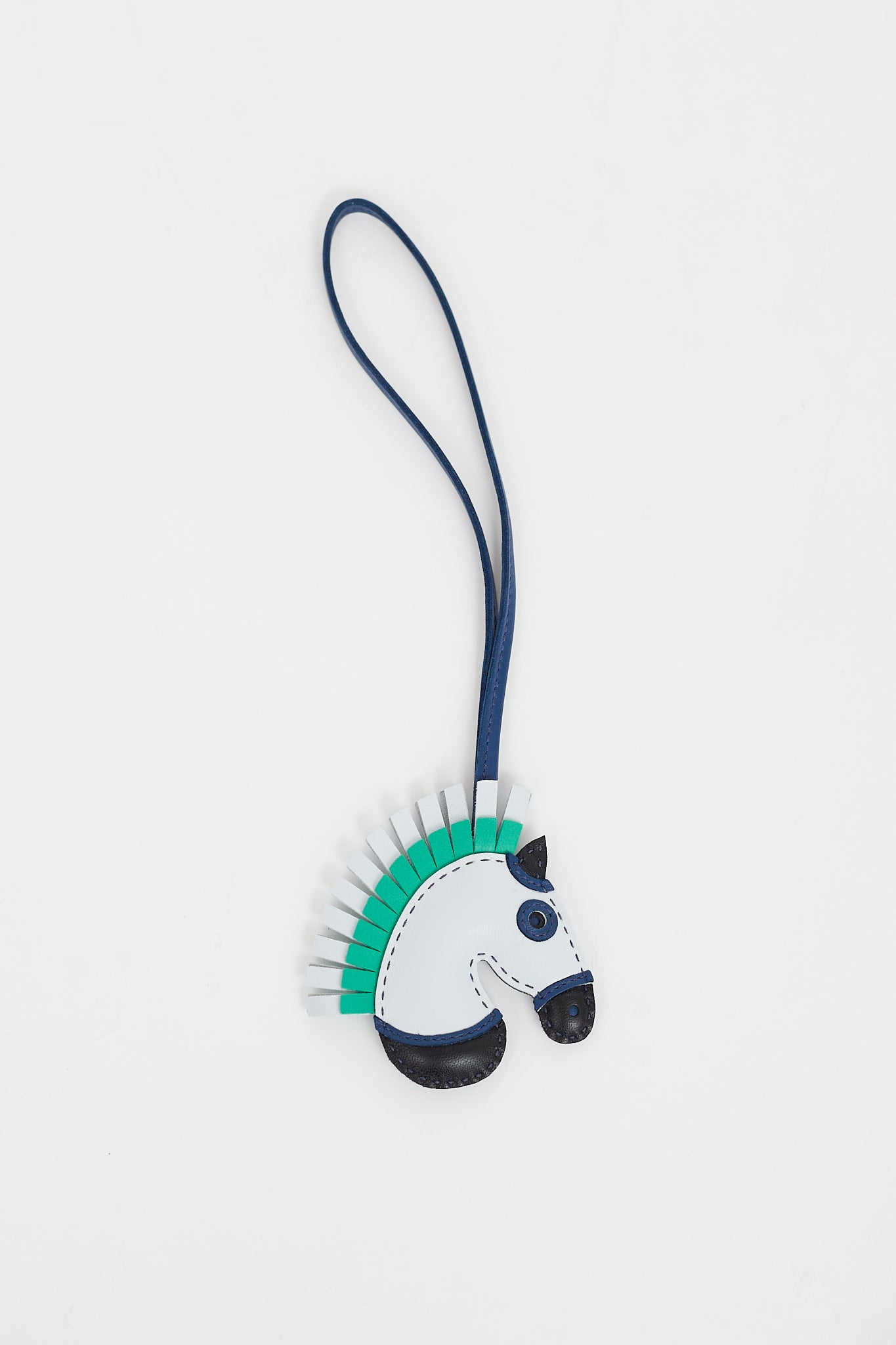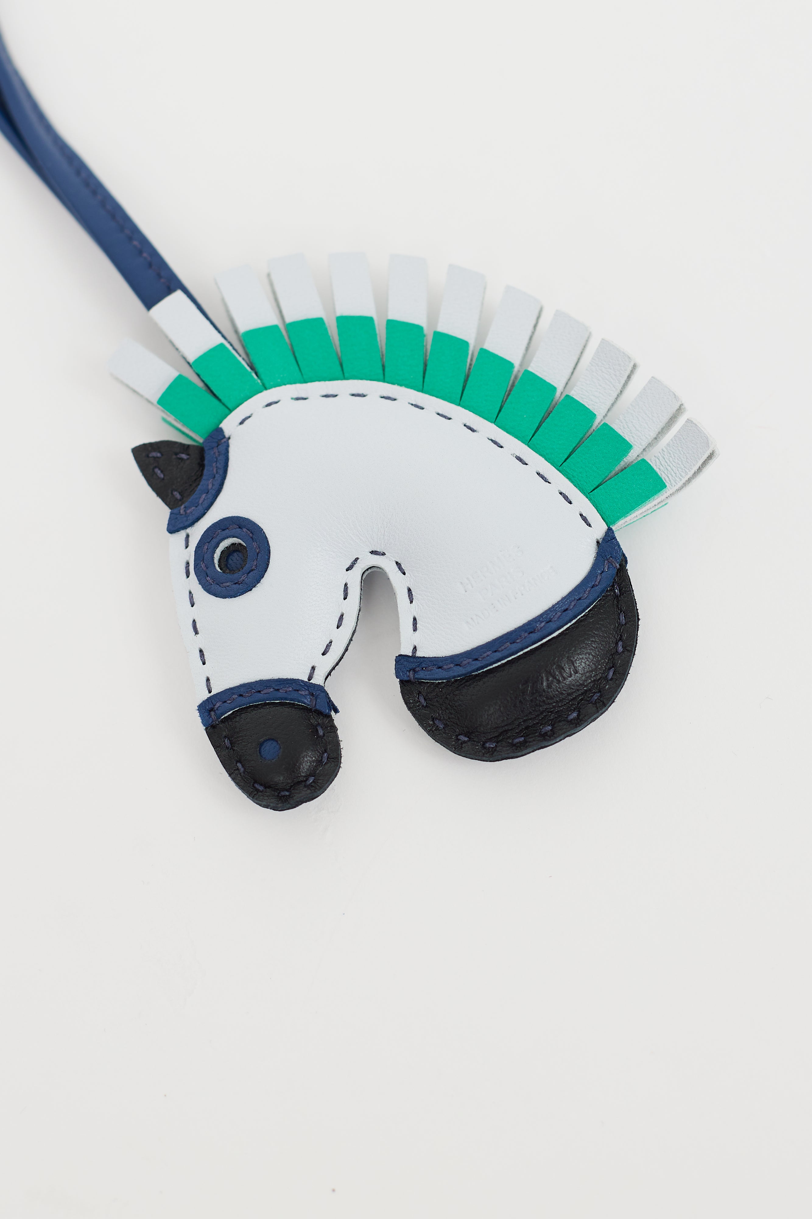 Pre-owned Hermès 2021 multi blue Milo Geegee Camail bag charm featuring milo lambkin leather material, contrast stitching, and blue, white, and green throughout. Comes with original box.