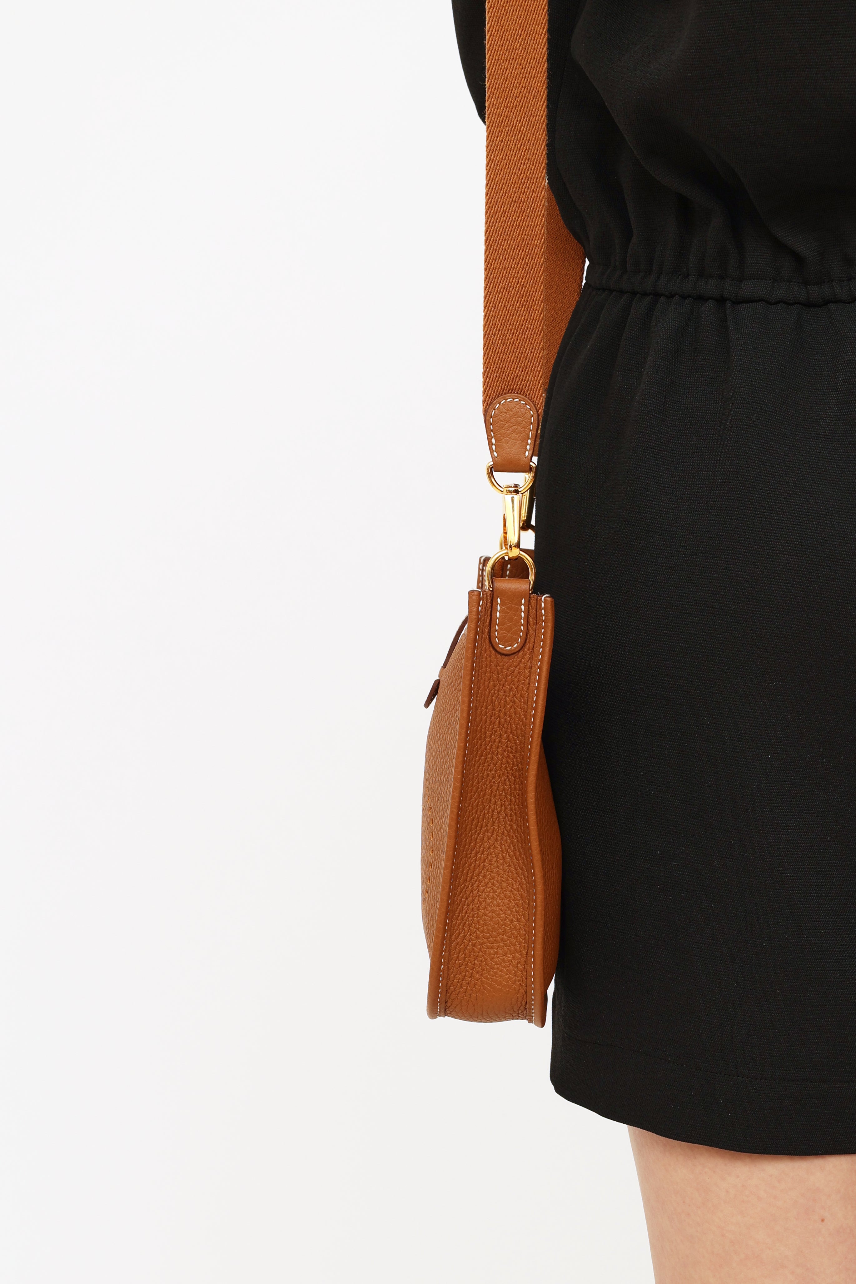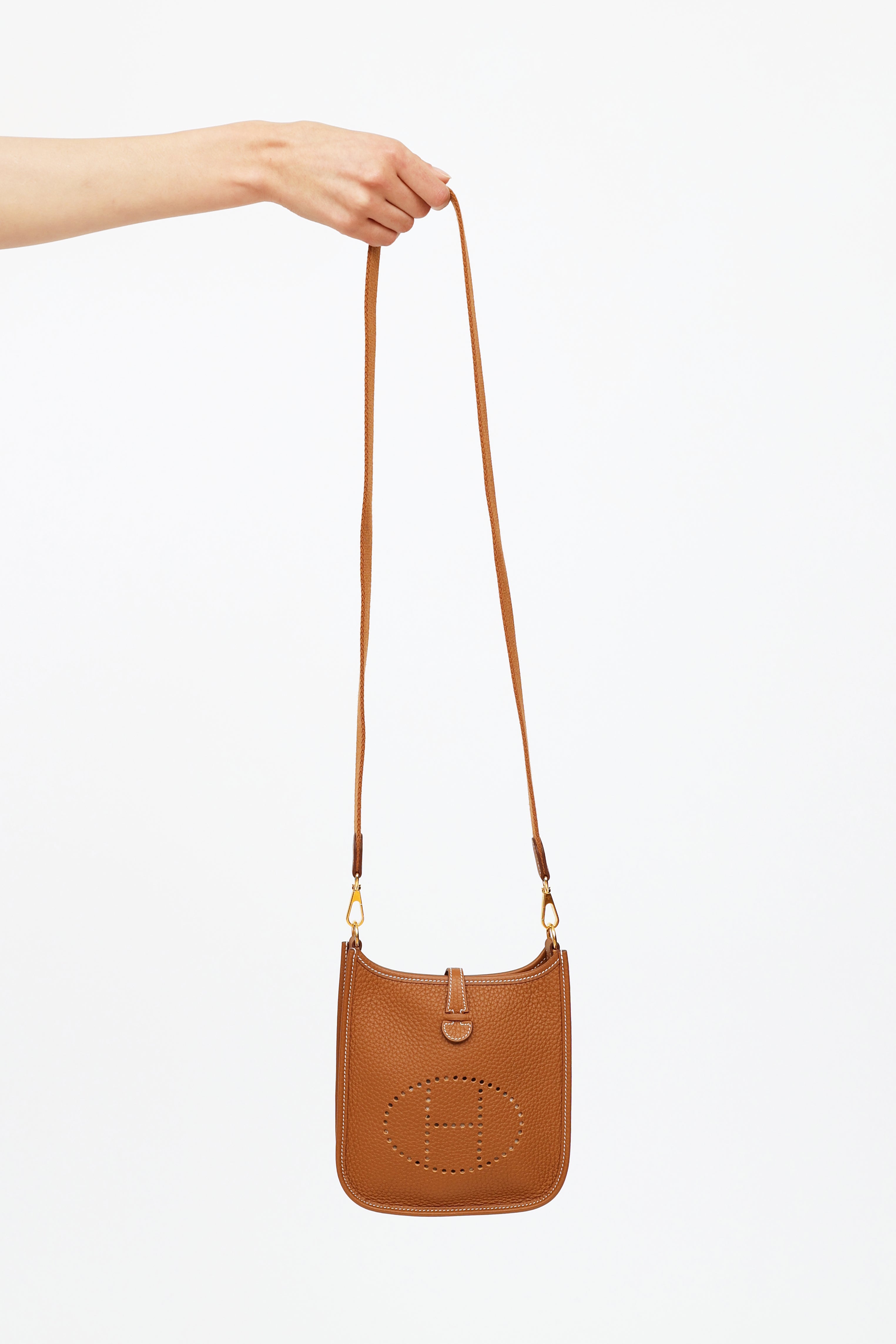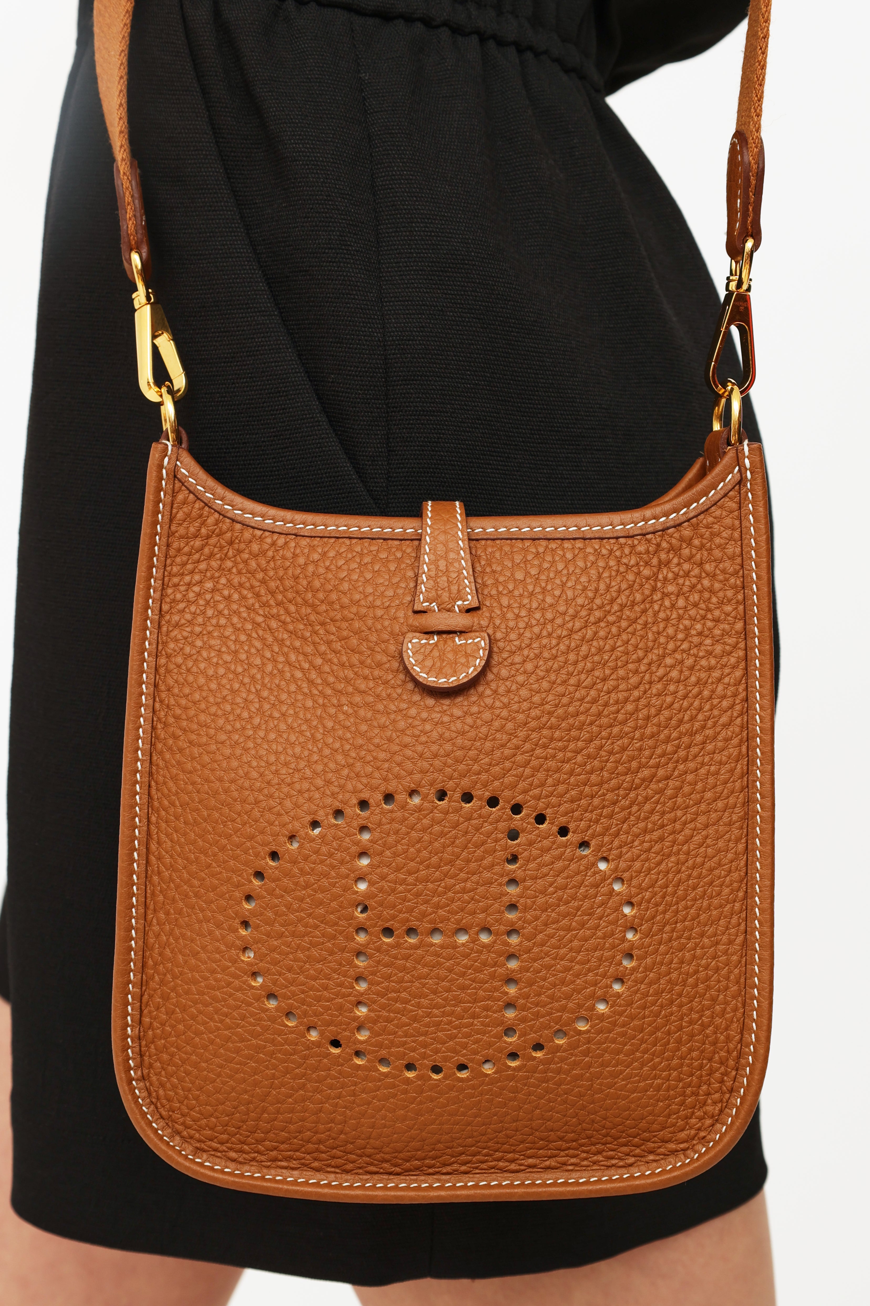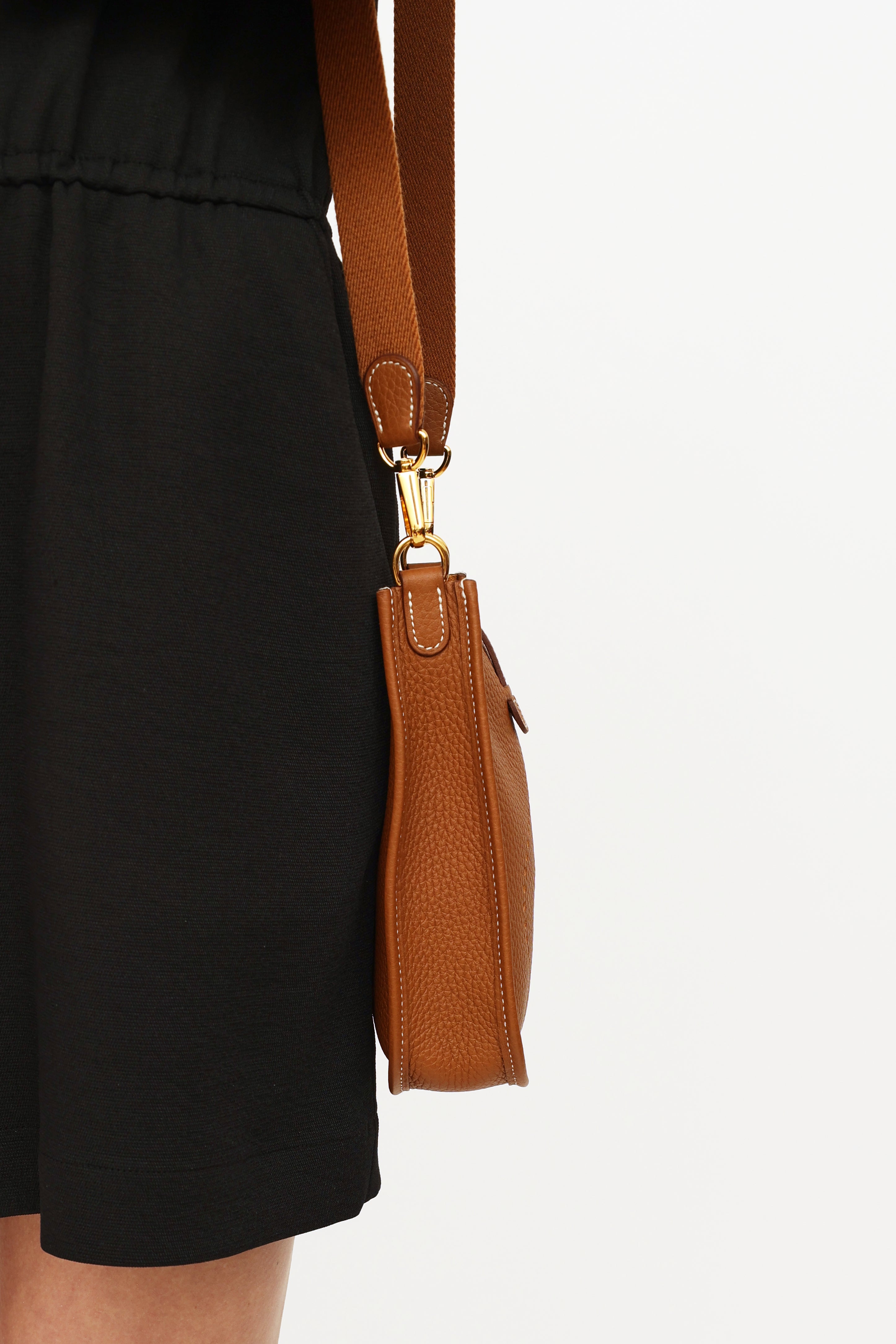 Pre-owned Hermès mini Evelyne Clemence TPM 16 shoulder bag in Gold featuring perforated H logo at front, Clemence leather, snap button top strap closure, gold-tone hardware, solid webbing strap. One main unlined compartment. Purchased in 2022. U stamp.