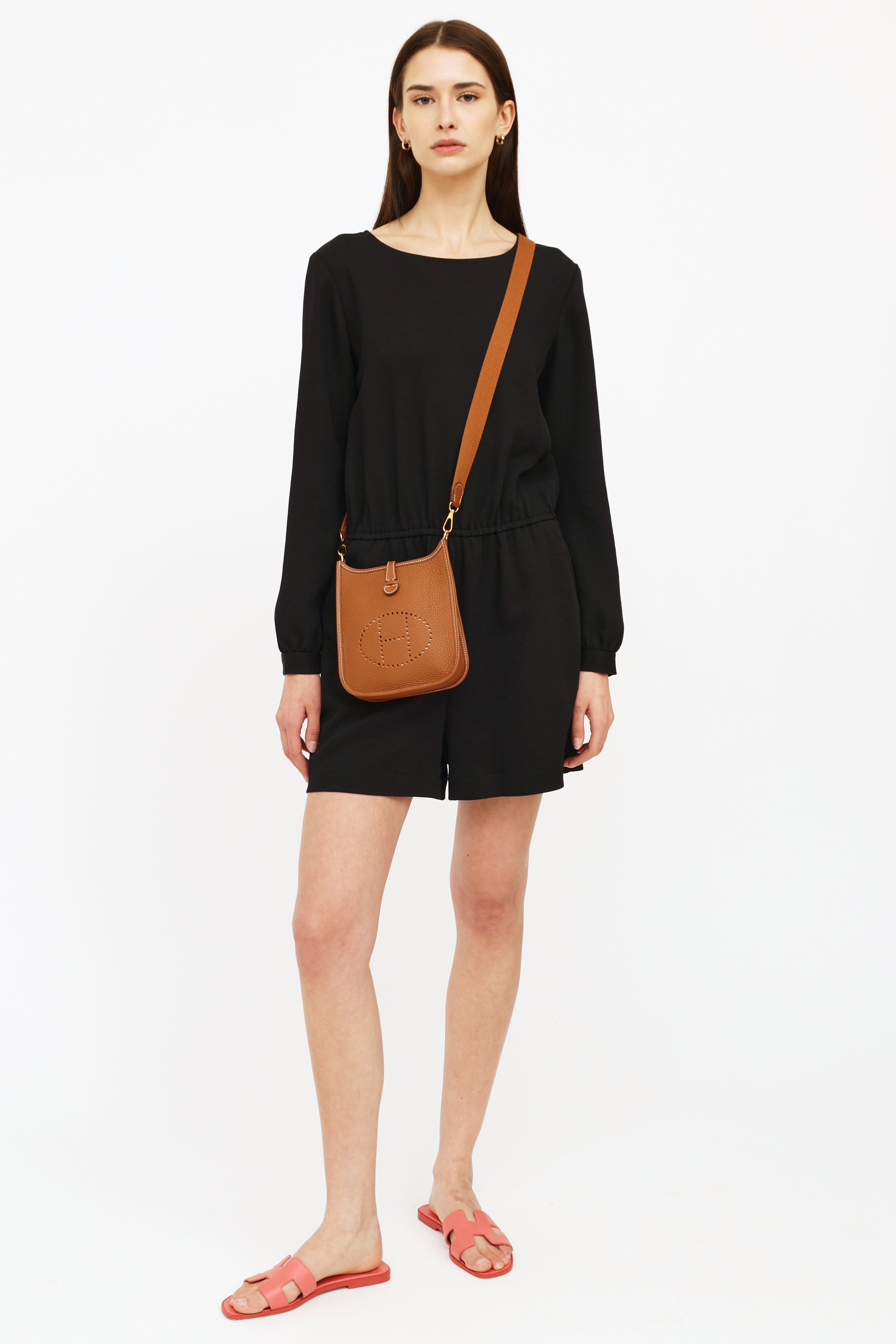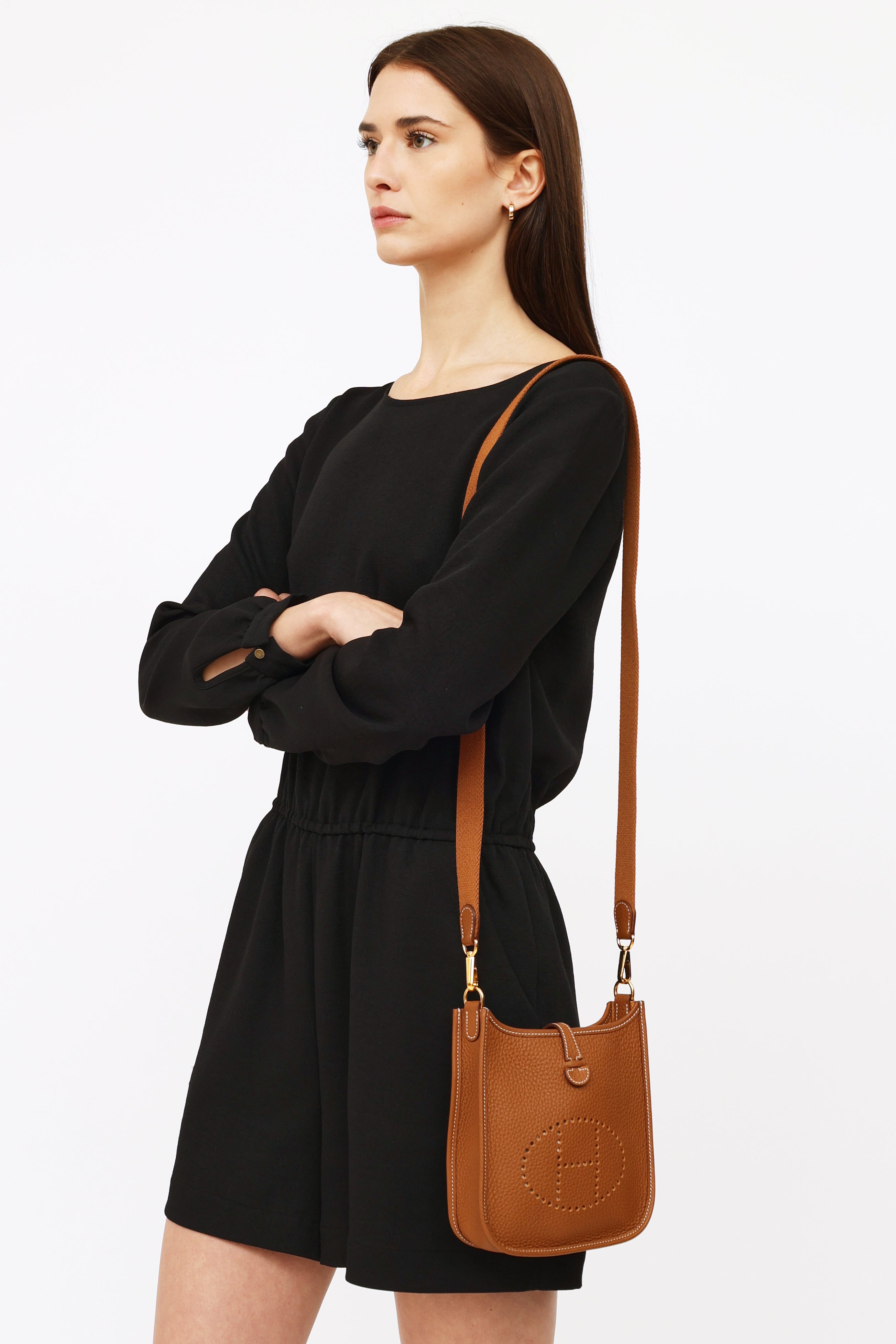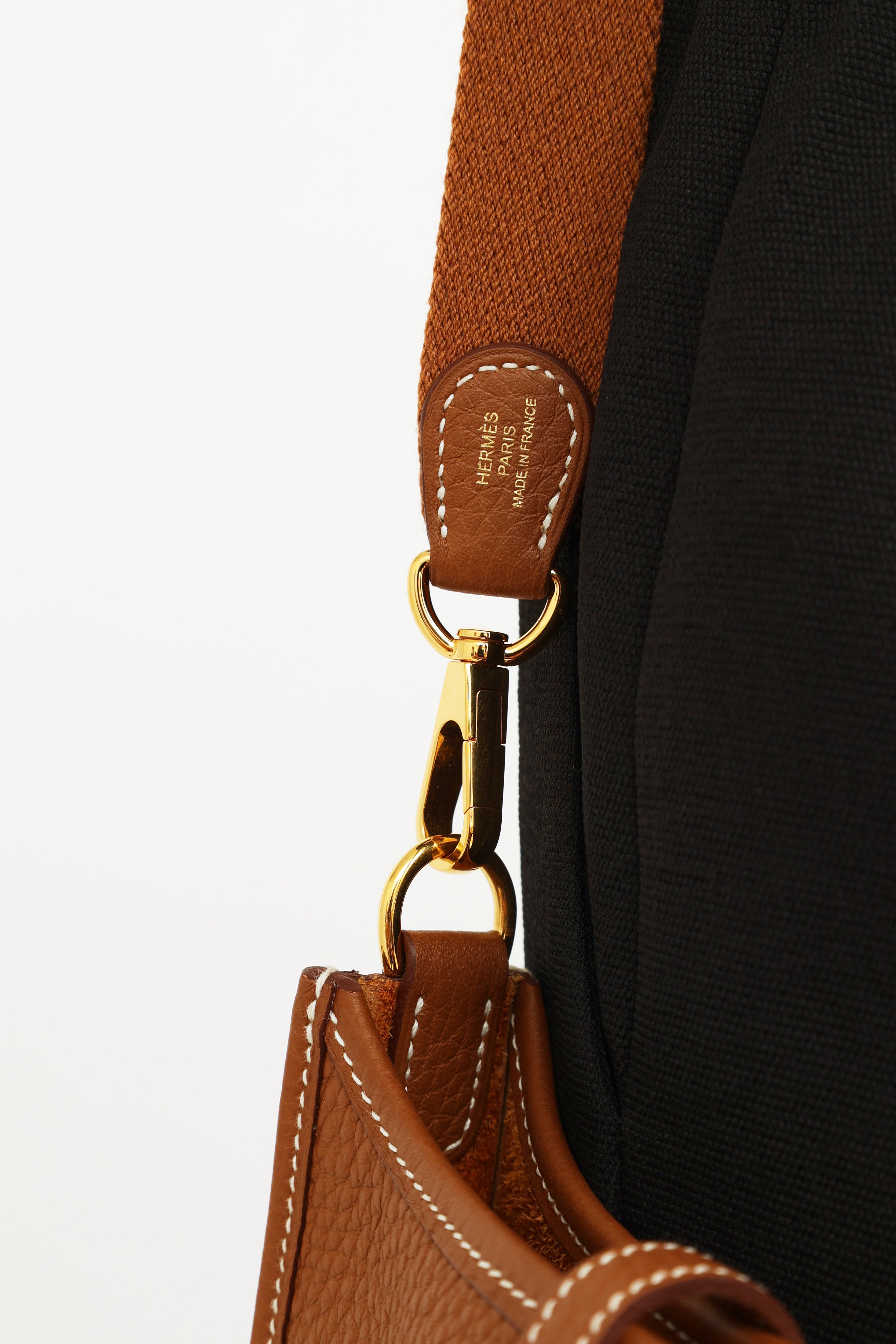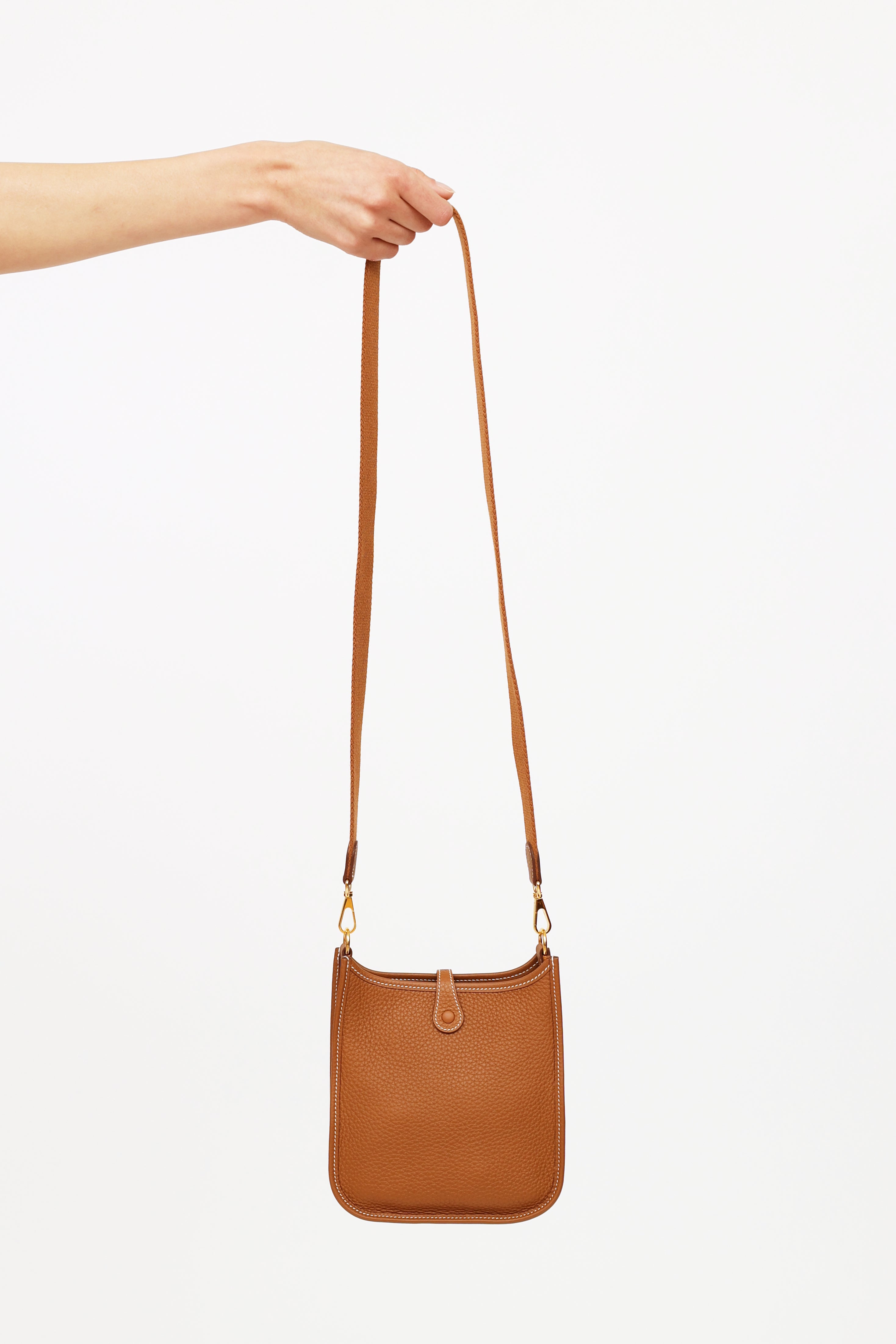 Pre-owned Hermès mini Evelyne Clemence TPM 16 shoulder bag in Gold featuring perforated H logo at front, Clemence leather, snap button top strap closure, gold-tone hardware, solid webbing strap. One main unlined compartment. Purchased in 2022. U stamp.
