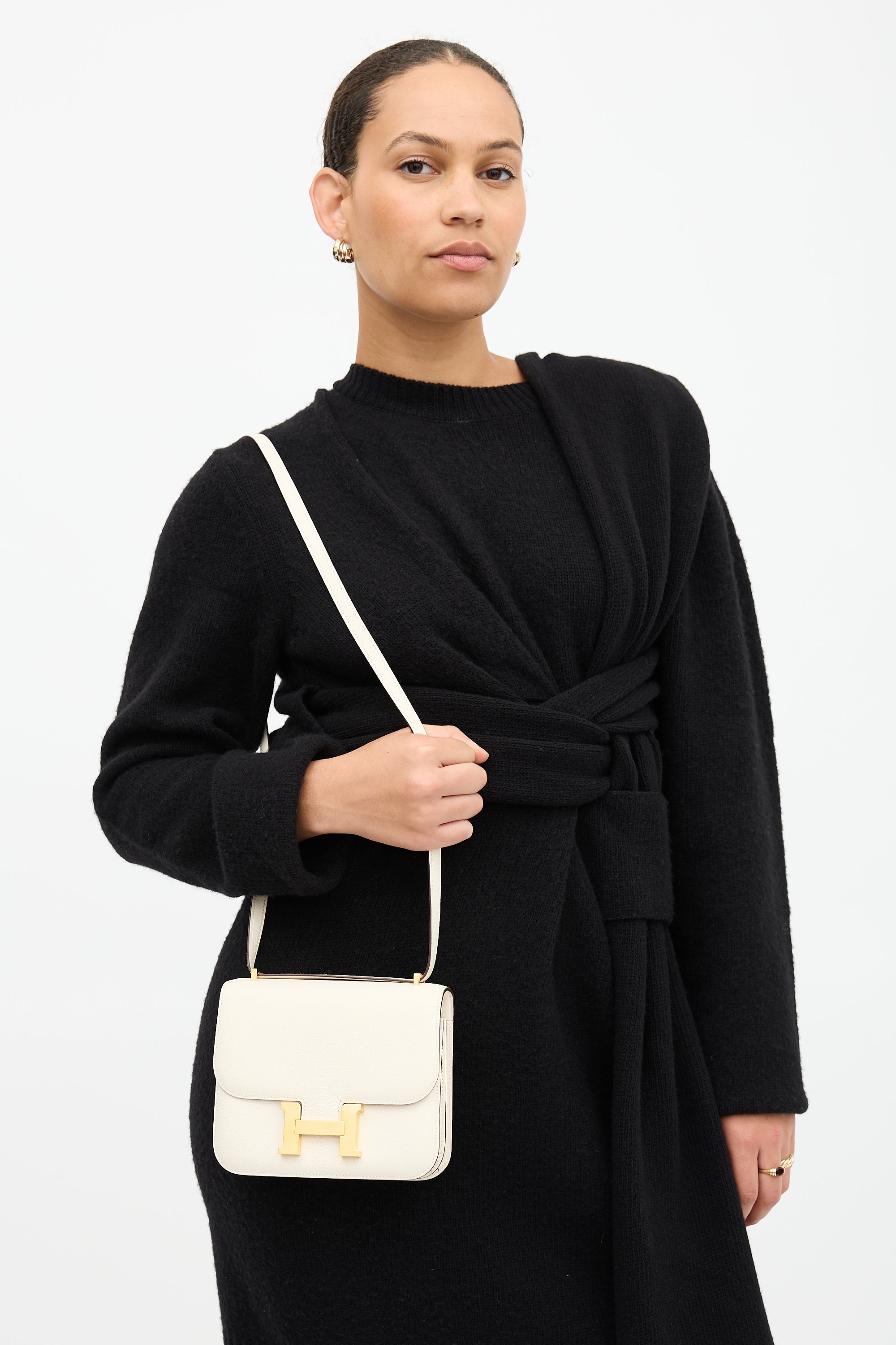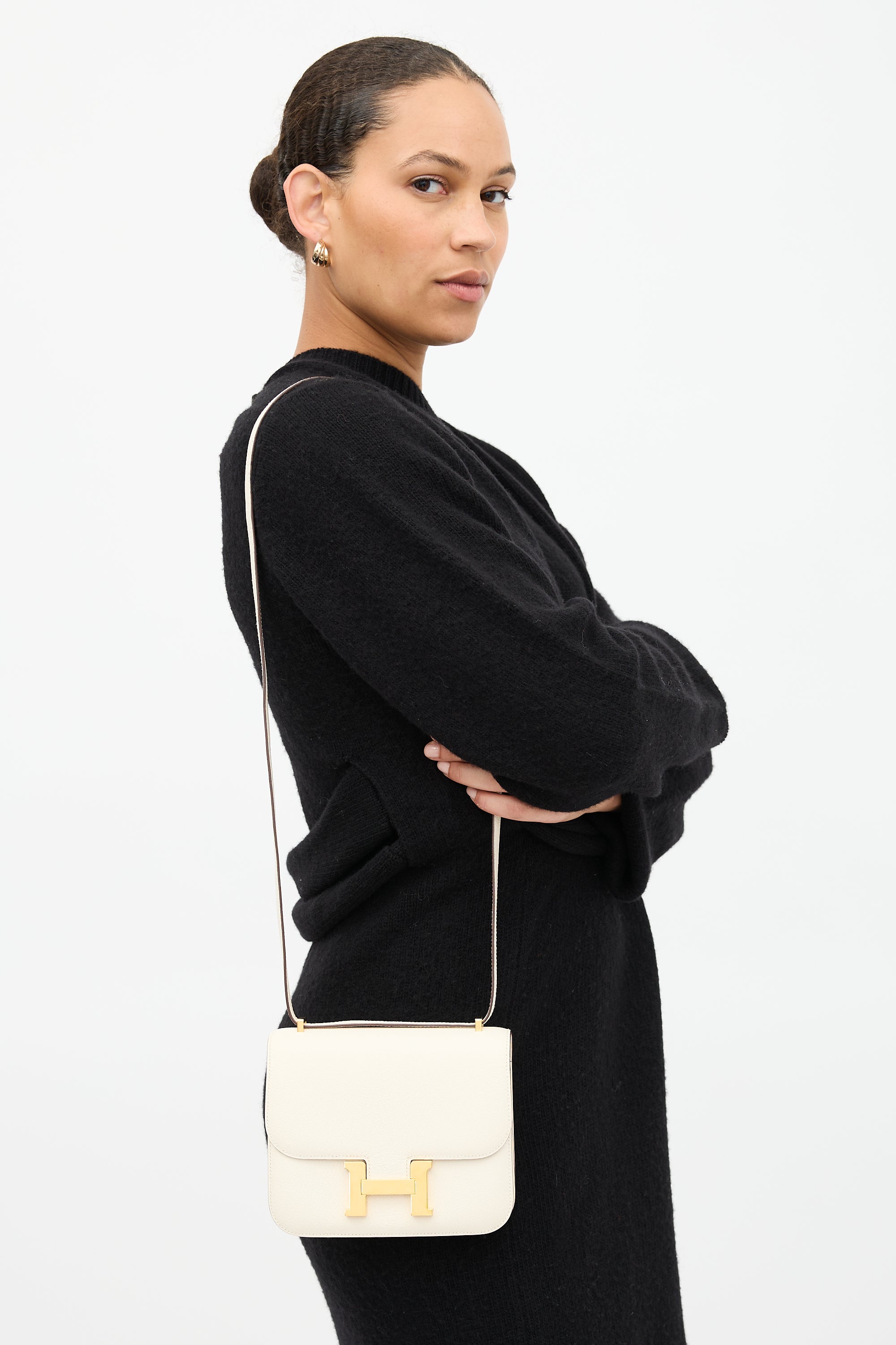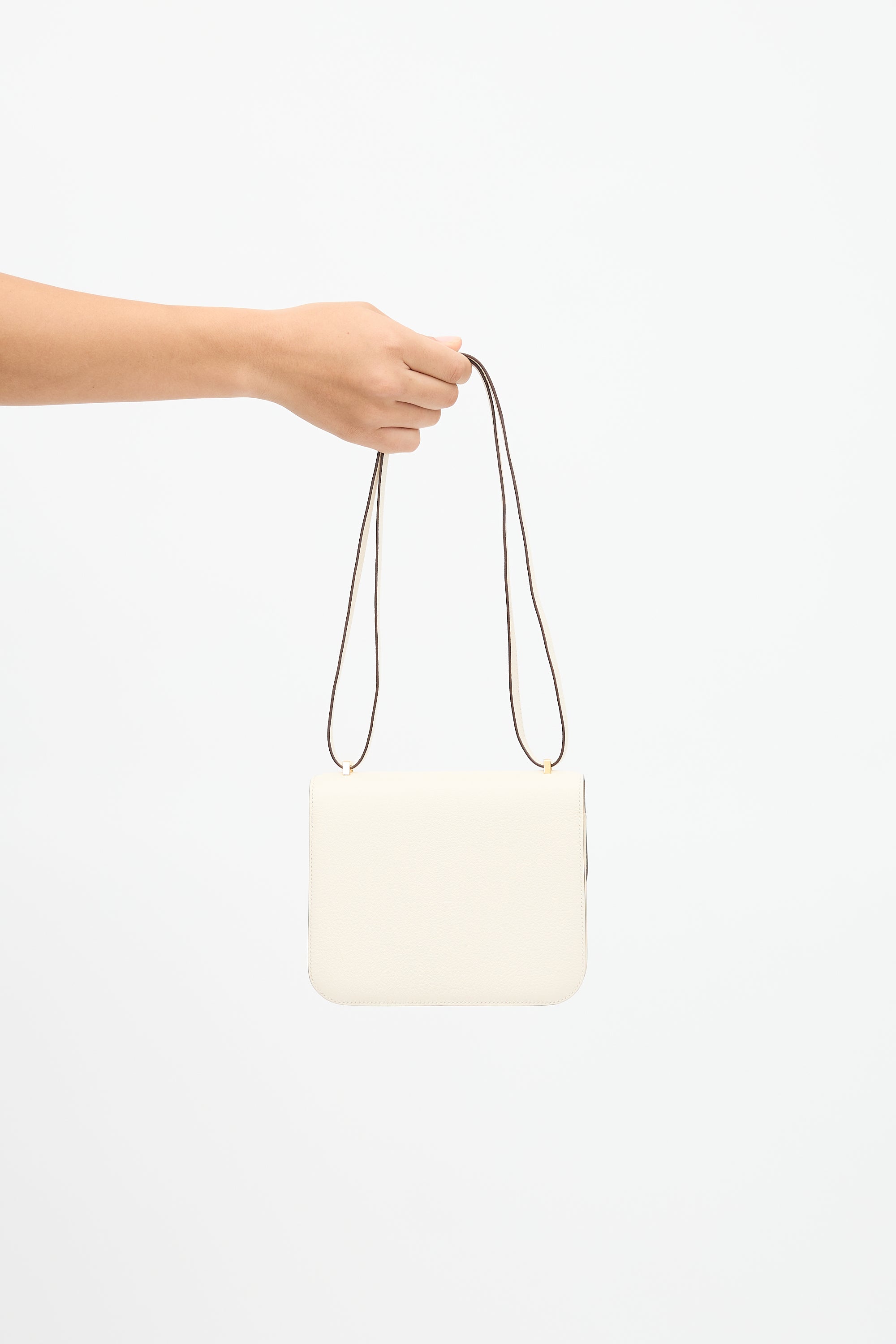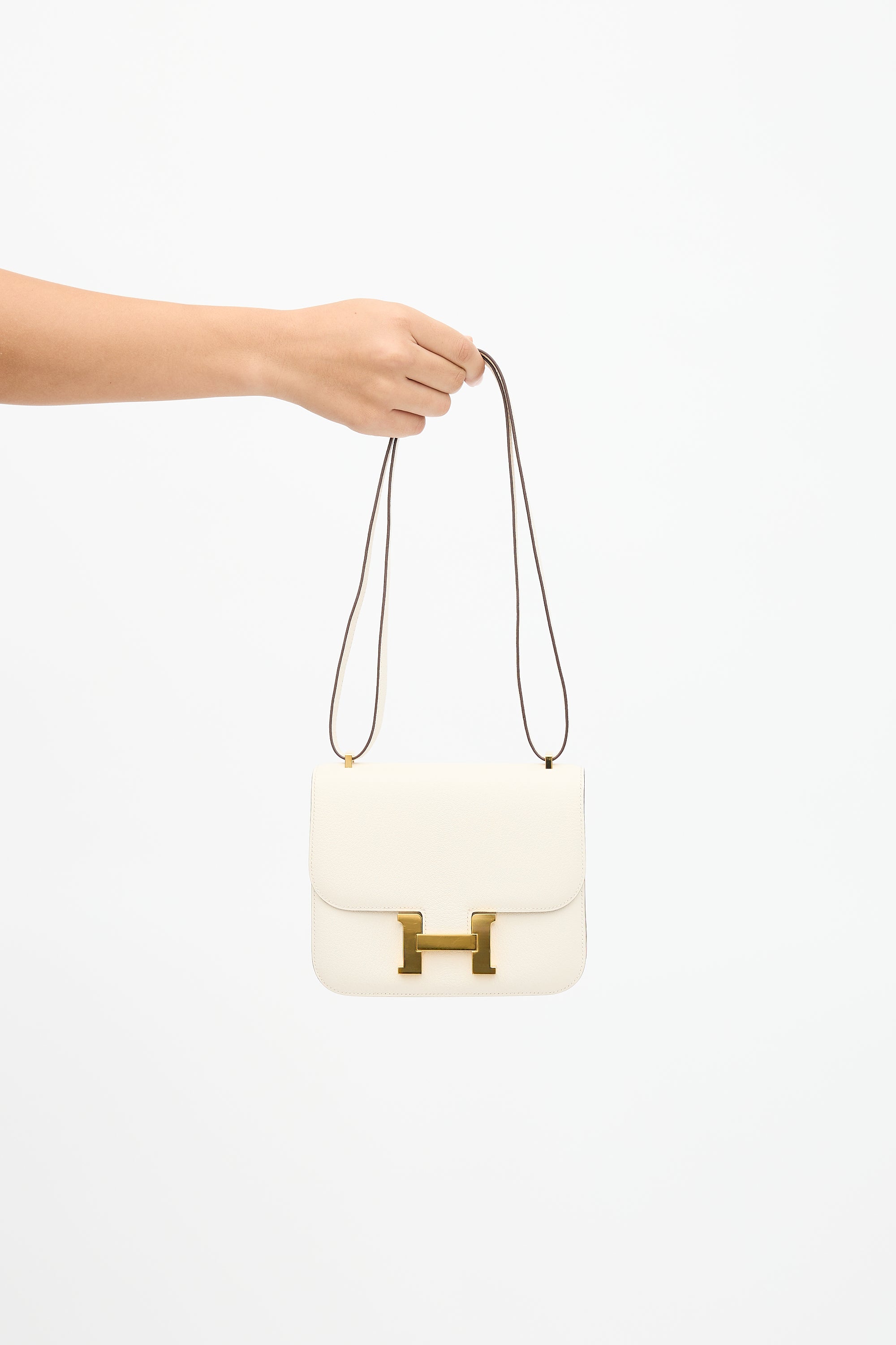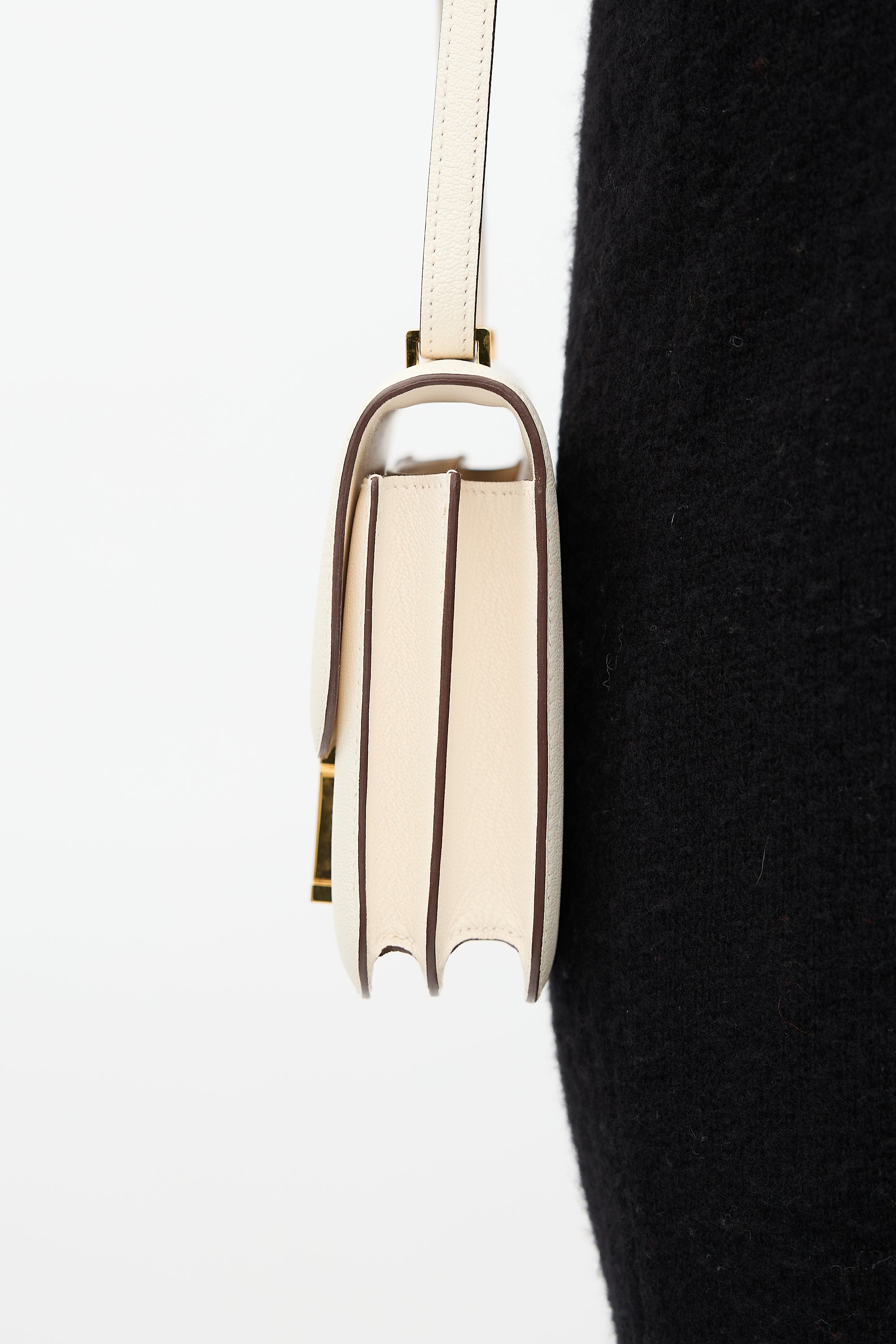 Pre-owned Hermès 2022 Constance III Mini bag in Nata Chevre Mysore leather featuring gold plated hardware, stamped logo under top flap, adjustable attached crossbody strap, H buckle closure at front, smooth lambskin lining, two main compartments, and two slip pockets inside. Includes original dust bag and box.