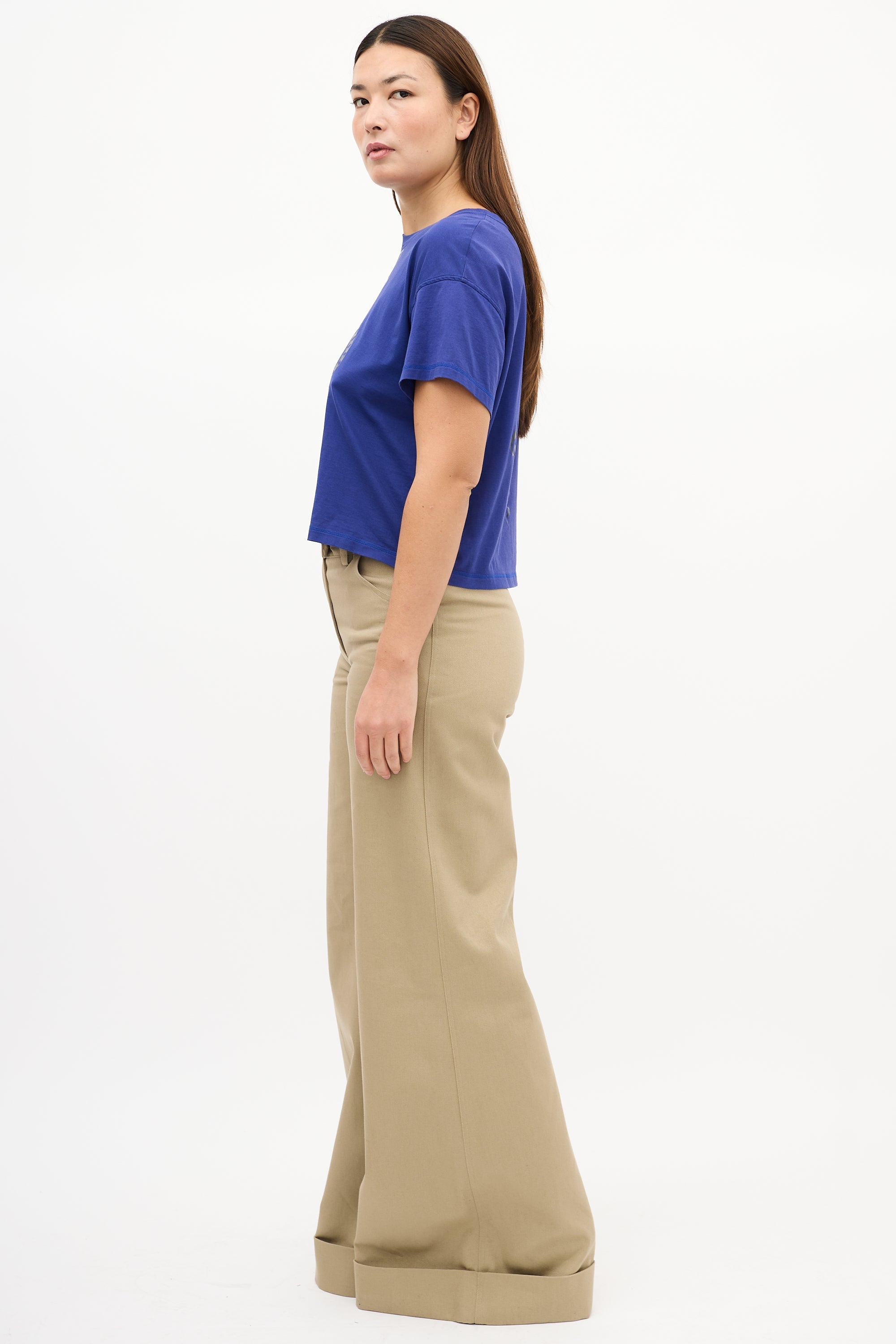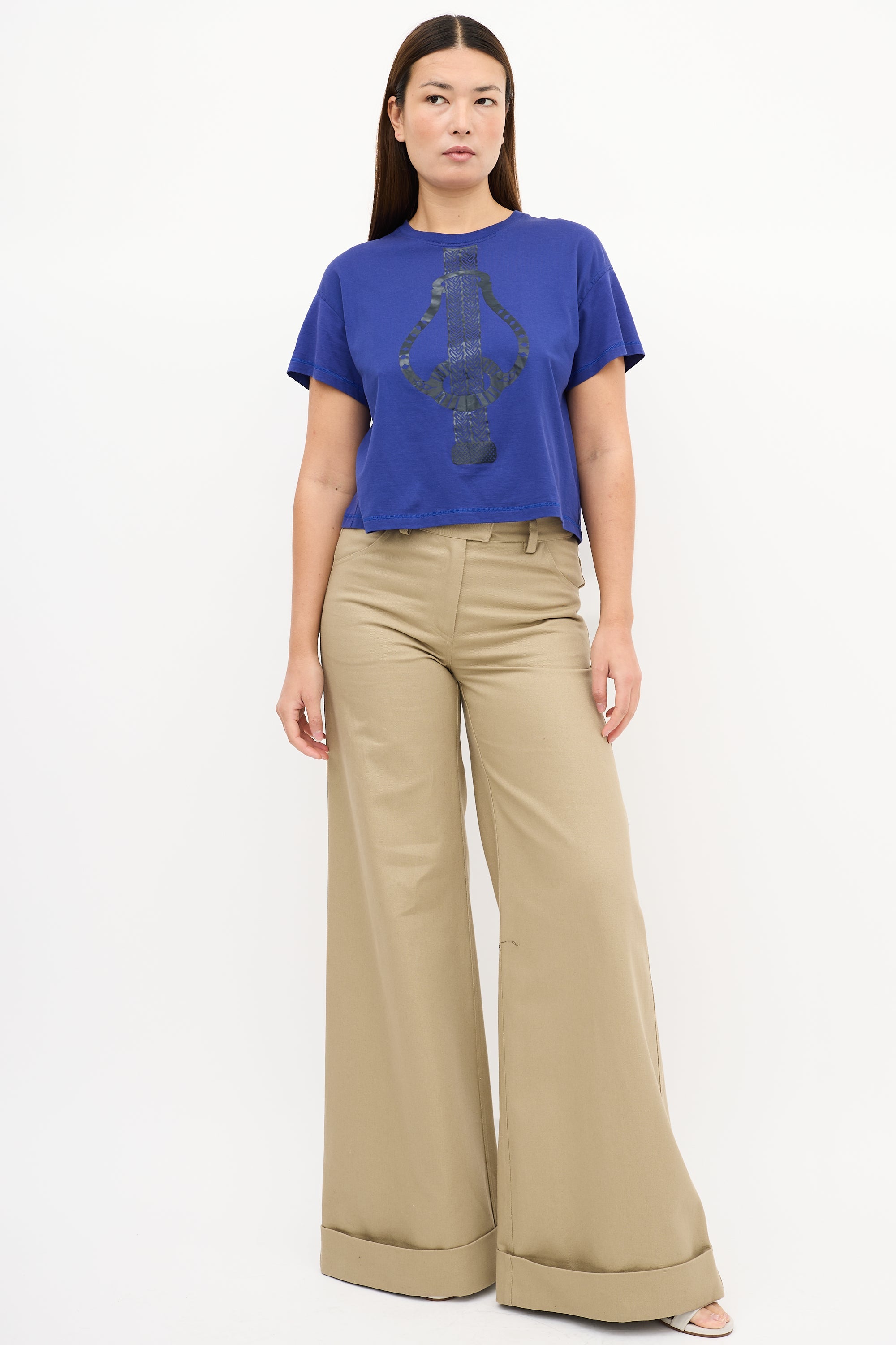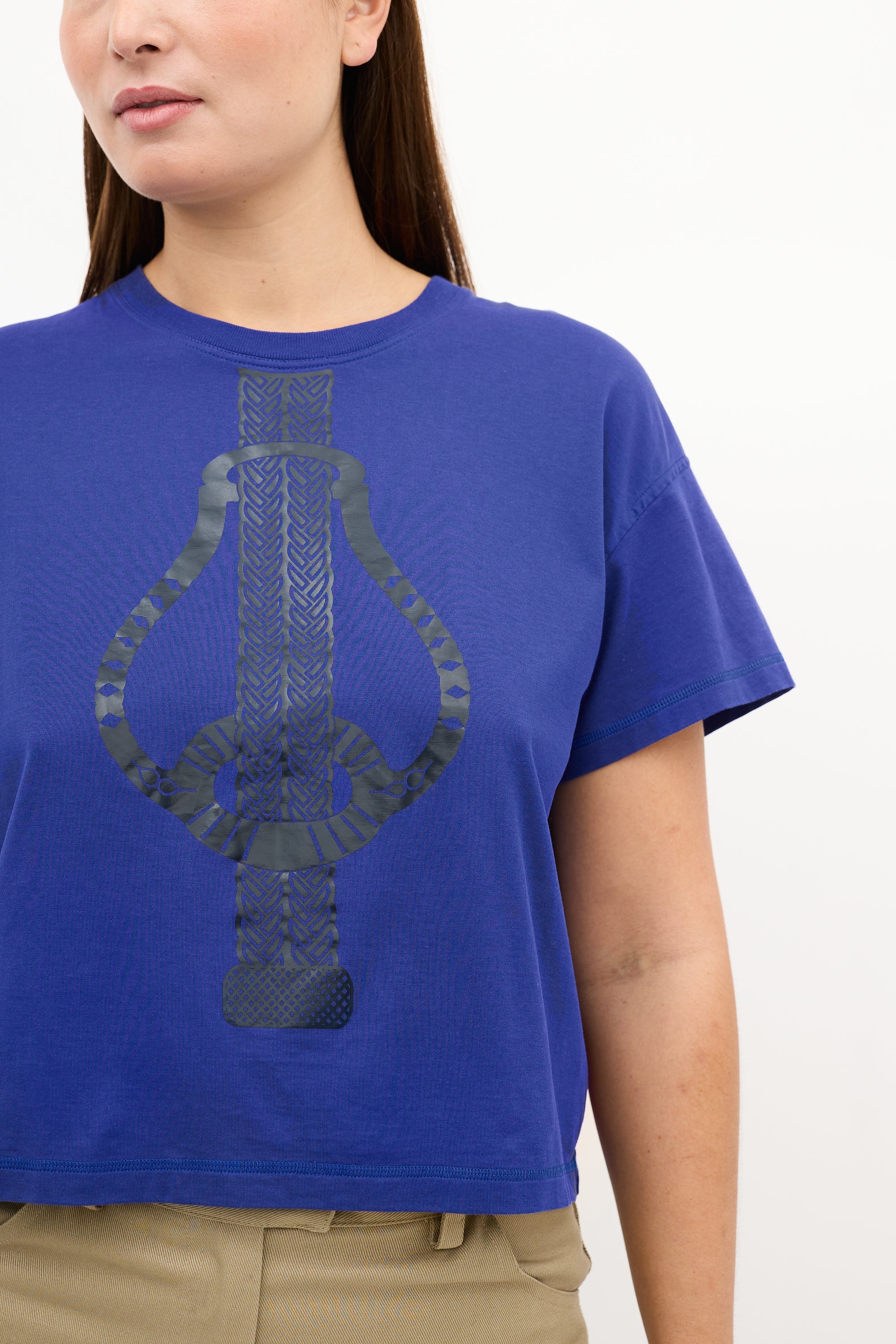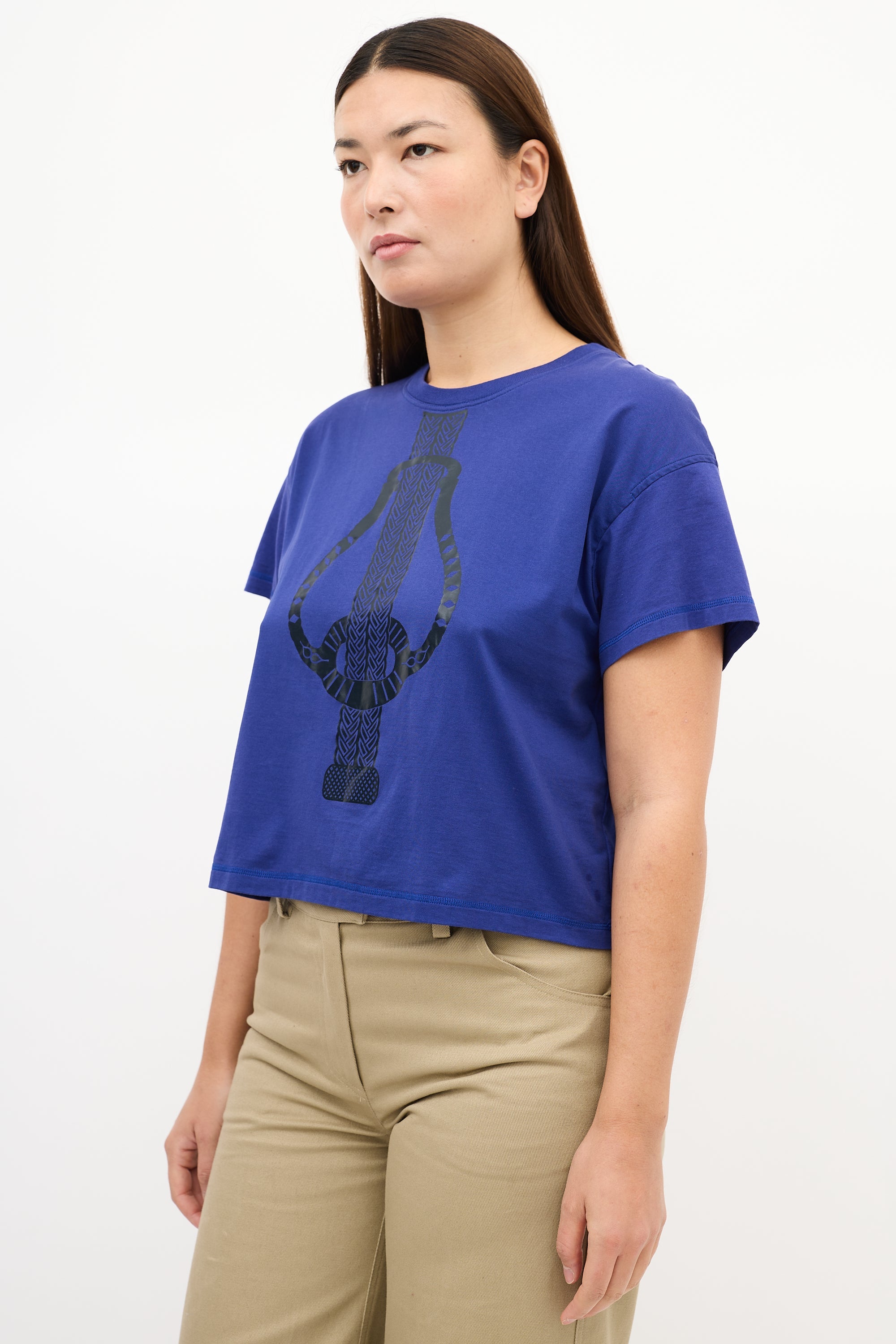 Pre-owned Hermès 2023 blue T-shirt featuring a round neckline, short sleeves, and black Fantaisie D'Etriers motif front graphic and back lettering.