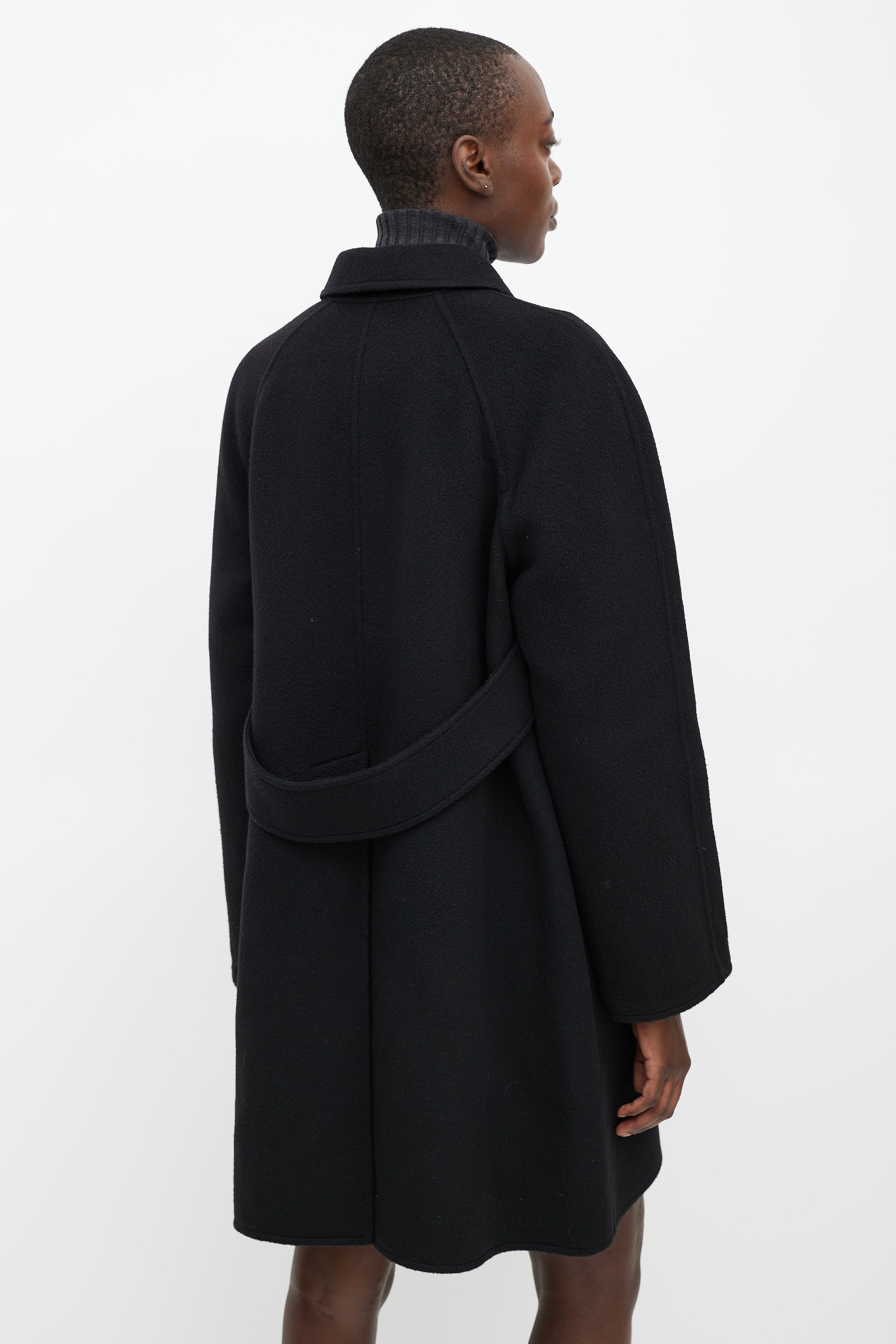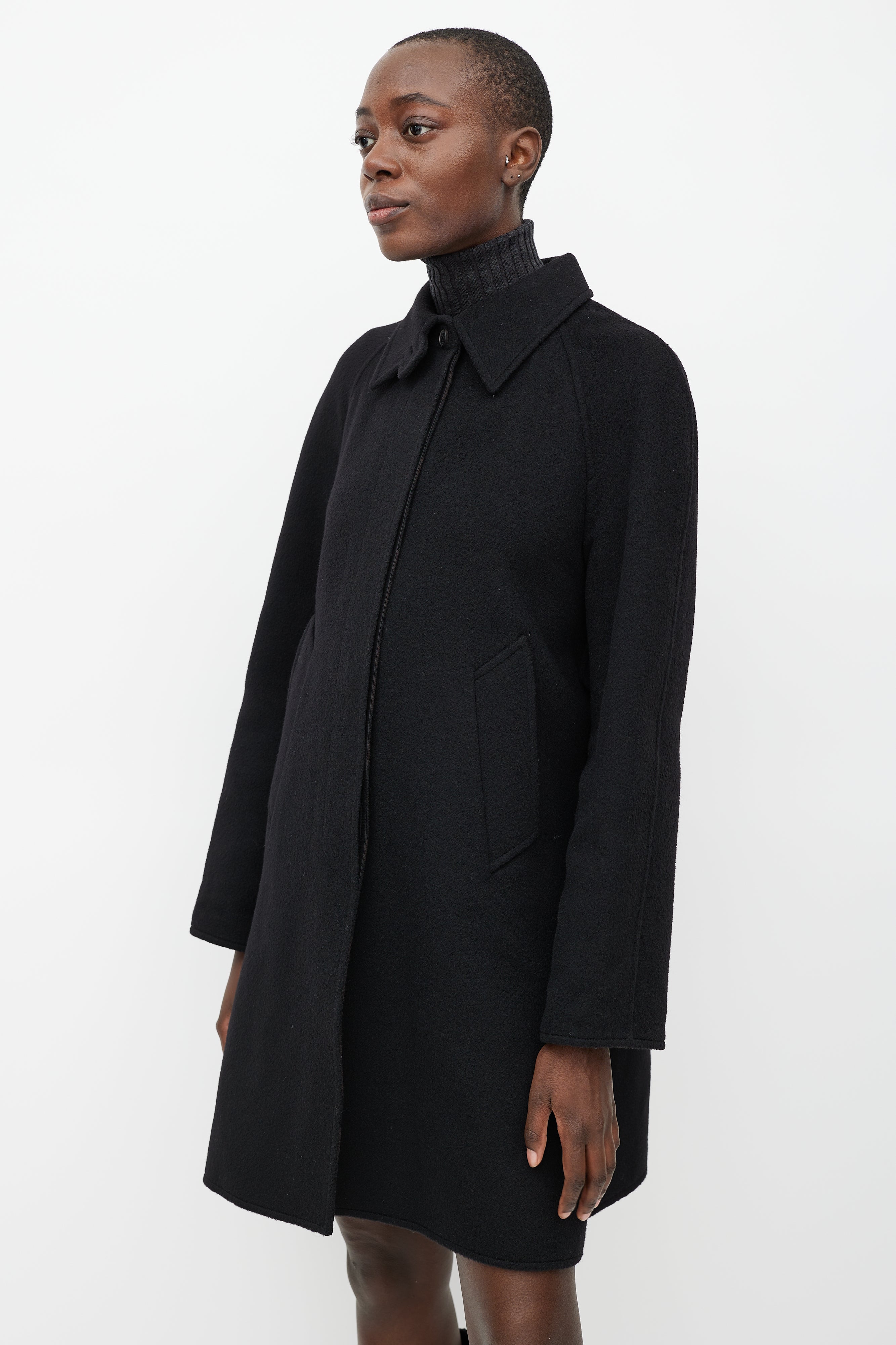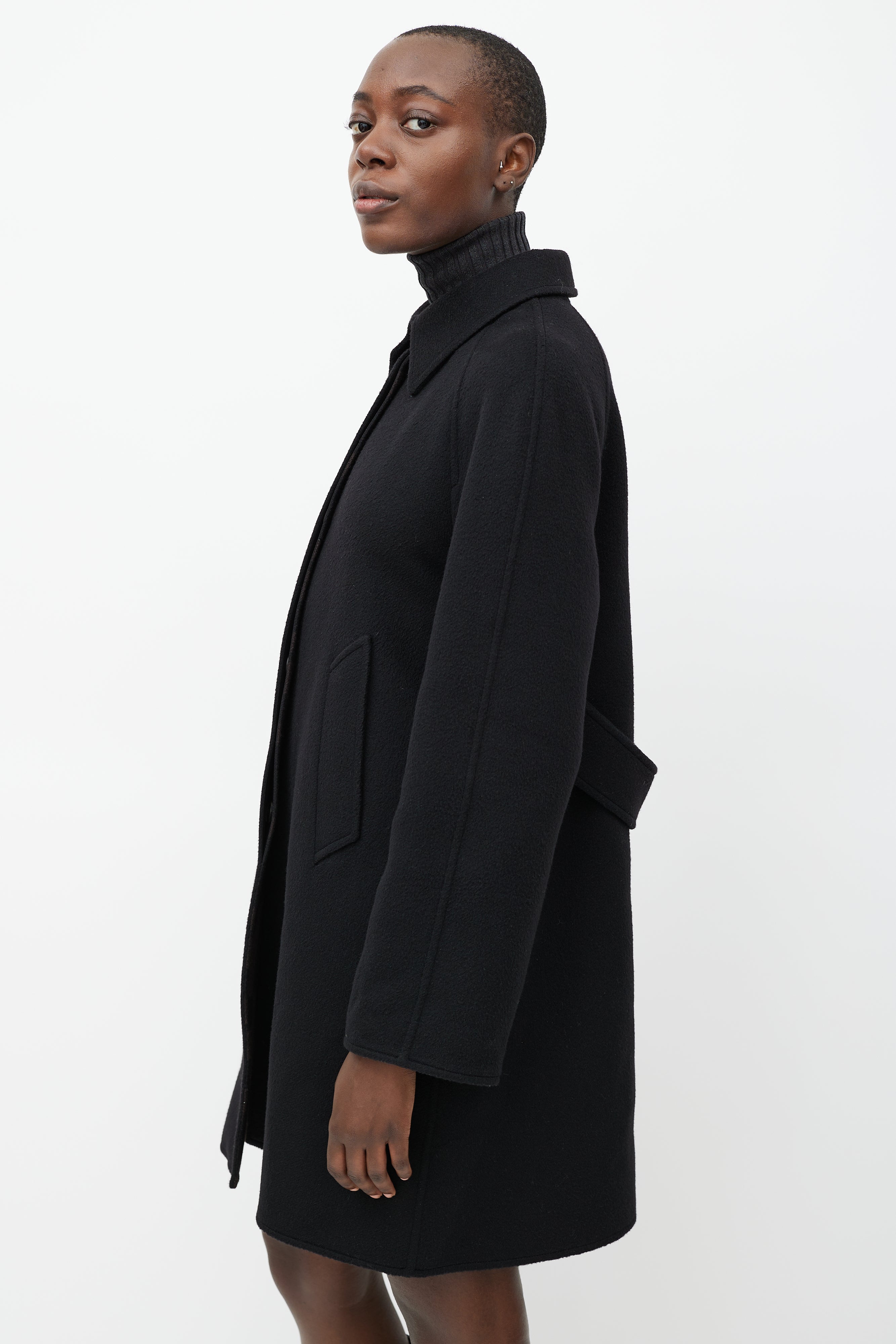 Pre-owned Hermès black Balmacaan coat featuring a pointed collar, two slip pockets at hip, belt detail at back, slit at hem, and concealed button up closure. Lined.