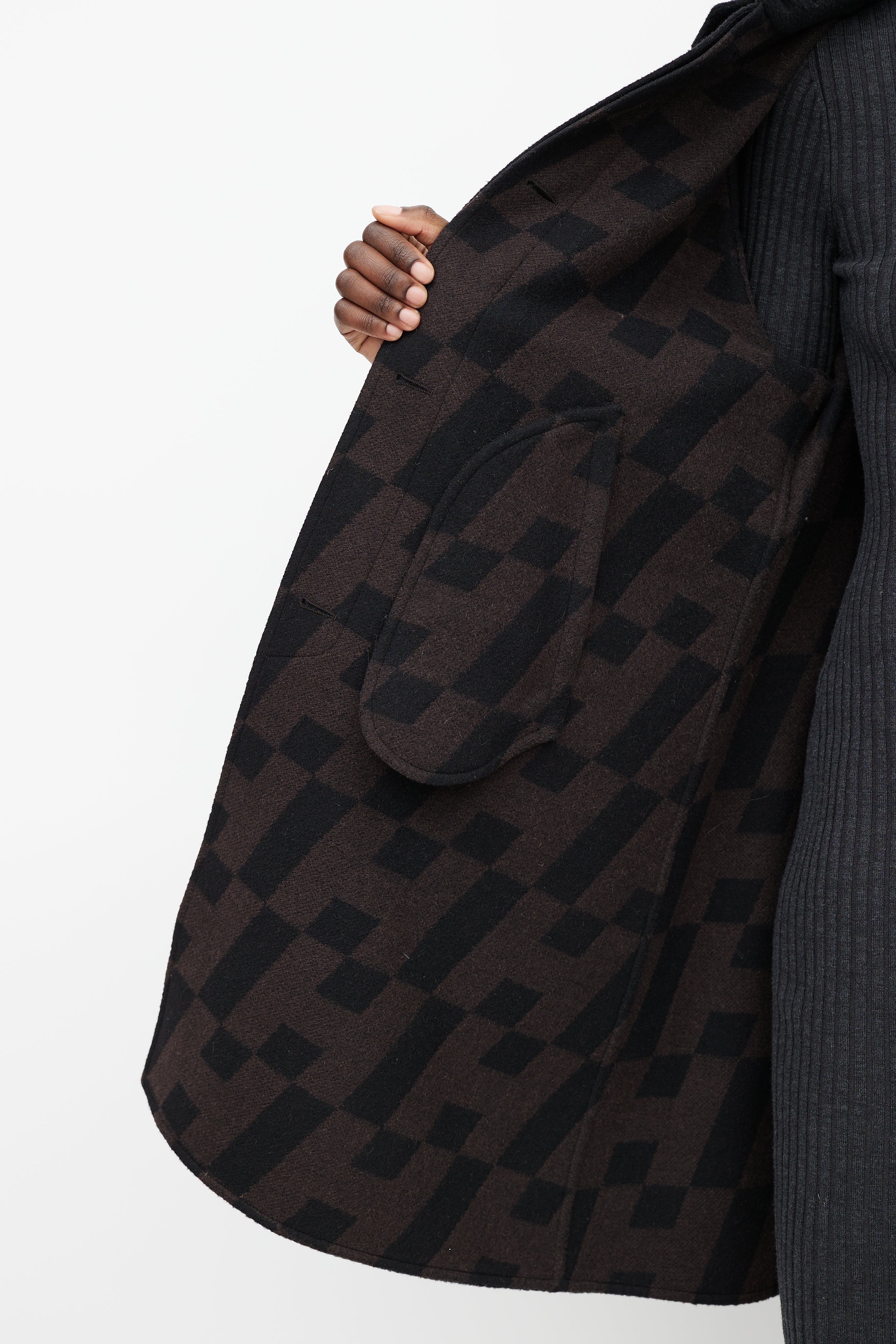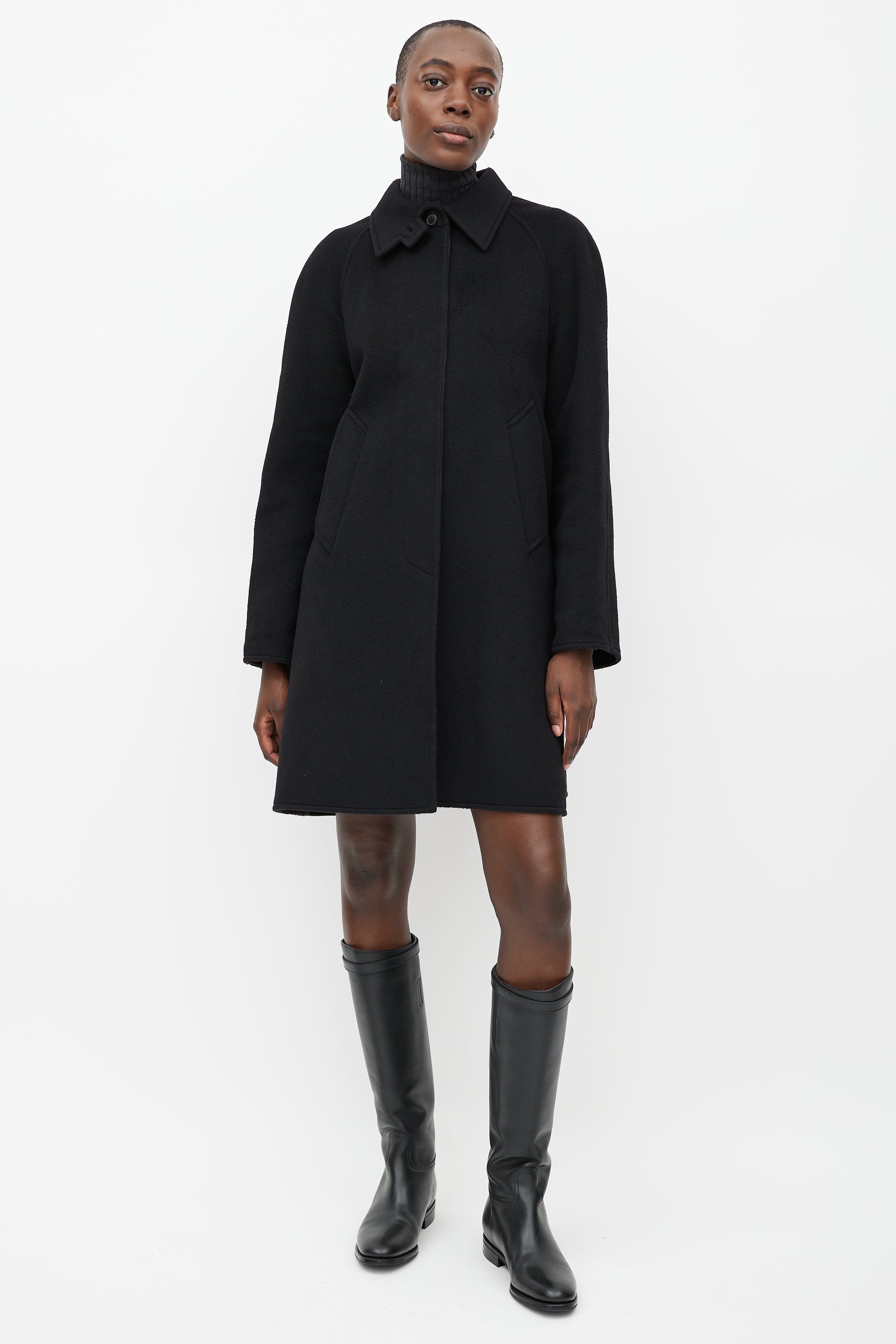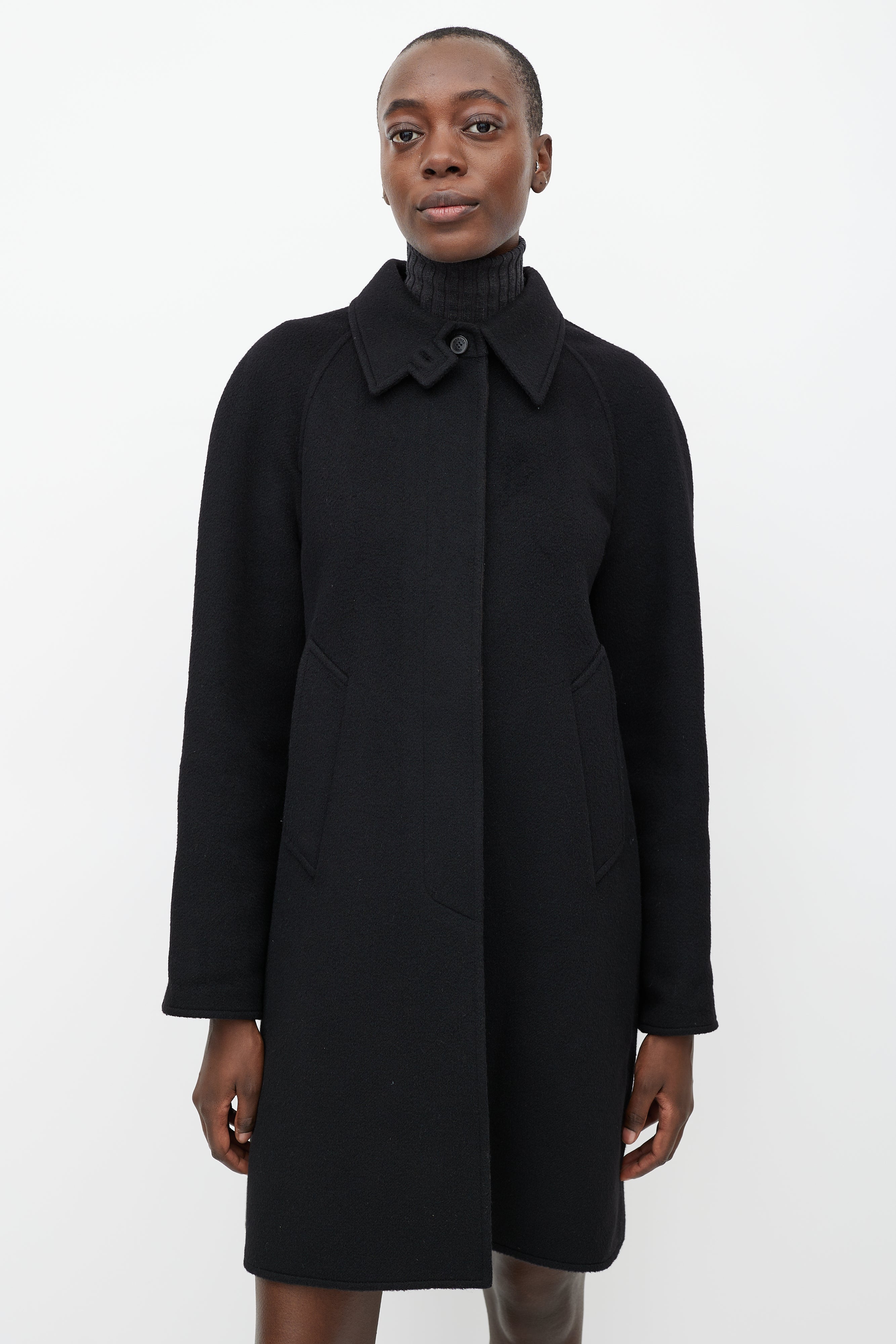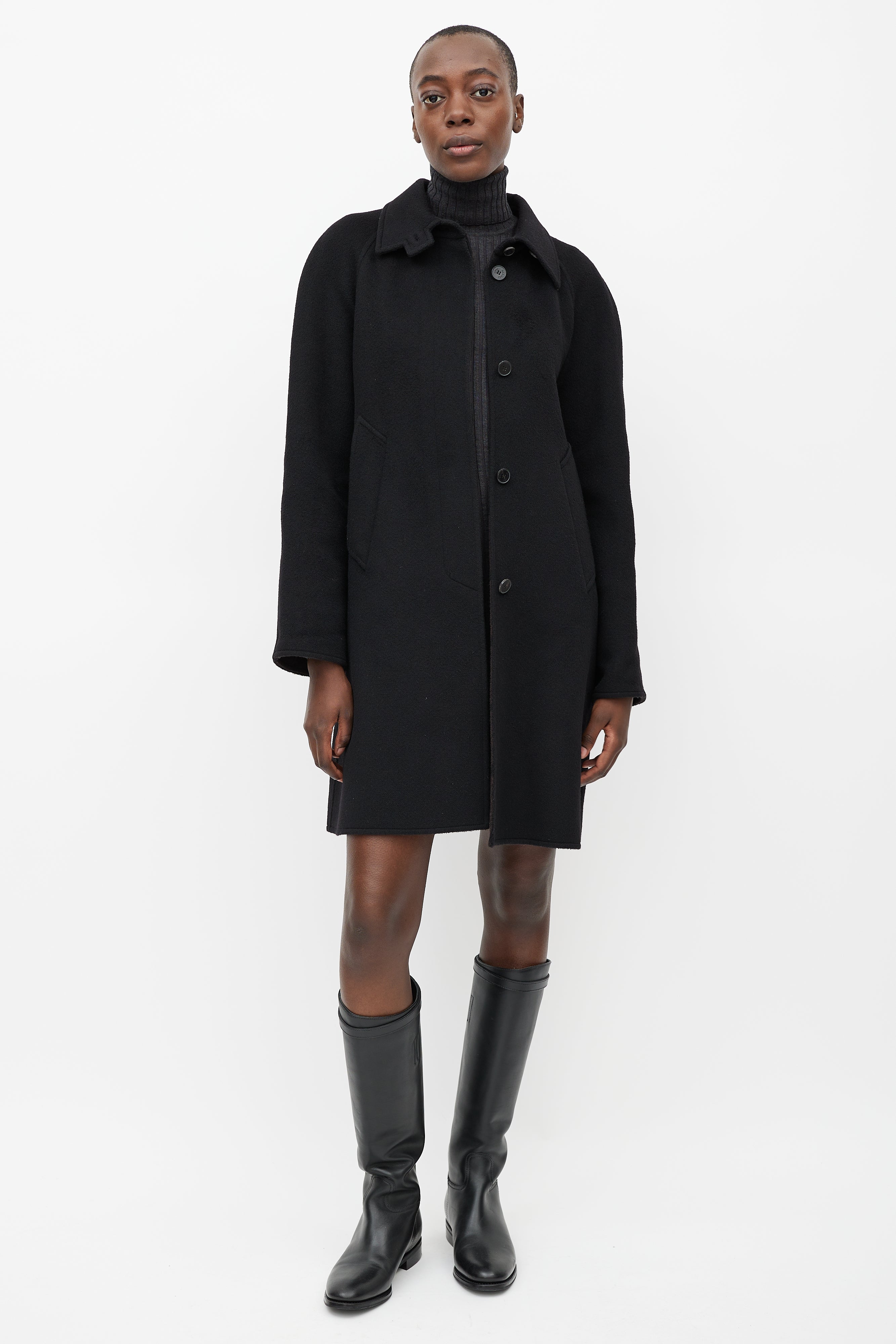 Pre-owned Hermès black Balmacaan coat featuring a pointed collar, two slip pockets at hip, belt detail at back, slit at hem, and concealed button up closure. Lined.