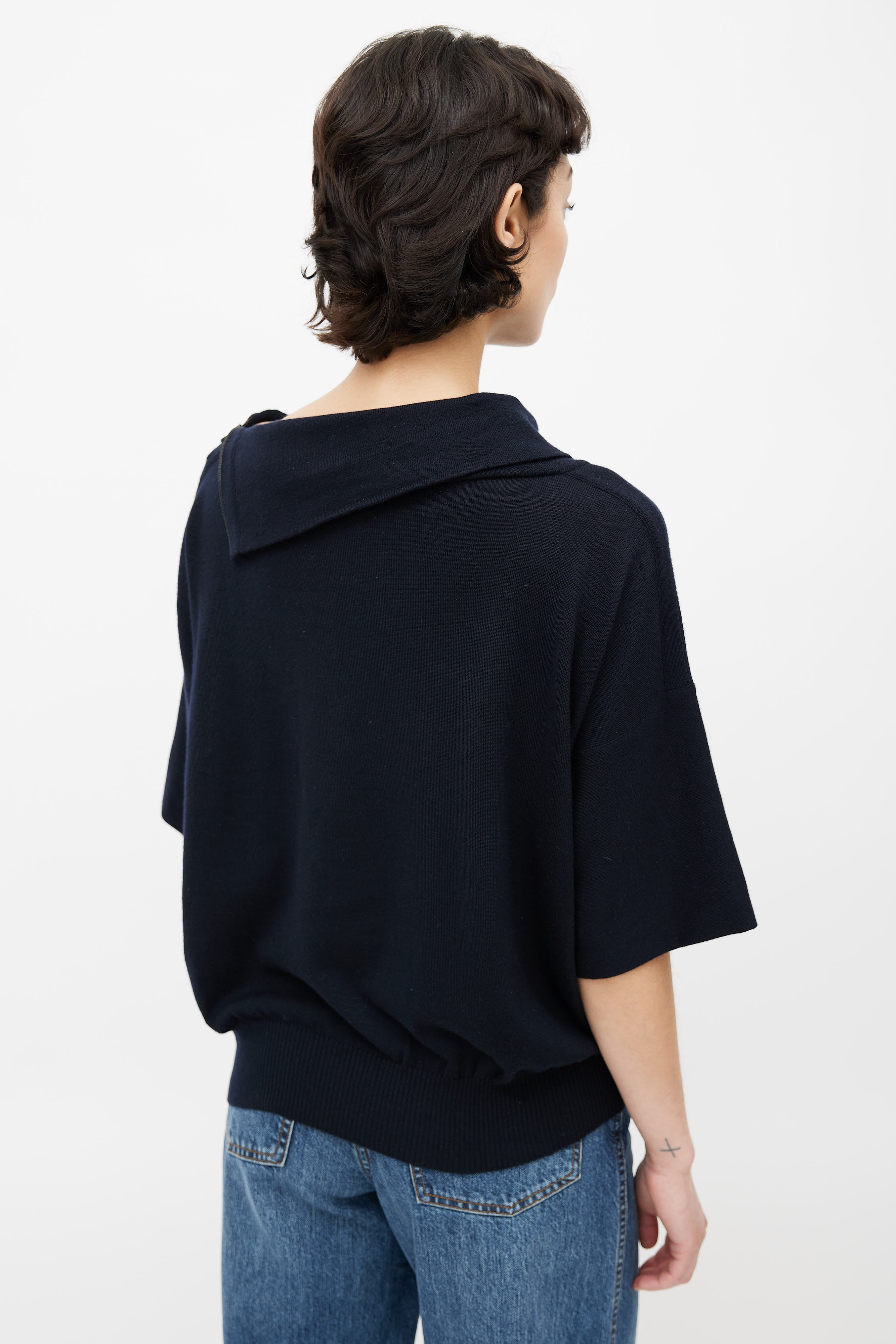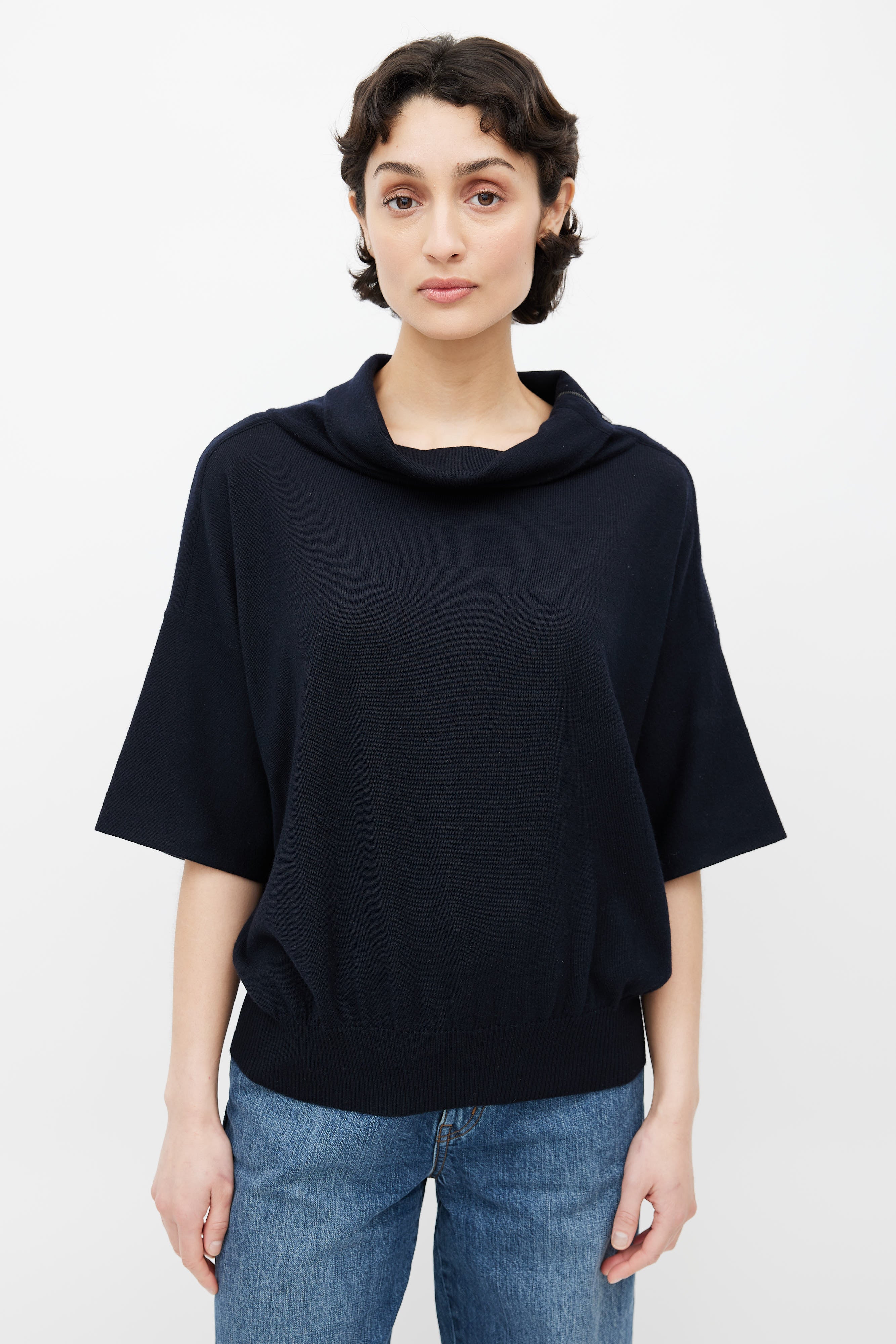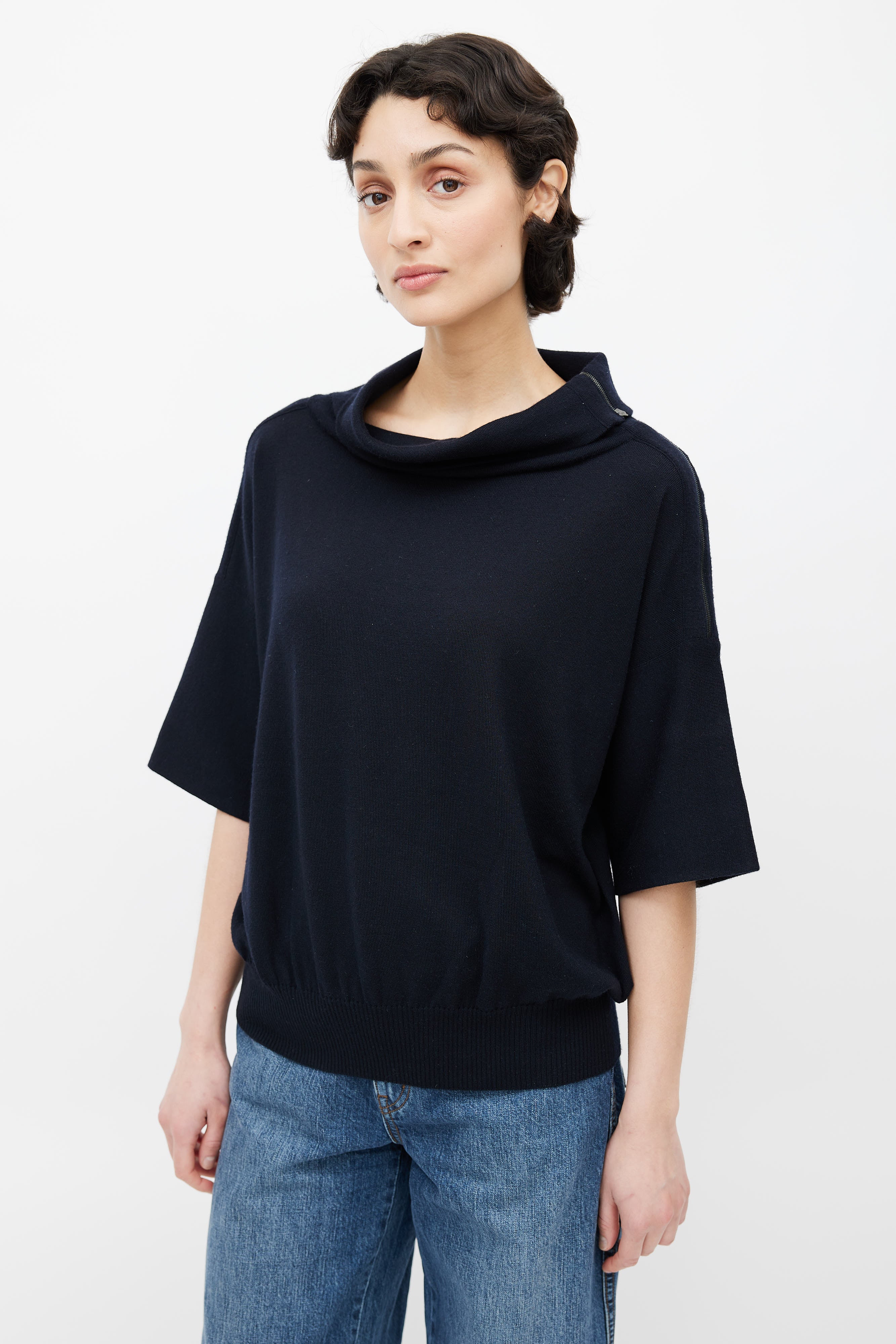 Pre-owned Hermès black short sleeve sweater featuring zip at shoulder, cowl neck, and ribbed hem.