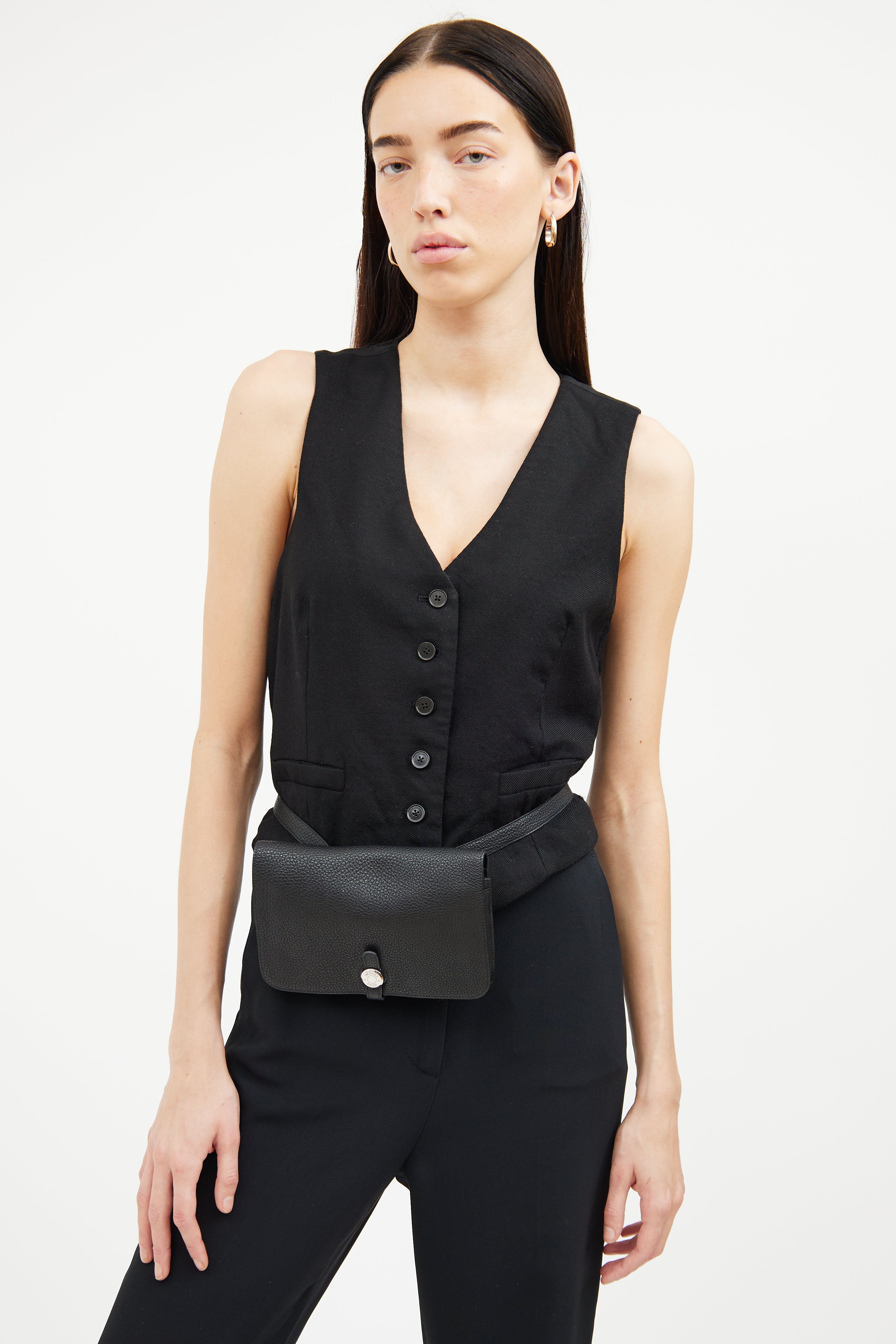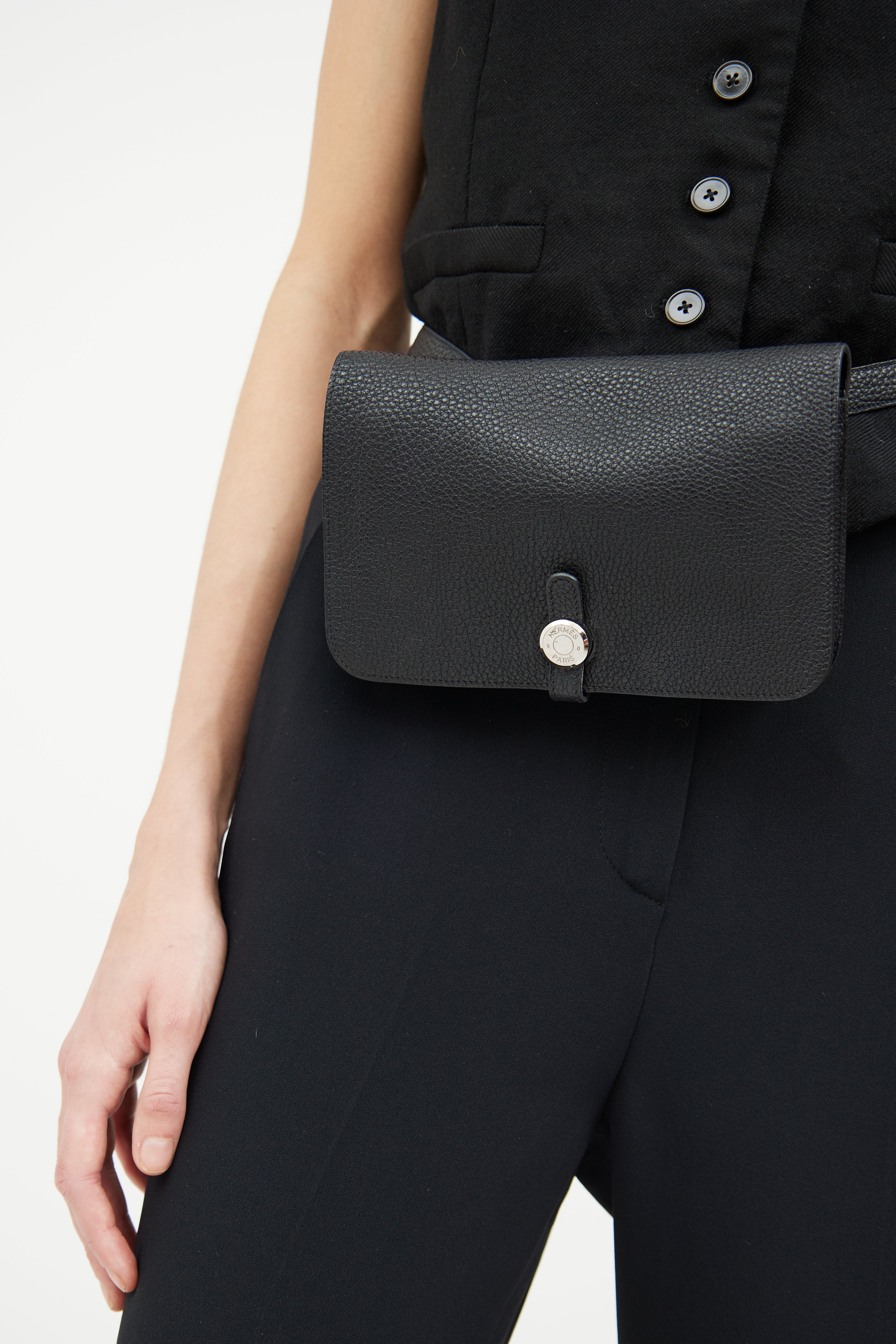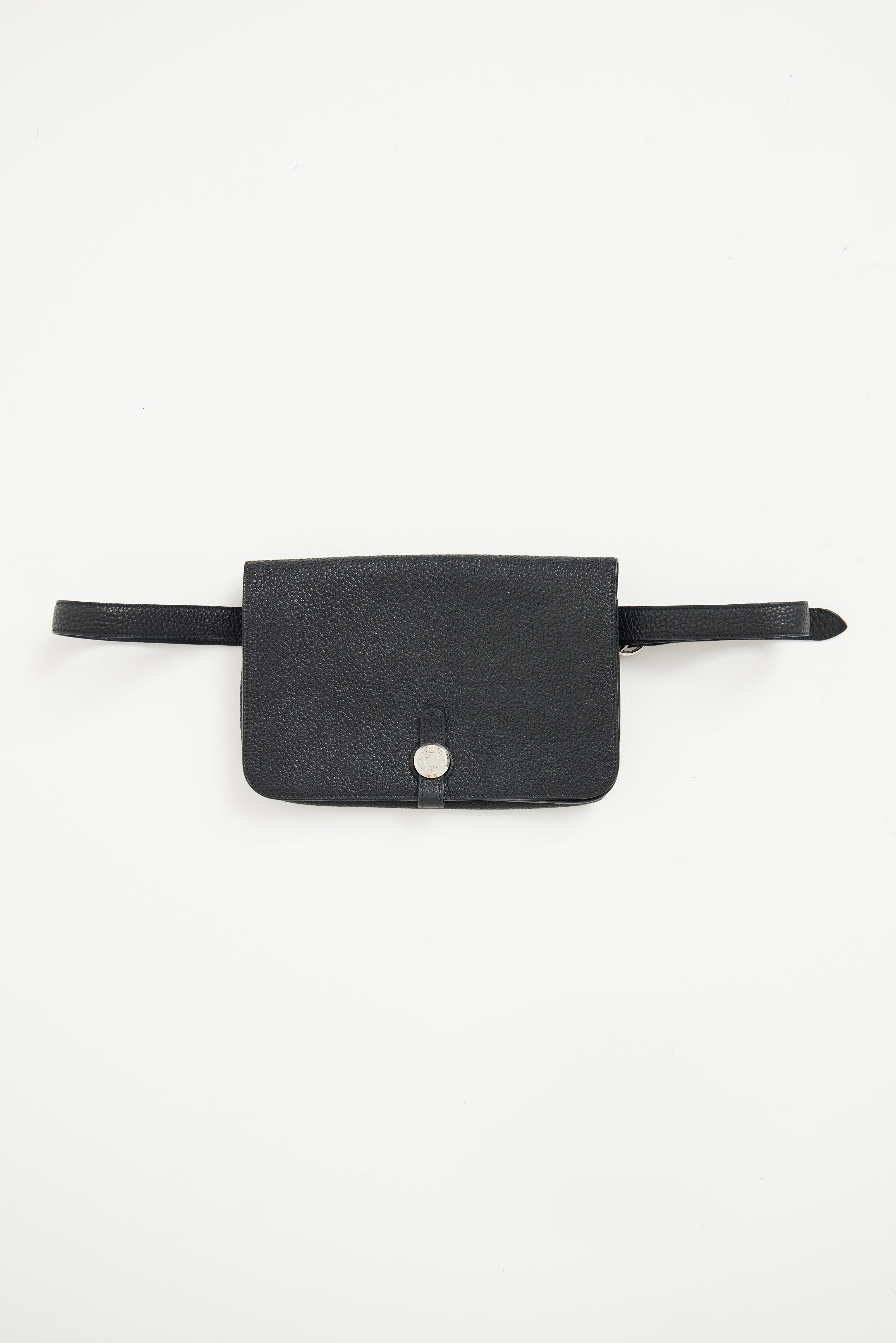 Pre-owned Hermès black Dugon Duo 2002 belt bag featuring pebbled Togo leather, adjustable waist strap, silver tone hardware, rolled edge trim, logo text stamped button on front flap, front flap with strap and button closure. Main compartment, single slip pocket and two card slots.