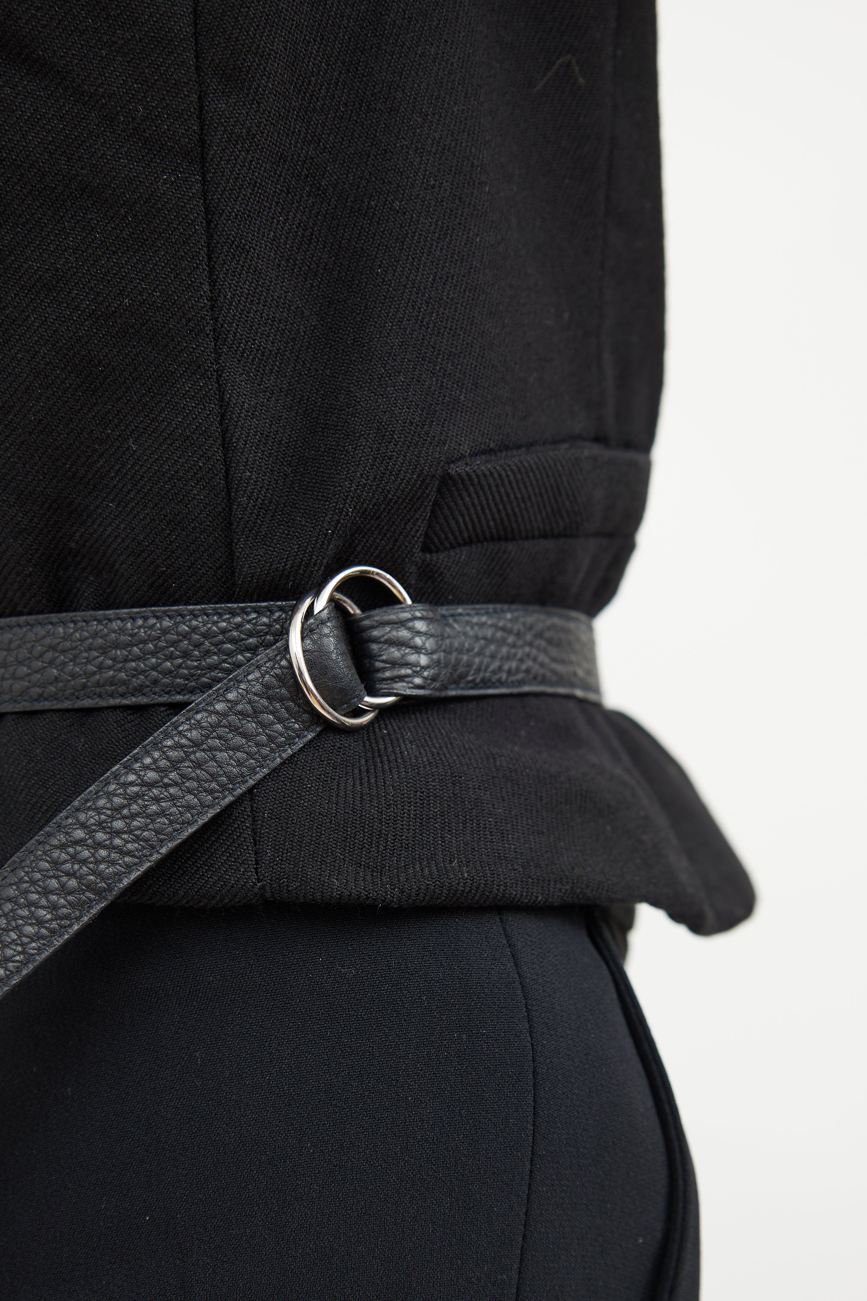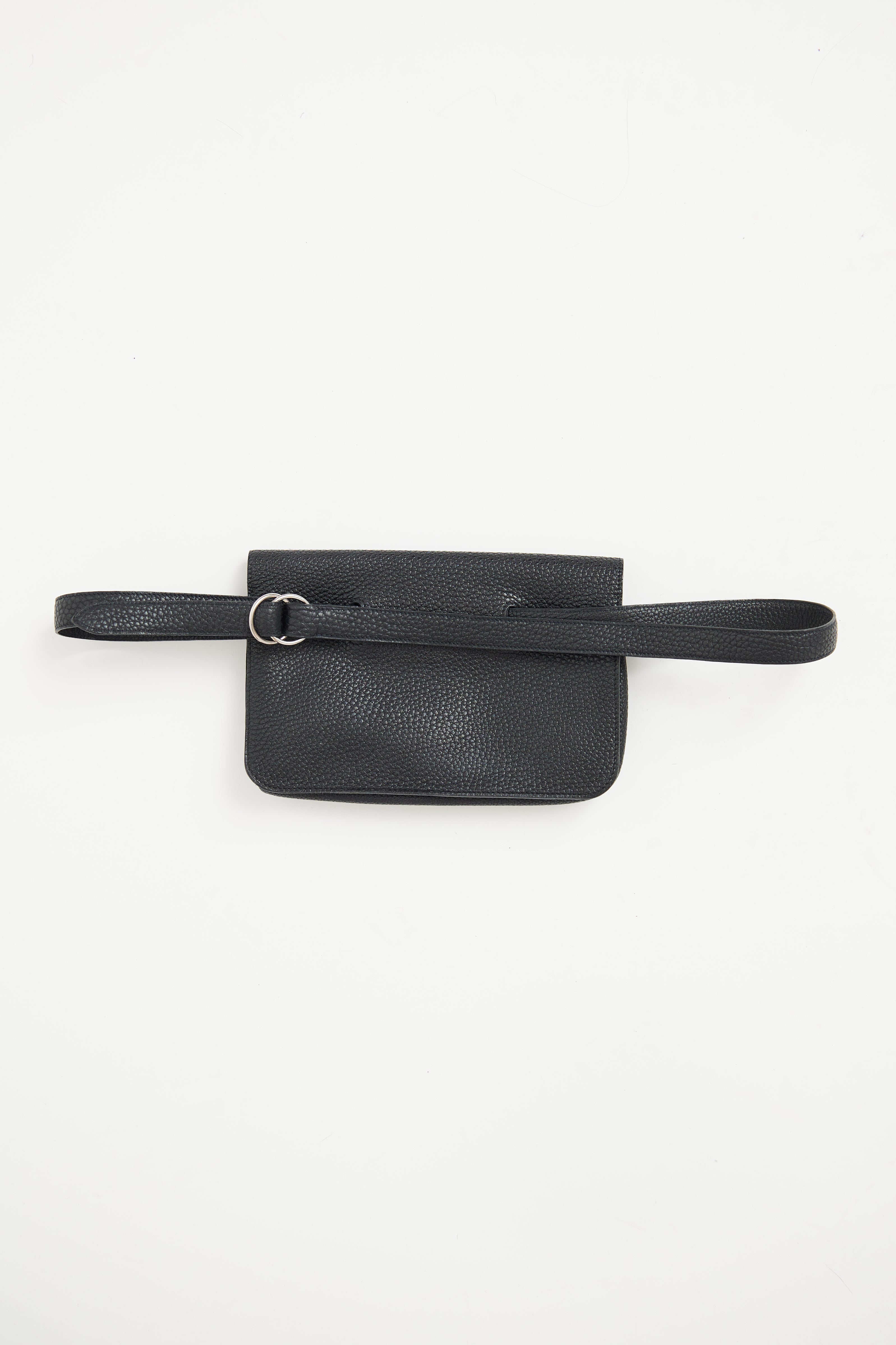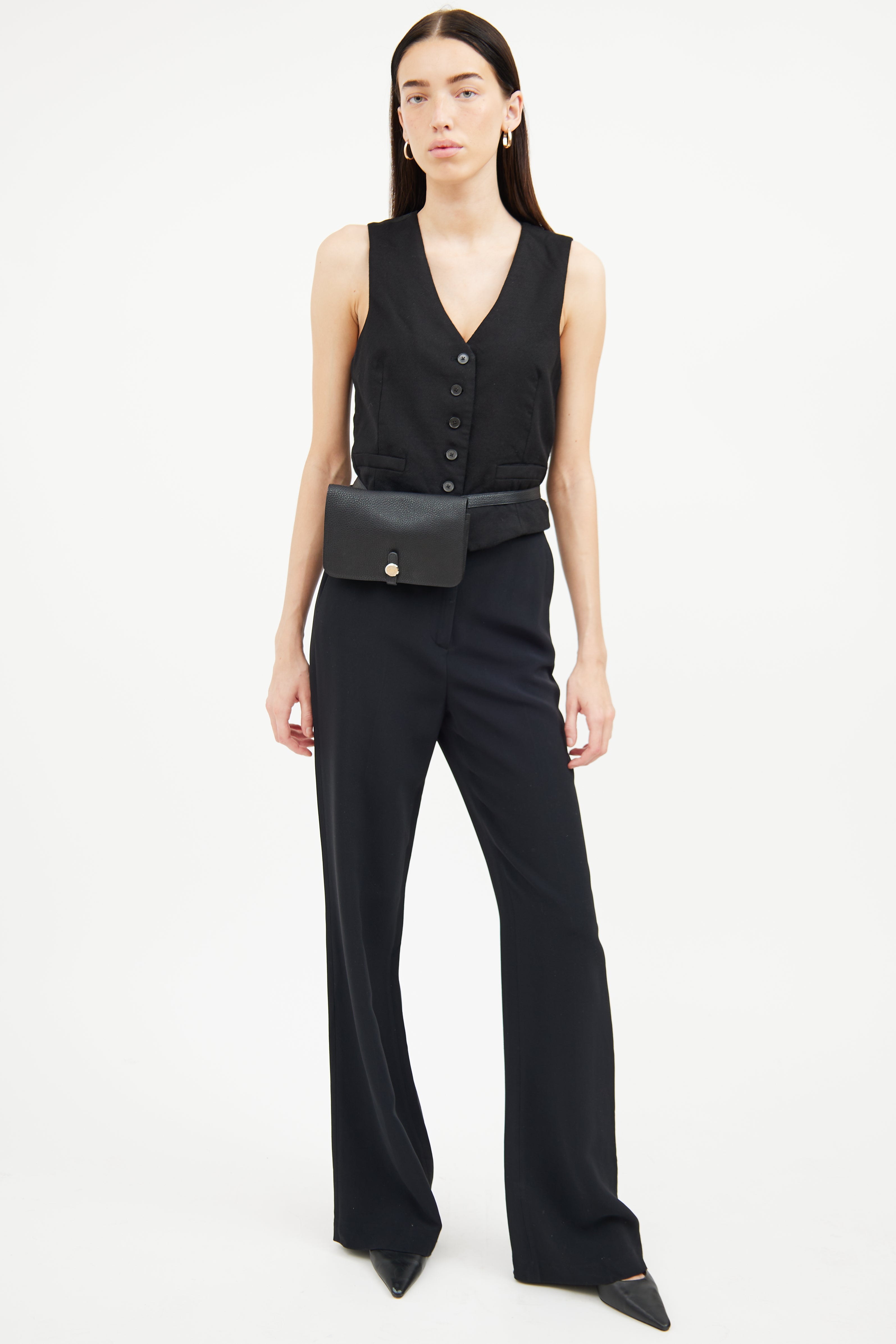 Pre-owned Hermès black Dugon Duo 2002 belt bag featuring pebbled Togo leather, adjustable waist strap, silver tone hardware, rolled edge trim, logo text stamped button on front flap, front flap with strap and button closure. Main compartment, single slip pocket and two card slots.
