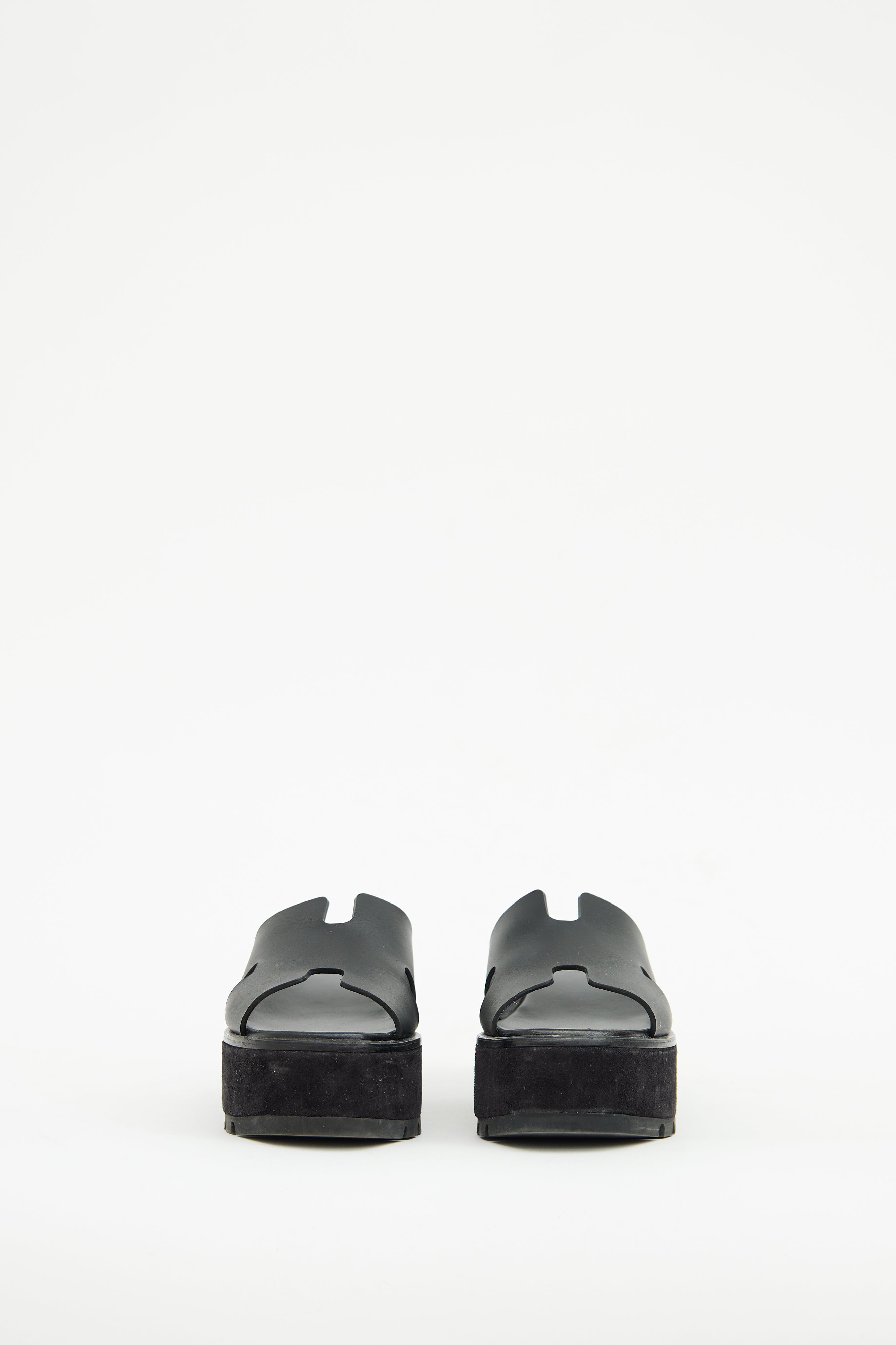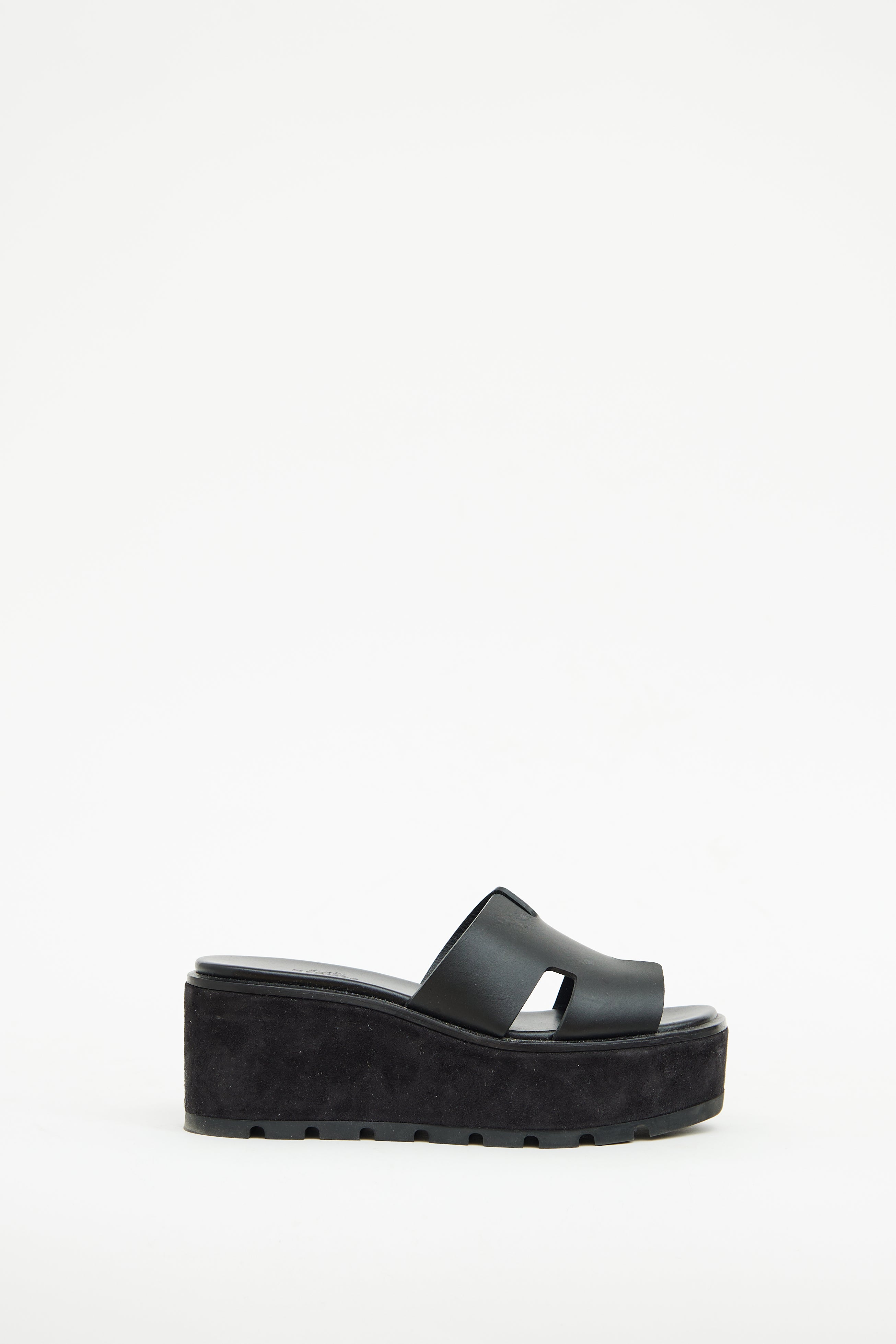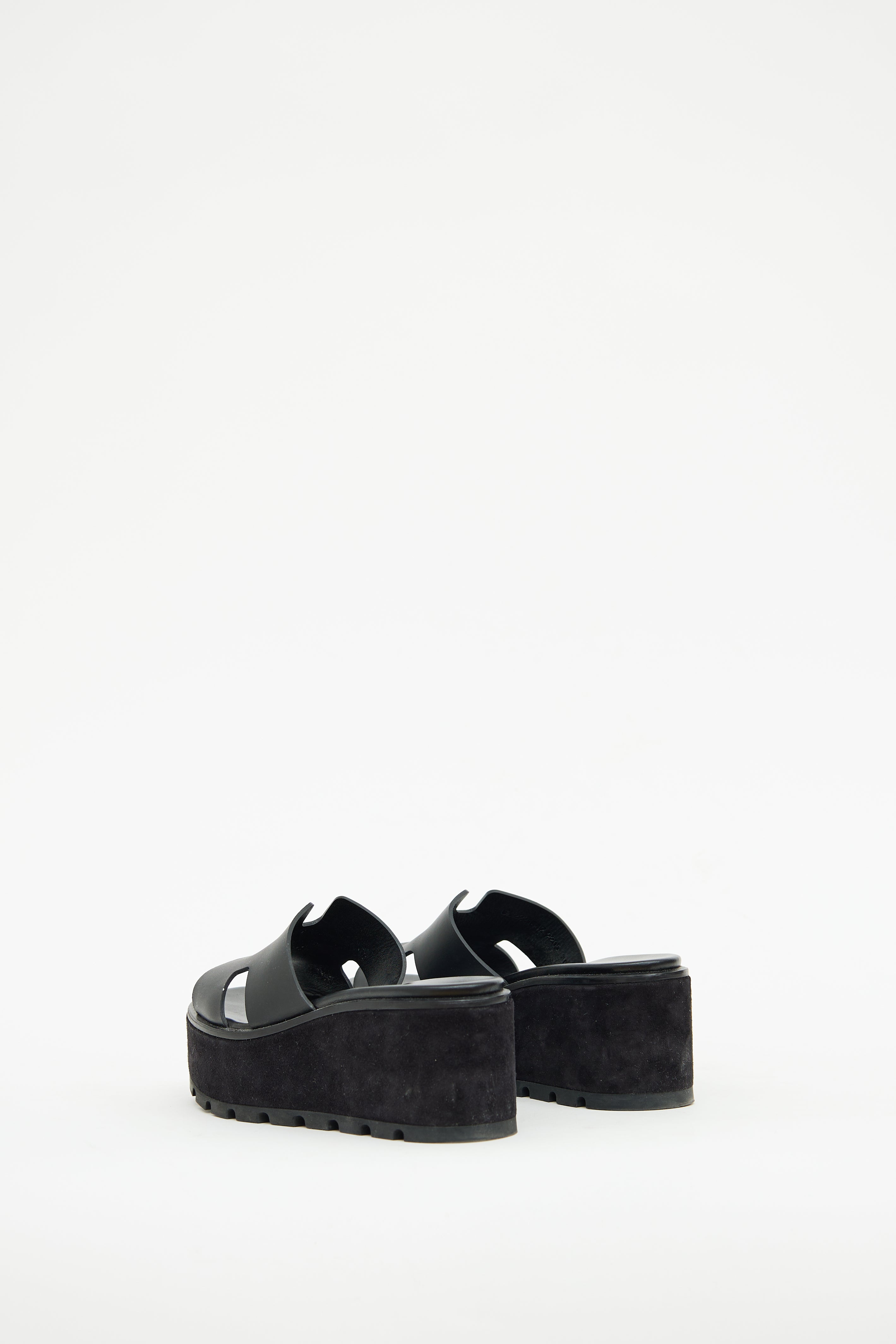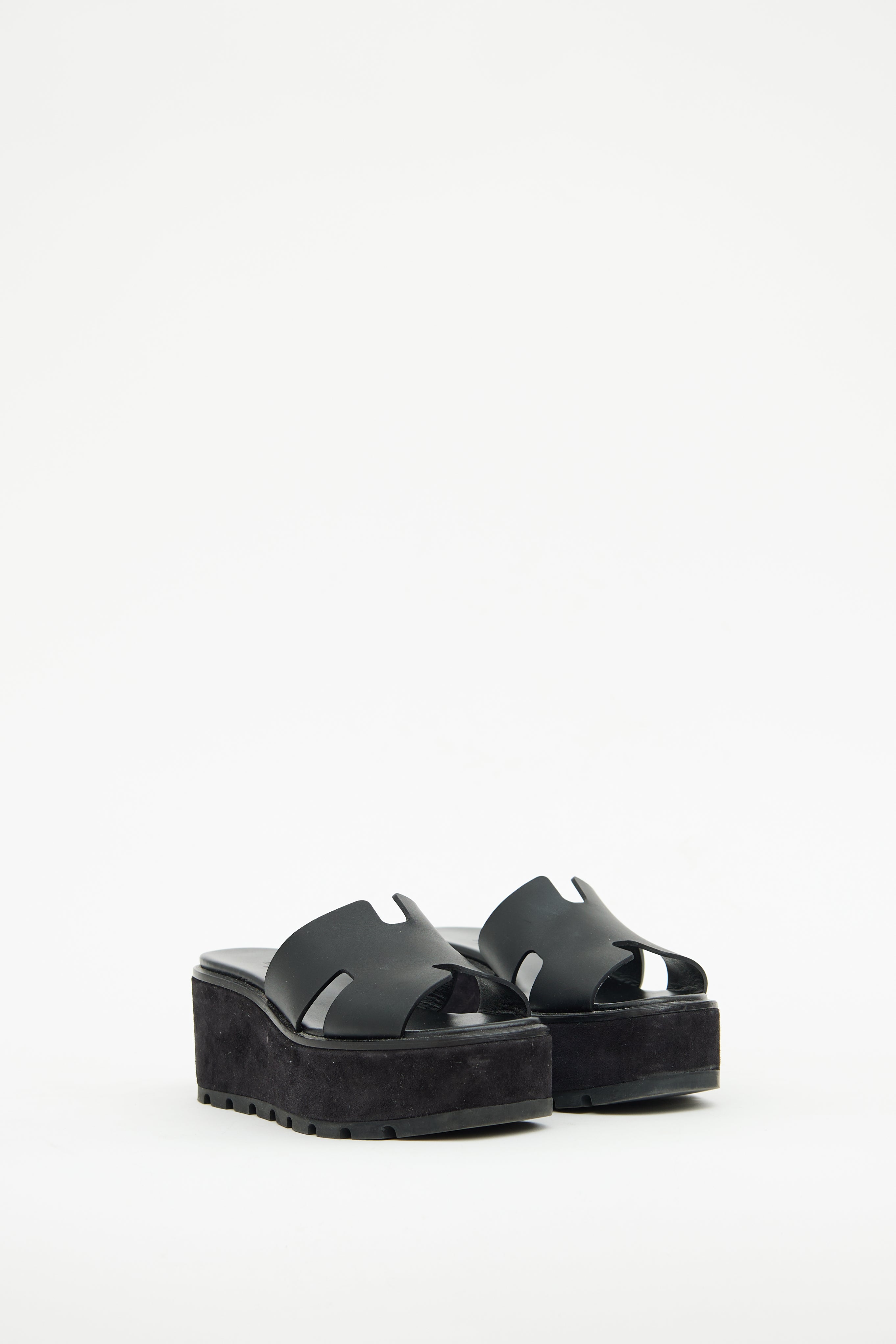 Pre-owned Hermès black Eze sandal featuring slip on entry, suede covered platform midsoles, leather 'H' cut out at vamp, and treaded rubber soles.