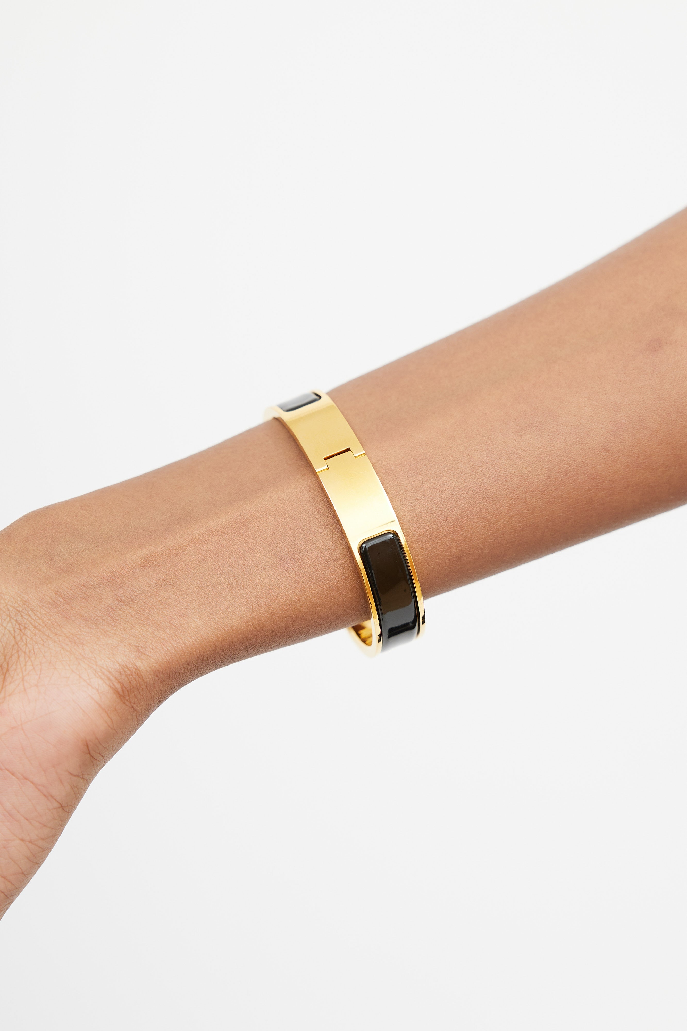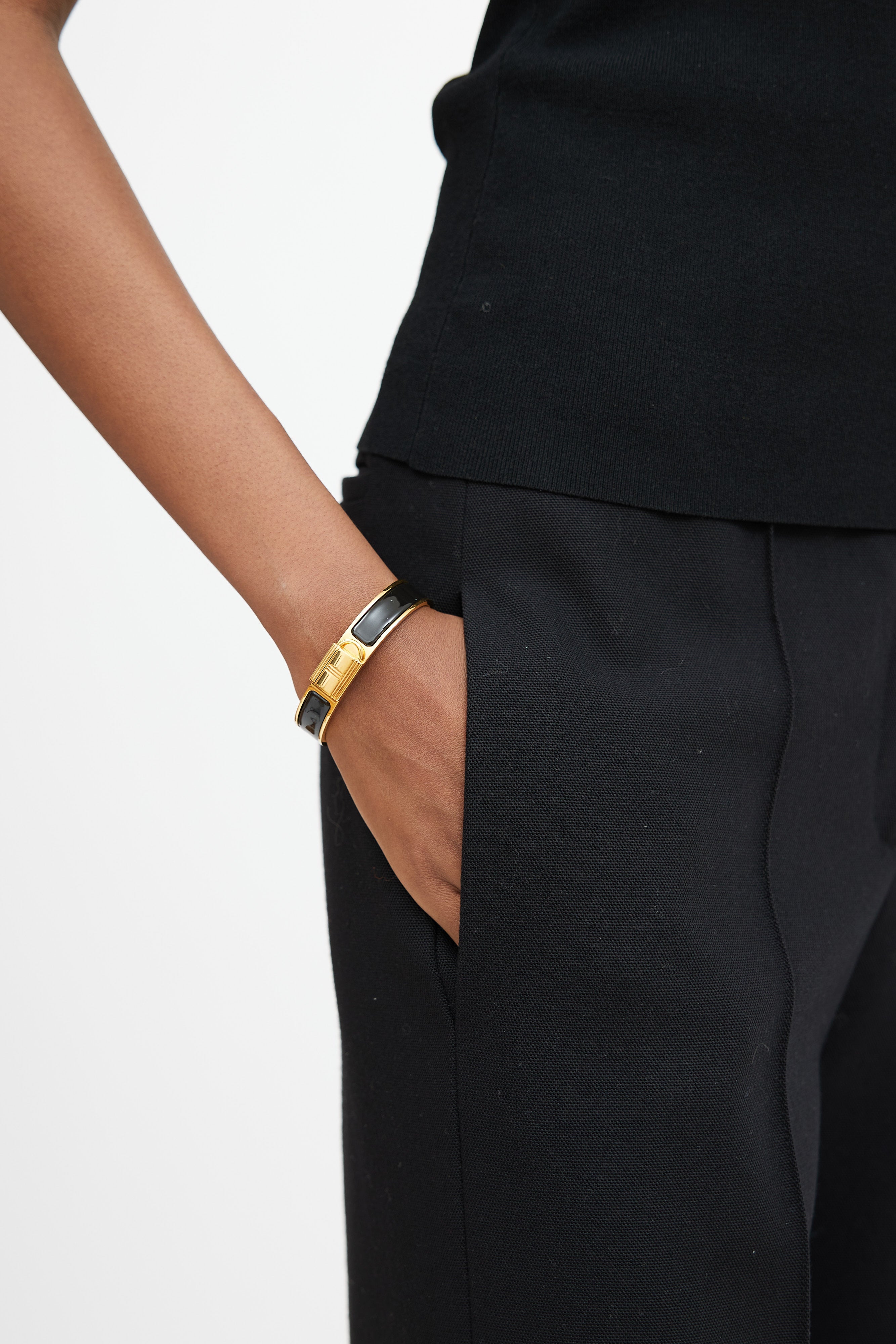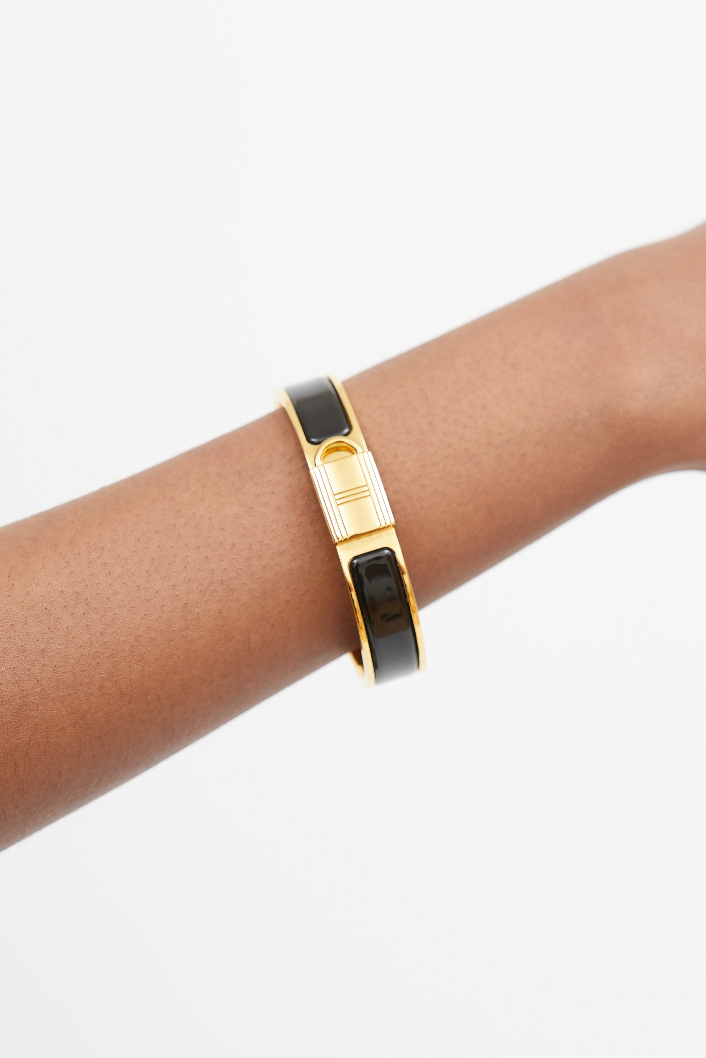 Pre-owned Hermès Clic Cadenas bracelet featuring black enamel middle panel, gold tone rim, gold tone lock shaped twist closure, and inner "HERMÈS" stamp. Comes with original pouch.