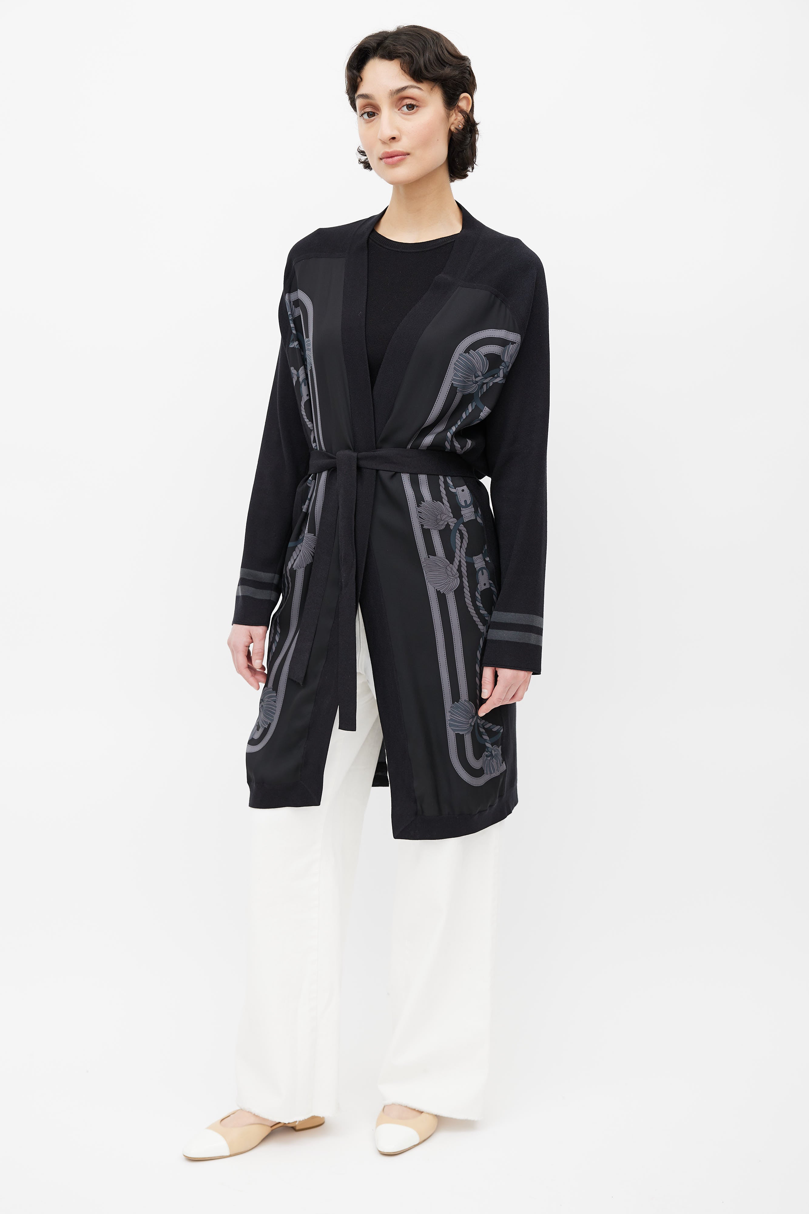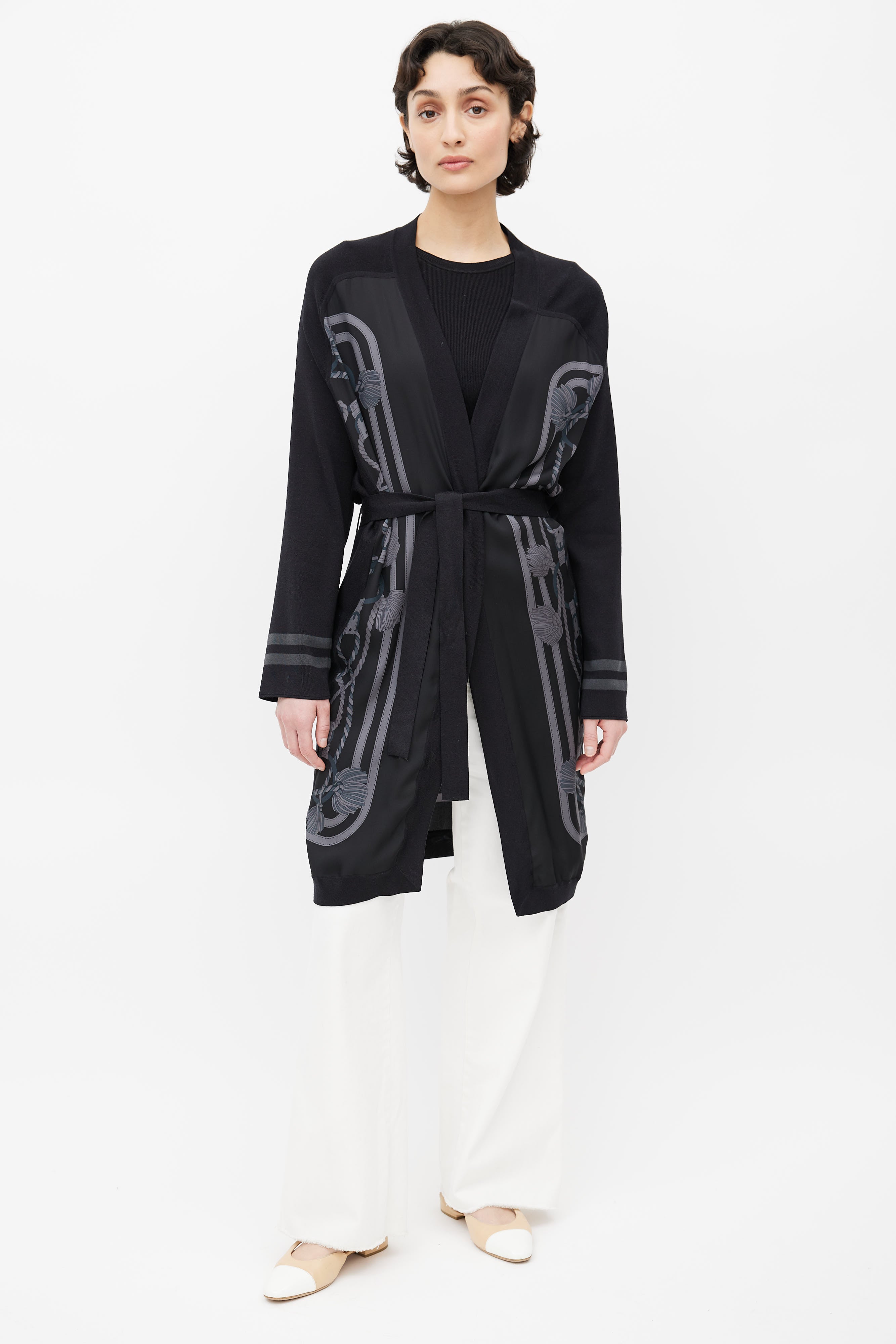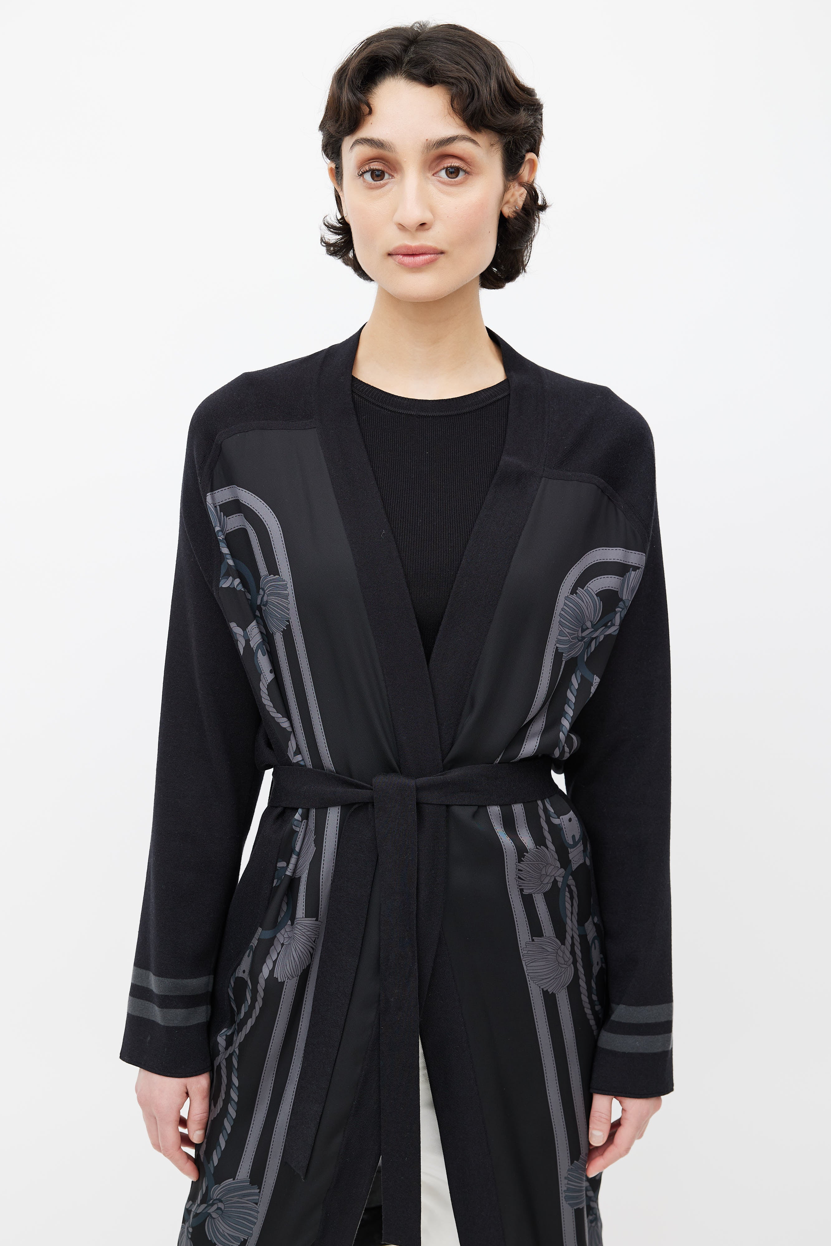 Pre-owned Hermès black cardigan featuring open front, black and grey rope motif print, grey stripes at cuffs, and waist belt.