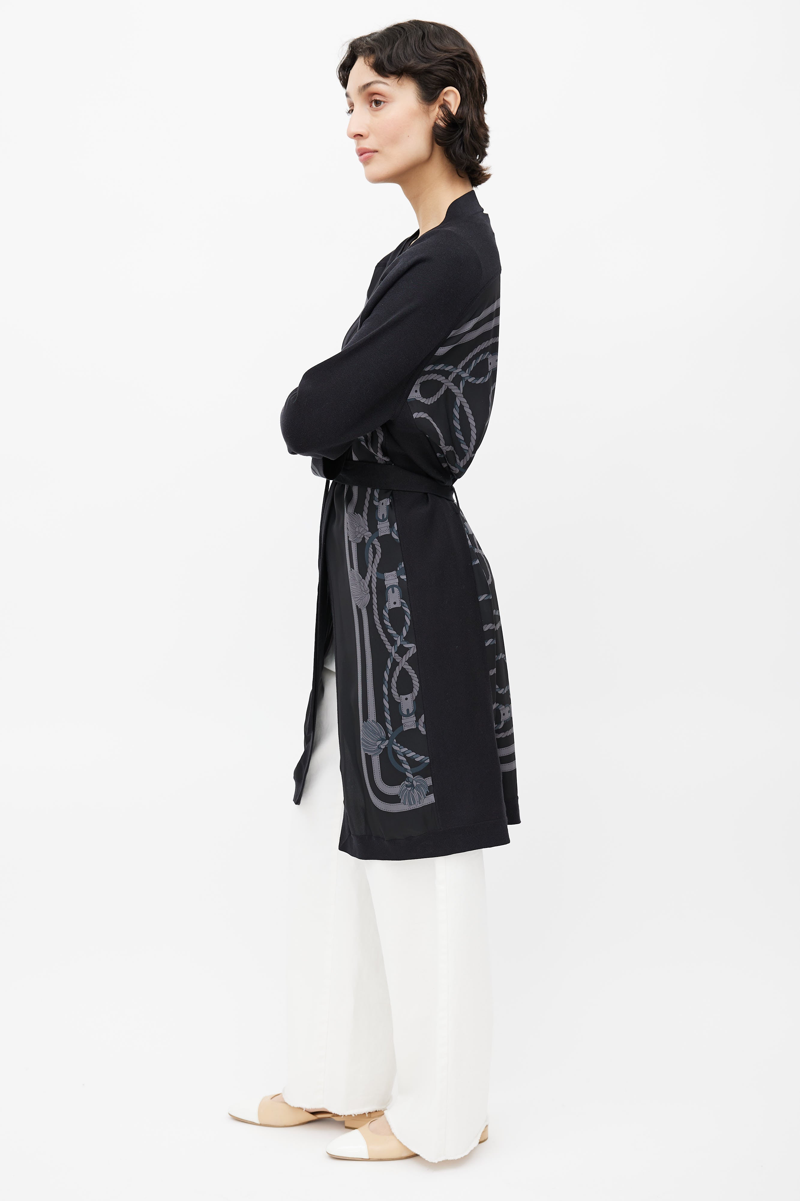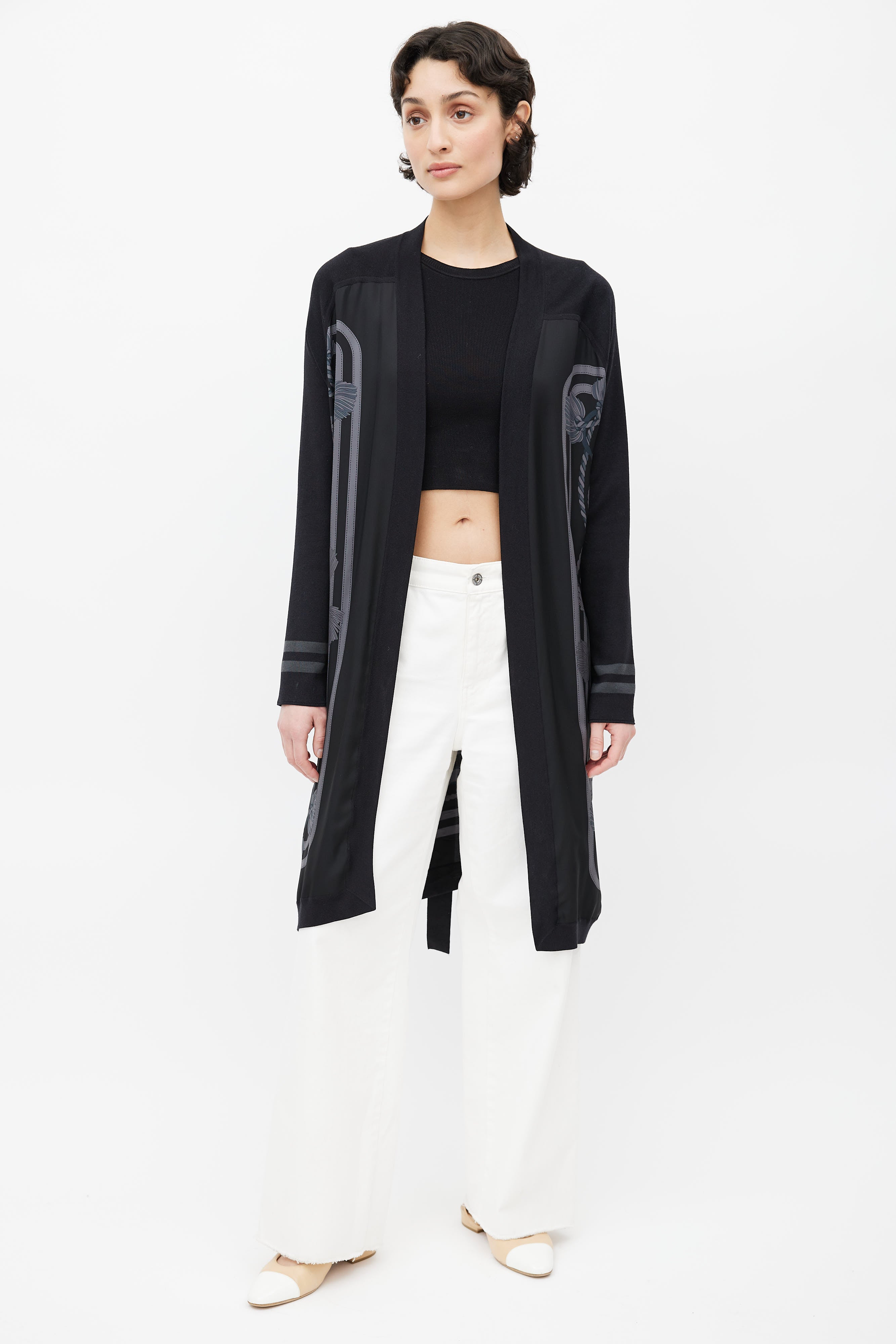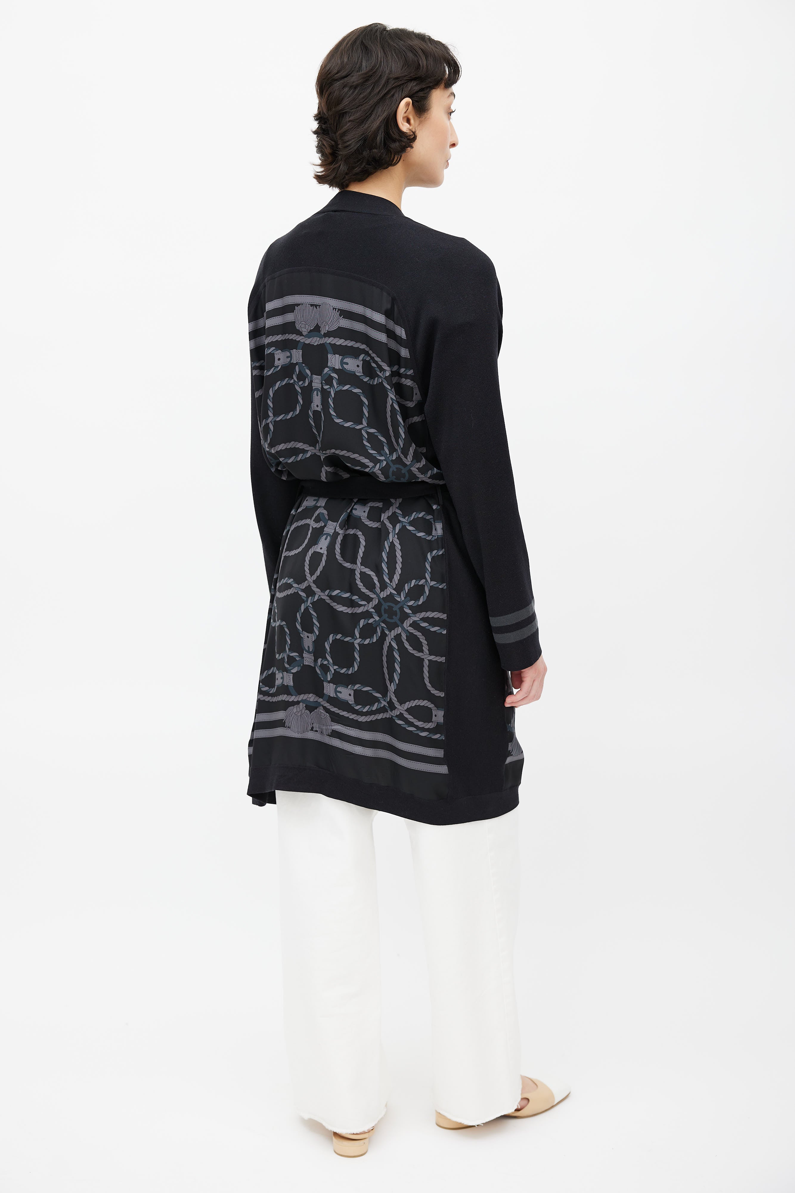 Pre-owned Hermès black cardigan featuring open front, black and grey rope motif print, grey stripes at cuffs, and waist belt.