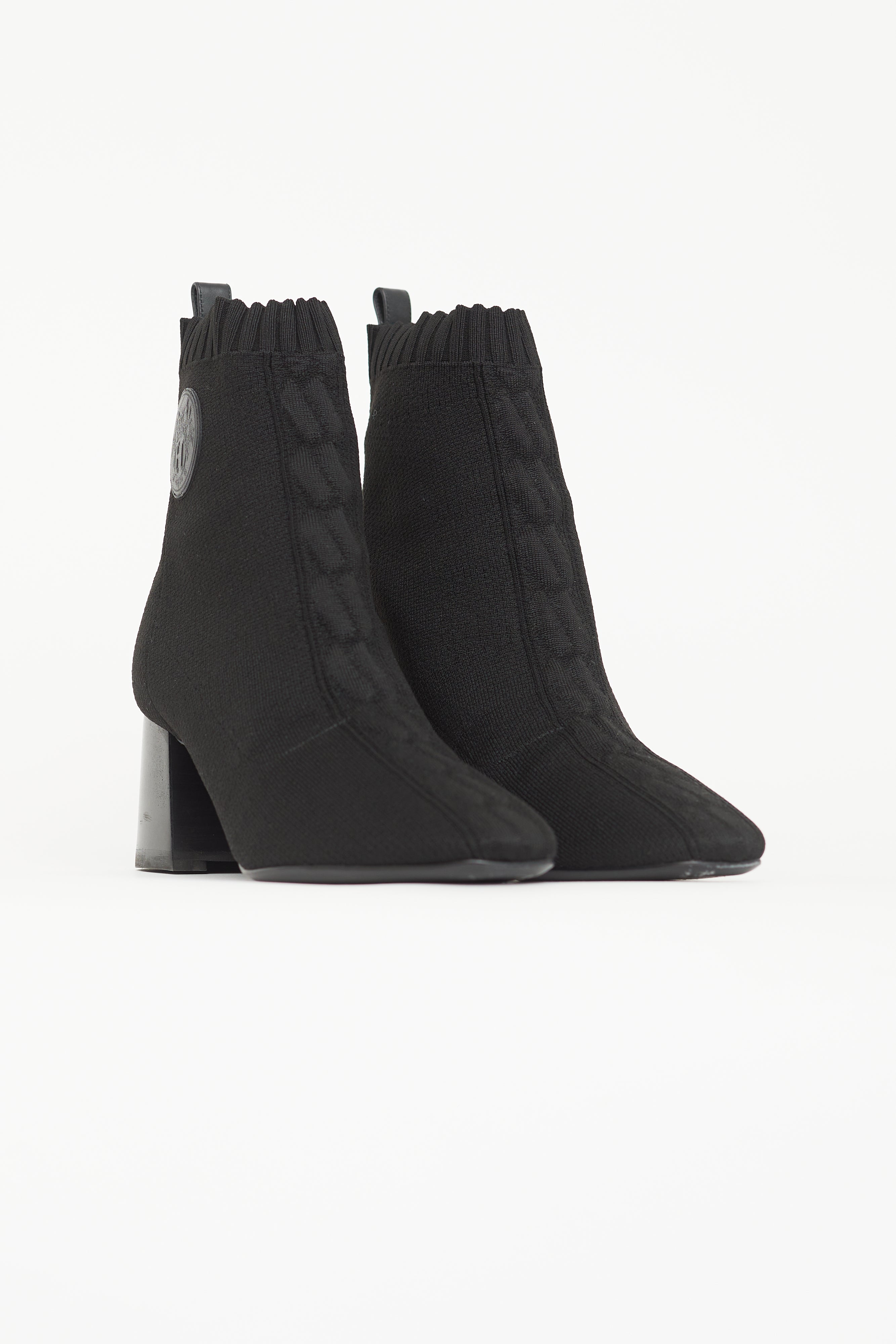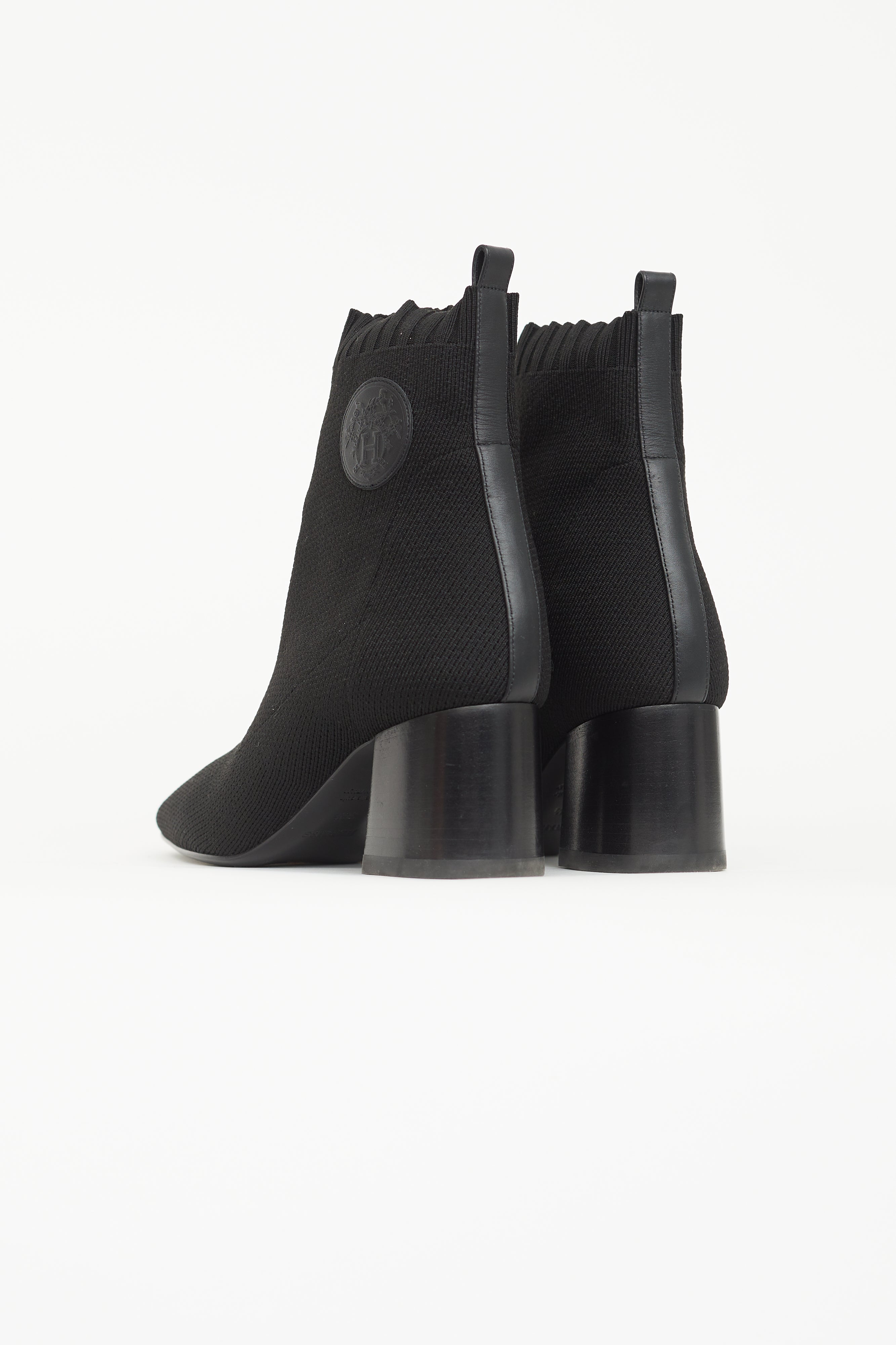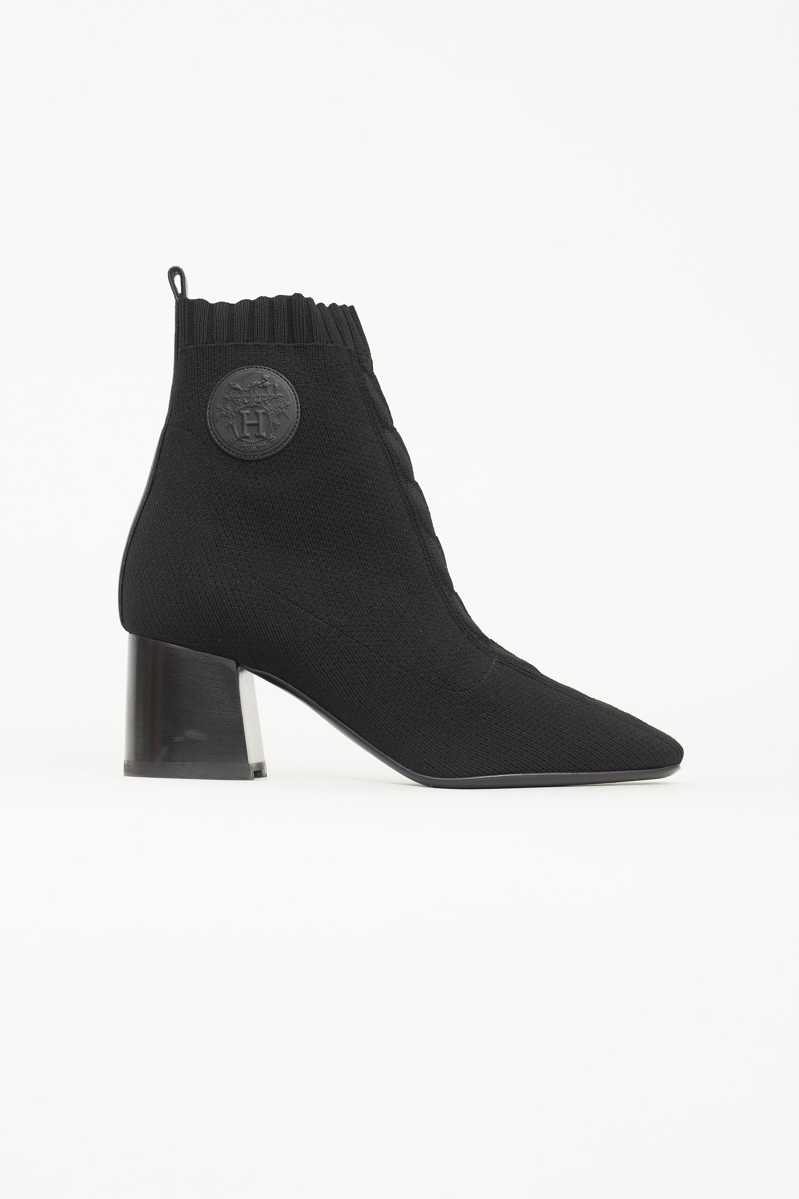 Pre-owned Hermès black Volver 60 ankle boots featuring almond toe, "Clic! C'est Noue" knit intarsia, "Ex-Libris" leather logo, pull tab at back, slip on entry, and stacked heel with horseshoe detail. Comes with original box and dust bag.