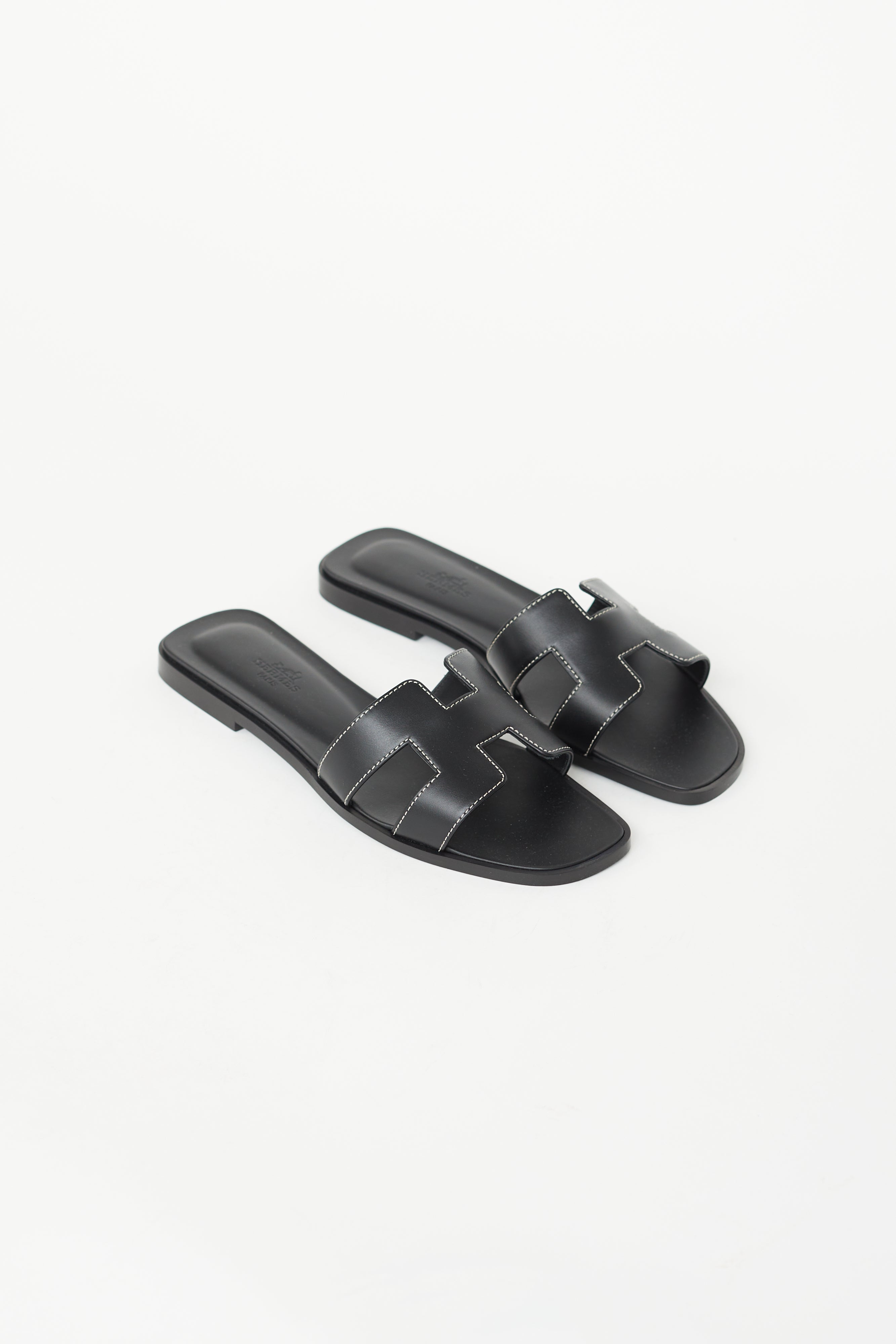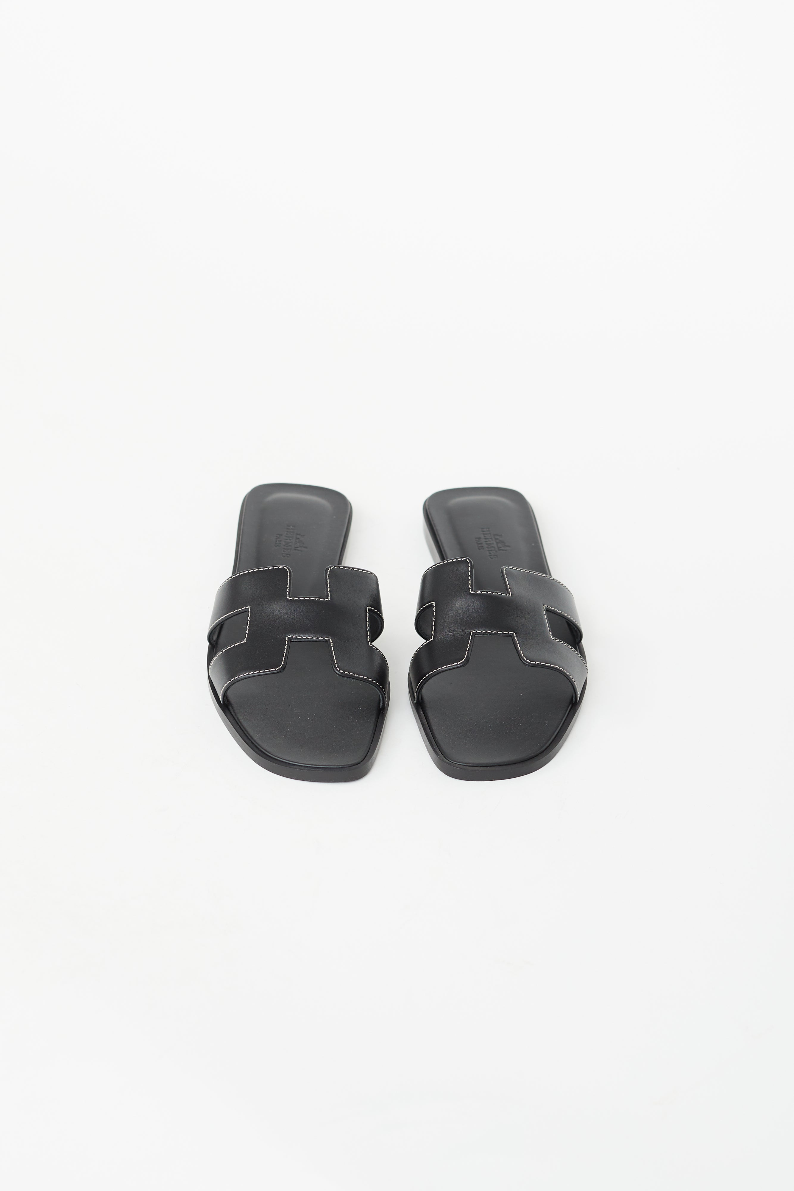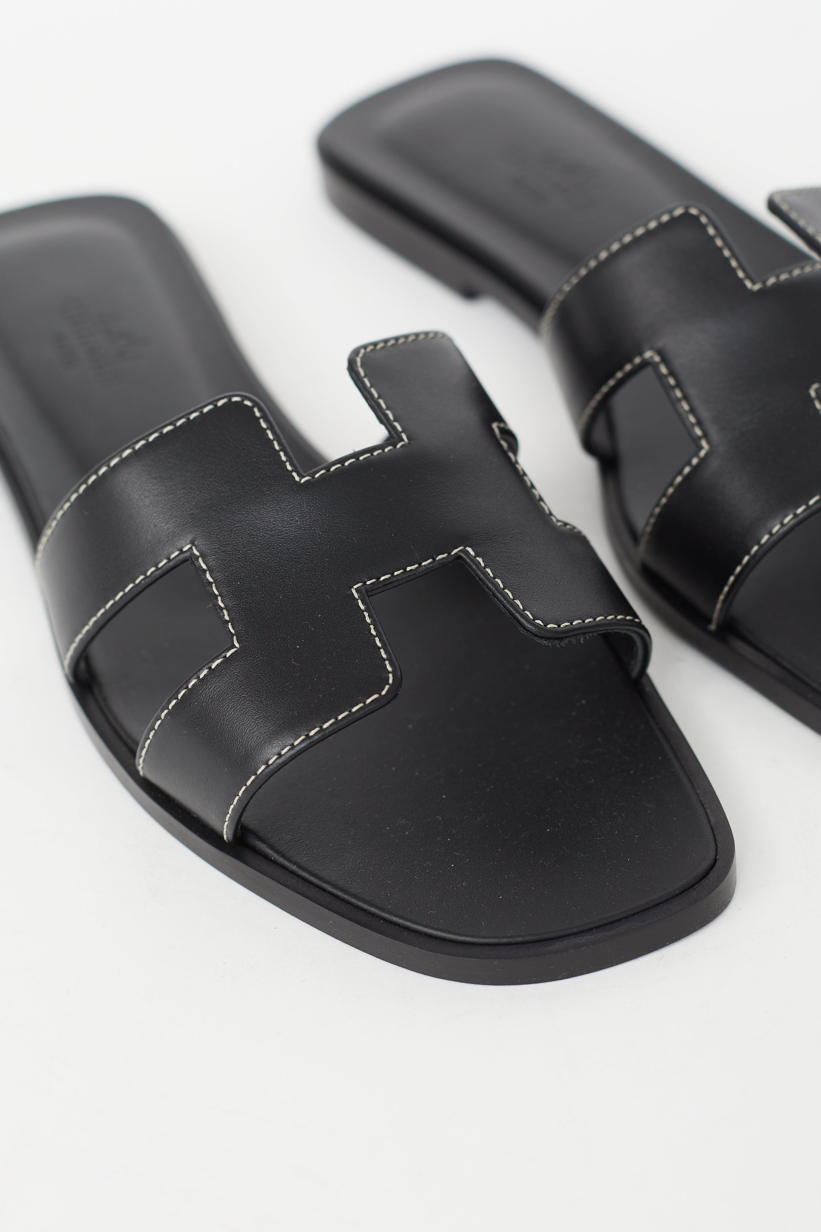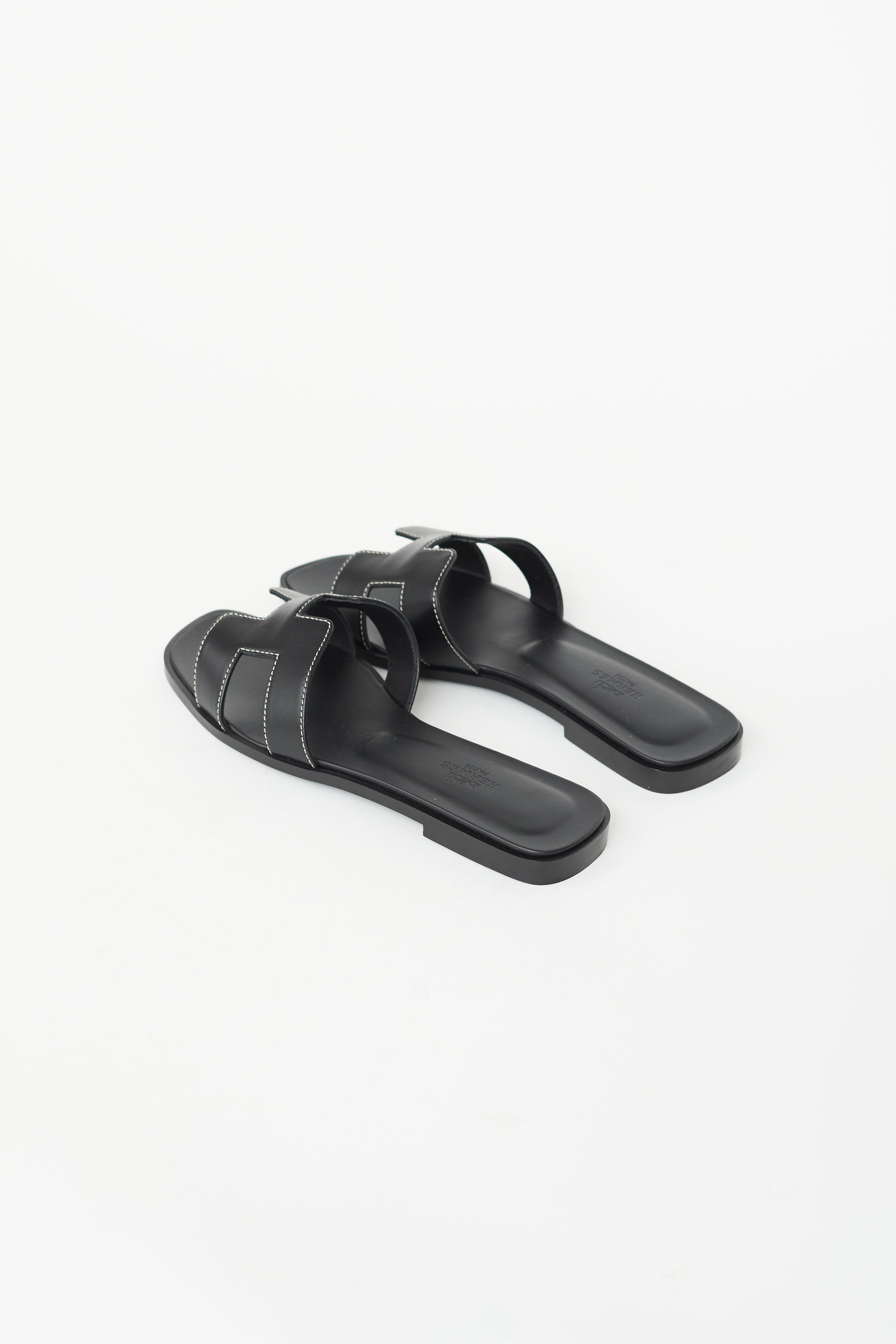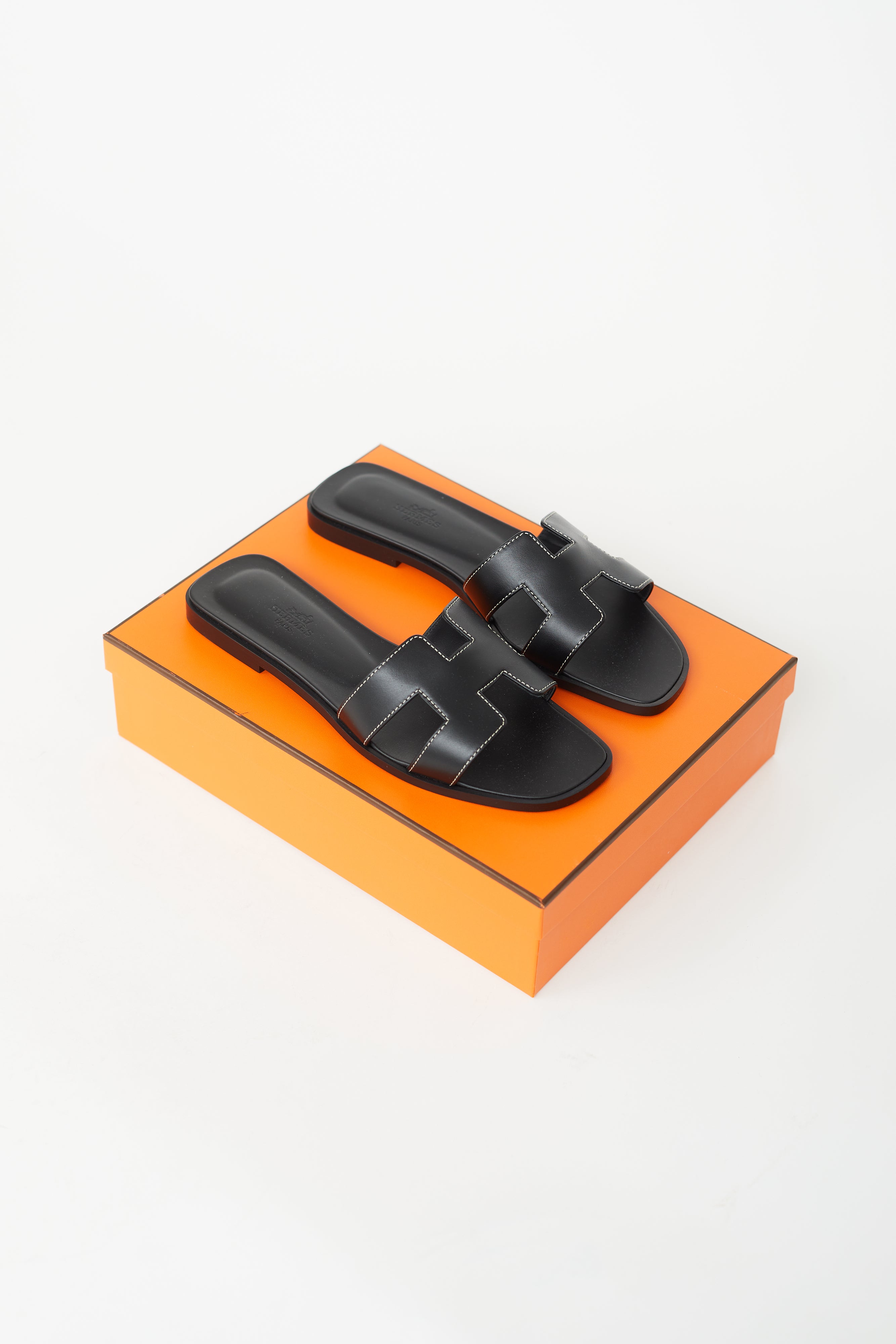 Pre-owned Hermès black leather Oran flat sandal featuring "H" cut-out at toe box, slip-on style, open toe, branded insole and very low stacked heel. Comes with original box and dust bag.