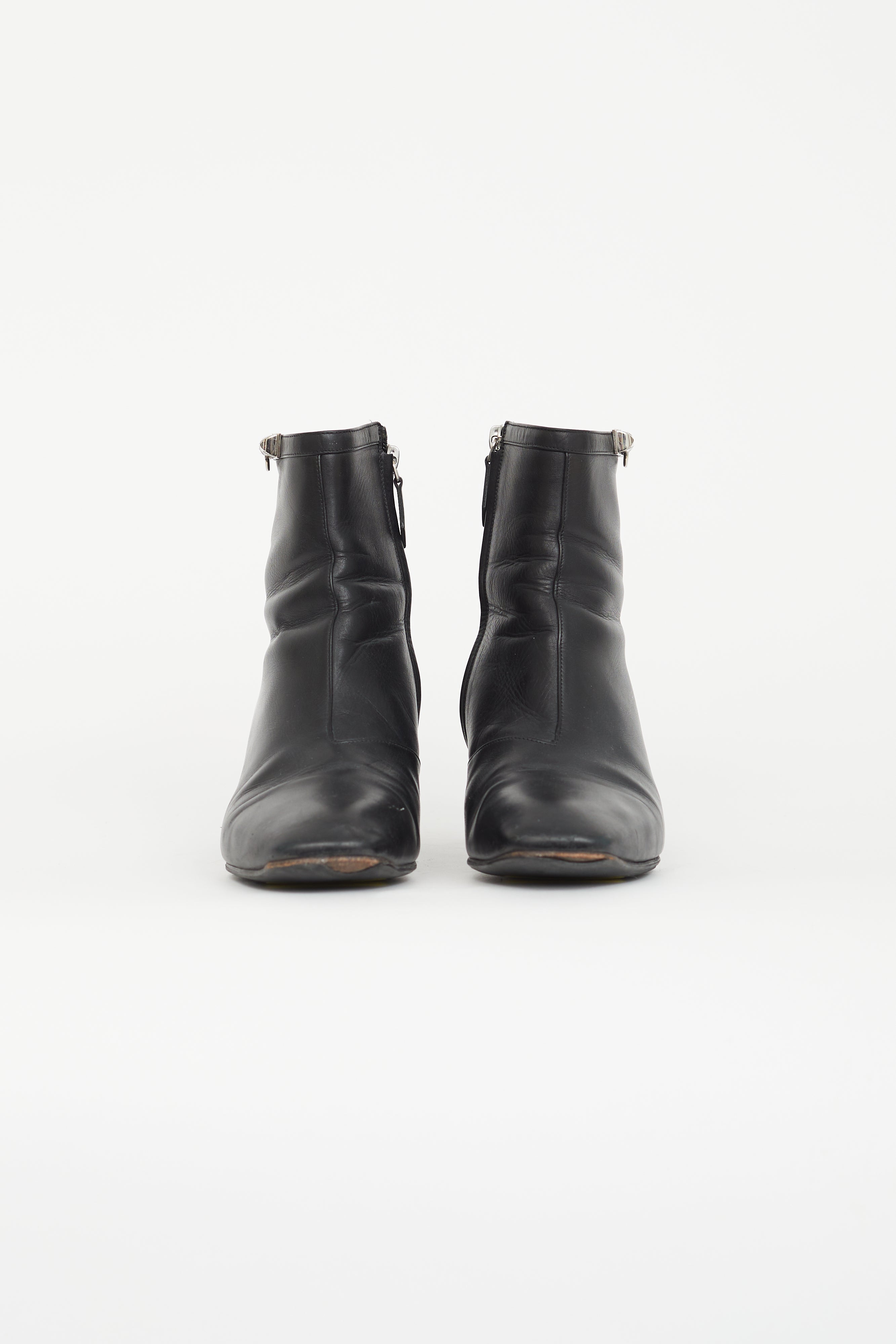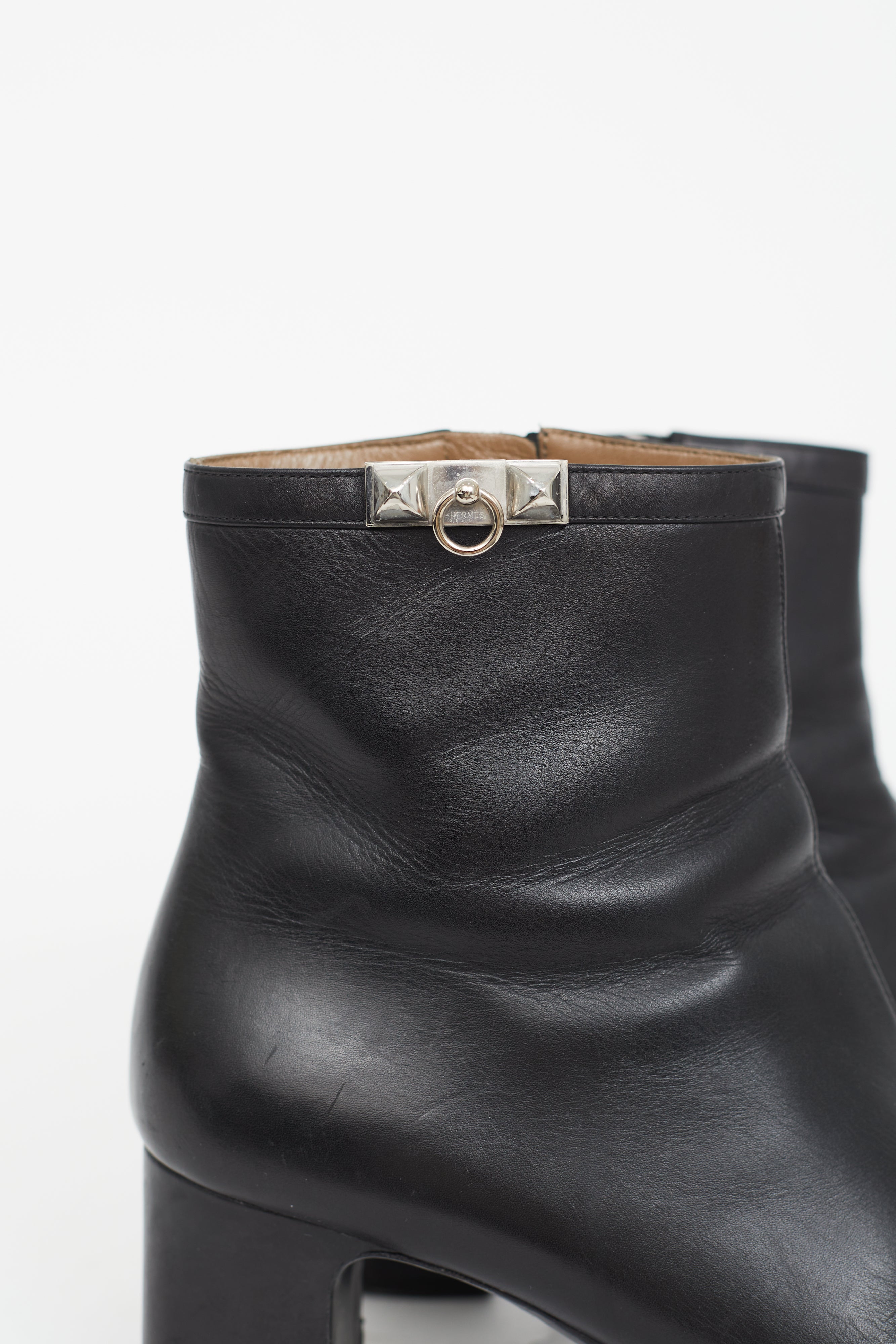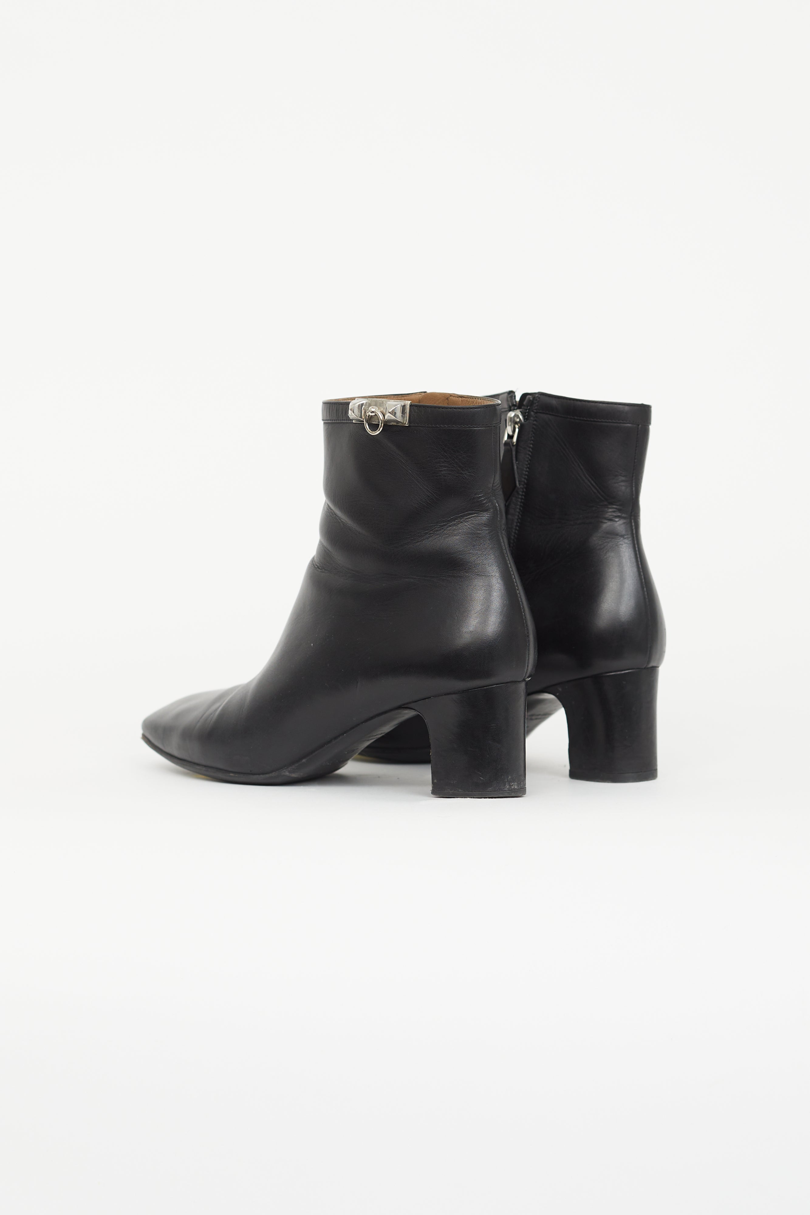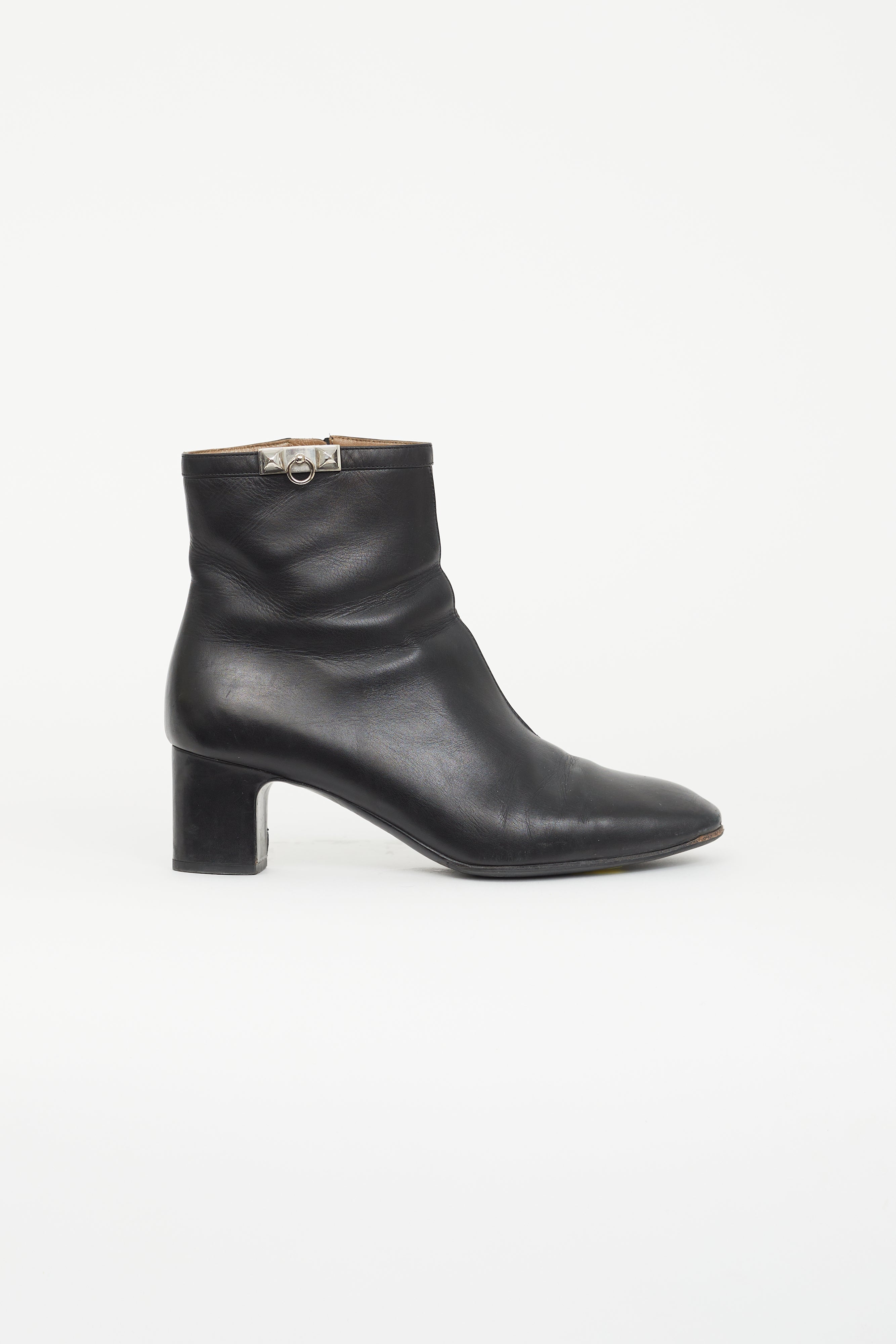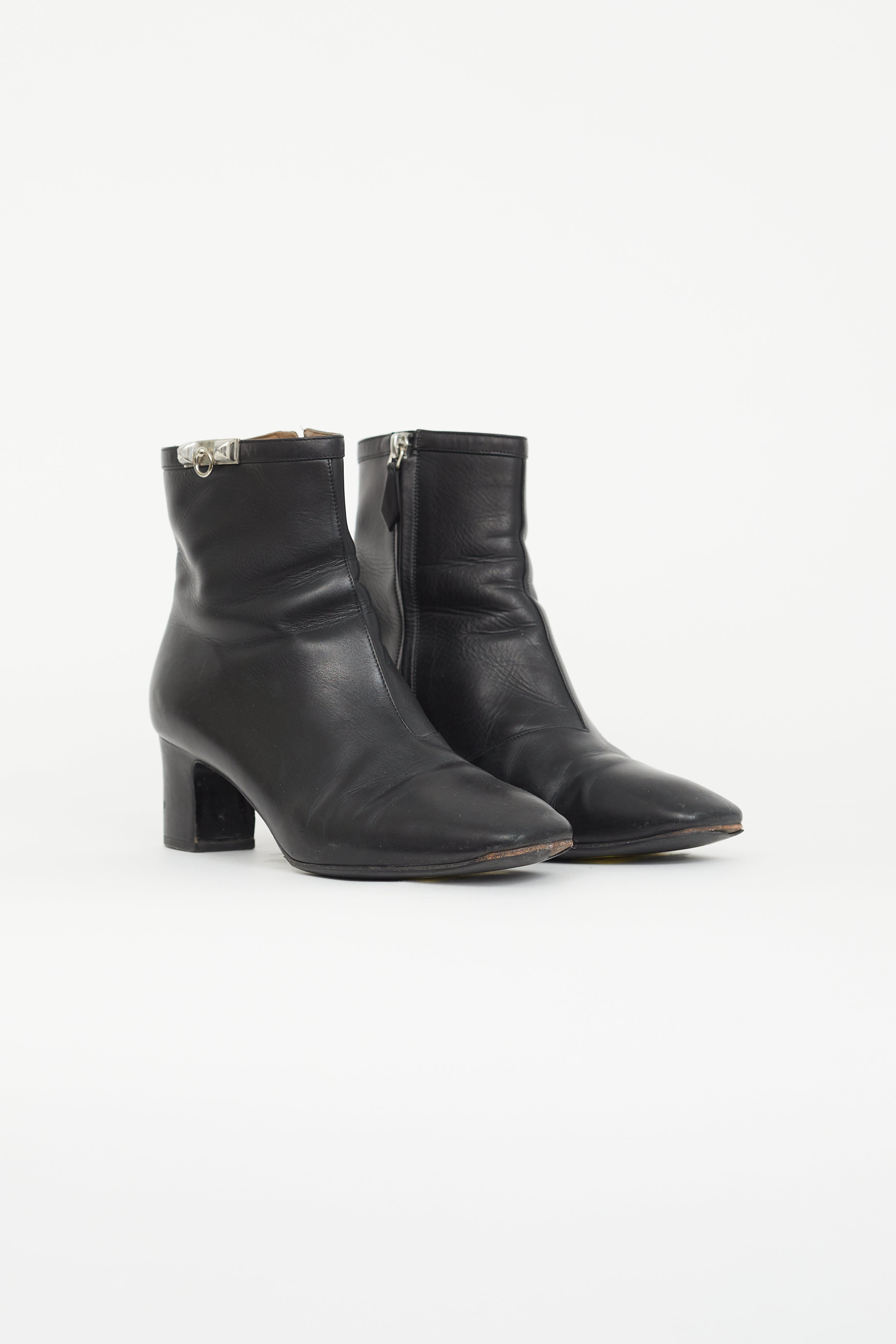 Pre-owned Hermès black Power ankle boots featuring a square toe, silver tone Collier de Chien hardware at ankle, wrapped block heel, and a zip closure at side.