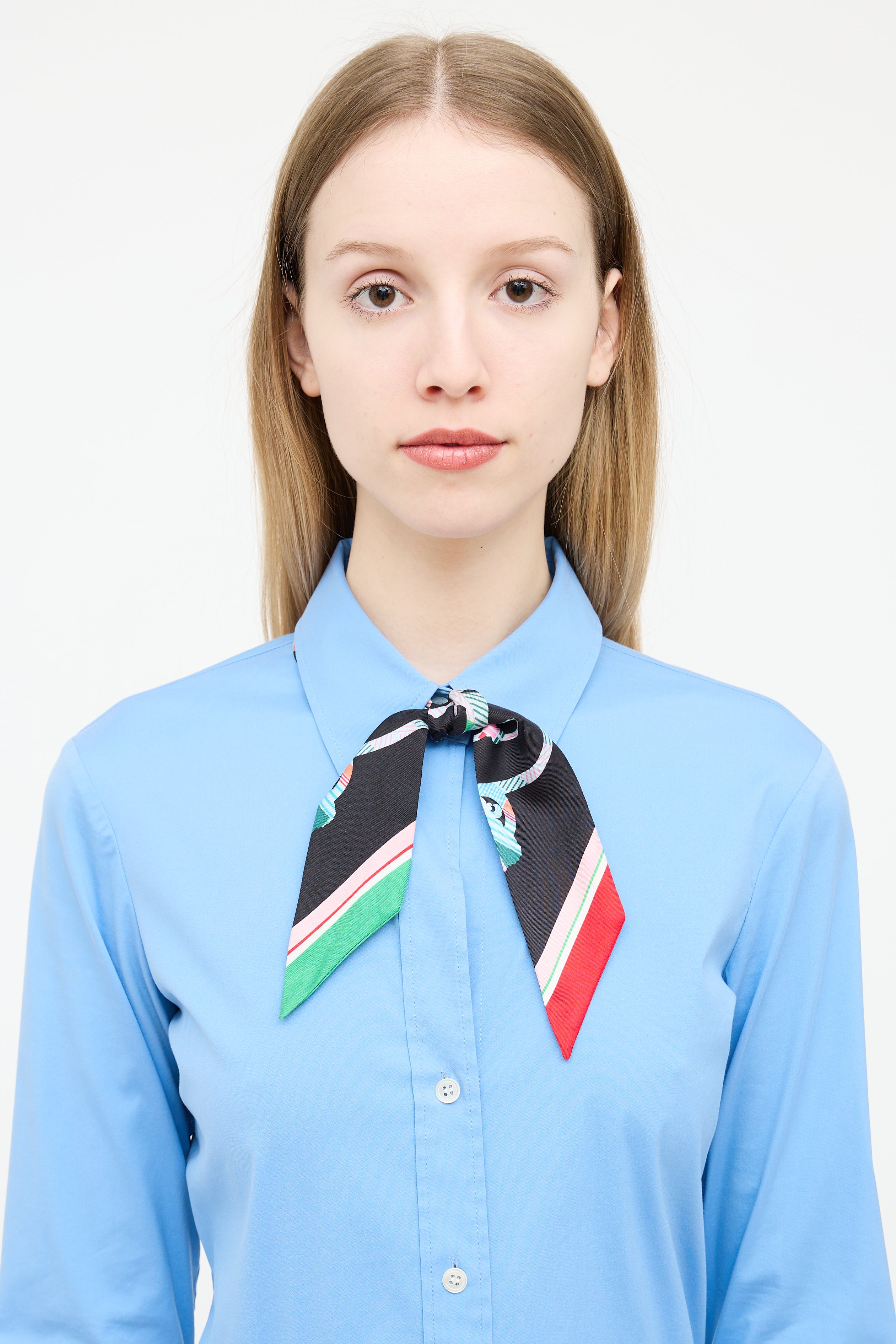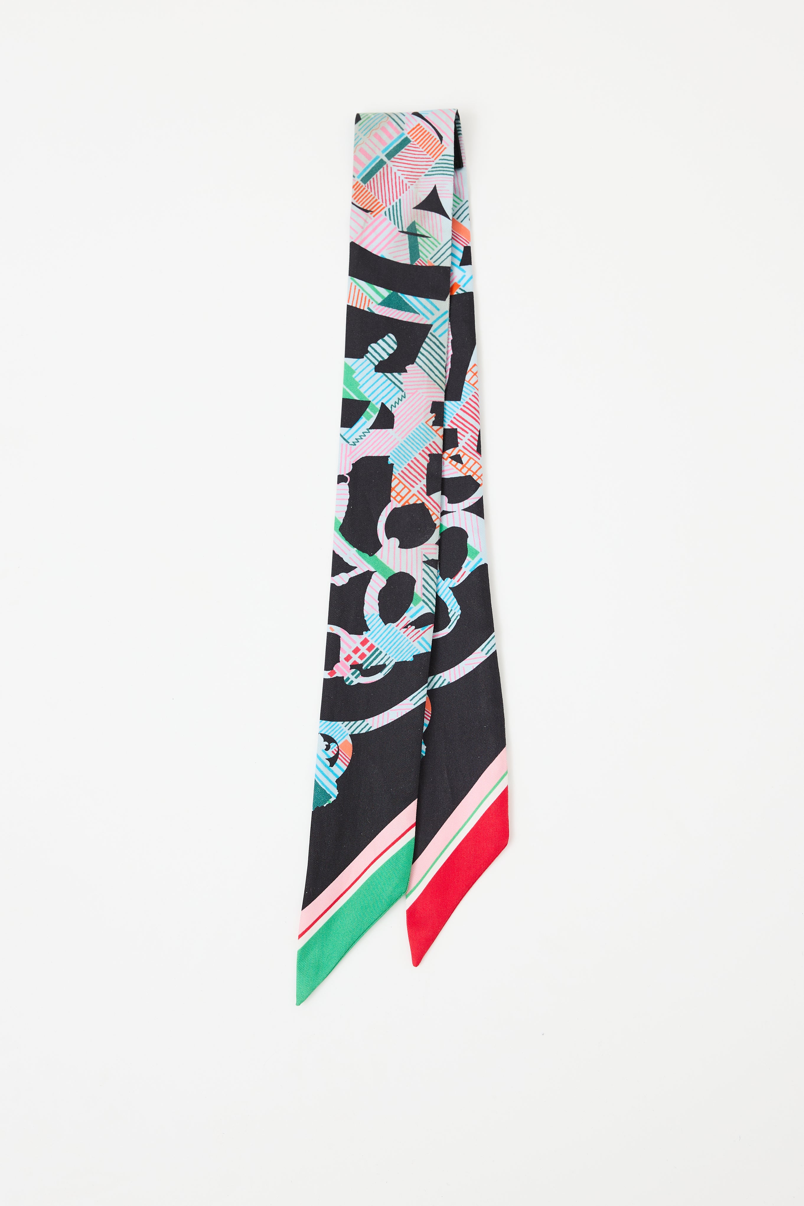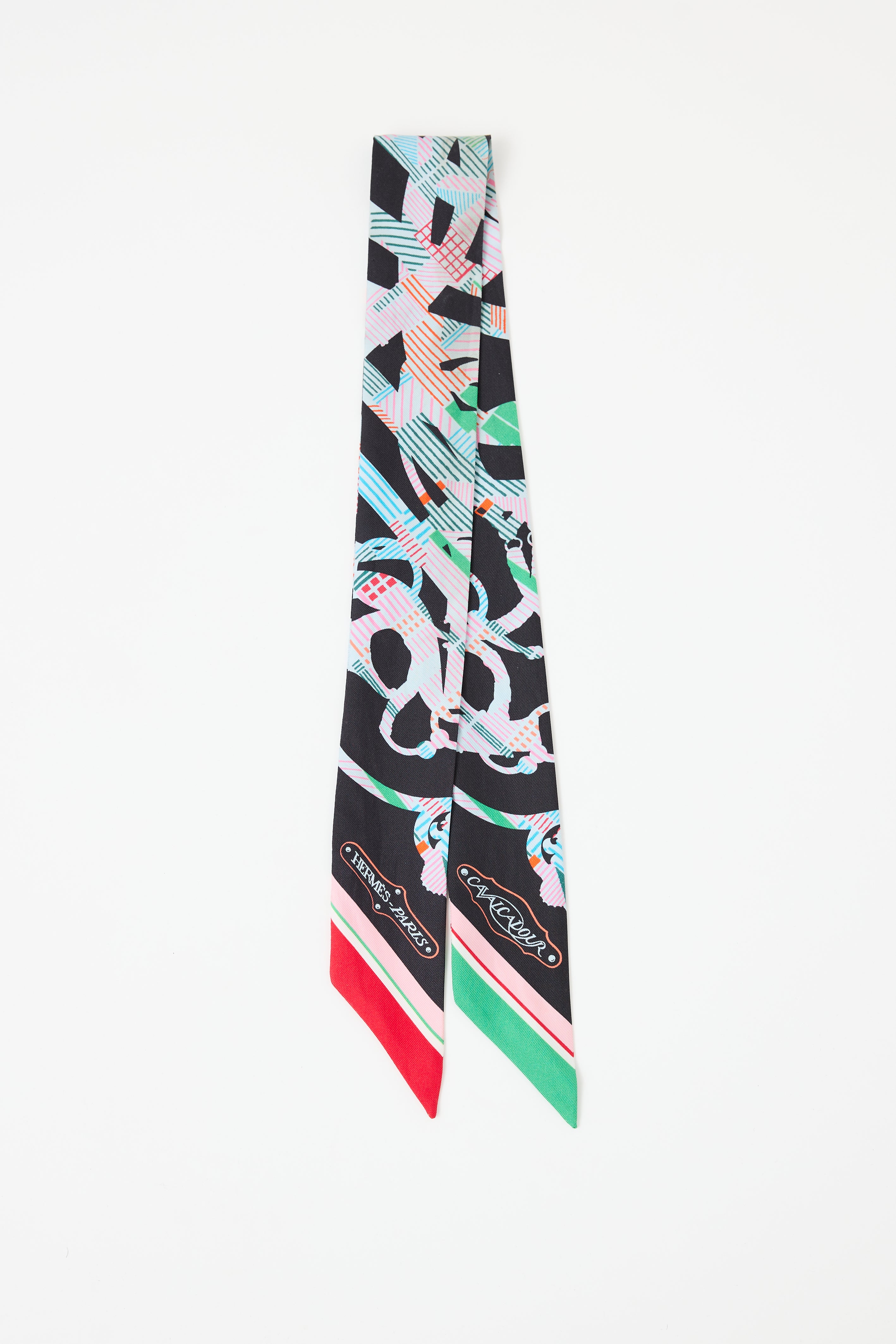 Pre-owned Hermès black and multicolour silk twilly featuring Cavalcadour Morning print by Nigel Peake and Henri d'Origny, horsebit motif throughout, and pointed ends.
