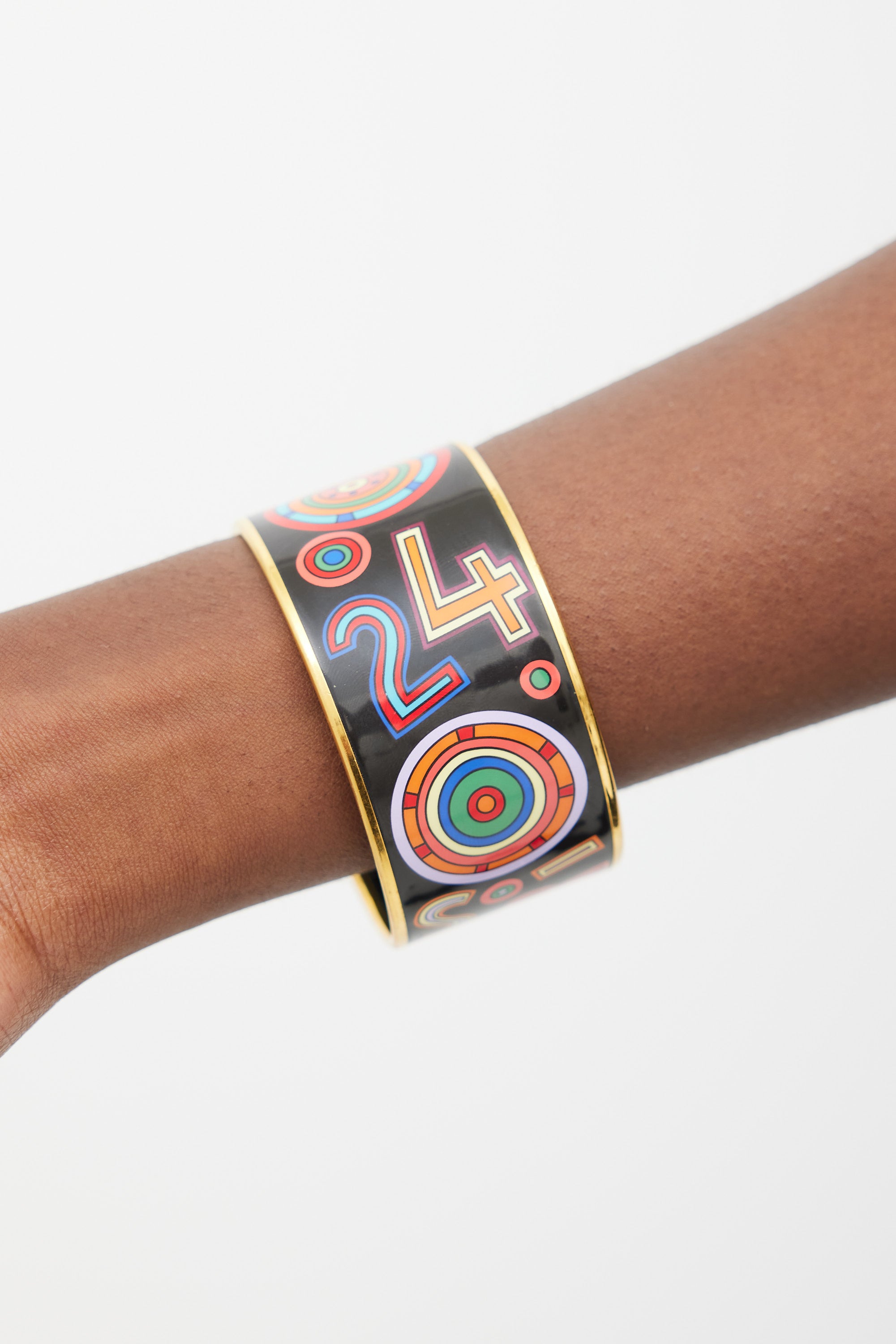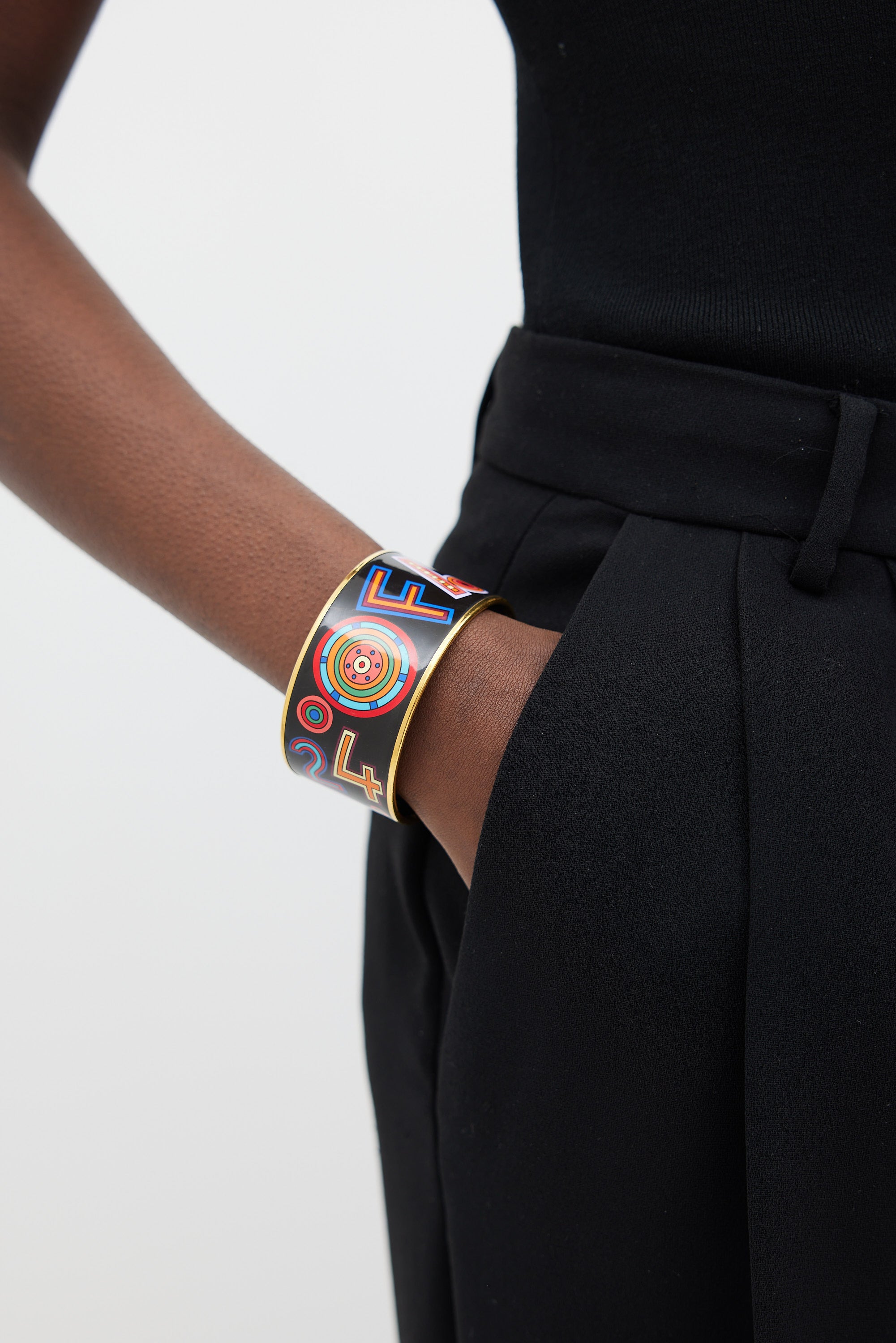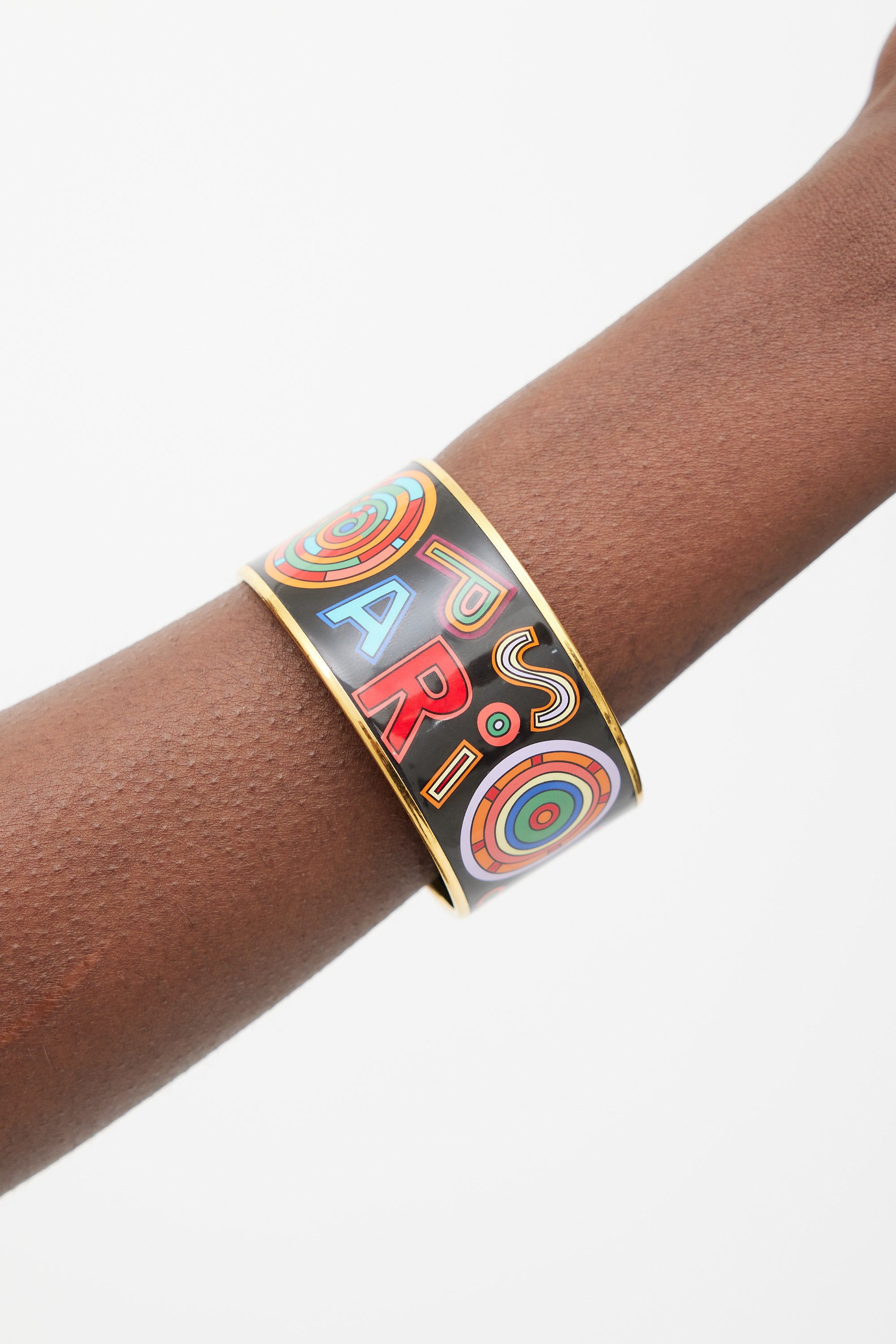Pre-owned Hermès extra wide enamel bangle featuring black and multicolour Tohu Bohu lettered print, gold-tone trim, and inner gold-tone logo stamp.