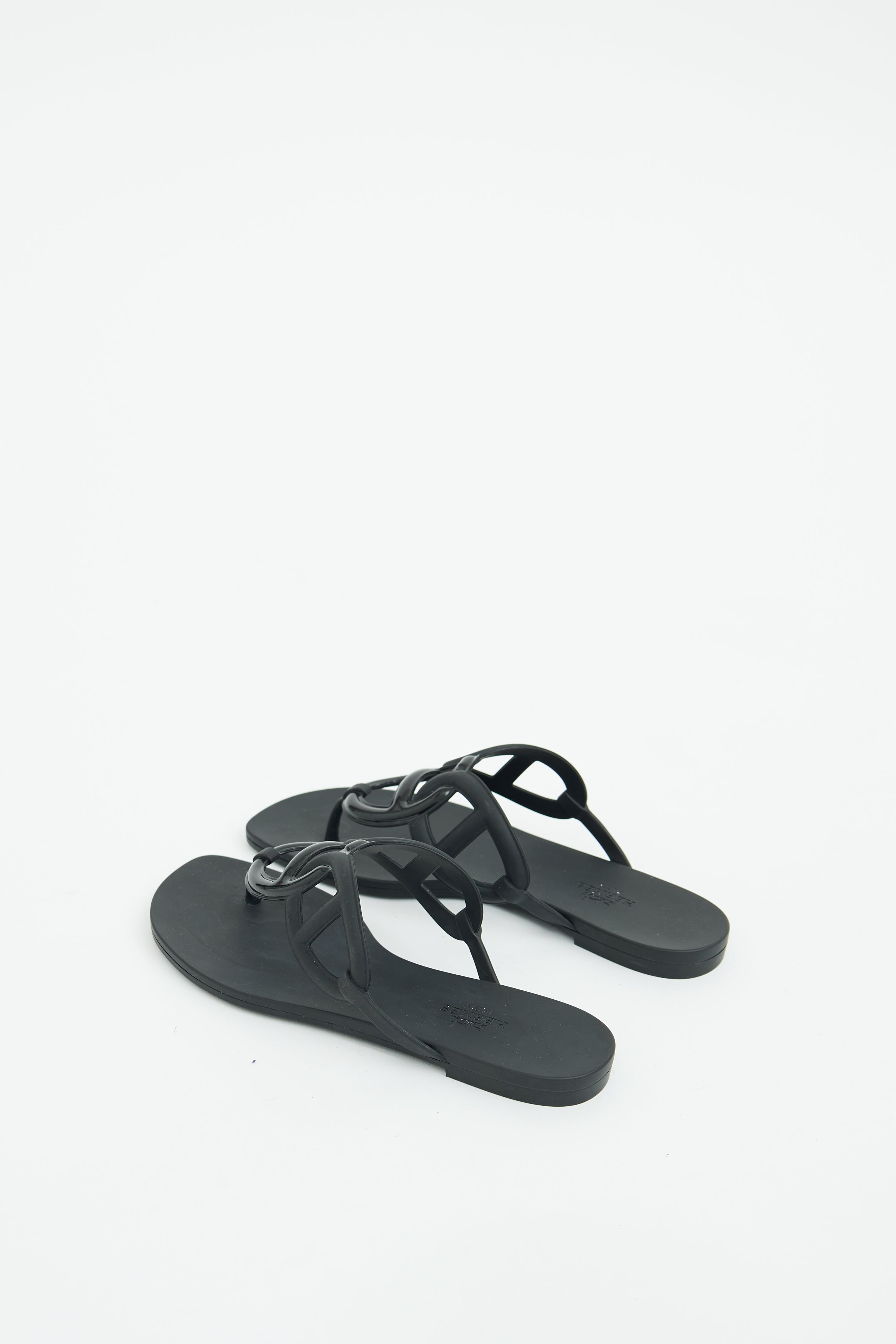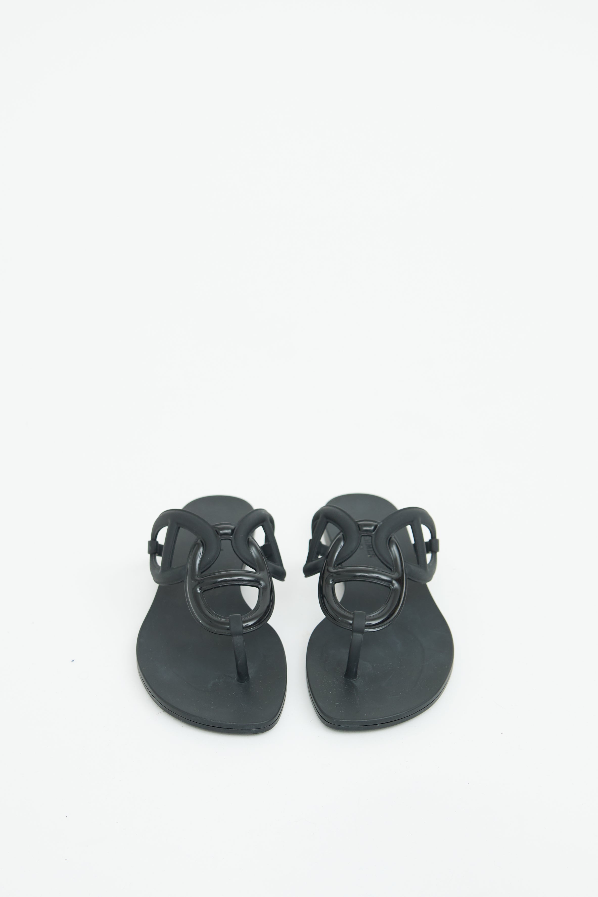 Pre-owned Hermès black Egerie rubber sandals featuring a rounded toe, linked Chaine d'ancre strap, and slip on entry. Comes with original dust bags and box.