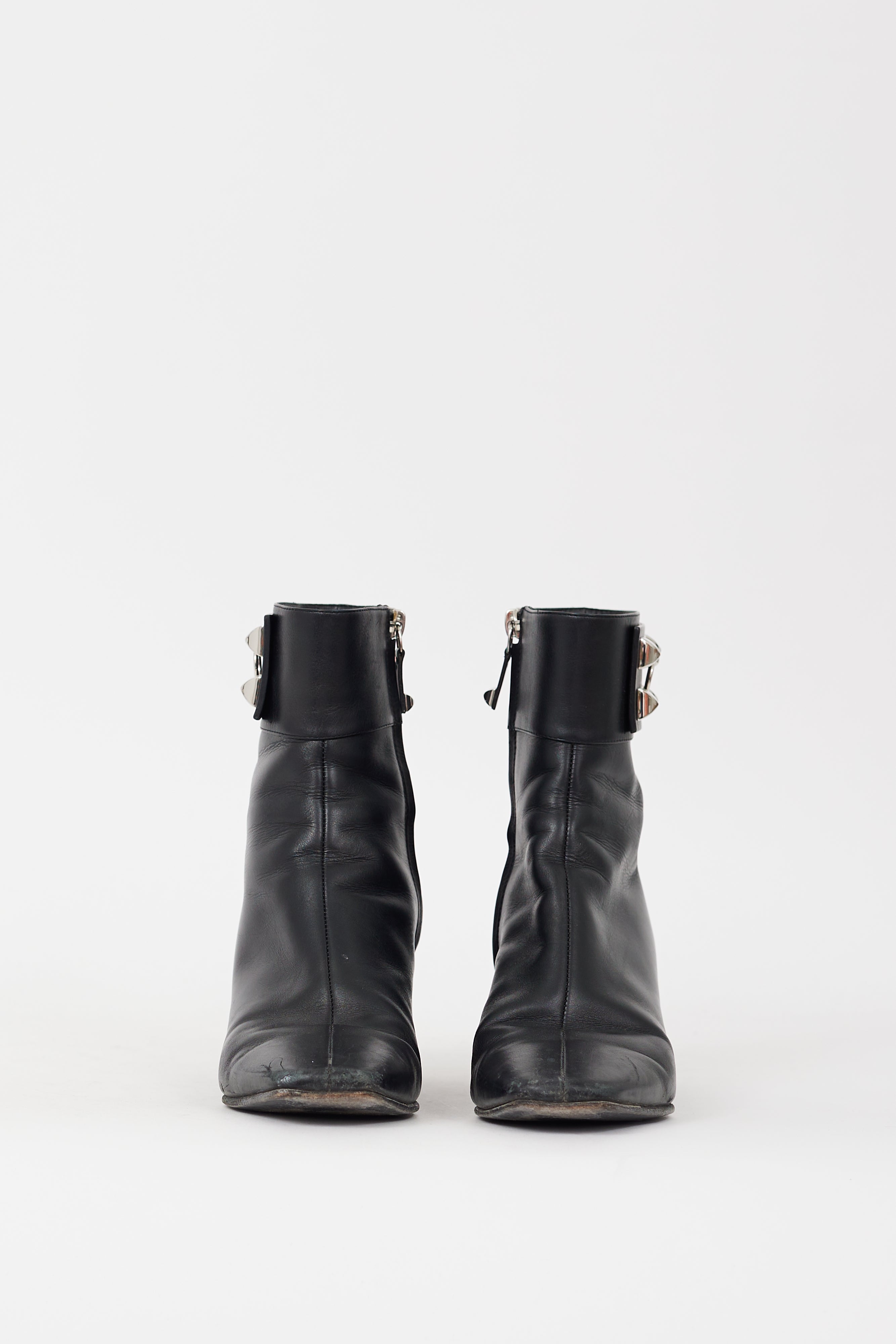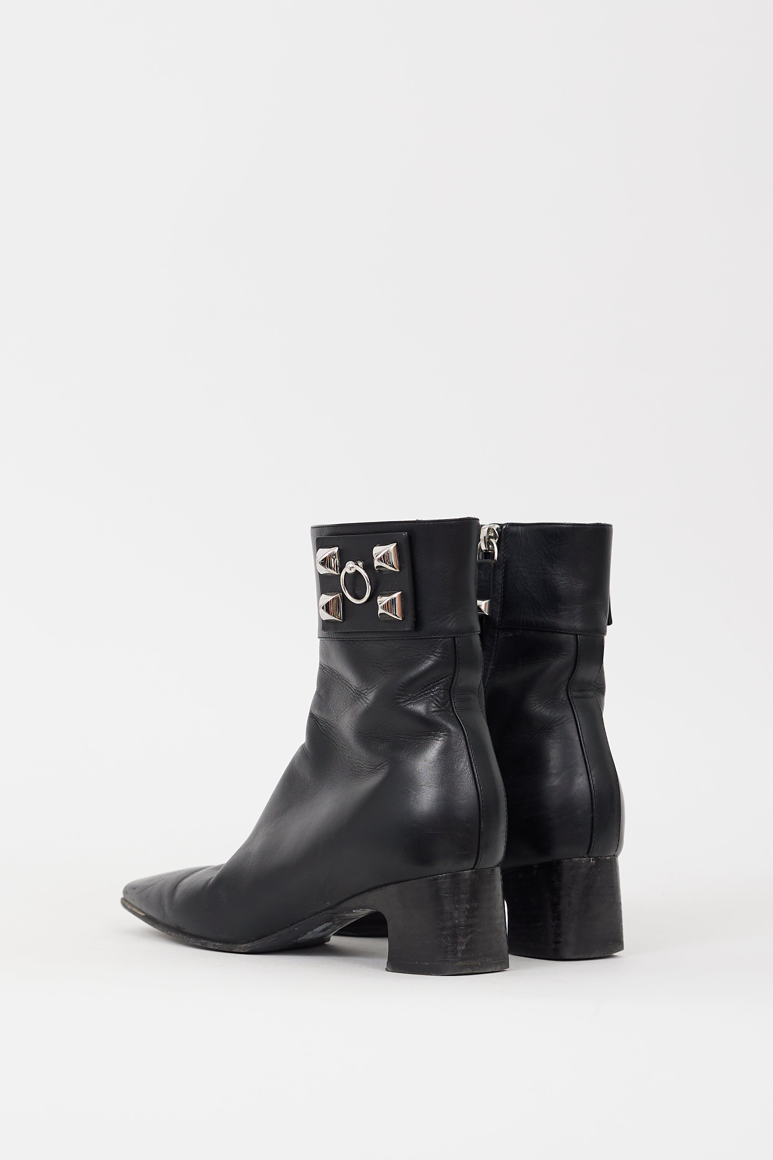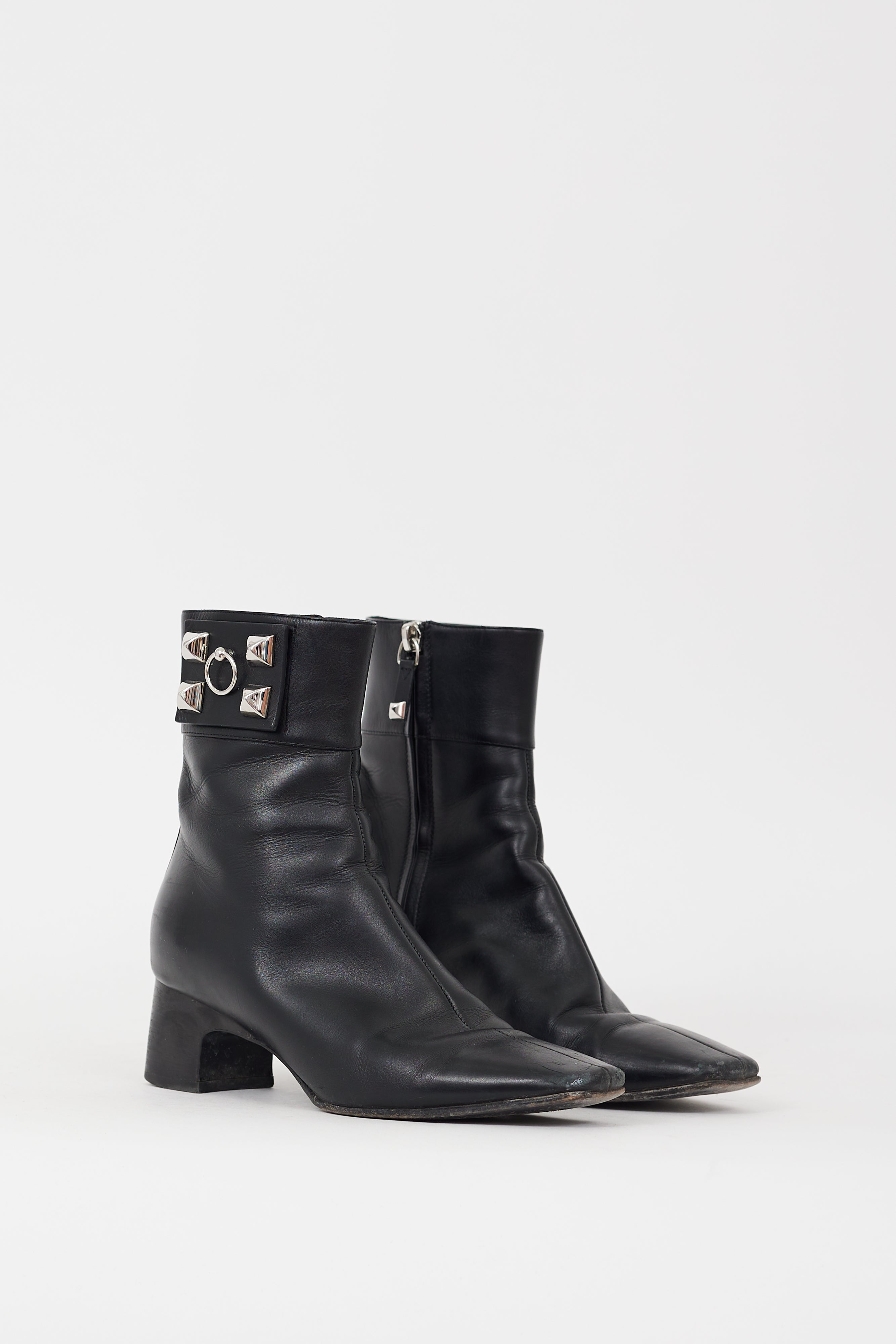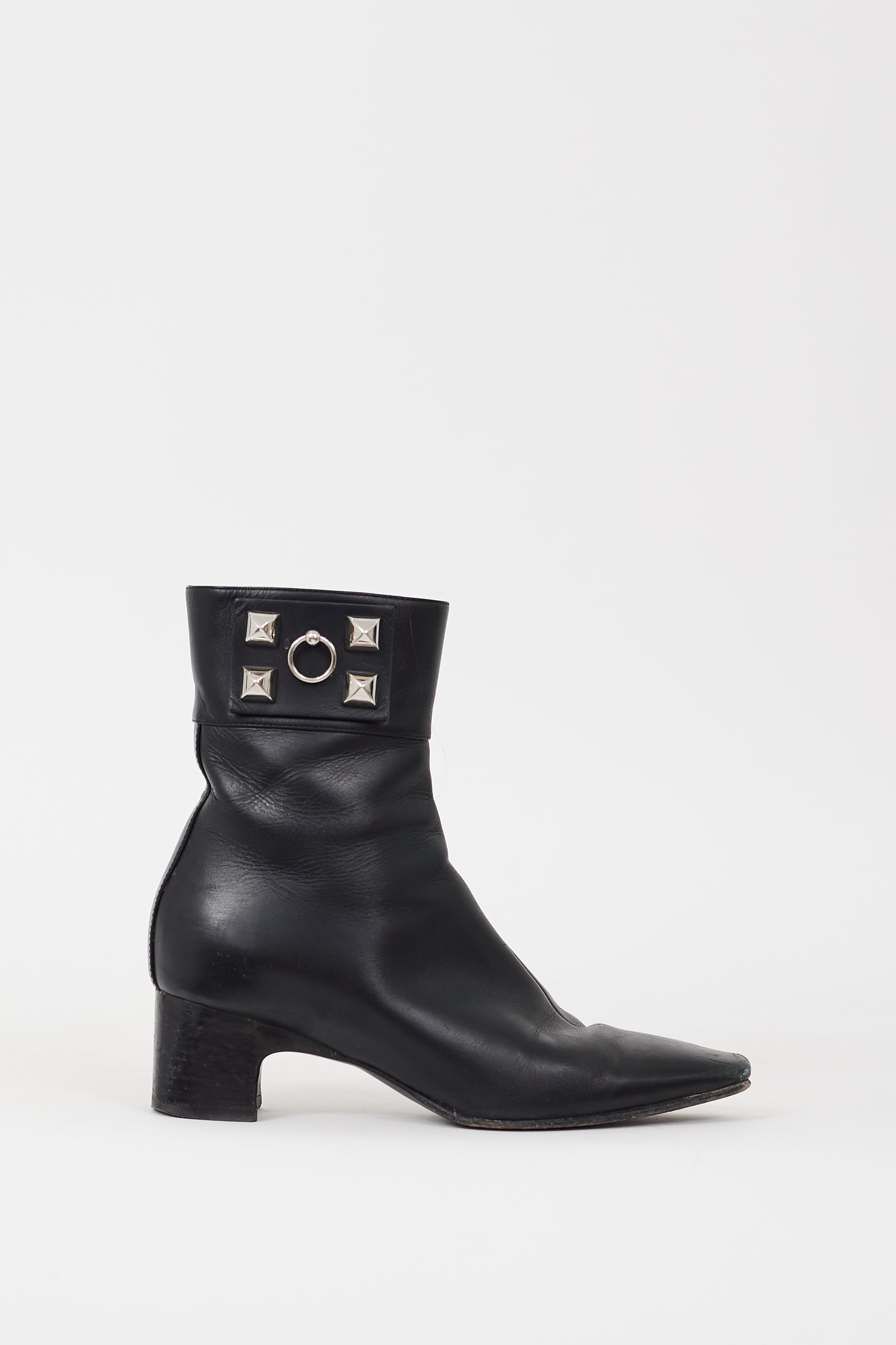 Pre-owned Hermès black leather Decouverte 50 boot featuring a tapered square toe, panelled construction, four silver tone studs and single hoop embellishment at outer sides of shaft, inner side zip closure, and block heel. Comes with original dust bag.