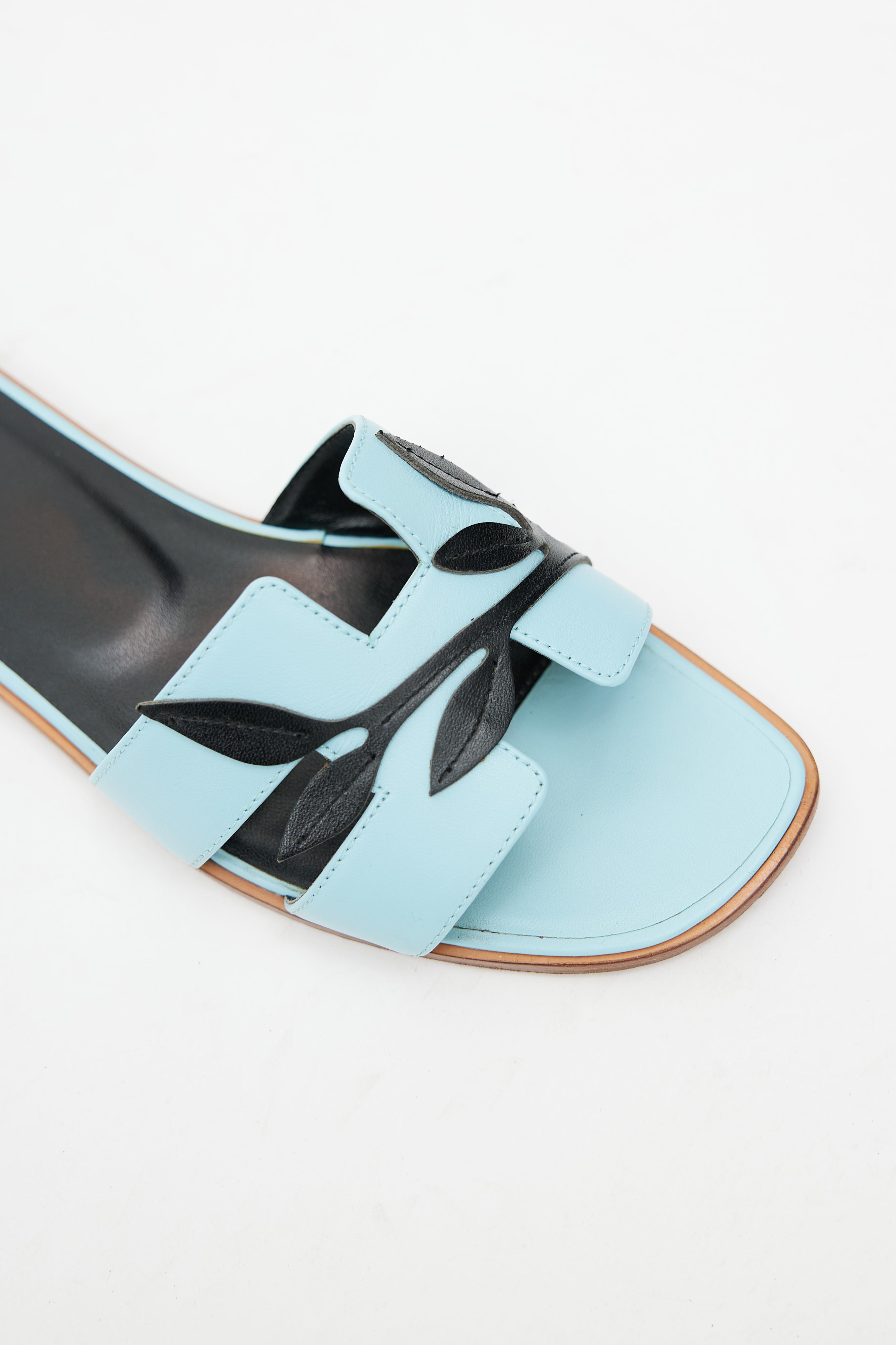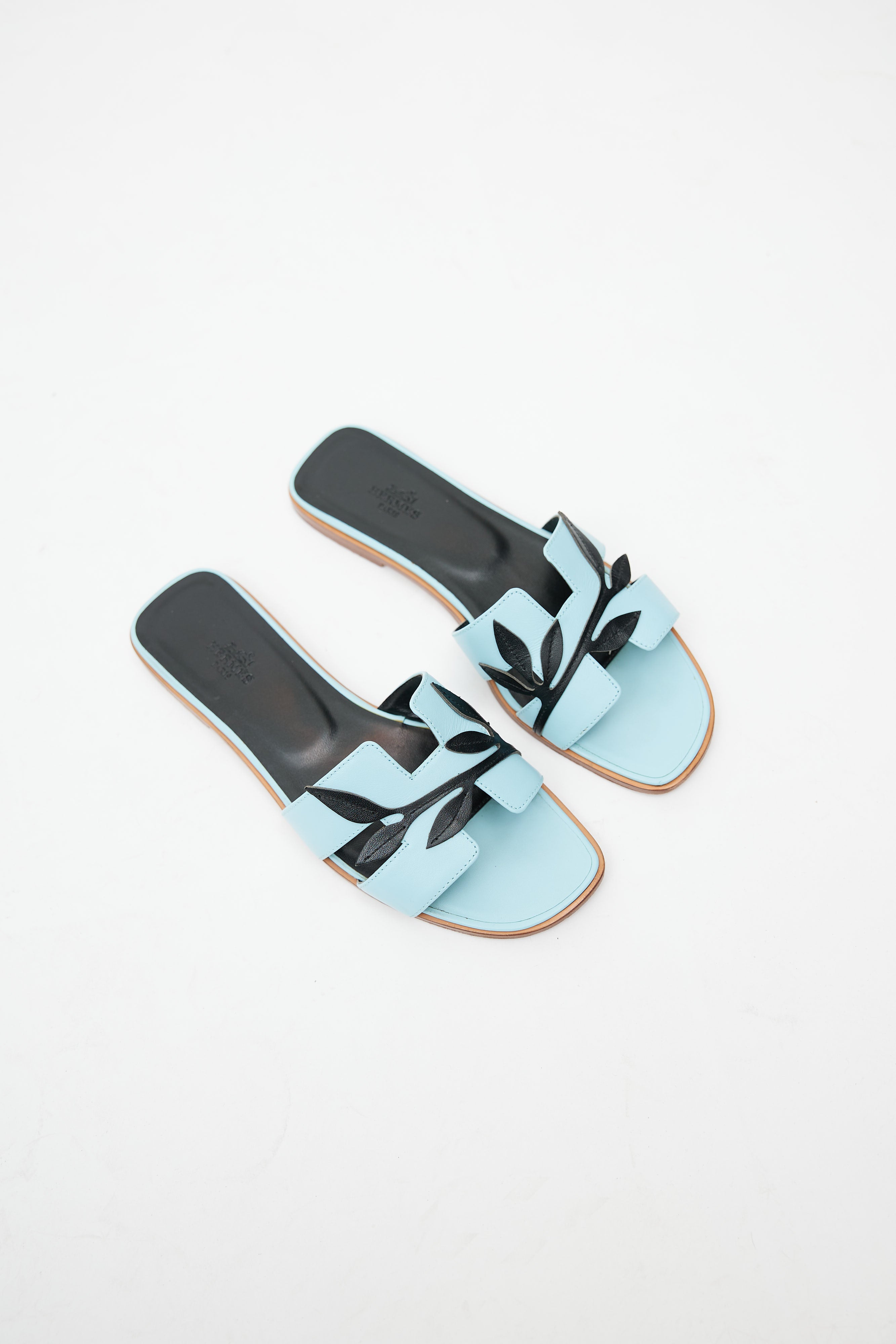 Pre-owned Hermès Oran sandals in blue leather featuring "H" cut-out at toe box, black leaf appliquè, branded black leather insole and short stacked heel. Comes with box.