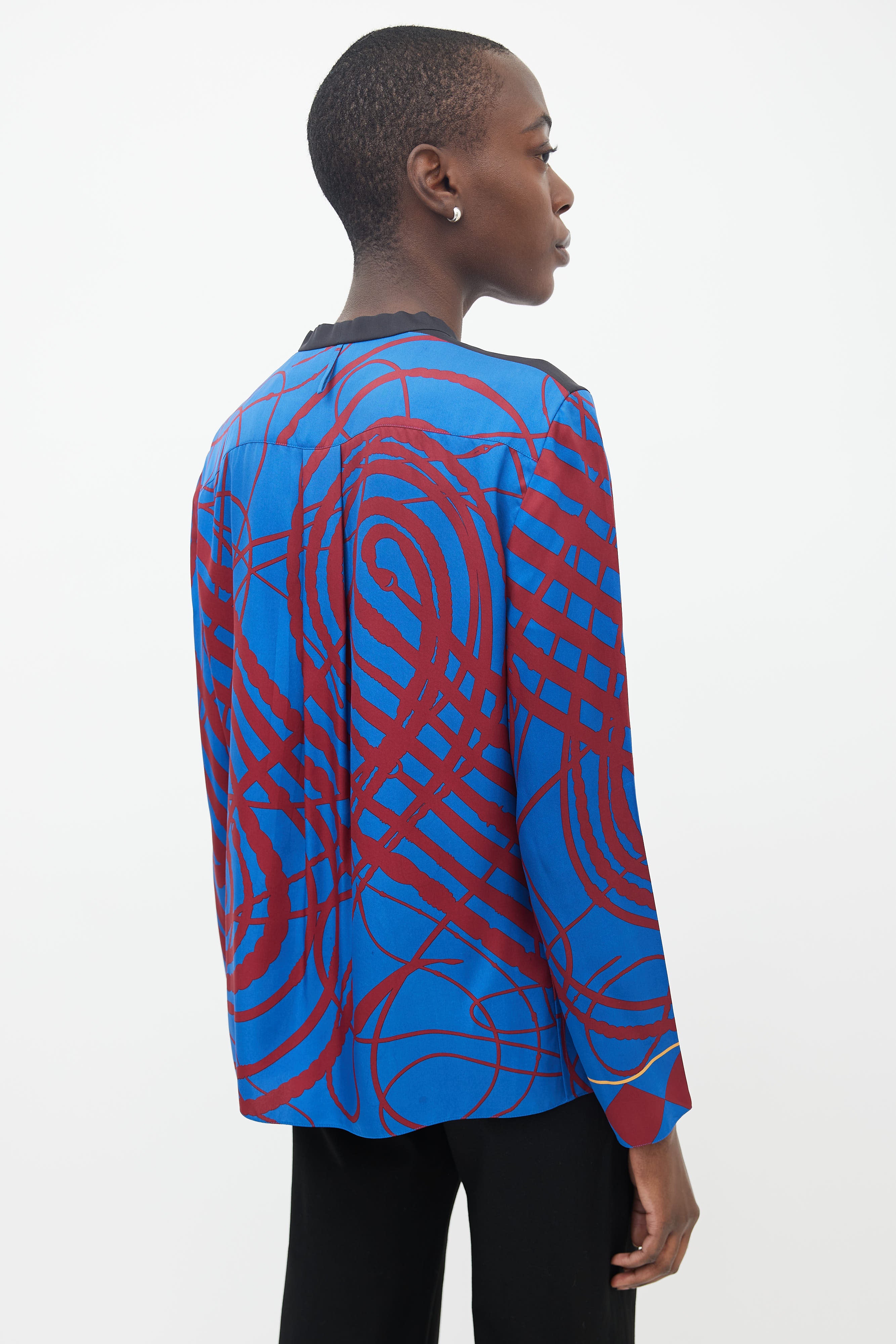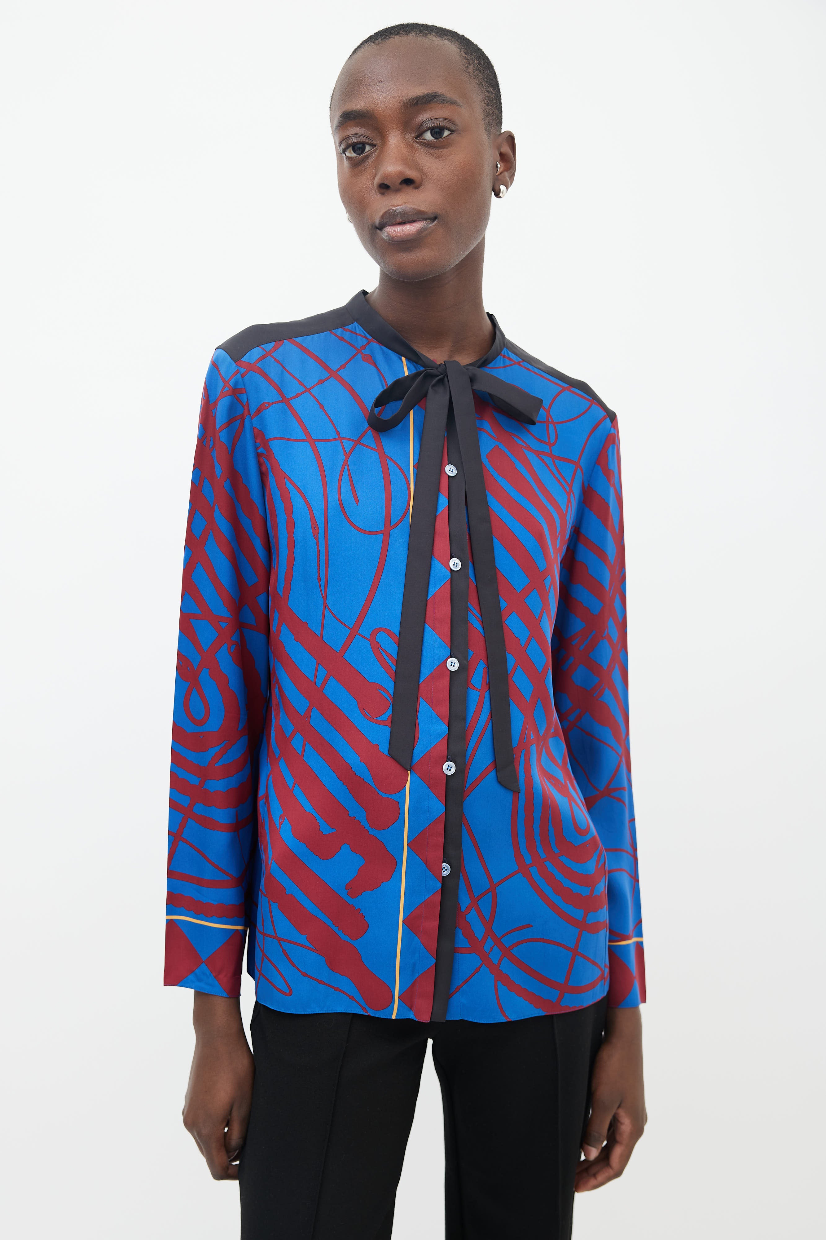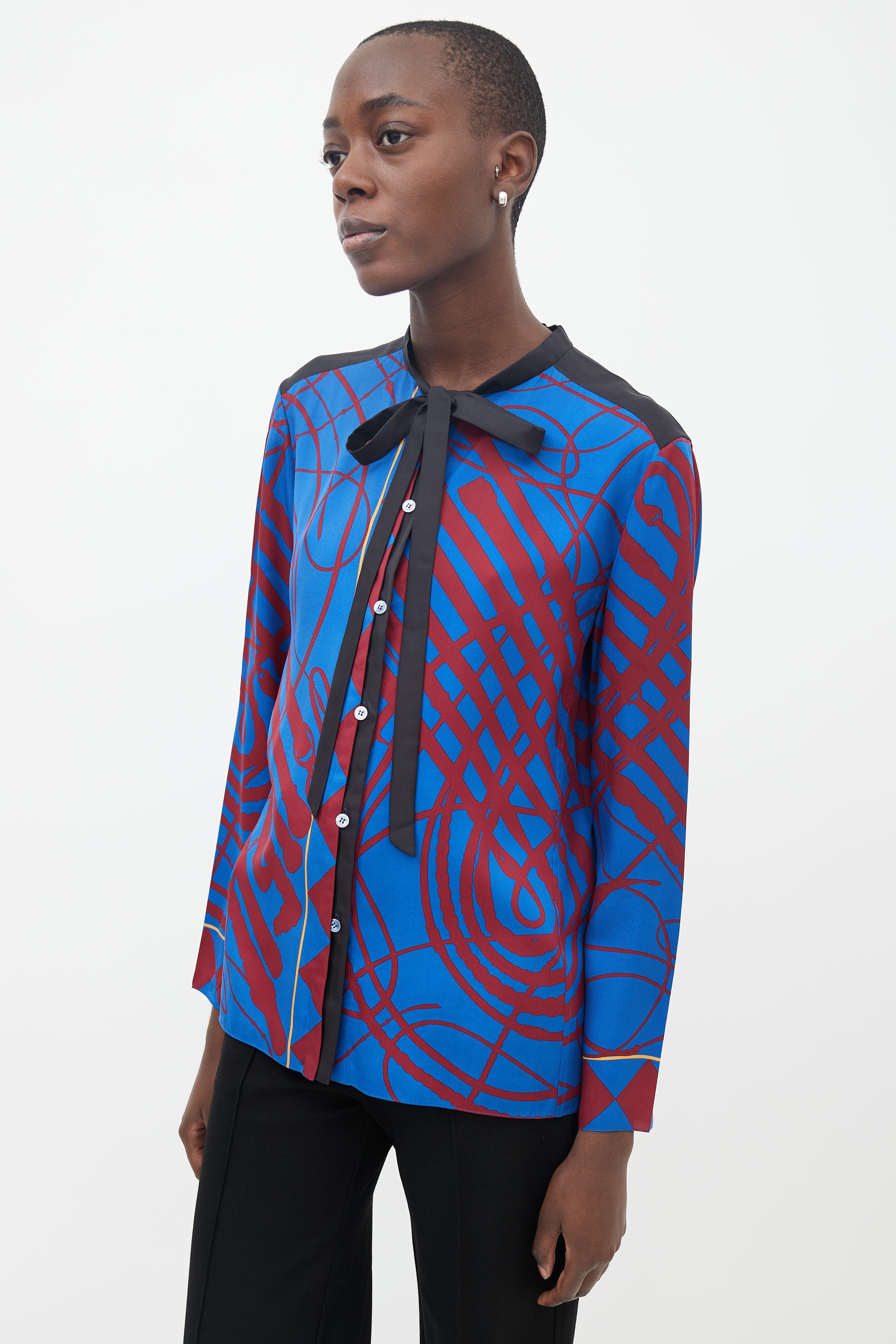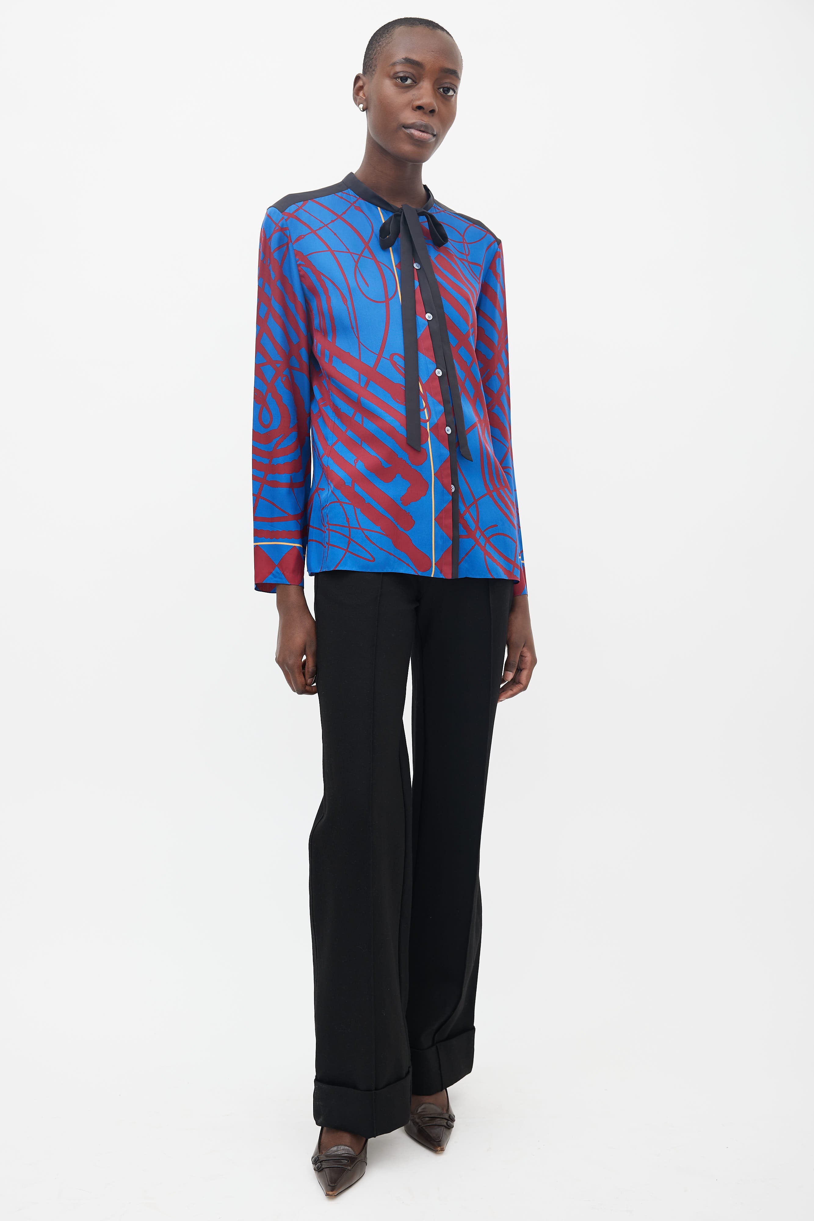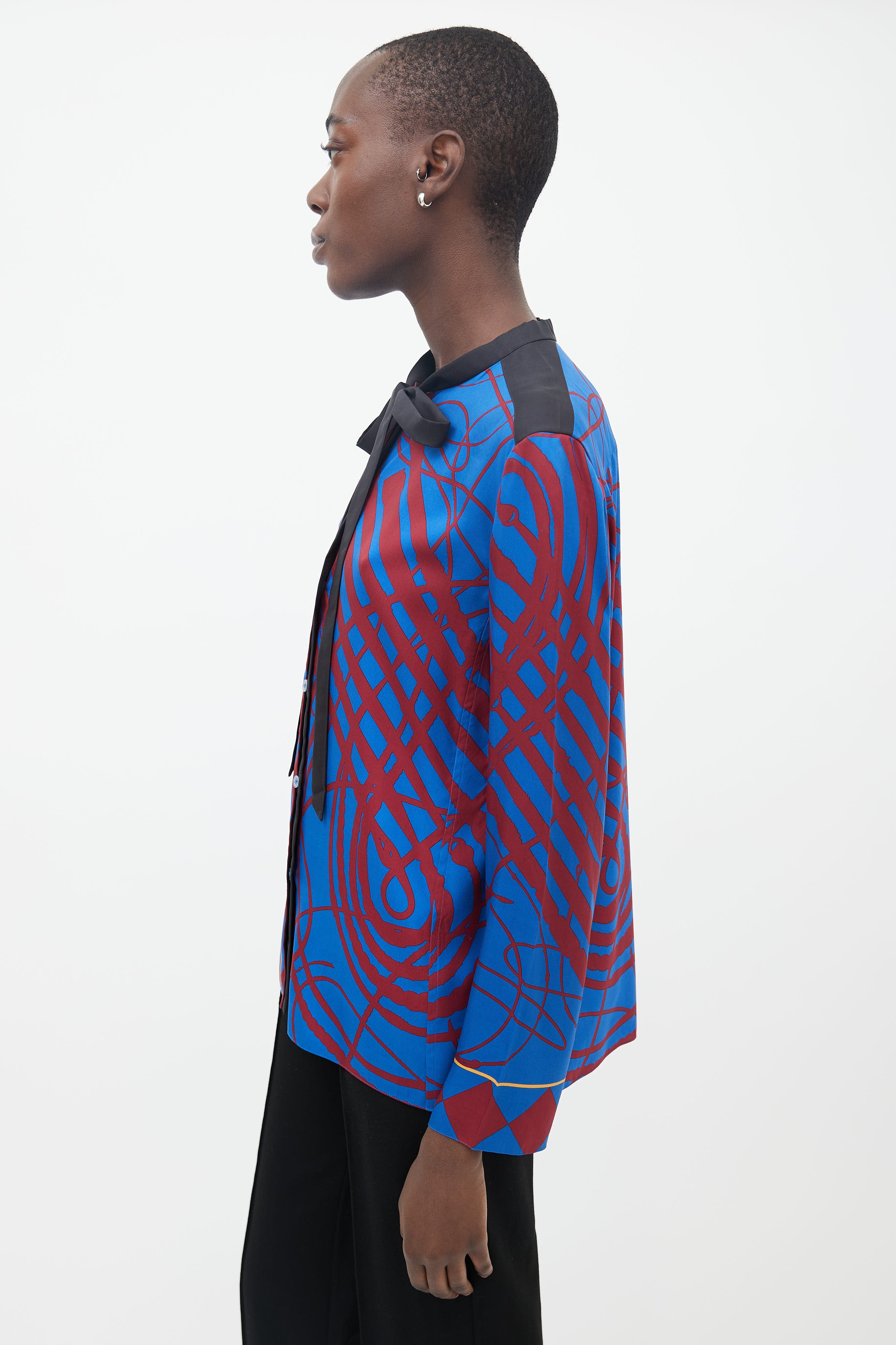 Pre-loved Hermès silk blouse in blue featuring red swirl print, black stand collar with slim black neck tie, front button closure, inverted back pleat, long sleeve and straight hem.